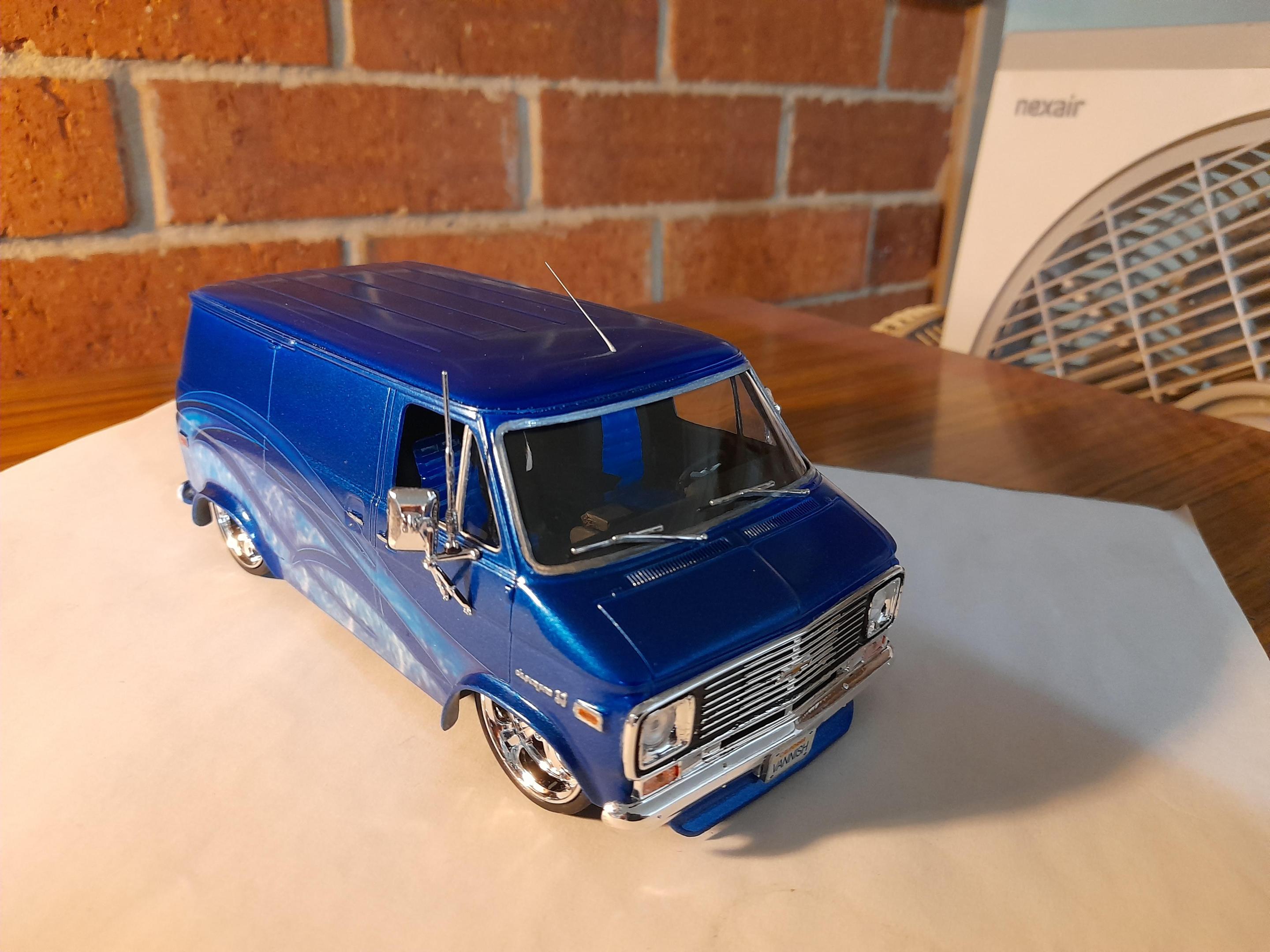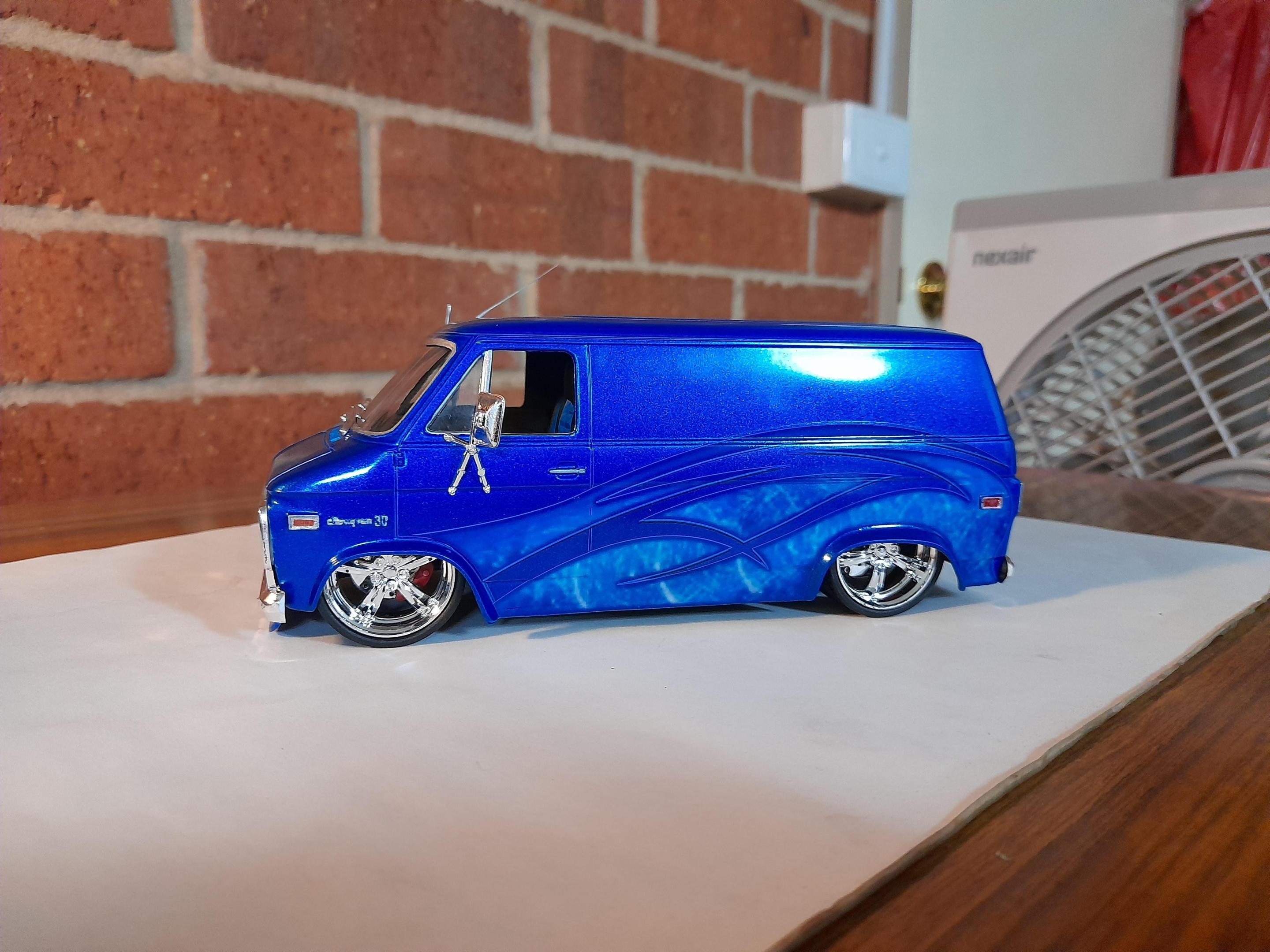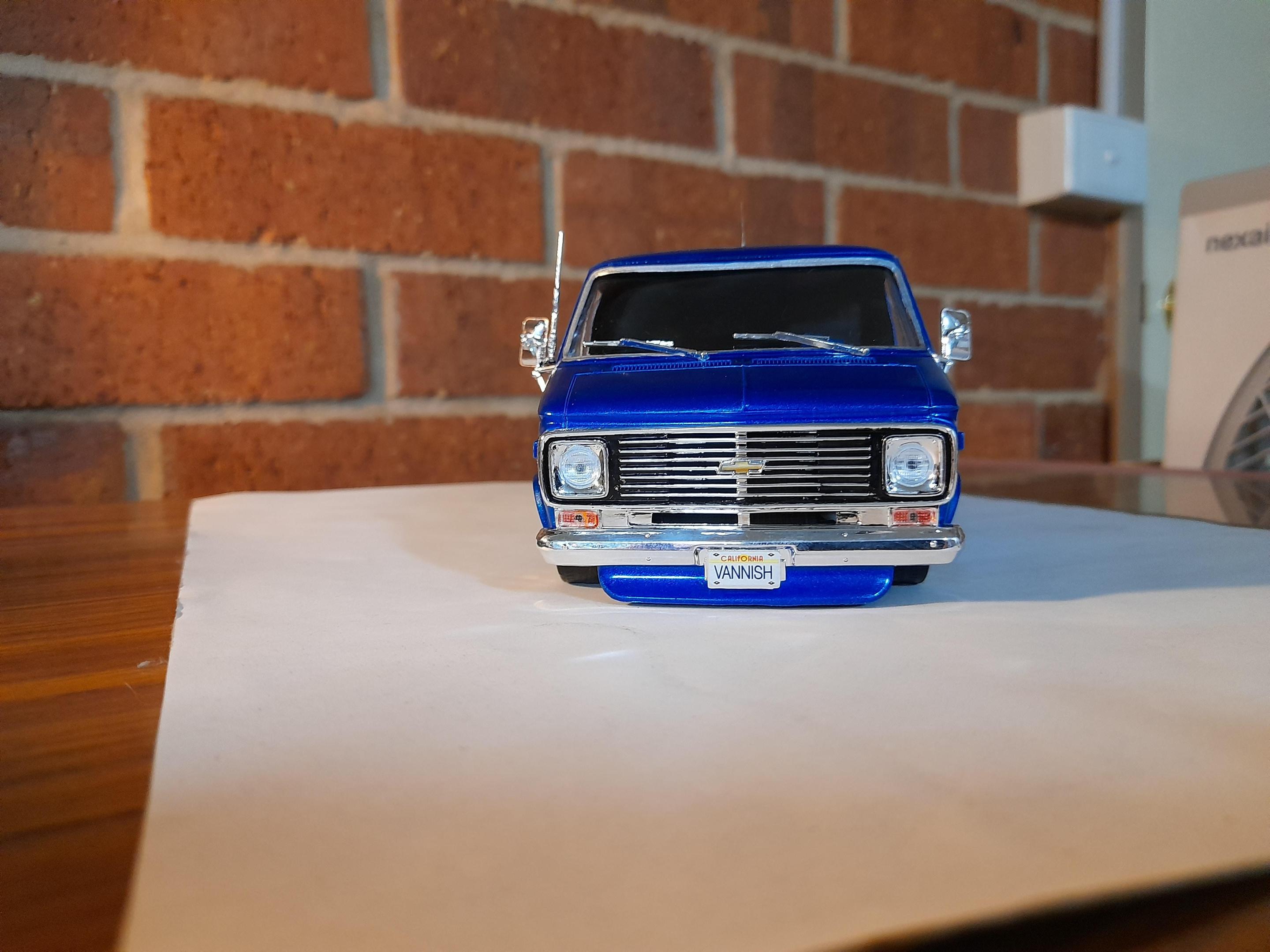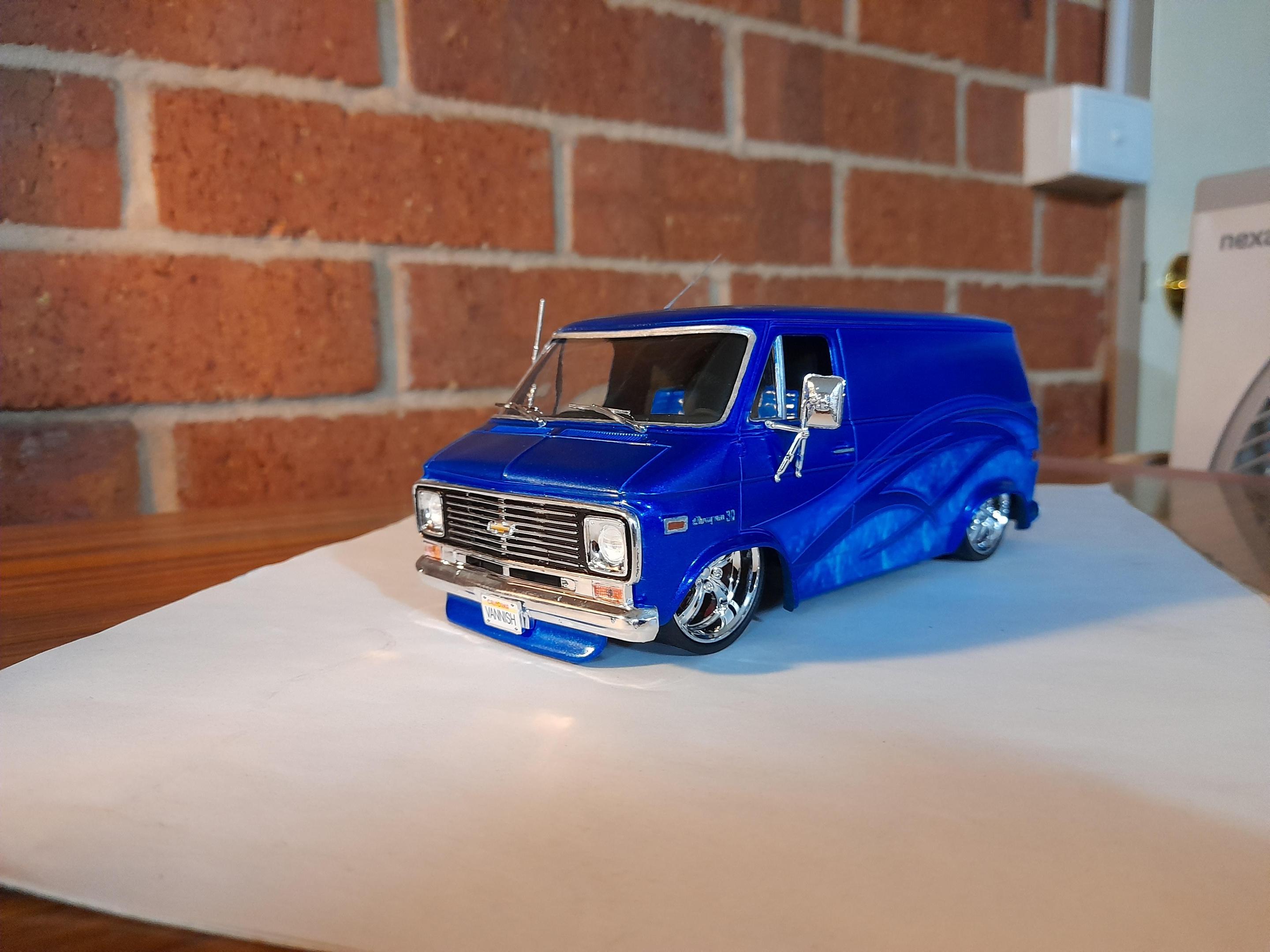 Here's my static built Revell 77 Chevy van. The reason it's static is due to a set of wheels I purchased on ebay. They were advertised as 1/24 scale but looked more like 1/18. Disappointed I decided to push on. After some thought I decided on the van as it was a big body which may just work. So after quite a bit of cutting I ended up with this. All comments and / or criticism's encouraged. Cheers, David. ??