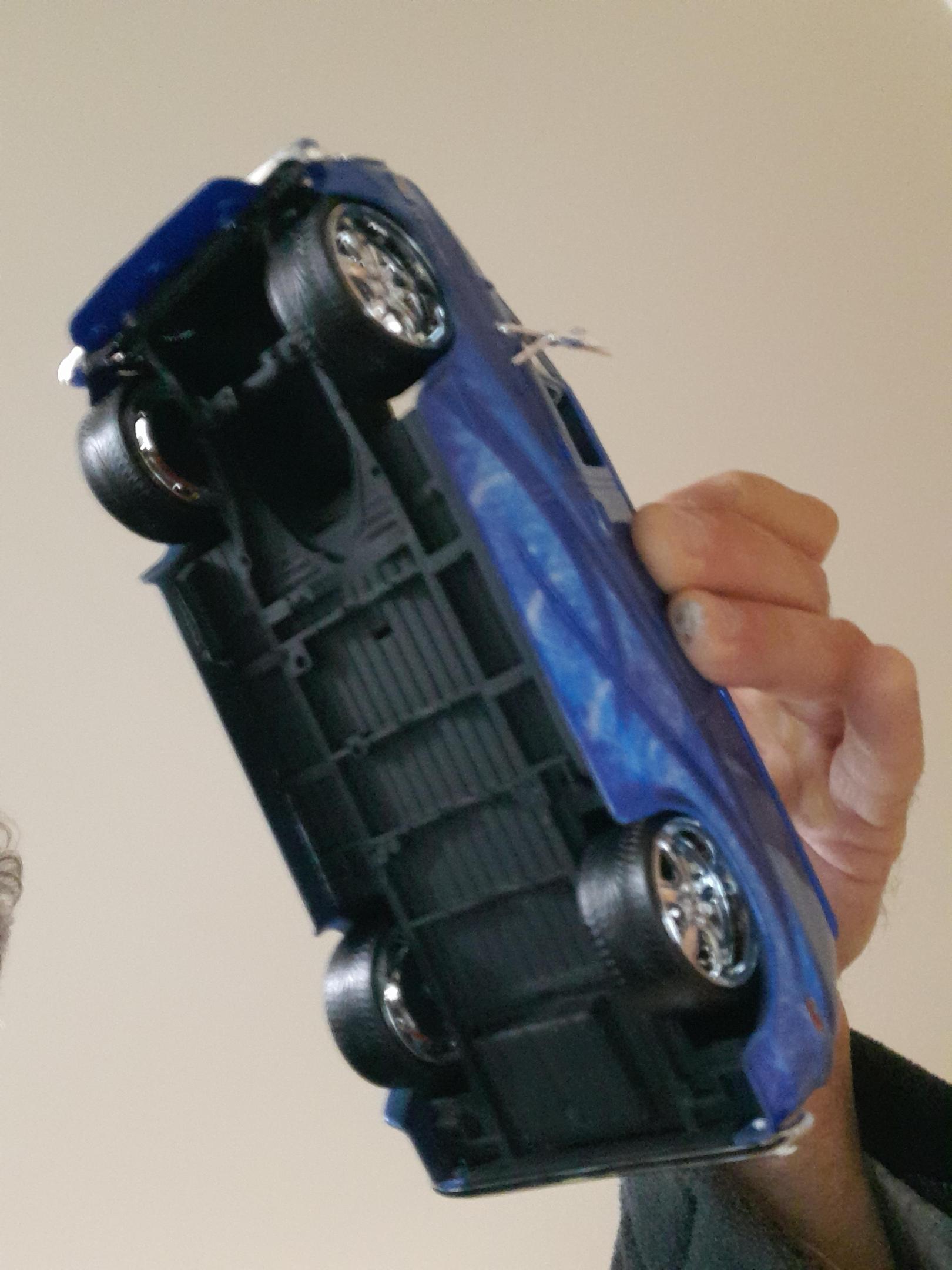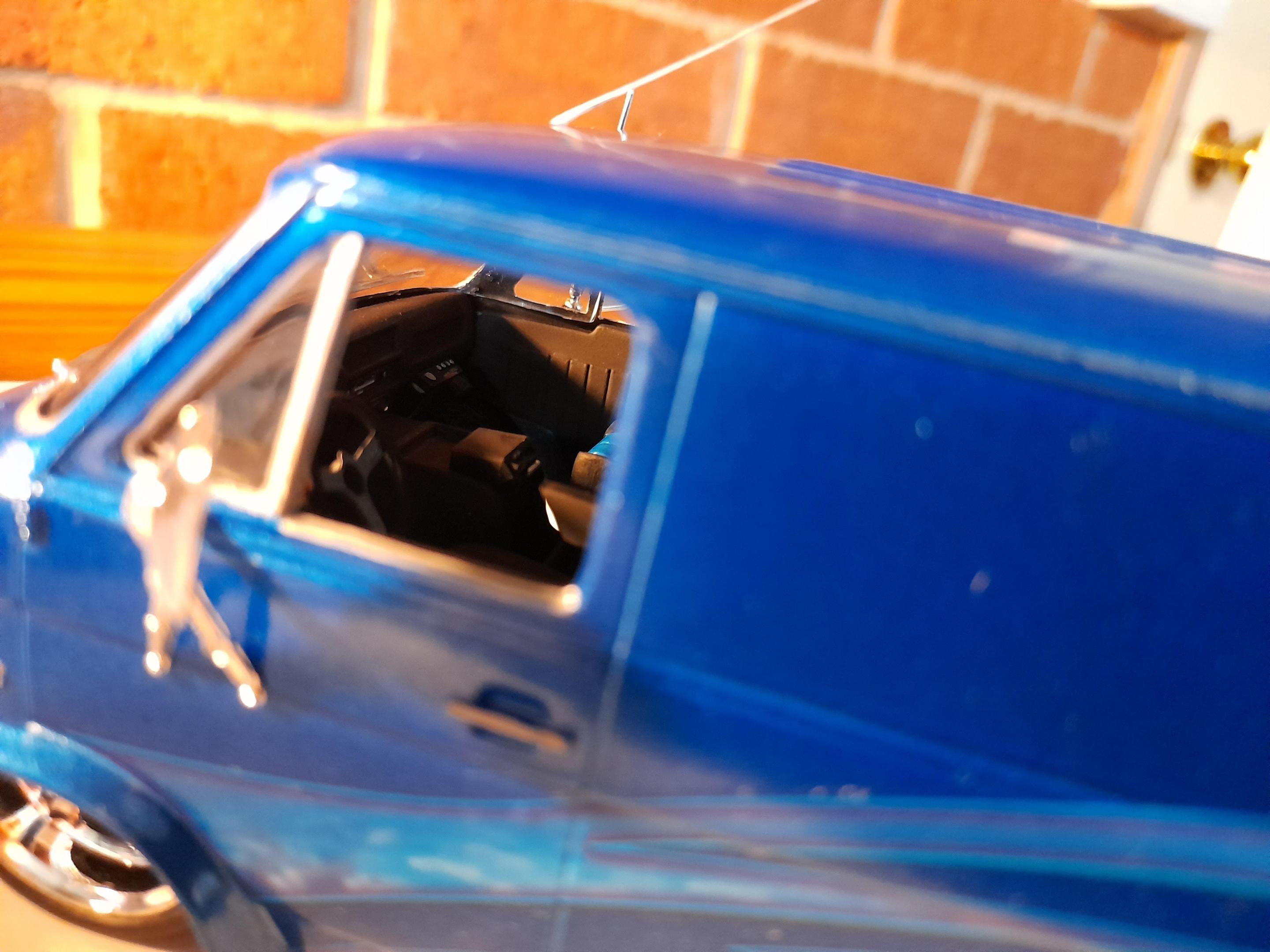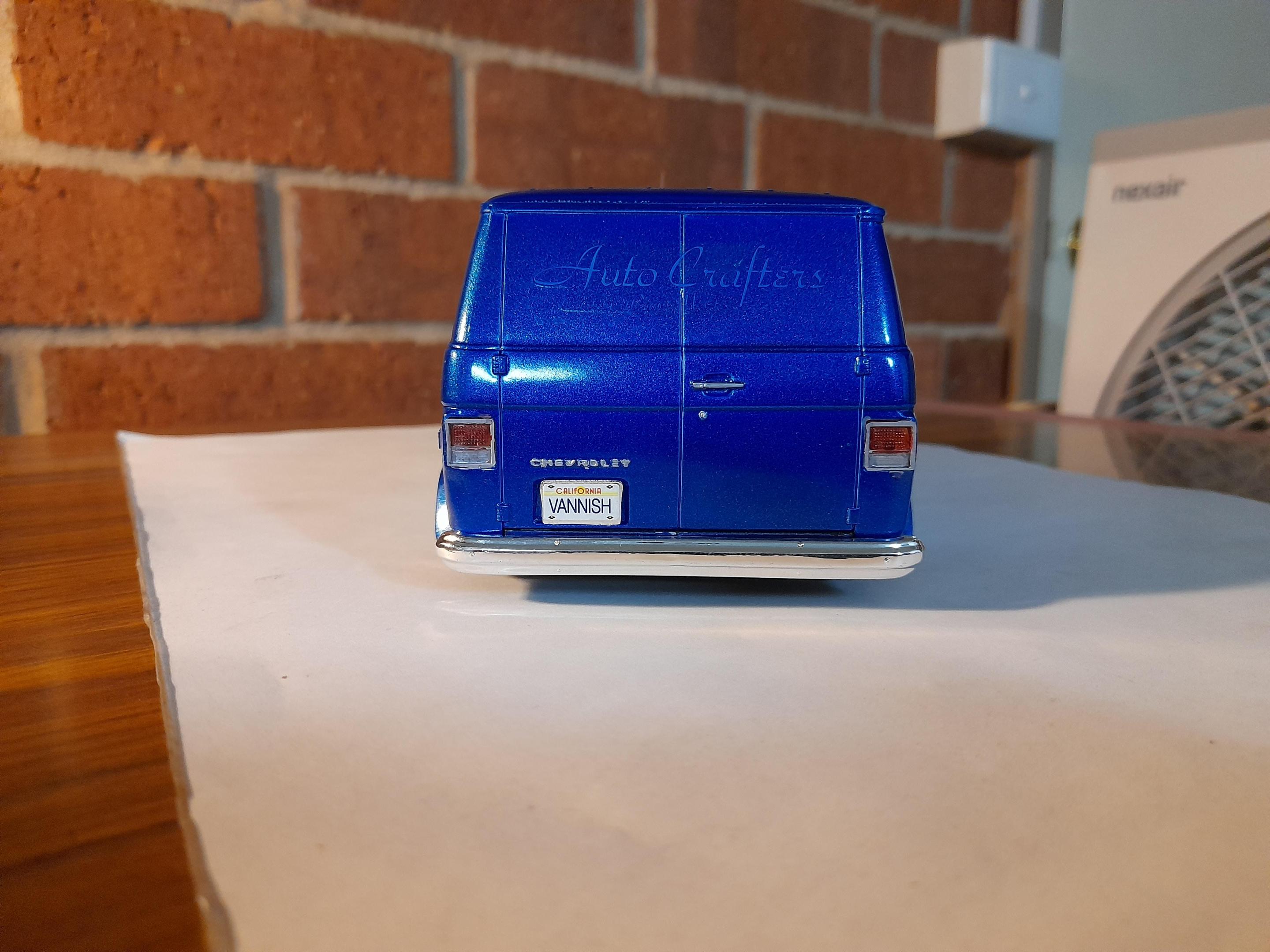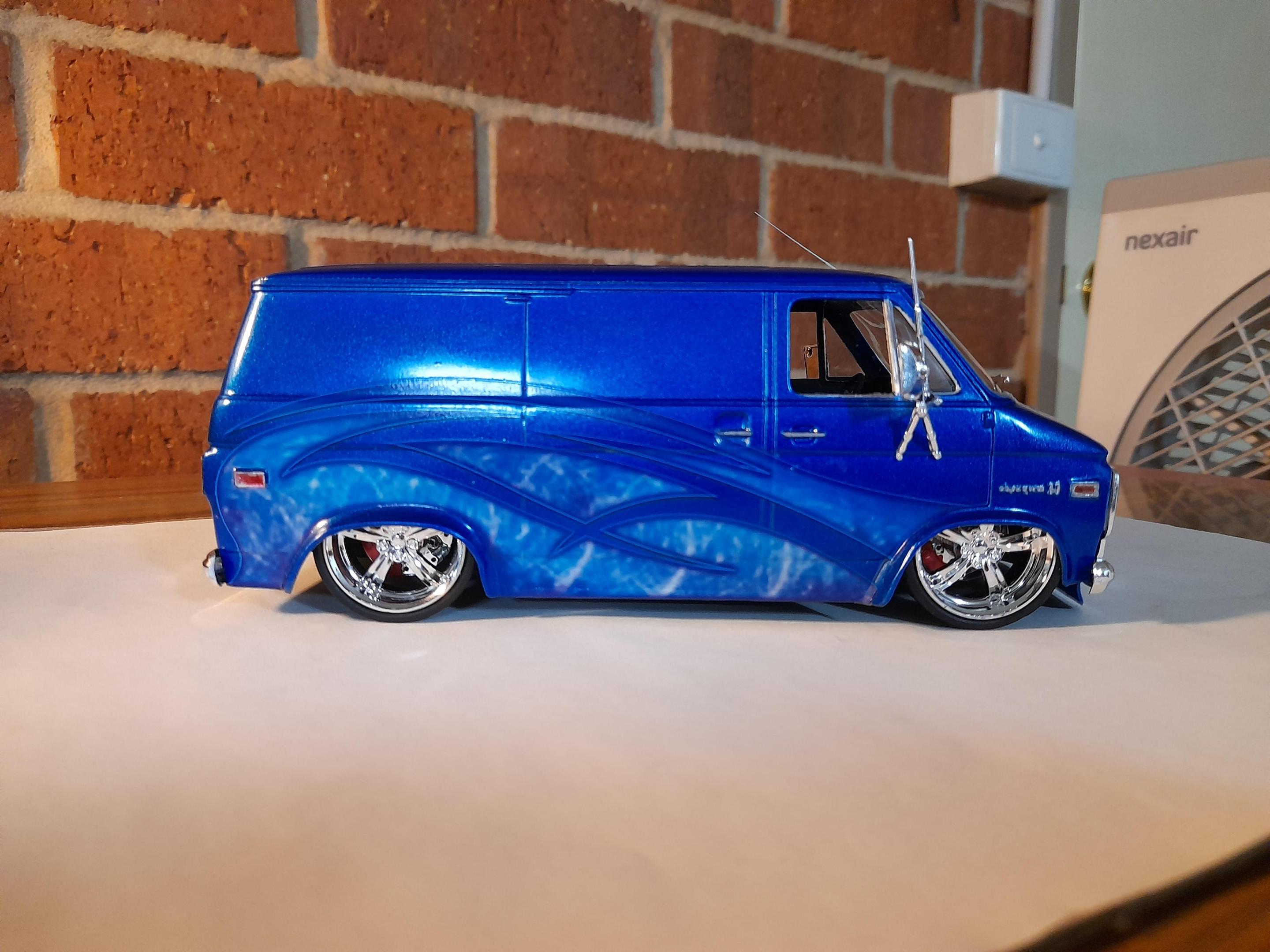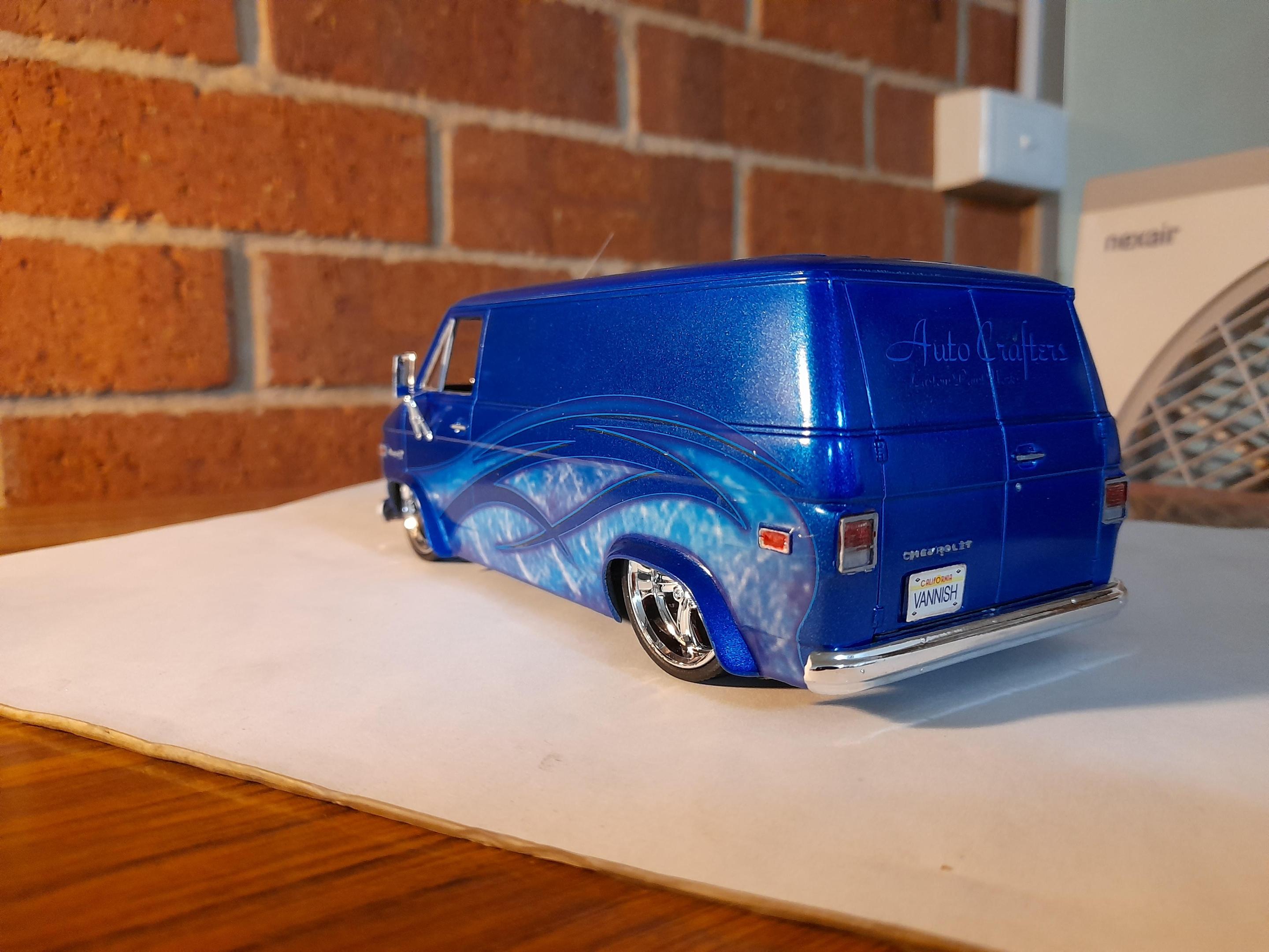 Here's my static built Revell 77 Chevy van. The reason it's static is due to a set of wheels I purchased on ebay. They were advertised as 1/24 scale but looked more like 1/18. Disappointed I decided to push on. After some thought I decided on the van as it was a big body which may just work. So after quite a bit of cutting I ended up with this. All comments and / or criticism's encouraged. Cheers, David. ??