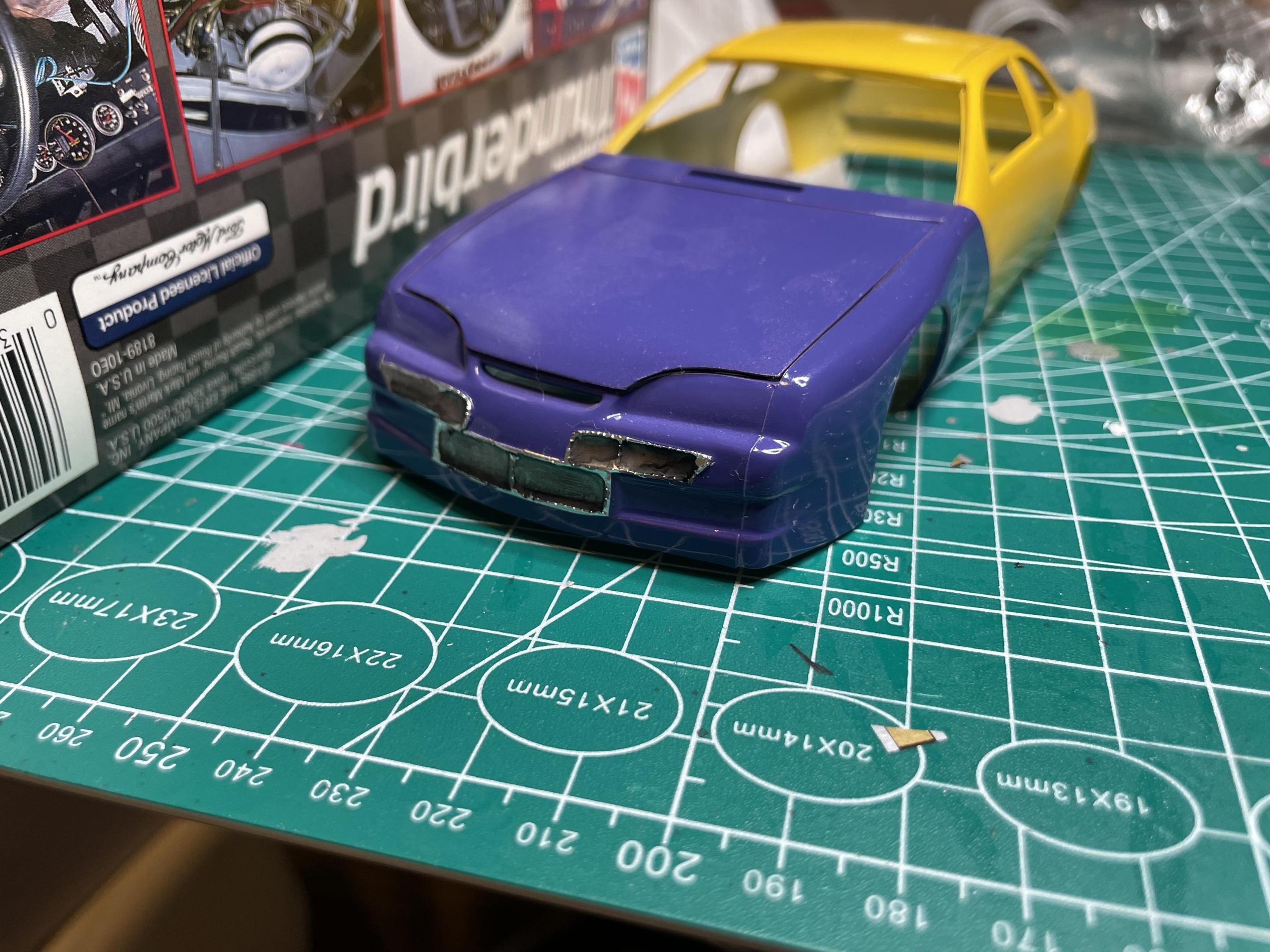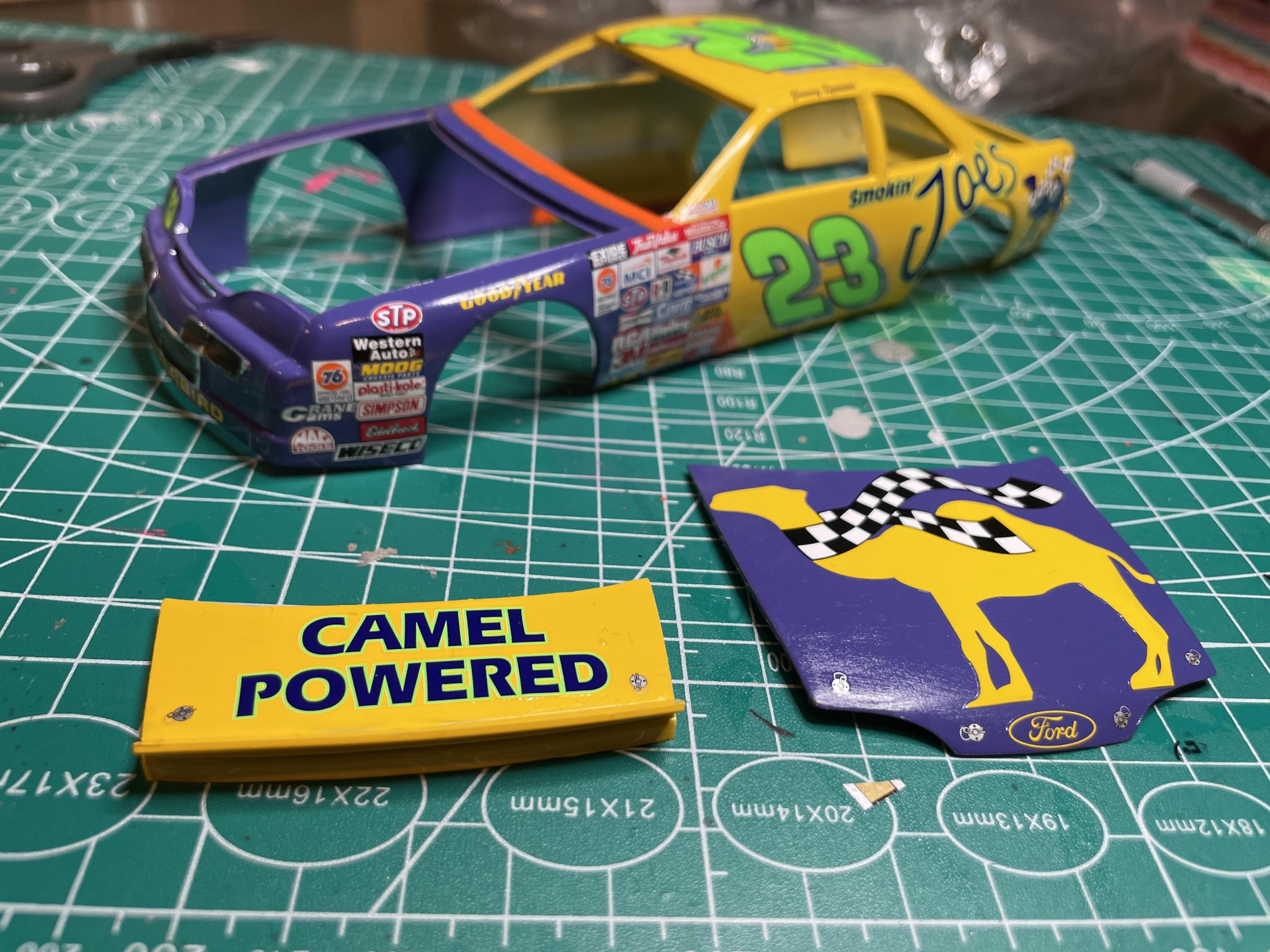 I had been waiting a long time for these decals, finally was able to purchase a set. Used a Revell Bill Elliot kit. The body had a warp in it, but nothing major. This paint scheme was only run once at the 1997 finale at Atlanta. I don’t know who manufactured the decals, I had some major issues. Where the red and white colours meet, there should be a silver pin stripe. The first one disintegrated. I applied microsol, but it didn’t help. Since there was no bleeding from the two paint colours, I decided to go ahead without the silver stripes. I applied microsol to the large Winston hood decal and all the silver ran, ruining it completely. The grouped contingency decals broke apart. Luckily I found another set on EBAY and was able to complete the kit.