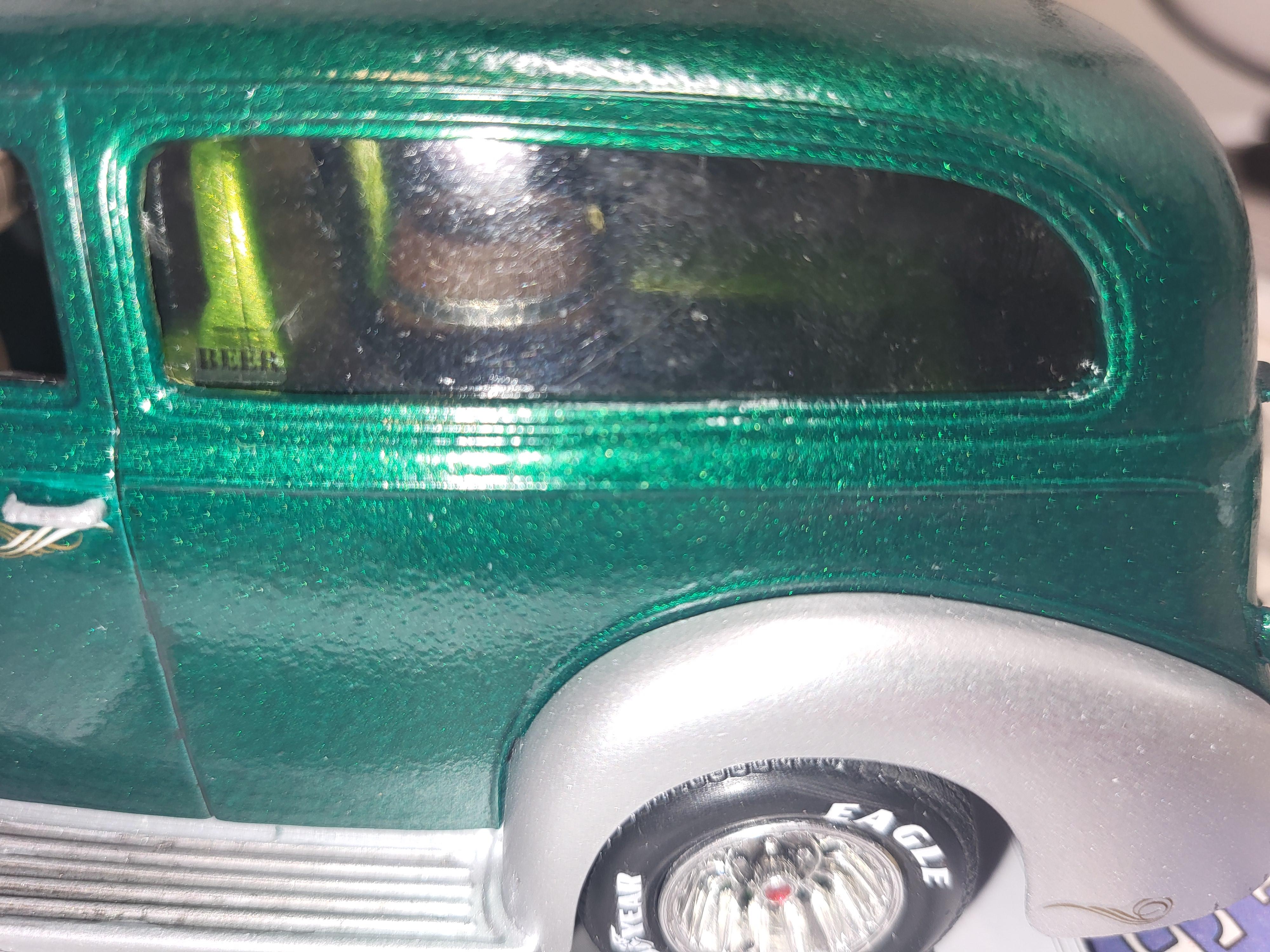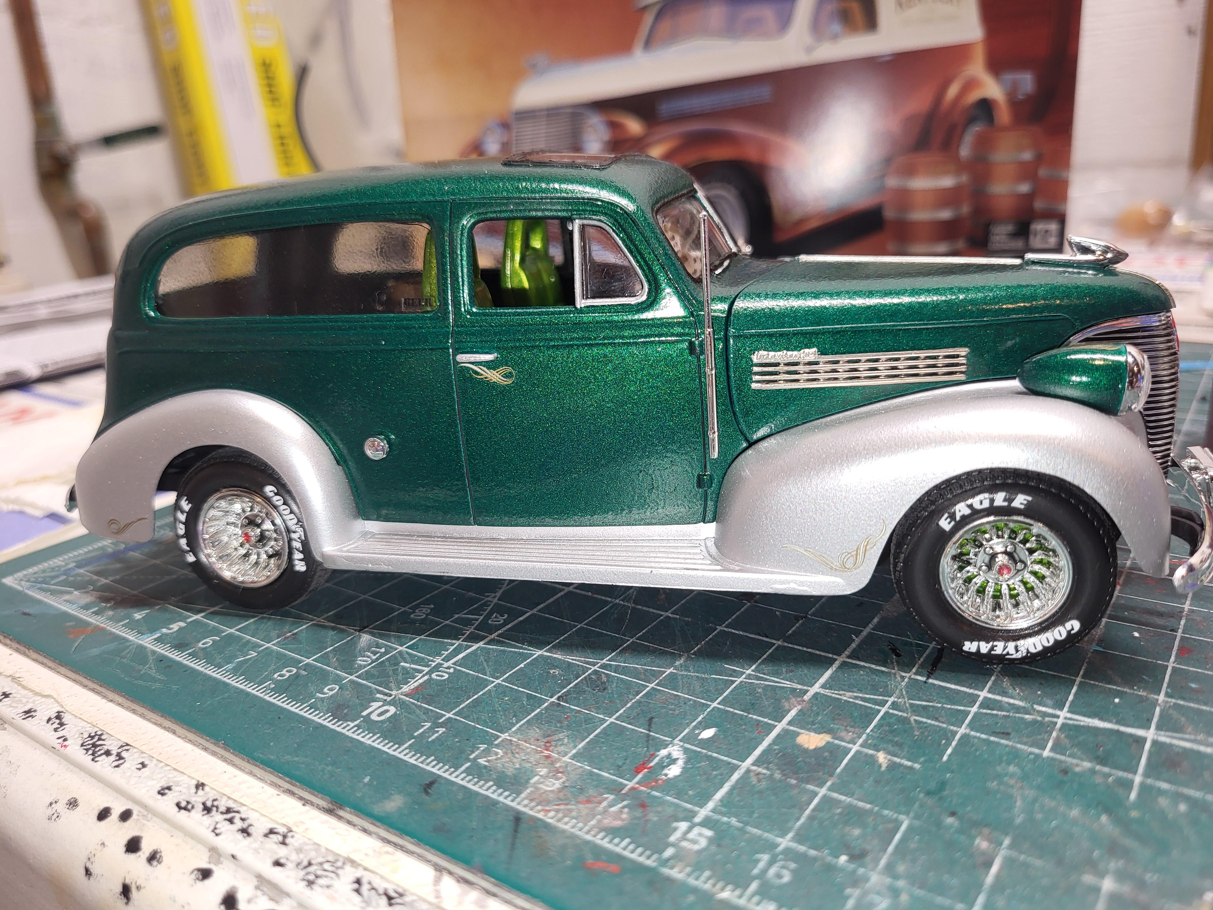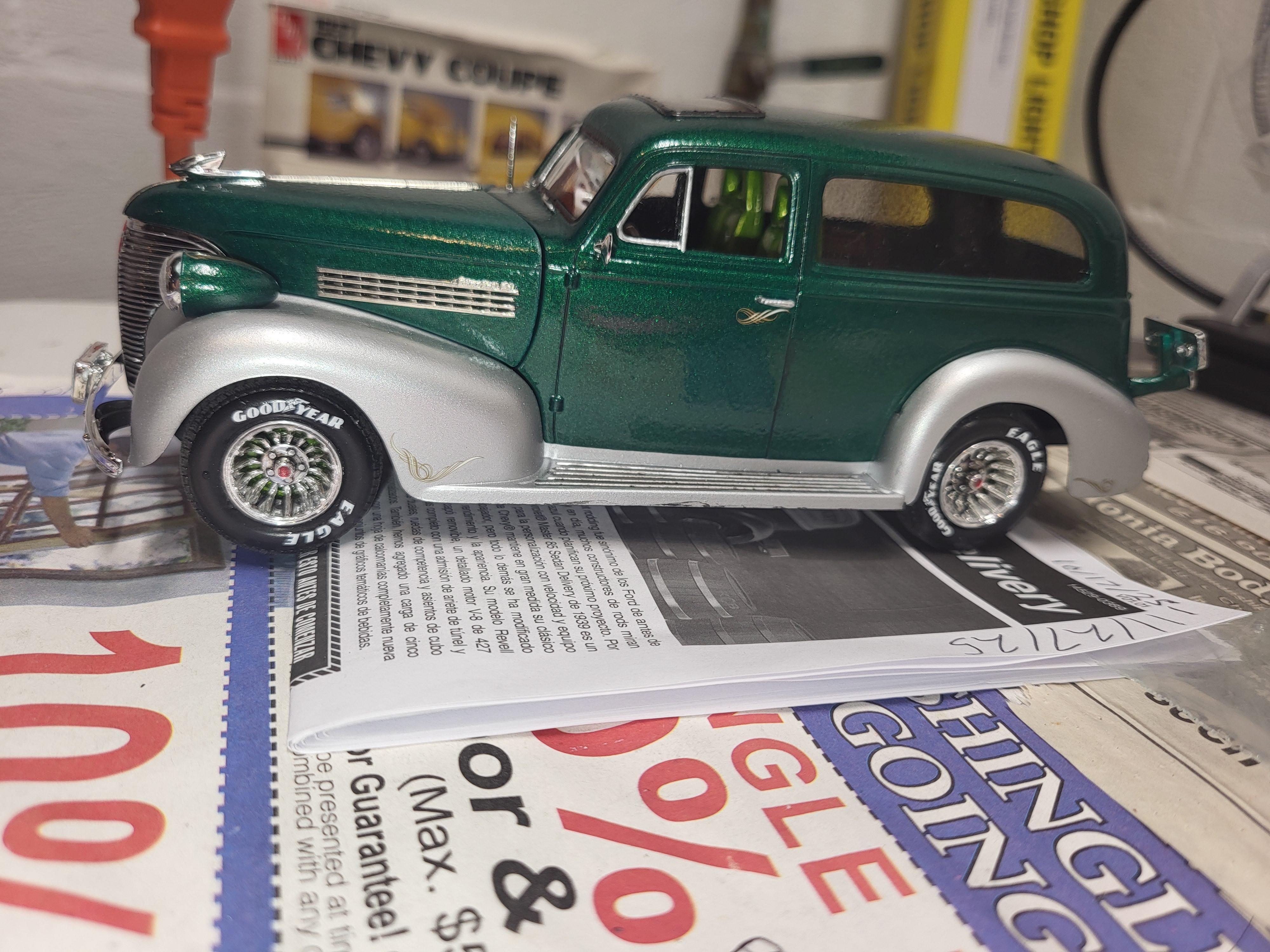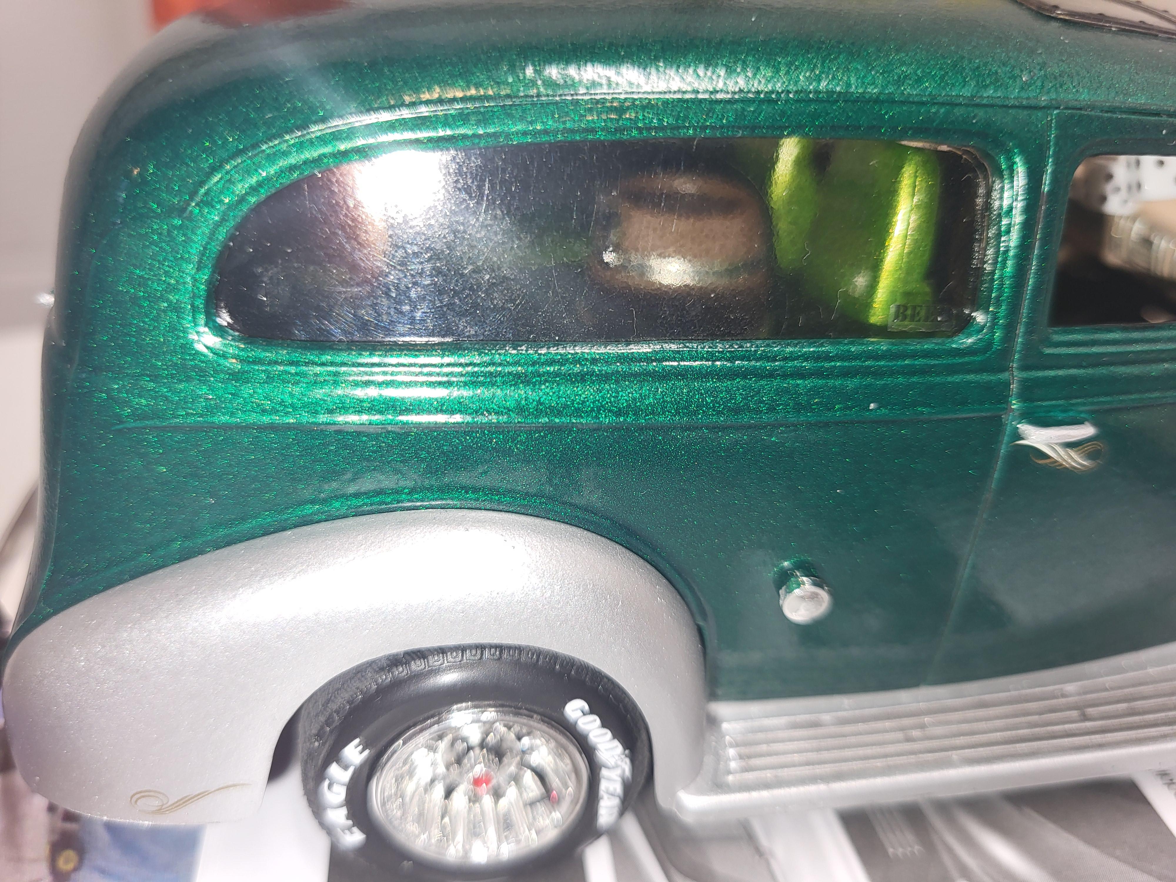 I built it right from Monogram kit except the rims and i did cut out openings in rear and made windows out of sheet styrene and tinted them i used a Morgan prewired distributor and detail master carb linkage, gofer racing Goodyear tire decals i scratchbuilt valve stems, throttle springs and i made a beer keg for the back i painted Chevy Testors green metal flake with Testors metallic silver and i also cut interior door panels out of amt 37 Chevy Coupe interior tub since this kit had none i added a pair of fuzzy dice and scratchbuilt rearview mirror from sheet styrene i added Best model car parts plates a MI plate and vanity plate it has dual Cherry bomb glasspack mufflers a 427 Chevy with dual 4 barrels and high rise intake and Hooker headers i paonted block Testors Bright lime as well as wheel backs and bucket seats and custom seats and carpet in rear i used bare metal foil for the chrome trim it was alot of fun i love t hese 30s Chevys i would like to build a Master Deluxe town sedan to from this kit but i do not think there is a body available