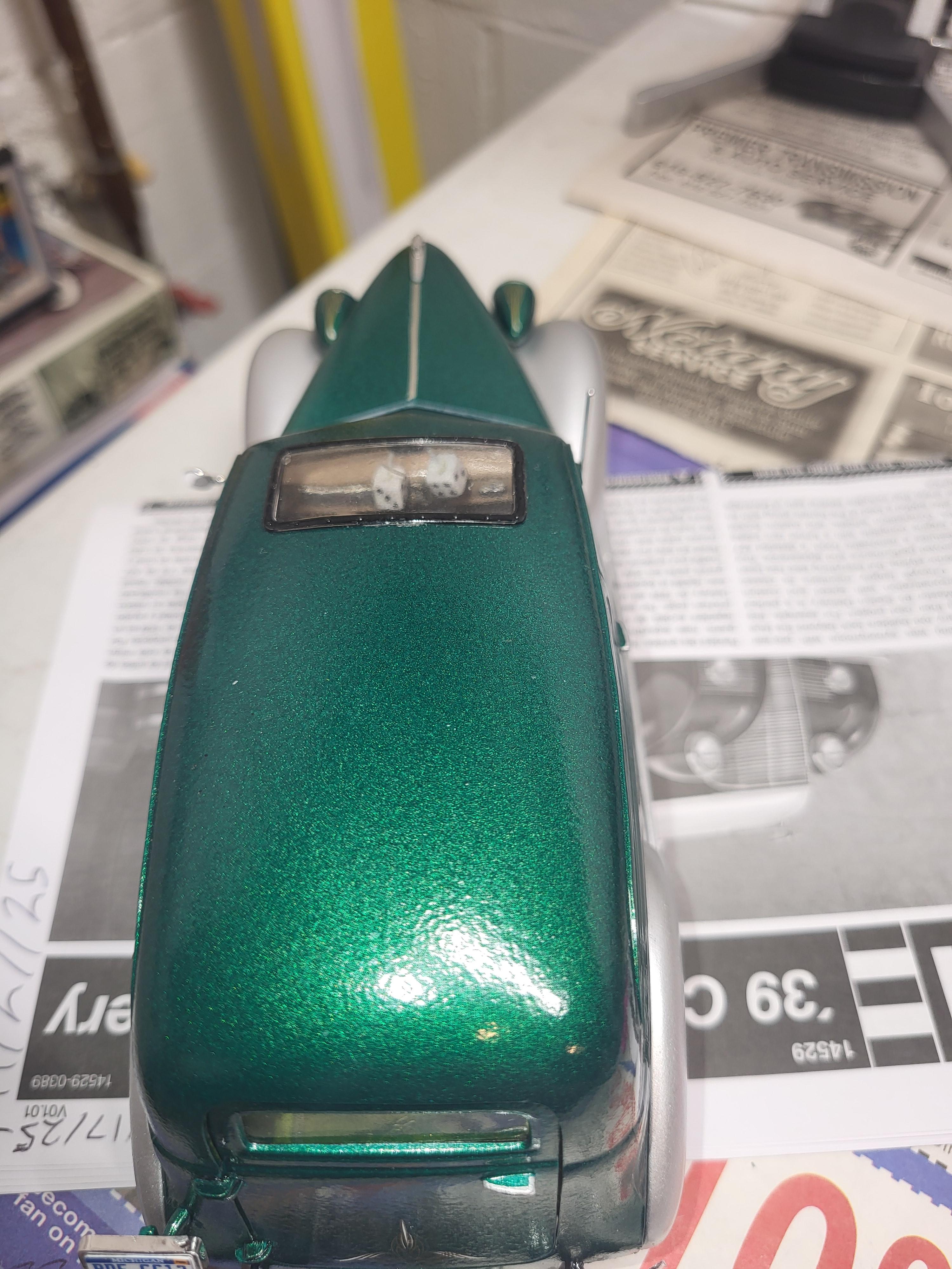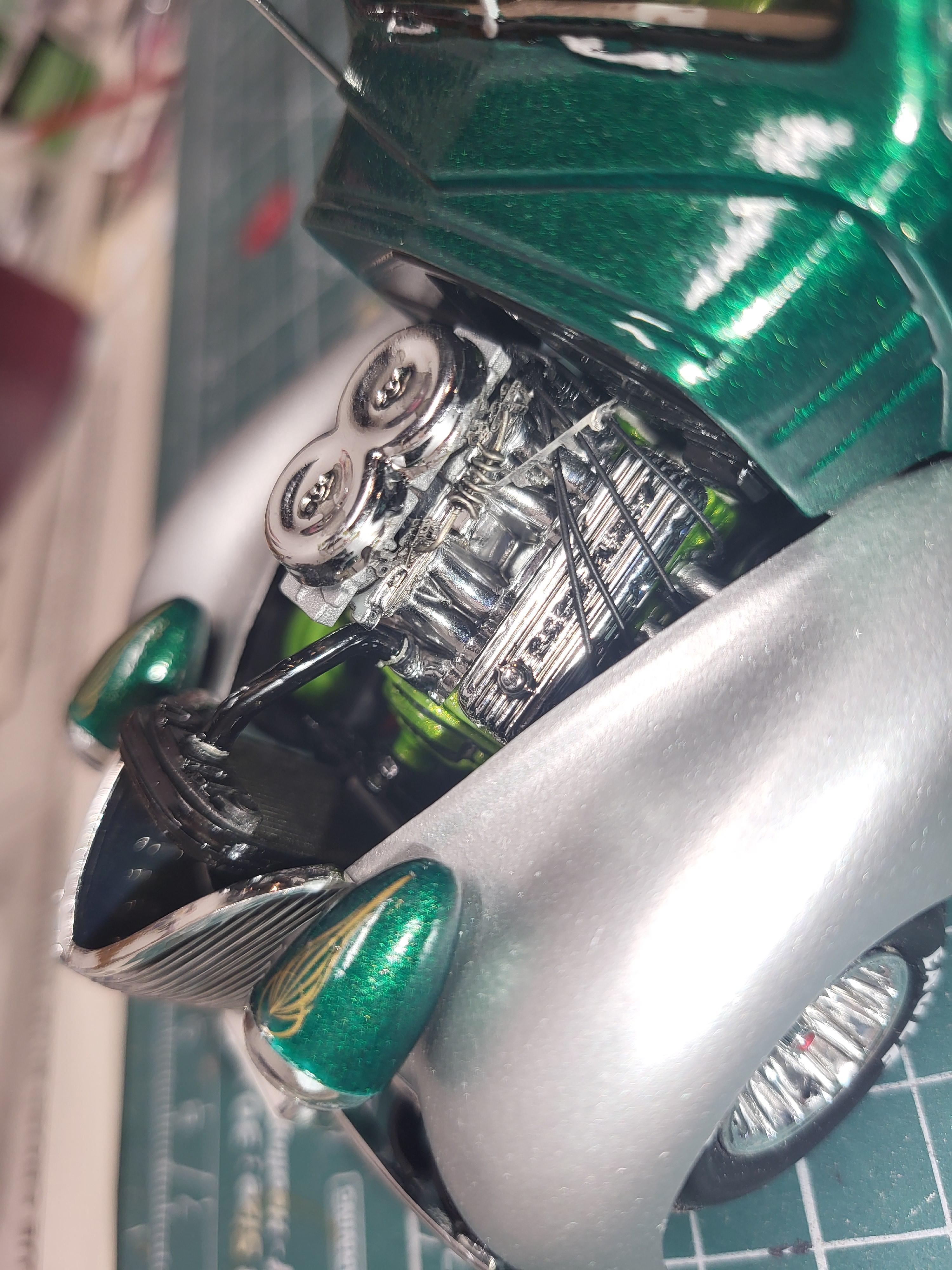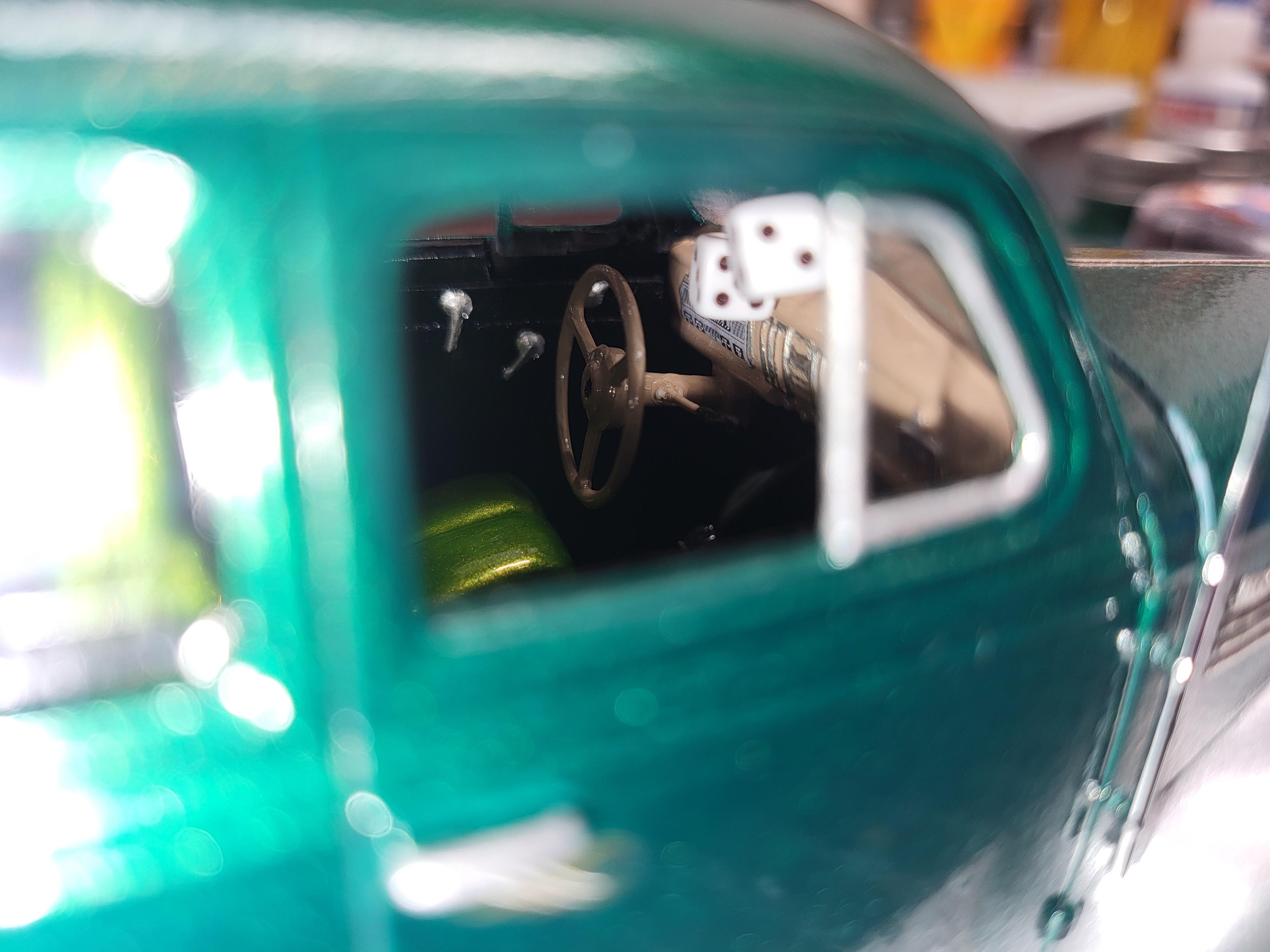 I built it right from Monogram kit except the rims and i did cut out openings in rear and made windows out of sheet styrene and tinted them i used a Morgan prewired distributor and detail master carb linkage, gofer racing Goodyear tire decals i scratchbuilt valve stems, throttle springs and i made a beer keg for the back i painted Chevy Testors green metal flake with Testors metallic silver and i also cut interior door panels out of amt 37 Chevy Coupe interior tub since this kit had none i added a pair of fuzzy dice and scratchbuilt rearview mirror from sheet styrene i added Best model car parts plates a MI plate and vanity plate it has dual Cherry bomb glasspack mufflers a 427 Chevy with dual 4 barrels and high rise intake and Hooker headers i paonted block Testors Bright lime as well as wheel backs and bucket seats and custom seats and carpet in rear i used bare metal foil for the chrome trim it was alot of fun i love t hese 30s Chevys i would like to build a Master Deluxe town sedan to from this kit but i do not think there is a body available