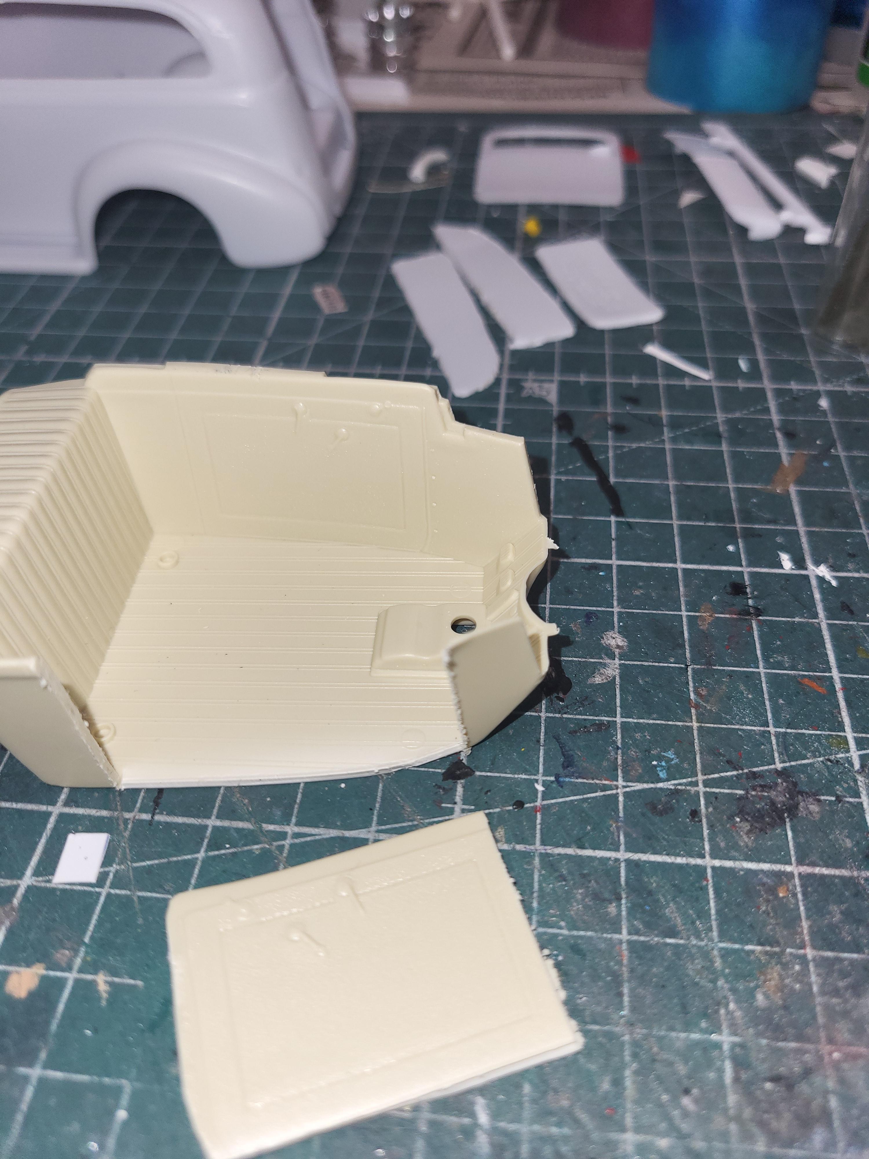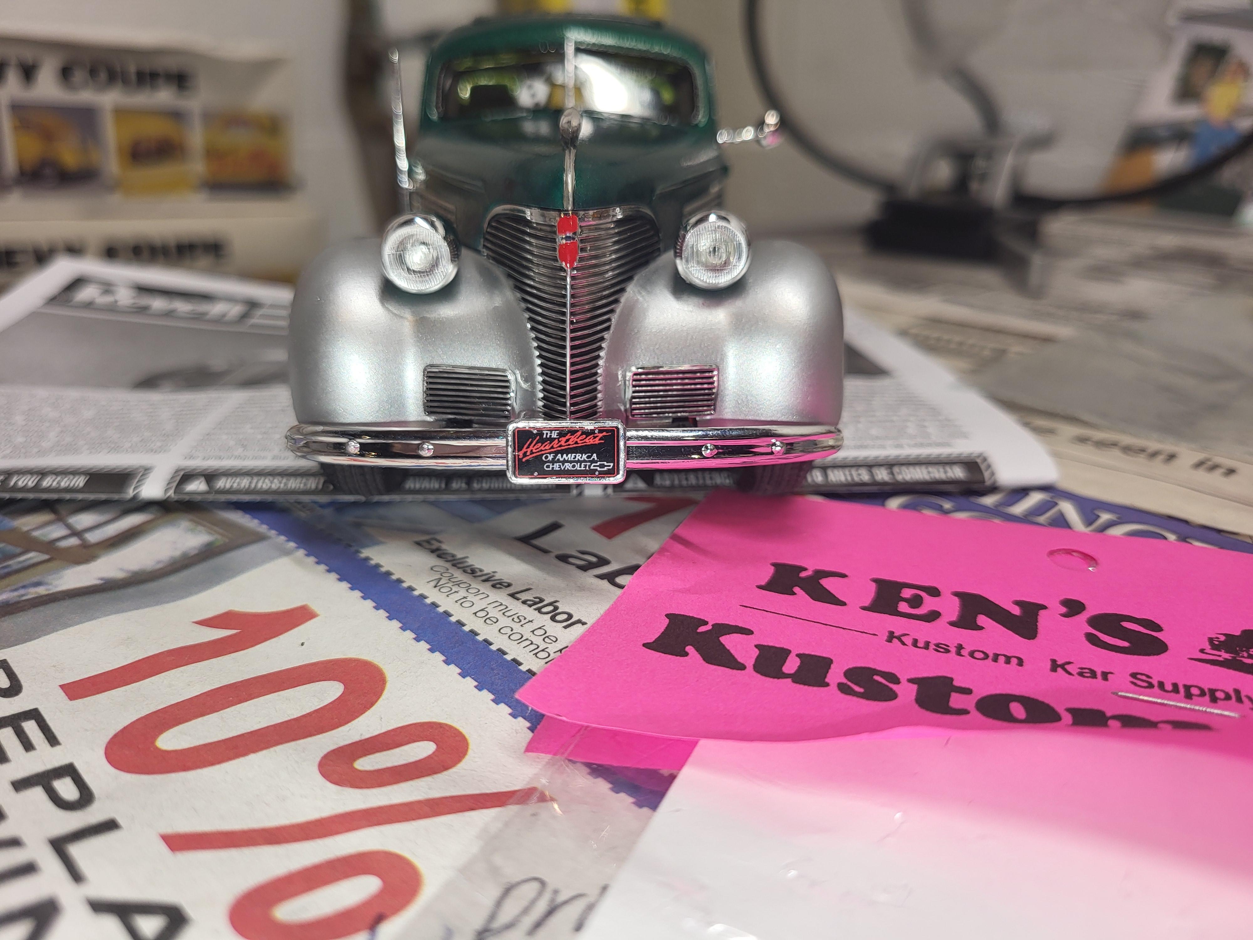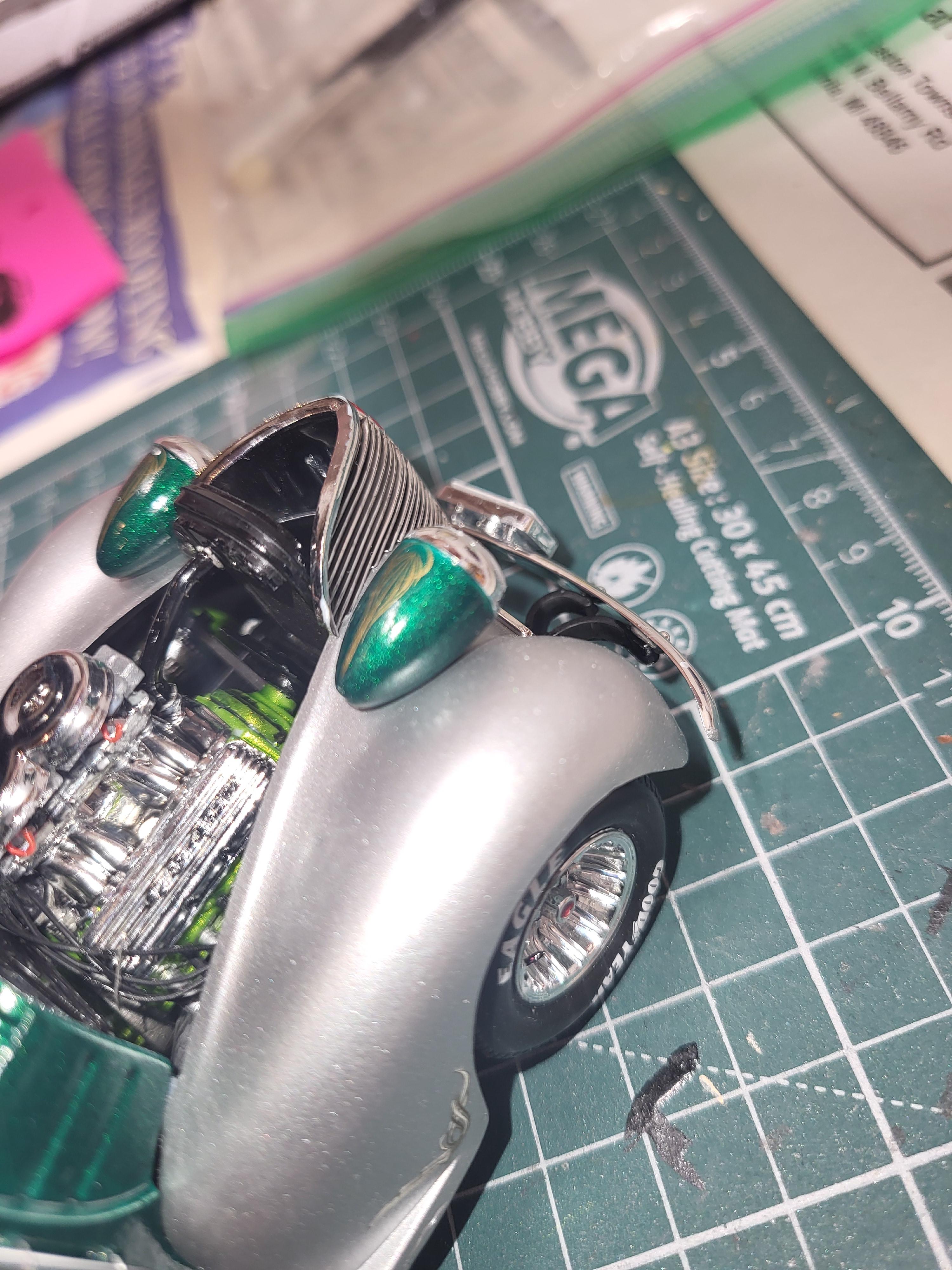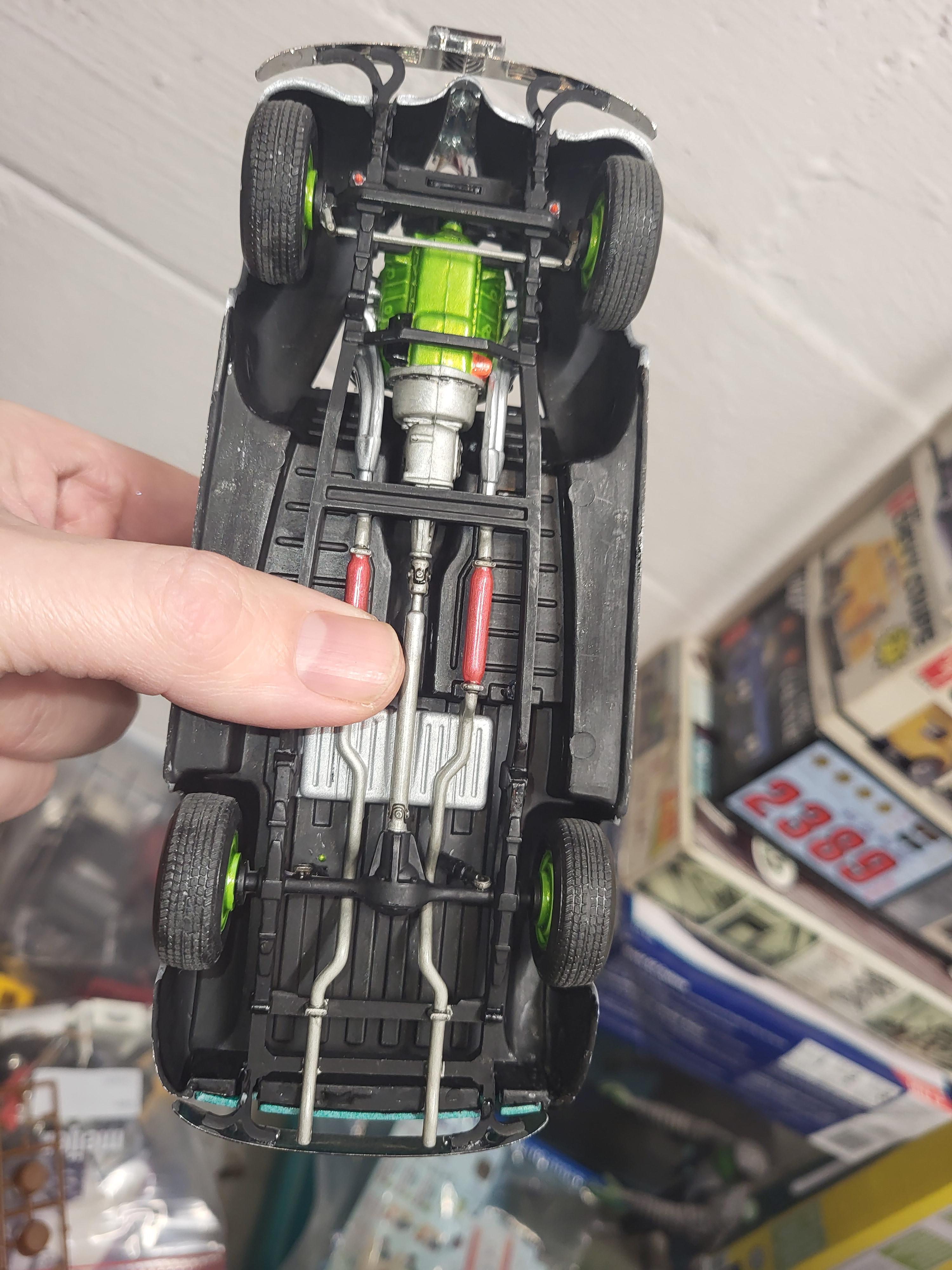 I built it right from Monogram kit except the rims and i did cut out openings in rear and made windows out of sheet styrene and tinted them i used a Morgan prewired distributor and detail master carb linkage, gofer racing Goodyear tire decals i scratchbuilt valve stems, throttle springs and i made a beer keg for the back i painted Chevy Testors green metal flake with Testors metallic silver and i also cut interior door panels out of amt 37 Chevy Coupe interior tub since this kit had none i added a pair of fuzzy dice and scratchbuilt rearview mirror from sheet styrene i added Best model car parts plates a MI plate and vanity plate it has dual Cherry bomb glasspack mufflers a 427 Chevy with dual 4 barrels and high rise intake and Hooker headers i paonted block Testors Bright lime as well as wheel backs and bucket seats and custom seats and carpet in rear i used bare metal foil for the chrome trim it was alot of fun i love t hese 30s Chevys i would like to build a Master Deluxe town sedan to from this kit but i do not think there is a body available
