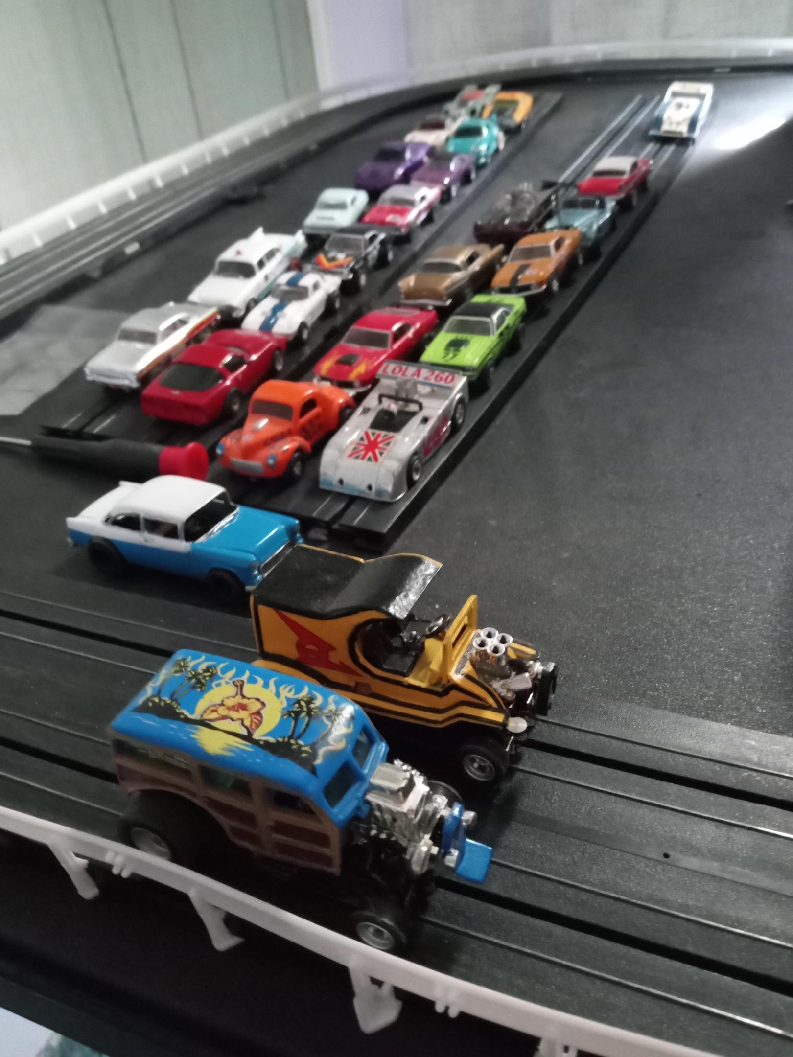 2. Converted the Matchbox Jaguar XK-150 to slot using a Tyco Magnum 440 Chassis and the 59 Dodge Police car with an Autoworld 4 gear chassis.Despite the weight of the metal bodies,they both are very fast!