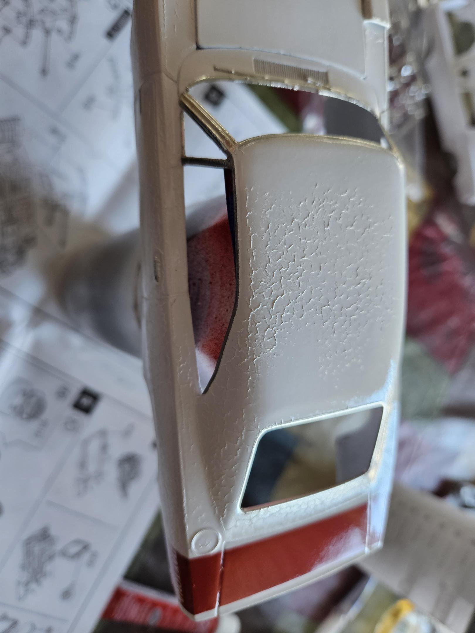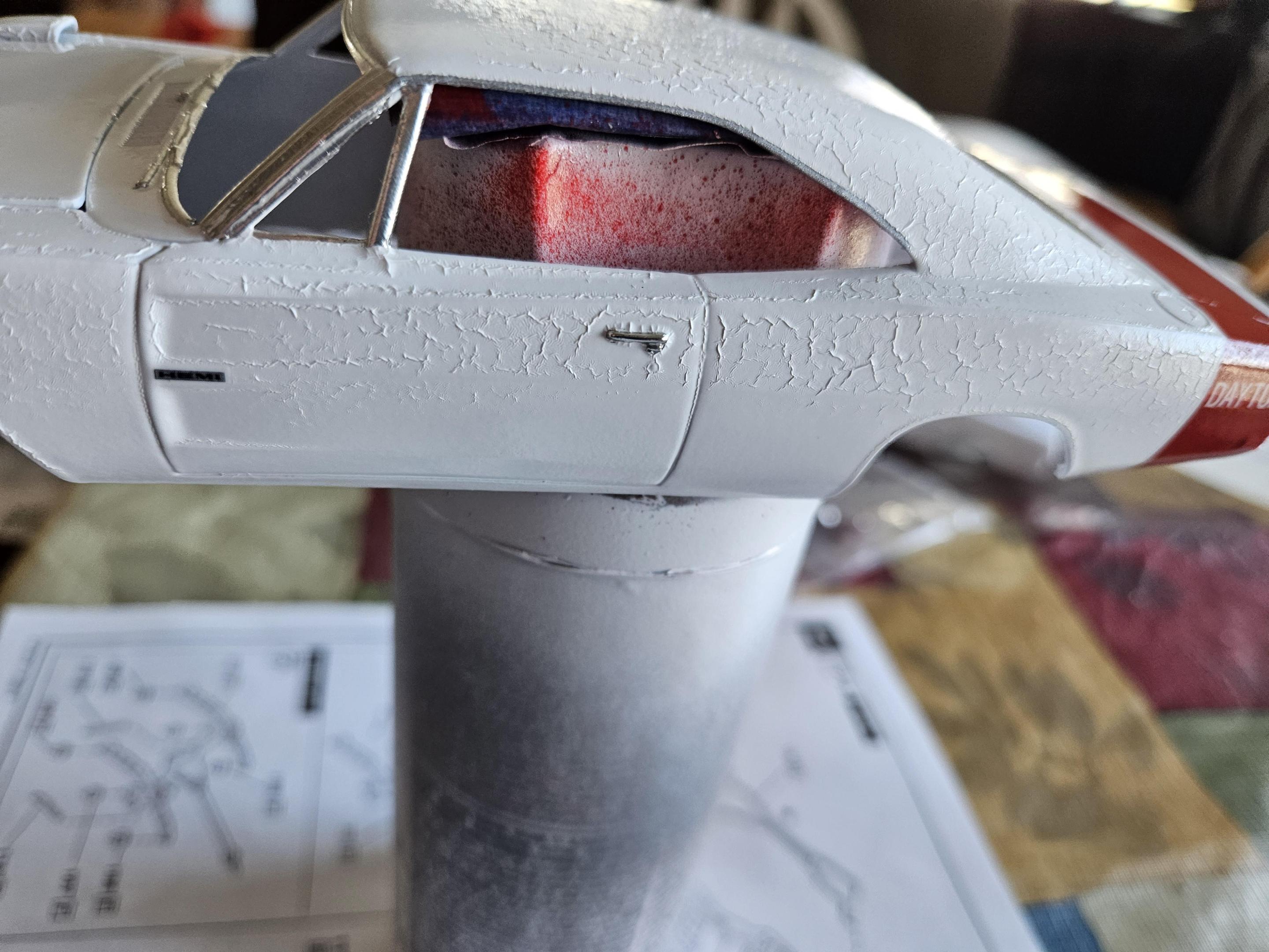 7. 69 Dodge Charger Daytona. I cleared the hood first by itself and all was fine. Did the body just now and this....I can't figure out why. Same paint used on hood and body, same clear used also