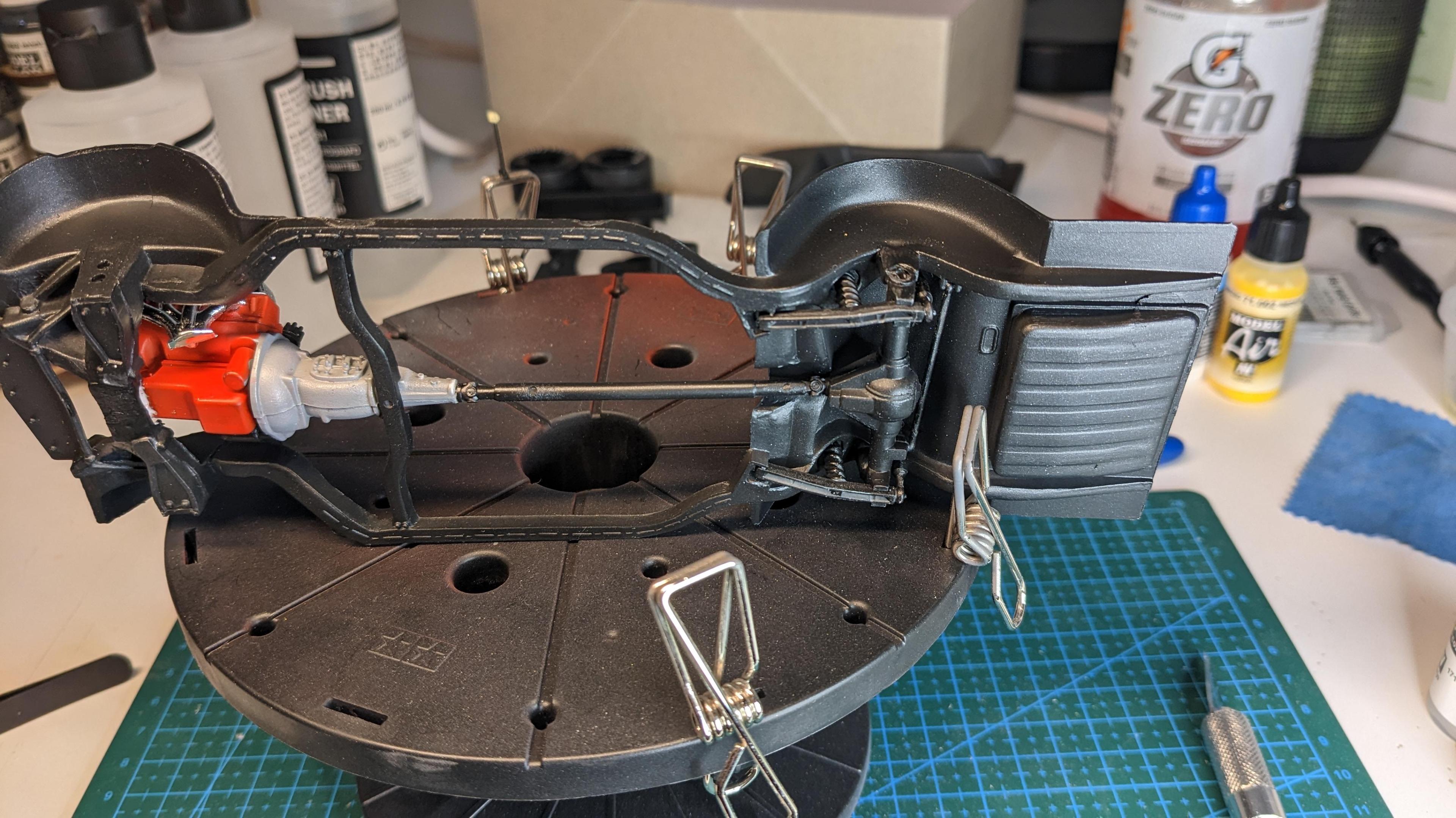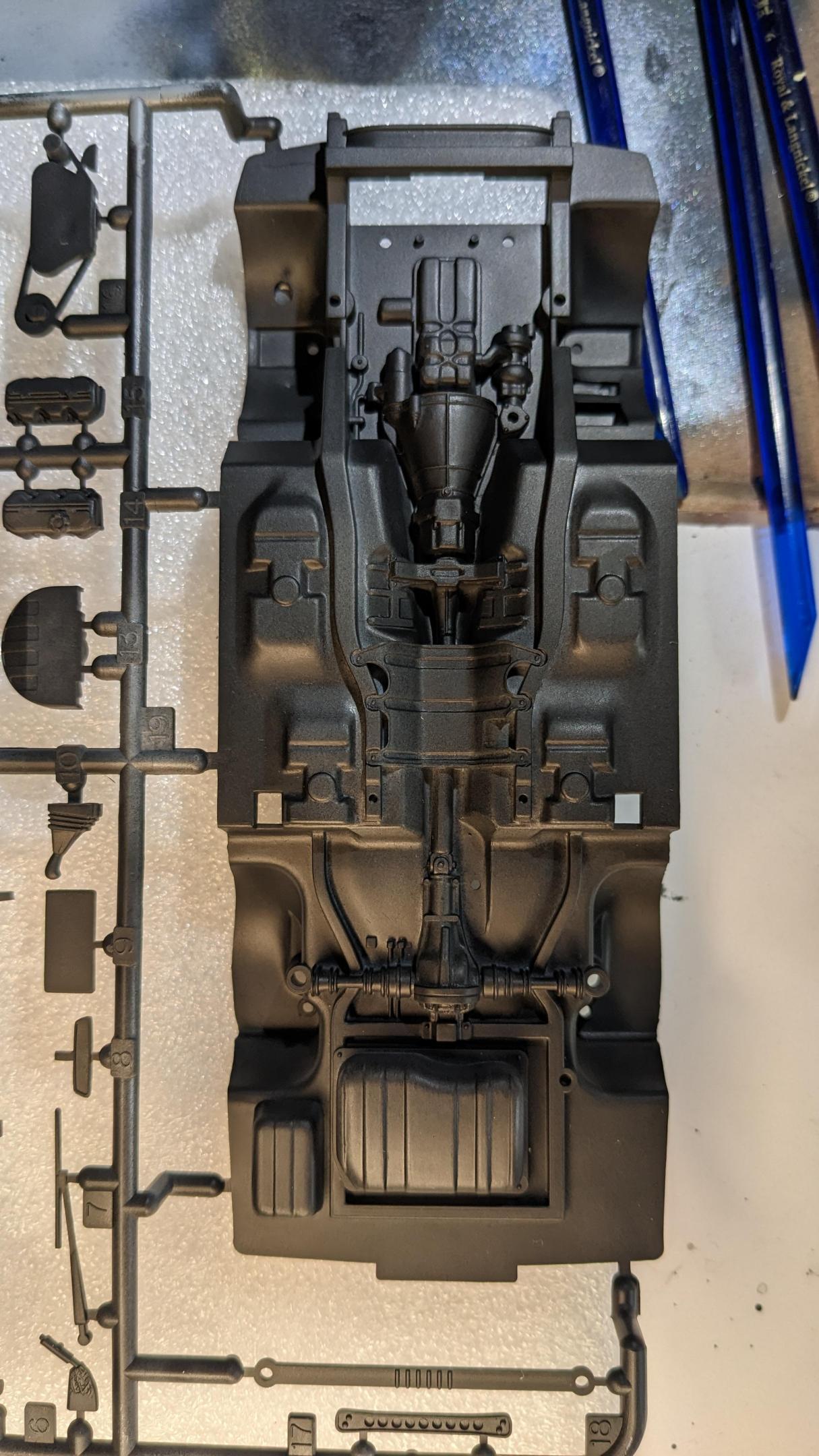Progress has been slow with some busy weekends (and maybe a new obsession with Car Mechanic Simulator 21 :p) Got the chassis and bottom bits done. Am blown away with how well a Tamiya kit goes together. I didn't realize it had adjustable front wheels and was a little anxious as I assembled and it just... fits. Nothing like the first AMT kit where everything was wonky. Was hoping to get engine bay done, but I goofed the oil fill cap and need to strip that head, so hopefully I'll have the engine done next weekend. Also need to decide if I'm tackling the window masks next after that or if I'm going to get some flocking and give the interior a go with it. Or both ? Wish I had more time to play with modelling, but such is life.