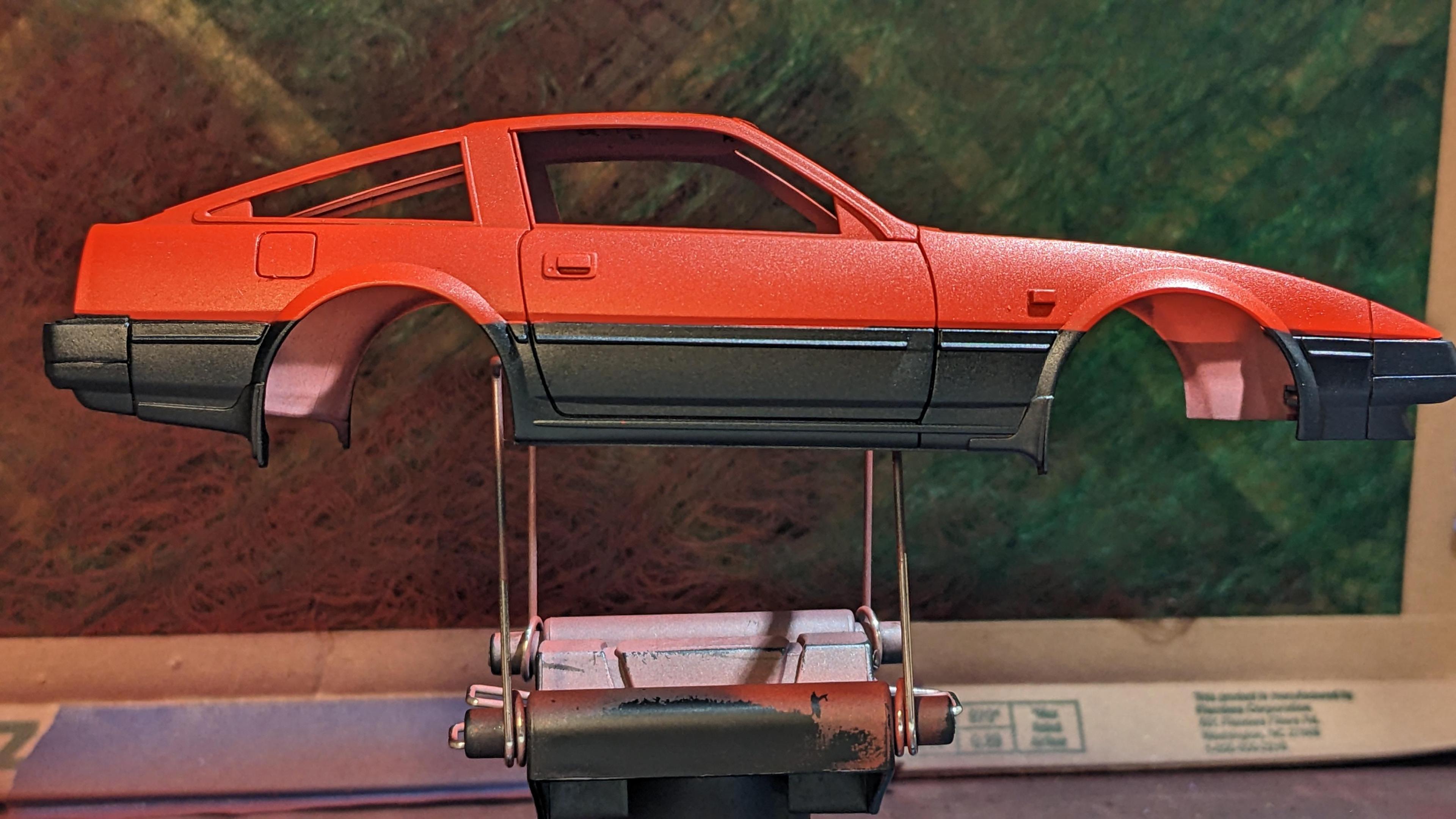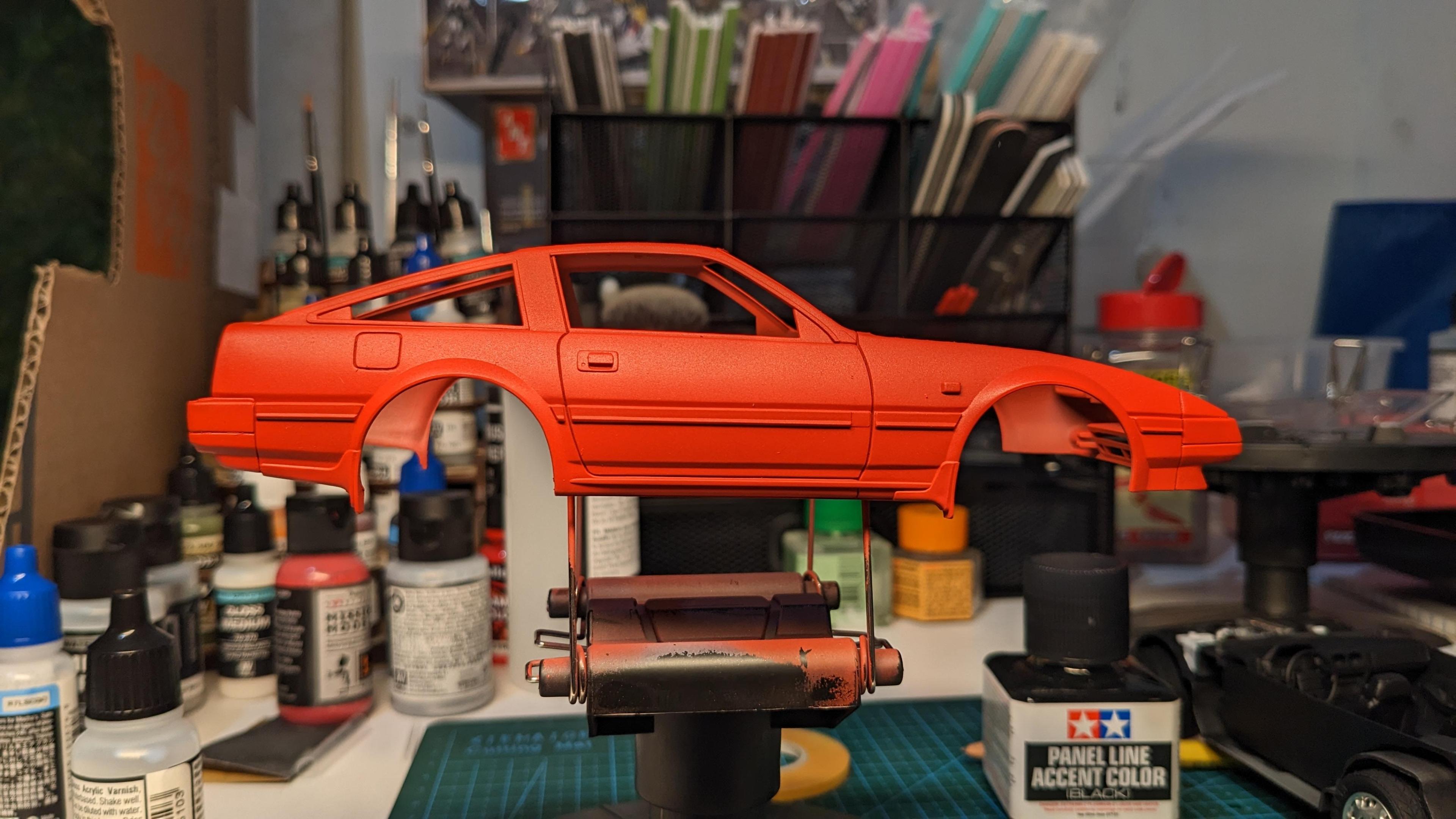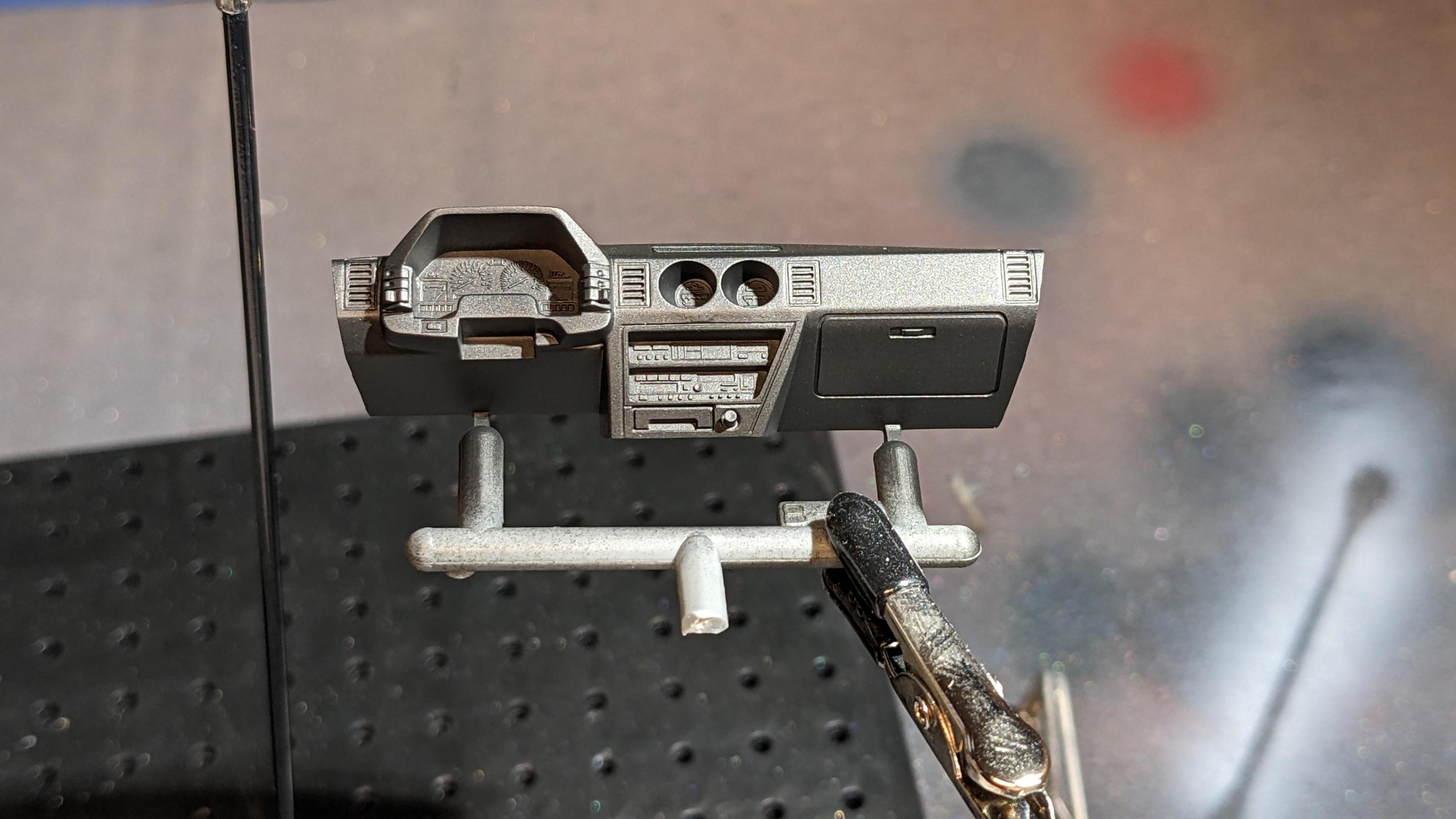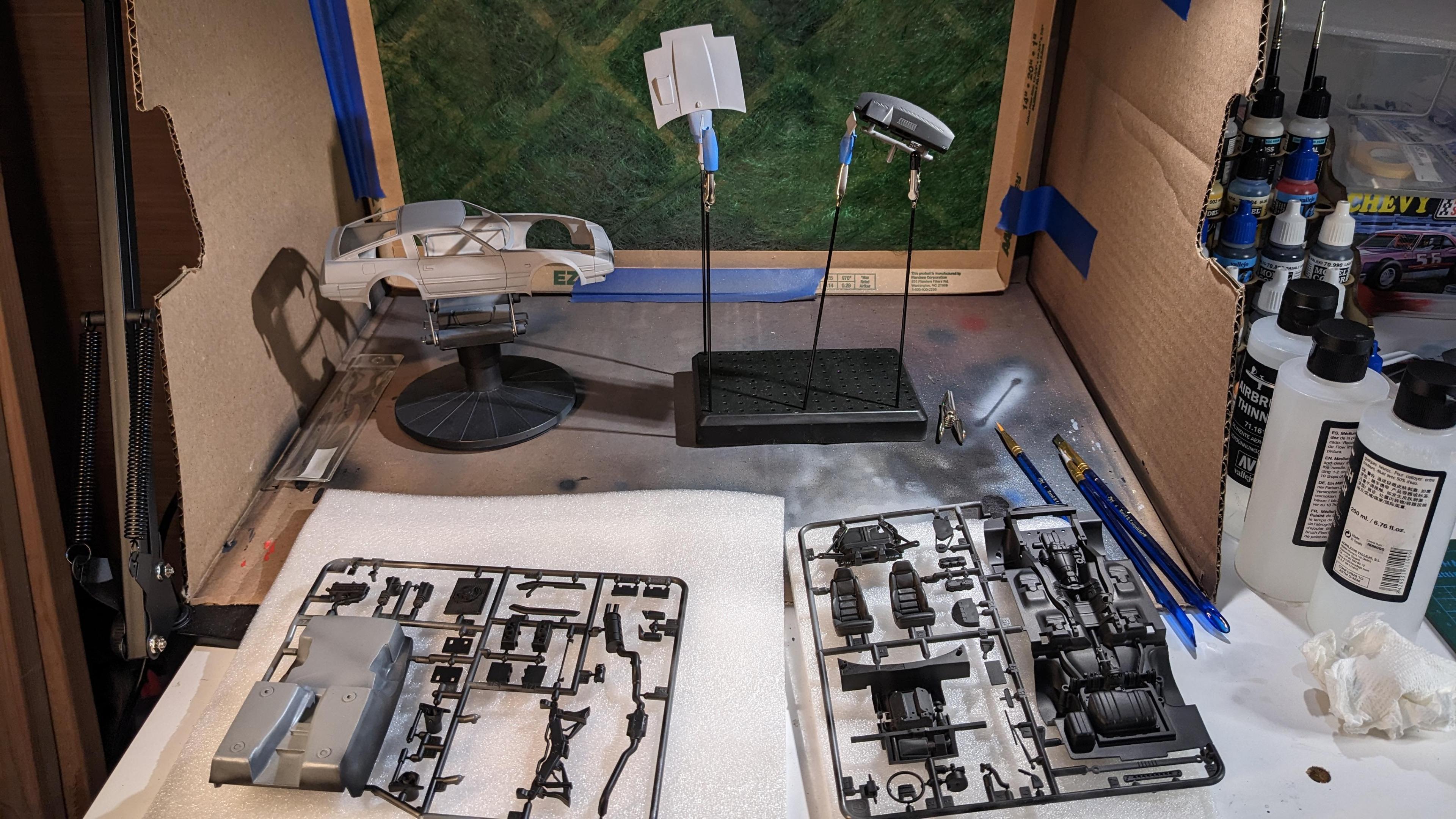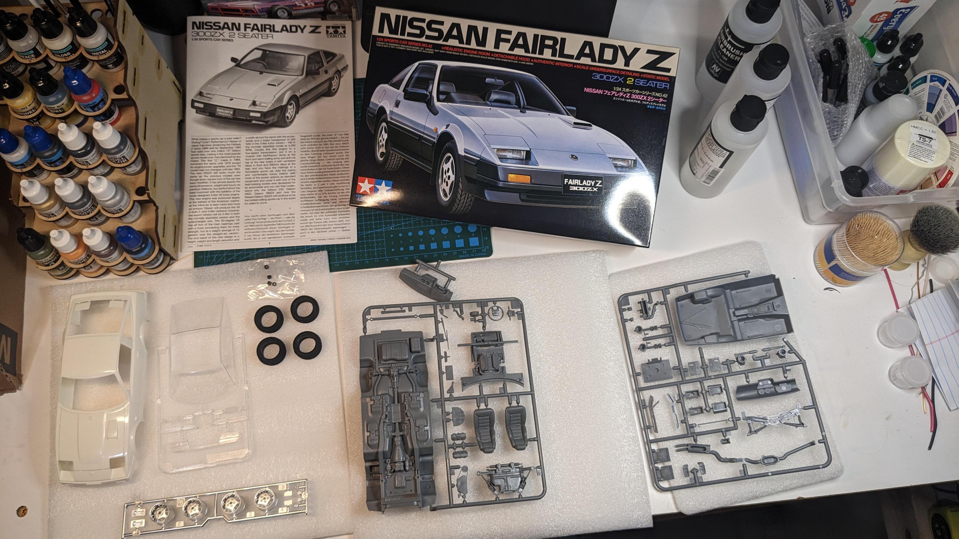 Started my second kit this week and it is blowing me away how much nicer it is than the AMT 66 Chevy Stocker! I've seen this kit (Tamiya 24042) get good reviews here and on Reddit, and it's already a blast. Prepped it earlier this week with a gentle wash, did a little scribing of the major panel lines and got the first pass of primer done. I took a stab at doing the first prime with everything still on sprue to keep it a bit more organized, and also get it all done at once. One issue I had with the Chevy Stocker was I was trying to prime each step as I went, and it made me slower than I could have been. Should have split the sprues into smaller chunks to get better coverage. I also learned I have not been cleaning my airbrush as well as I thought. Got very sputtery doing the grey on the body, and I had to do a total tear down and cleaning before coming back to finish. I've been doing bunch of casual research on the kit to see what colors and trims it could have been off the showroom floor. It appears to have features that straddle either trim levels or Japanese/American/Canadian markets. I think all the American turbos had spoilers, and this kit does not. There were one or two other little details that didn't exactly match the reading I've done, but I did find a forum talking about the earliest '84 Z's and apparently the first 5000 turbos were hardtop, and the t-tops came after, so maybe those first cars had some variations lost to time. My plan is a glossy red body. I'd like the lower body trim to be black, so I'm going to have to learn how to mask it. Also have to learn how to mask the windows. The interior will probably be red. Might go with black leather seats in there, which might not be realistic, but could look good. The dash detail is amazing. Not sure I'll do it as much justice as it deserves. Was thinking of doing a little engine wiring, but the way the plug wires route on this, they get mostly hidden, so maybe wiring will be the next kit. I use Vallejo acrylics, a mix of Mecha, Model, Air and Game- whatever color grabbed my eye and imagination at the store. They mix well, and I've got their gloss varnish to hopefully make the body pop. Primer was straight Mecha black for the interior and mechanical bit. Although I literally just realized I left the headlights in that spue lol...we'll have to figure out what kind of recovery is required there. The body I did with a 20:1 Grey:Mecha Black. The grey was going on so light on the body I could barely see it when I started, so I added just that touch of black and it made it a lot easier to work with.