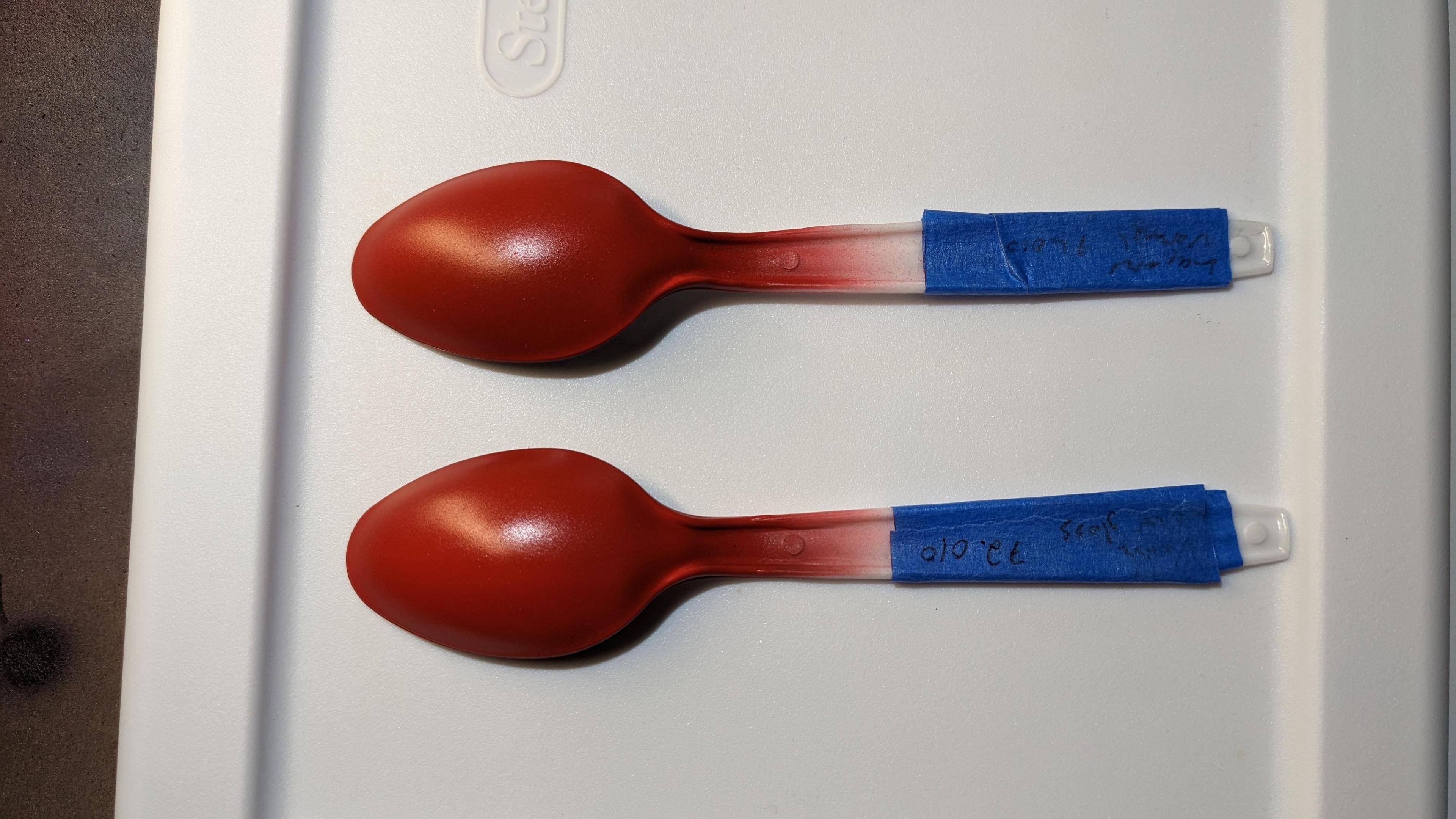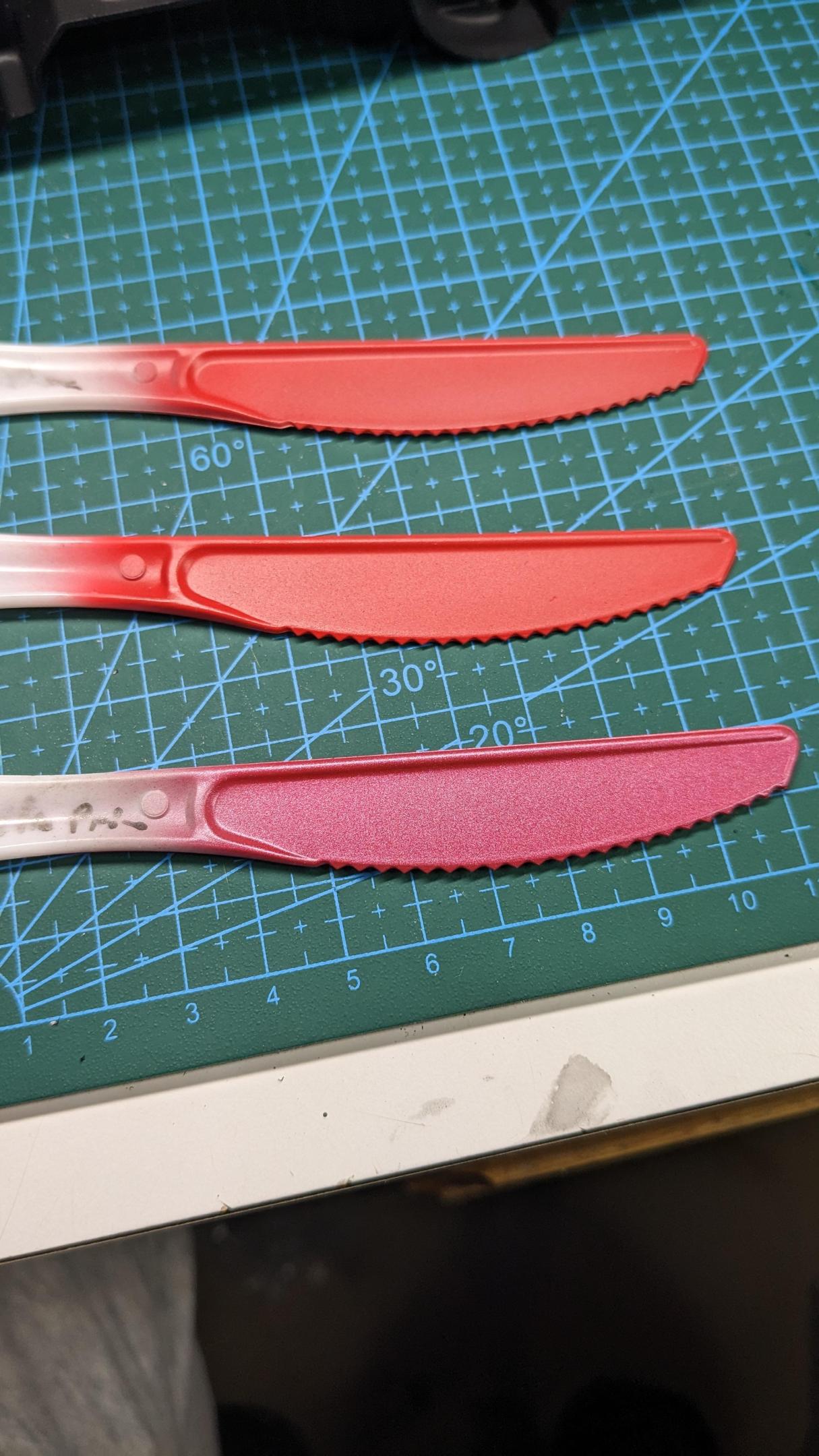 I've got a couple plastic knives I tested some reds on while I was out of spoons. I'll try to remember to post them up later. Will be testing a couple application ideas to see what looks good. A video by a guy who uses Vallejo paints and does a lot of gundam has a method for chrome using layers of black primer, gloss varnish, then Vallejo metallic chrome. Looked good on YouTube, so I'll be trying some spoons in grey primer: red with gloss medium over varnish gloss and then getting gloss varnished. I'm also curious what the gloss medium would do to the primer, so I'll trying spoons with primer, then a coat of primer plus gloss medium, then the layers listed above. I know it won't be as eye popping as enamels and lacquers, but without the ventilation needed, I won't be using those anytime soon, and maybe there's a way to get something good.