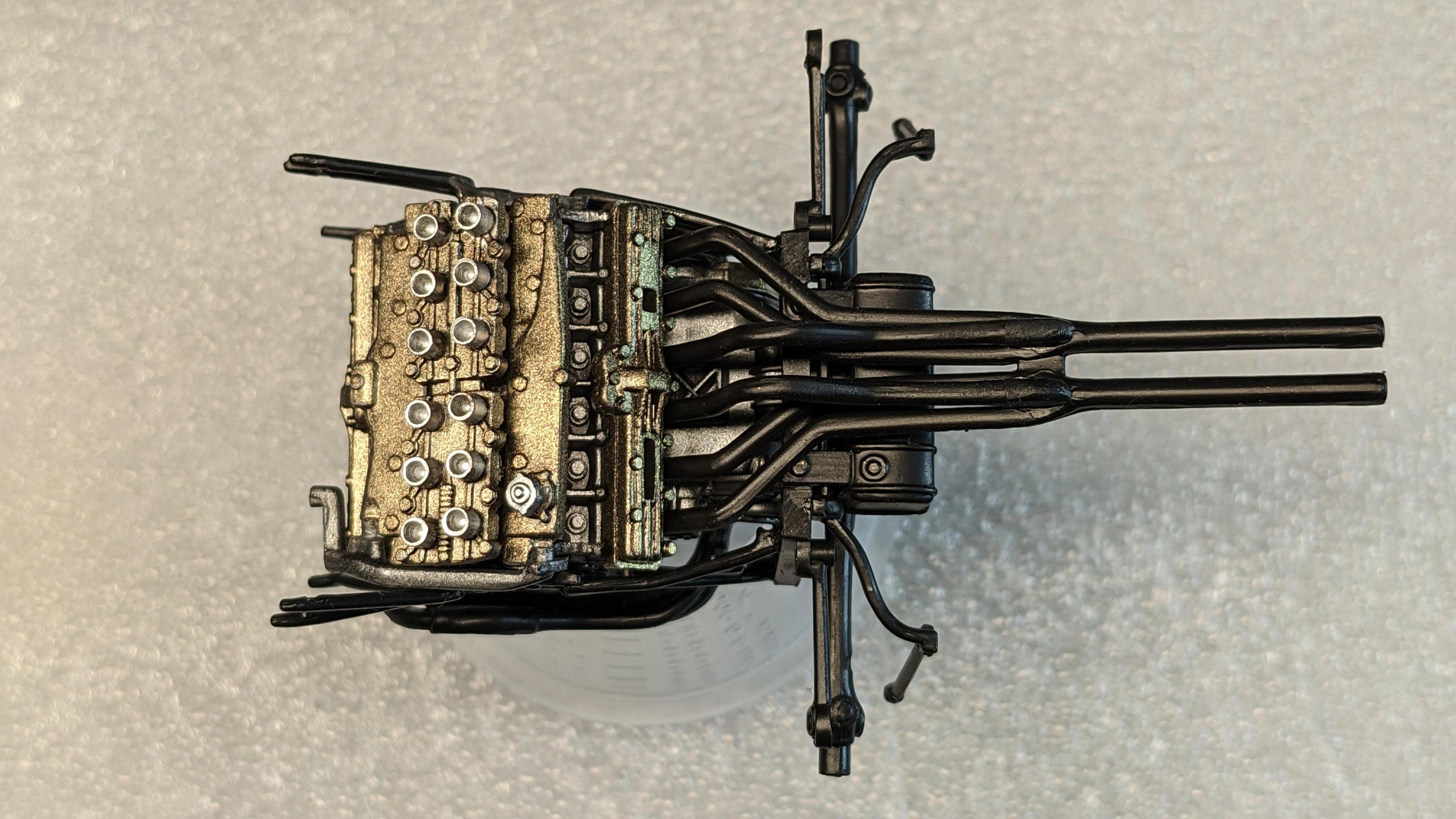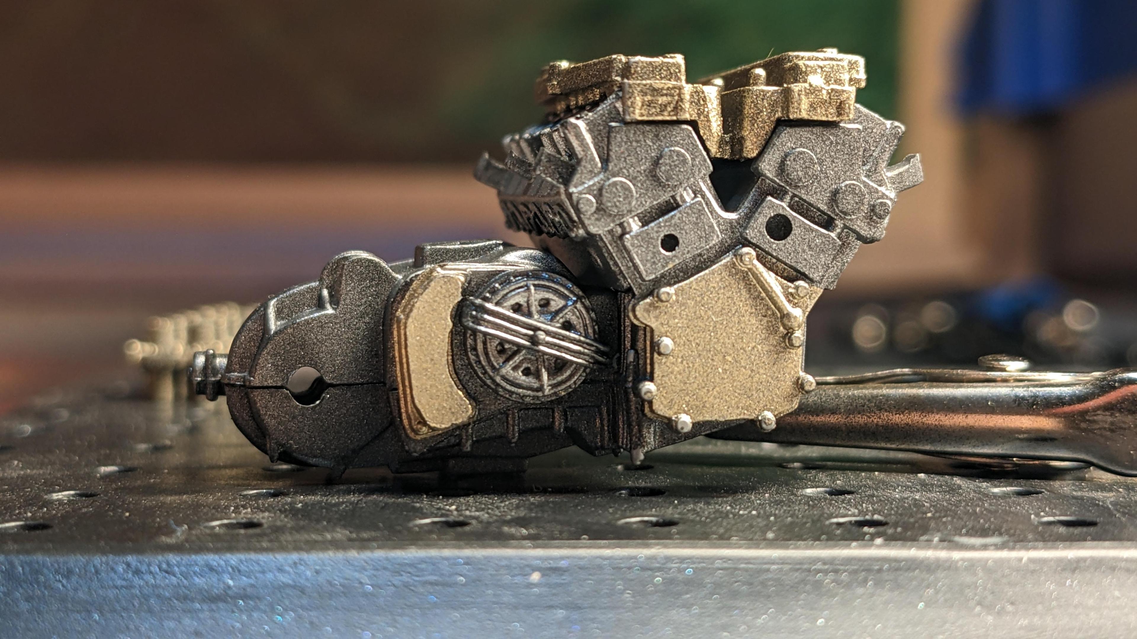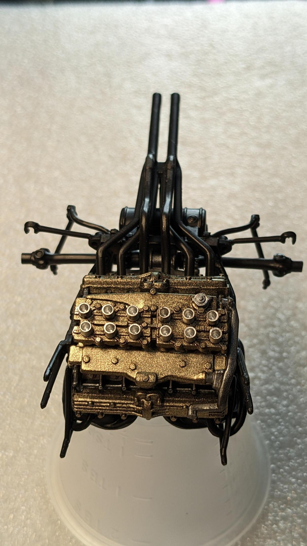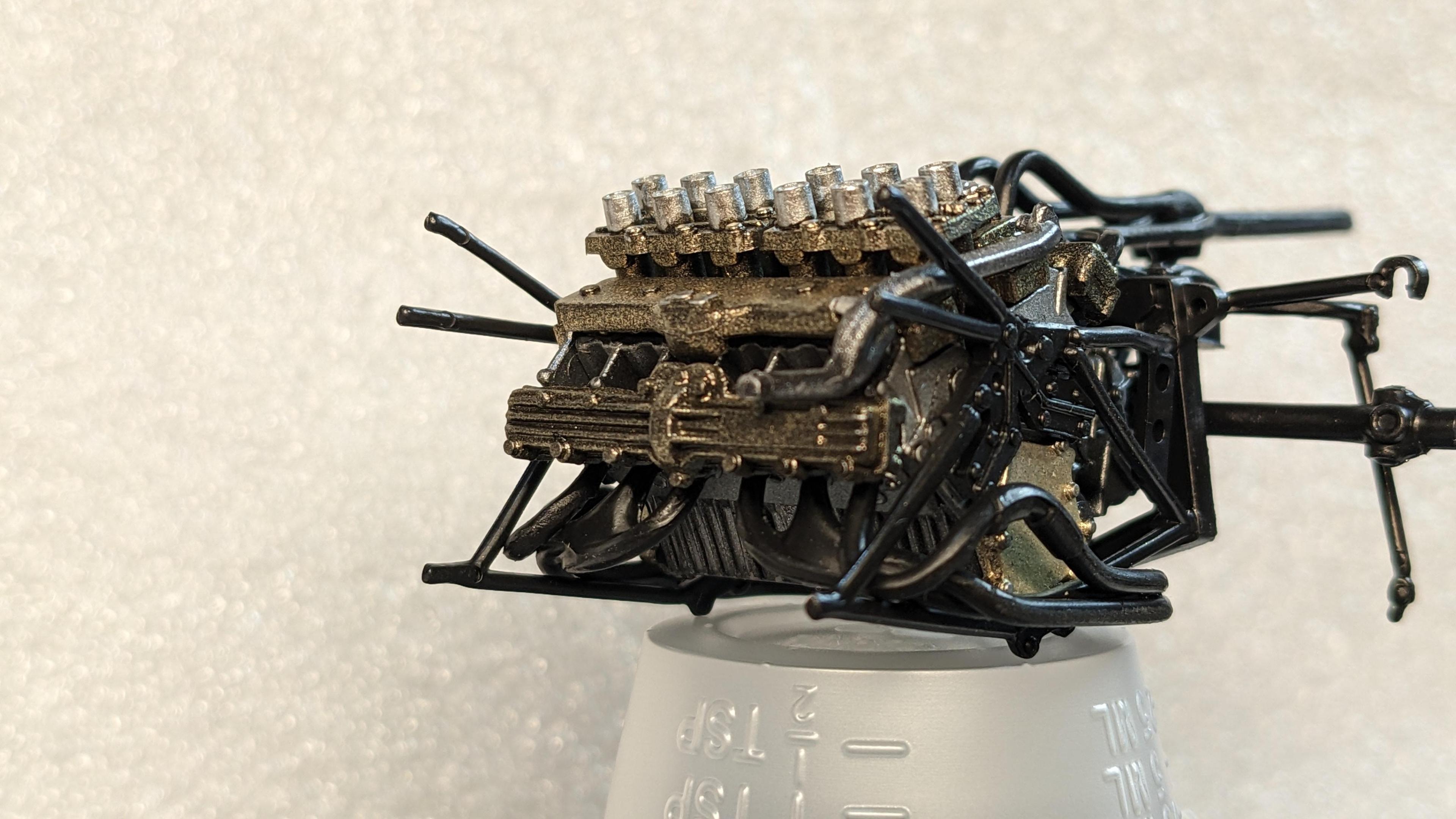 Got the core engine parts primed and painted, including the parts getting the aluminum/gold mix (except for part of the distributor- has to be hand painted due to size with like 4 different colors on it). Masking wasn't perfect, but still came out pretty good I think. Next up is a bit of chassis support for the engine. Hopefully I'll get it at least sanded later today. -