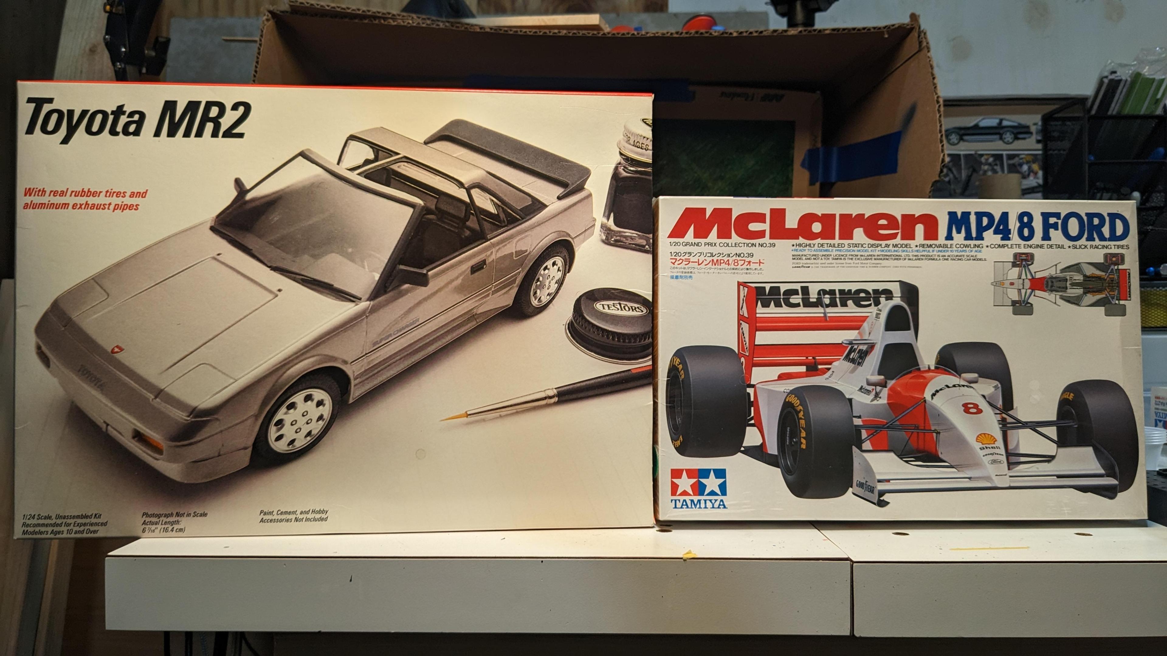 Got the engine mostly done. Amazing how things go from scattered parts to just fitting. The exhaust pipes get glued together and somehow line up exactly with the engine heads. Still have the 5-color distributor to hand paint. That'll be a challenge, but it's pretty cool so far! Also a peek at the kits I grabbed at a show yesterday. MR2 was an impulse grab because it's a Fujimi kit and I've always liked that body style, and the McLaren should be fun, too. -