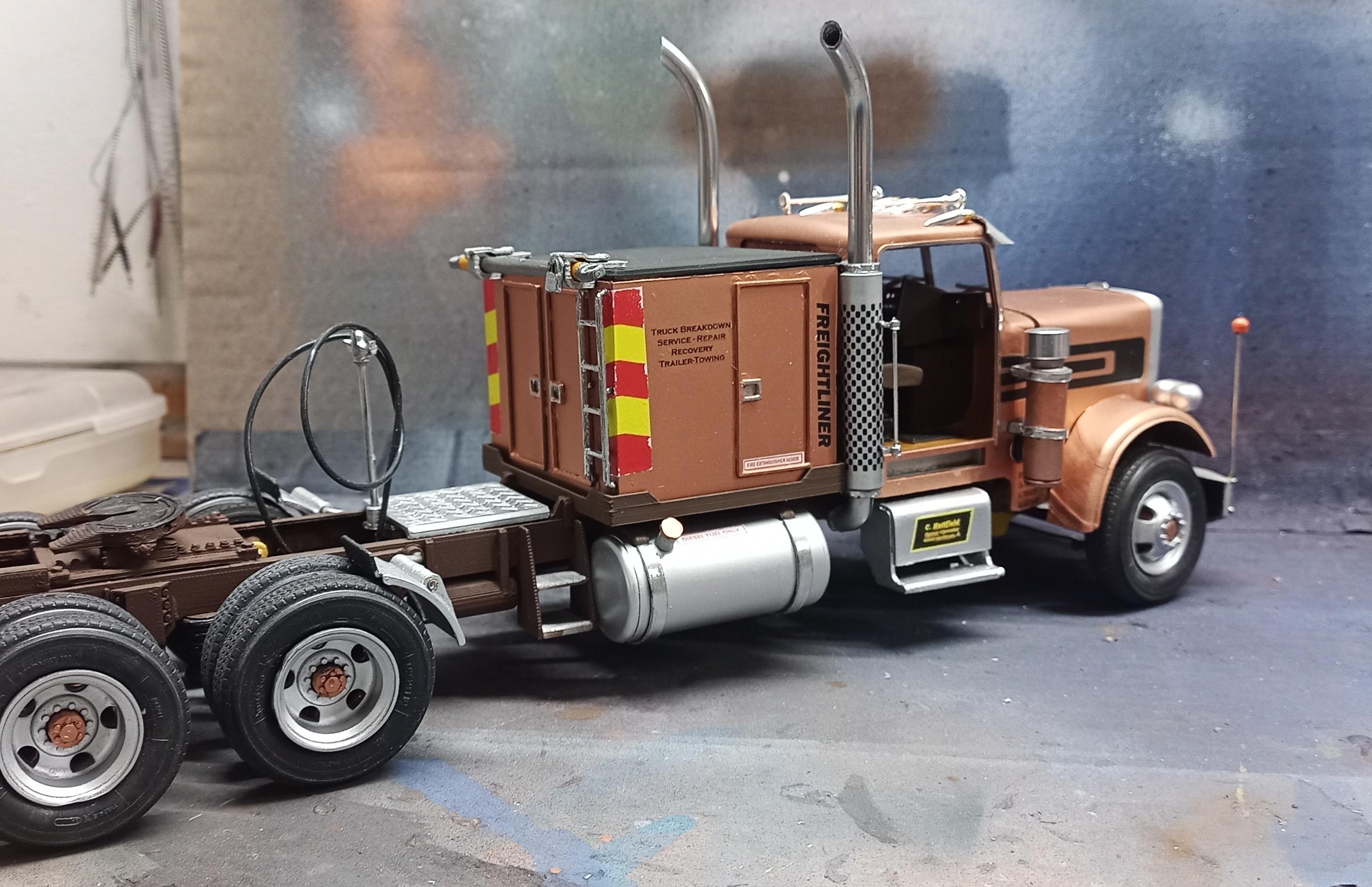 I might add some orange flashing lights on top of the service box. Also red and yellow signal decals. Don't know what they're called. My vision of this build is a service truck for broken down trucks on the highway or where ever. The fifth wheel is for towing trailers of non reparable trucks to a service point of some kind or to their destination. A tow bar and chains might also be added. -