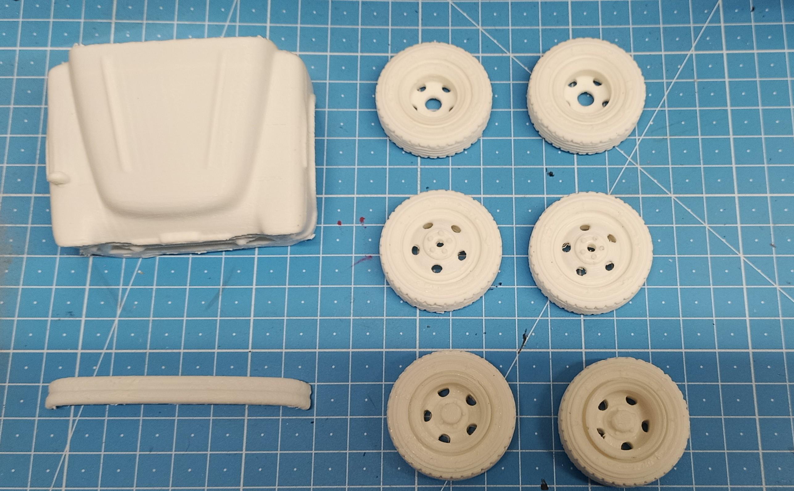 Wheels and the front are printed: The bumper broke off while removing the support structure. But it didn't break. -