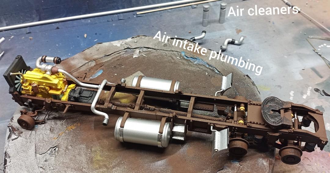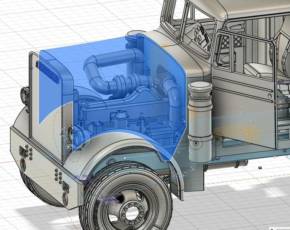 Now that the exhaust looks so smooth and clean I didn't like the air intake on the turbo charger anymore! I found an unused one from an AMT R600 kit and cut off the long end since I have to fit in a tube when the cab is on the chassis! I think it looks pretty nice now: It's not glued yet. Maybe I'll have to adjust the angle a bit depending on the space left underneath the hood. My virtual mock-up says it should fit! But that was with the printed version: -