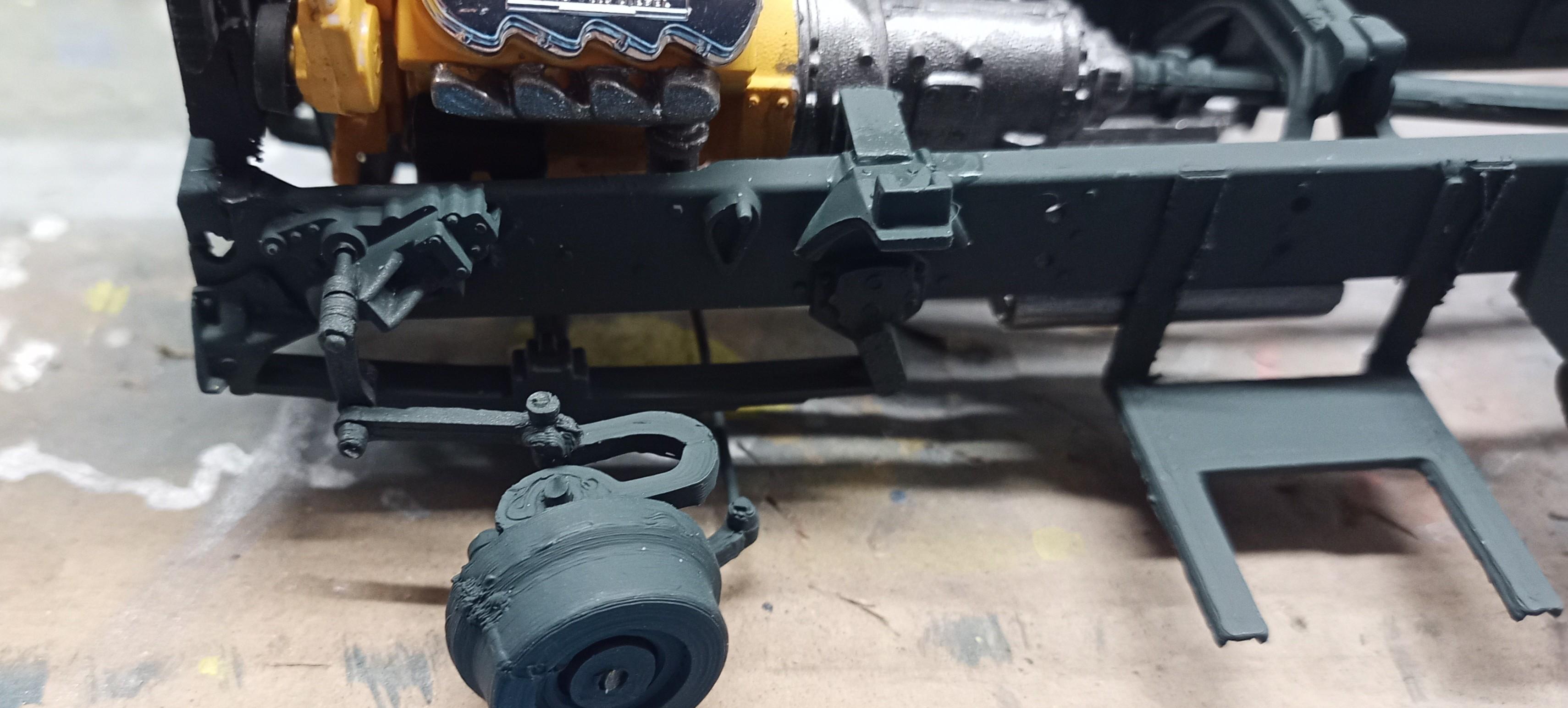 I began painting and assembling the engine. The compressor seems to be shown upside down in the instructions (we know AMT instructions) but Jeff told me where to look and find a pic of the real thing. Thanks Pal! 👍 Hope to finish the engine today after work. I also replaced those little knobs on the hood which we're supposed to be hinges. I made my own and modified the front end of the chassis for the tilting axle. -