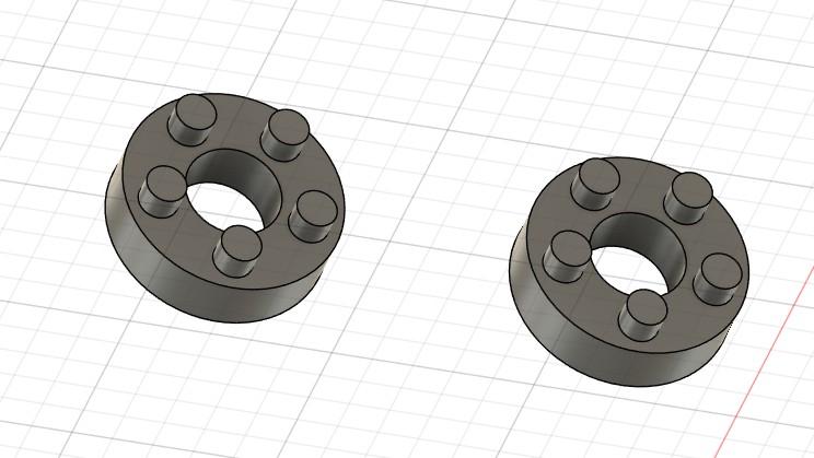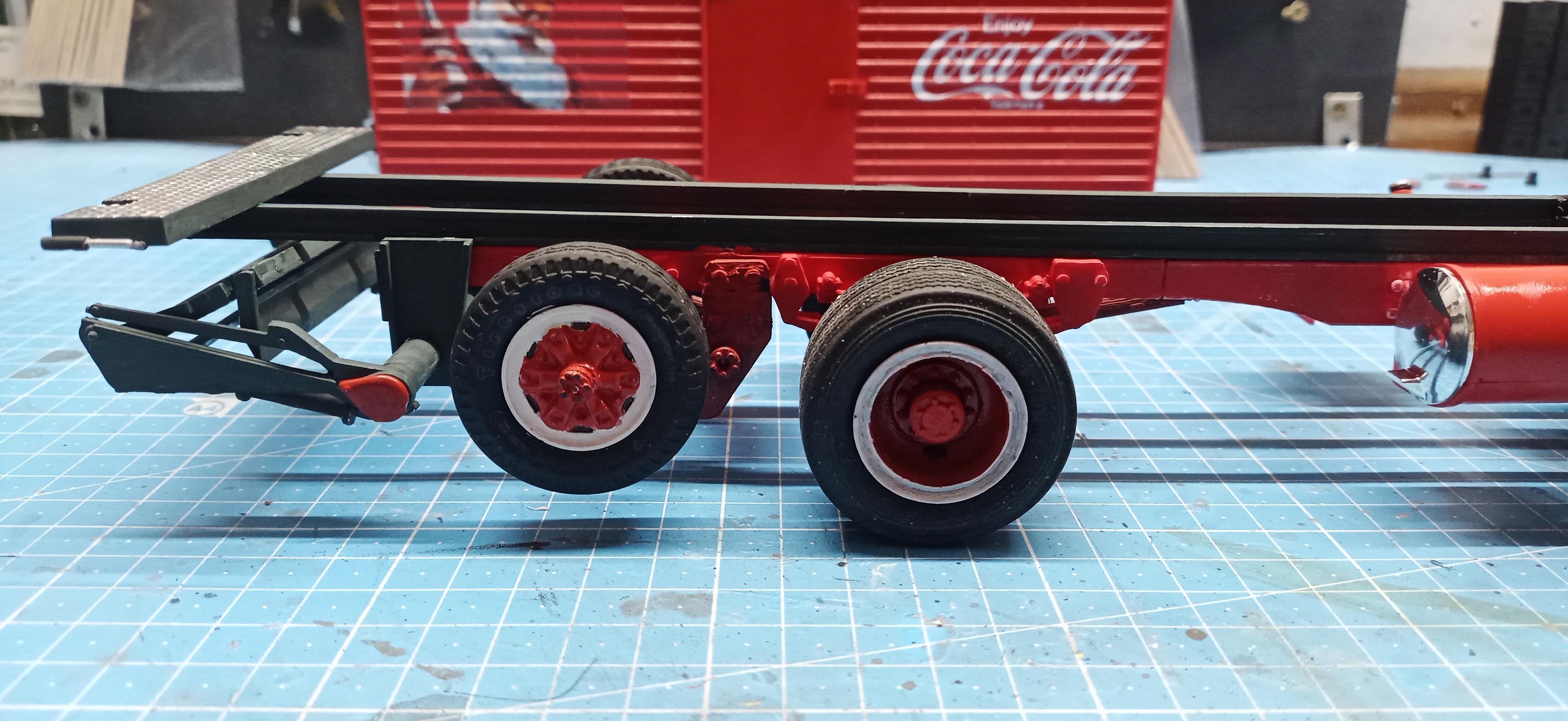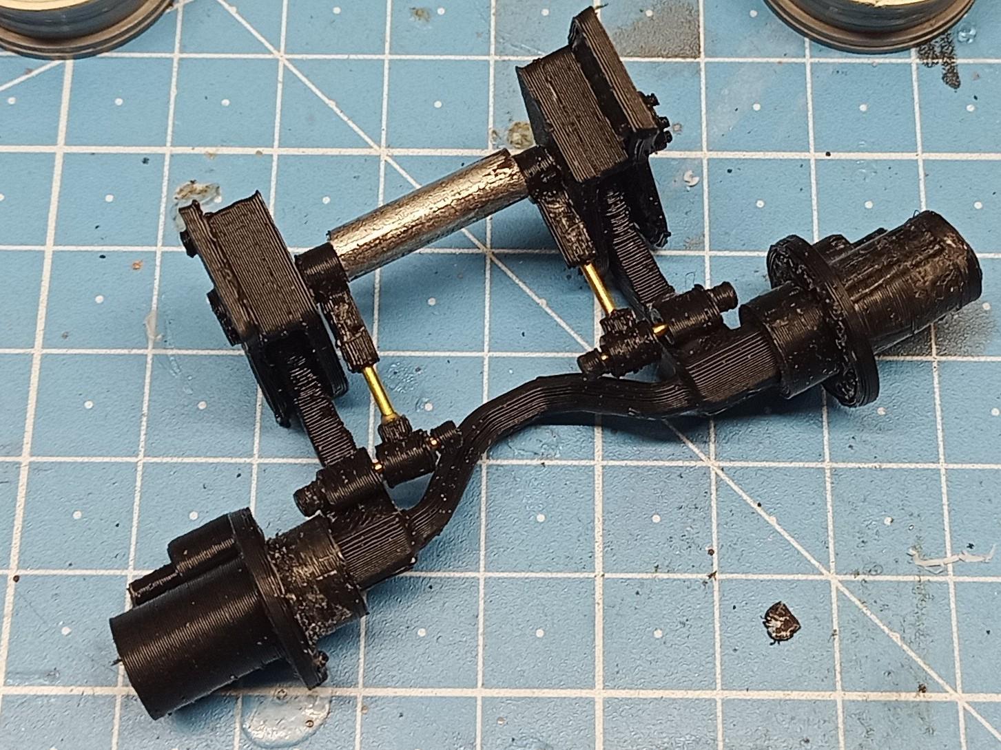I had an idea which I immediately turned into reality and it worked: I made two sockets (printed) ... (I forgot to take pictures of the parts so I'm showing the drawings) These sockets go into the ends of the tag axle. Then I made hubs ... ...and put little brass rod pieces through them with the wheels in between! The rims are from a formerly knocked down Volvo F12 Globetrotter from Italeri. The tires are old AMT ones! Now you can see the lift function of the axle: