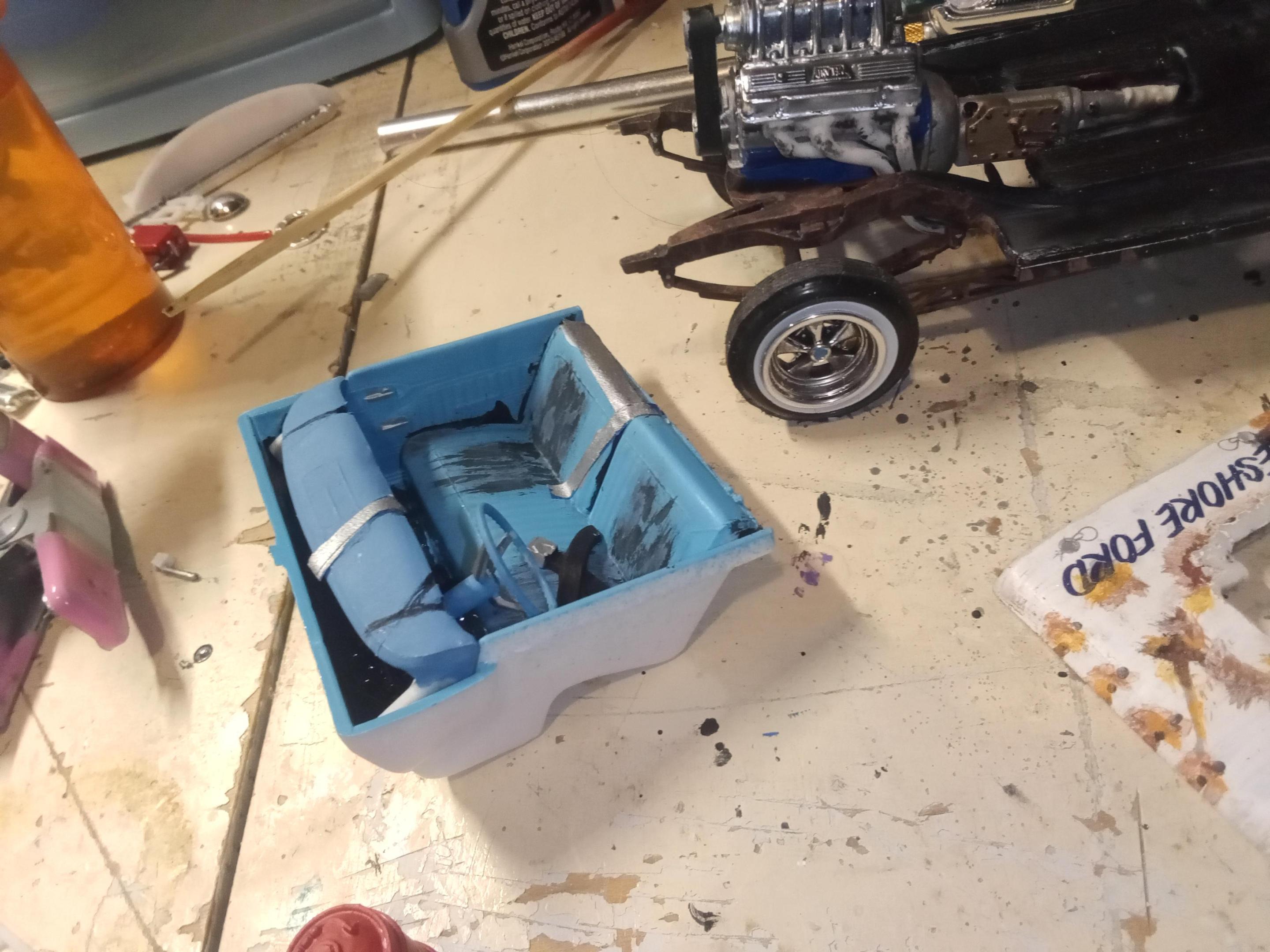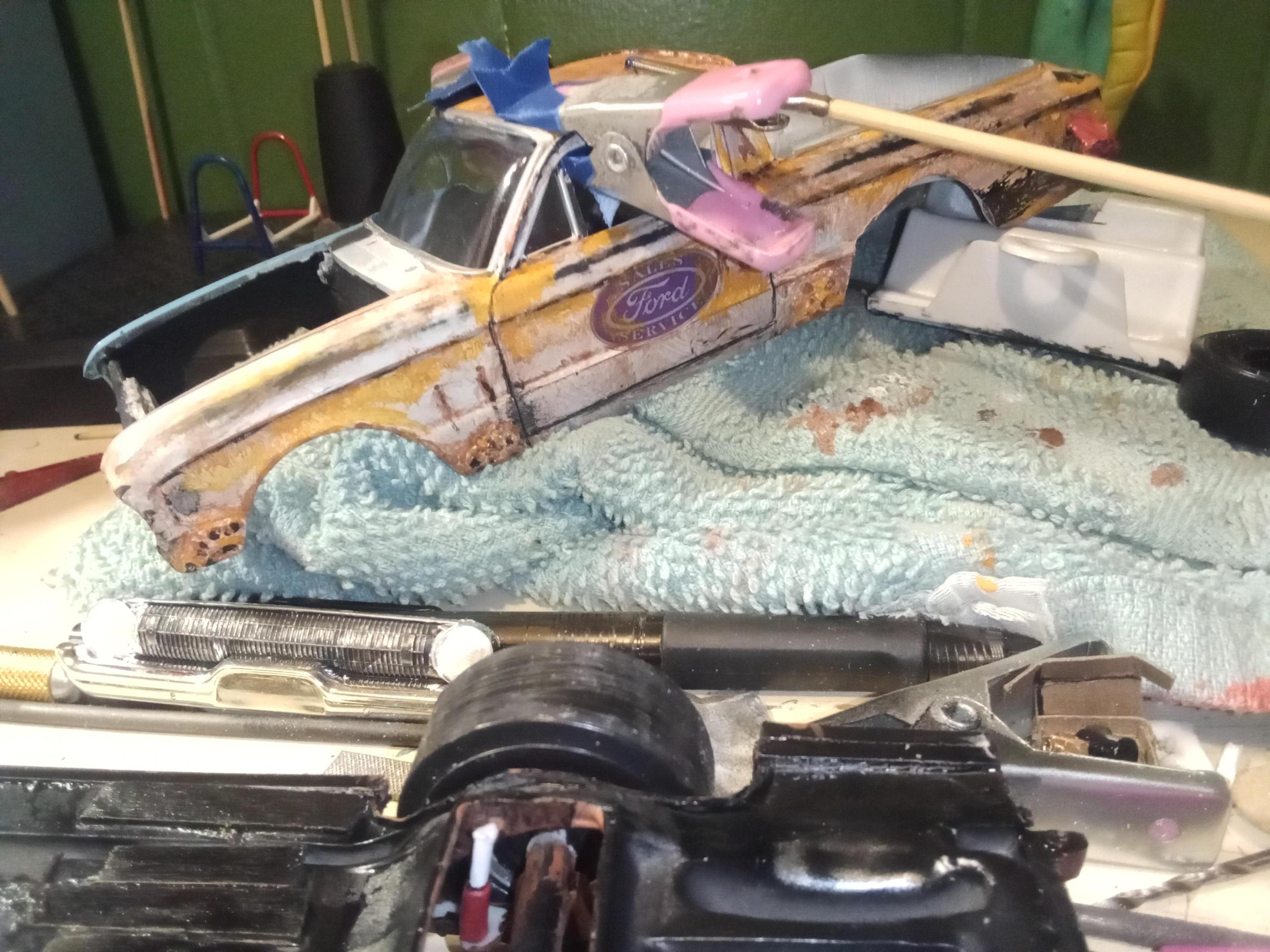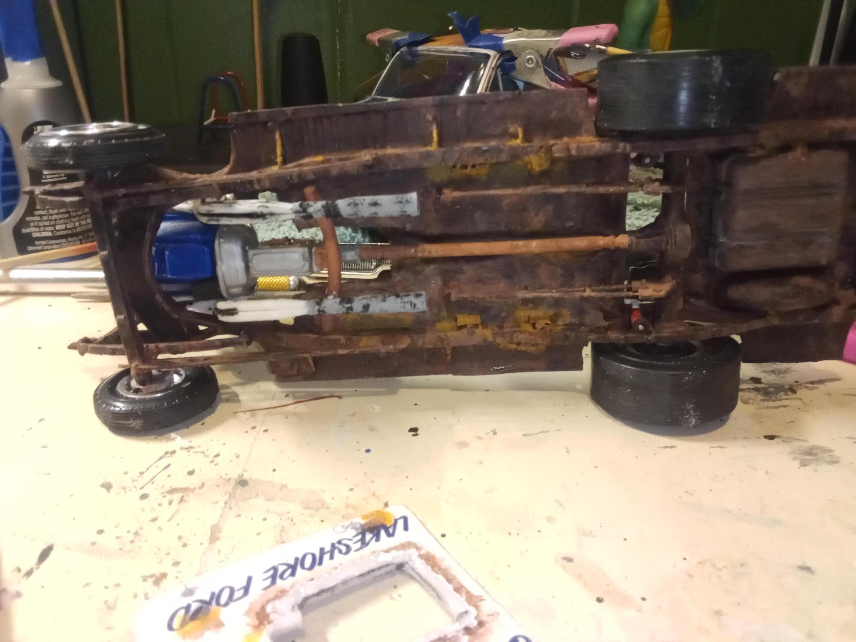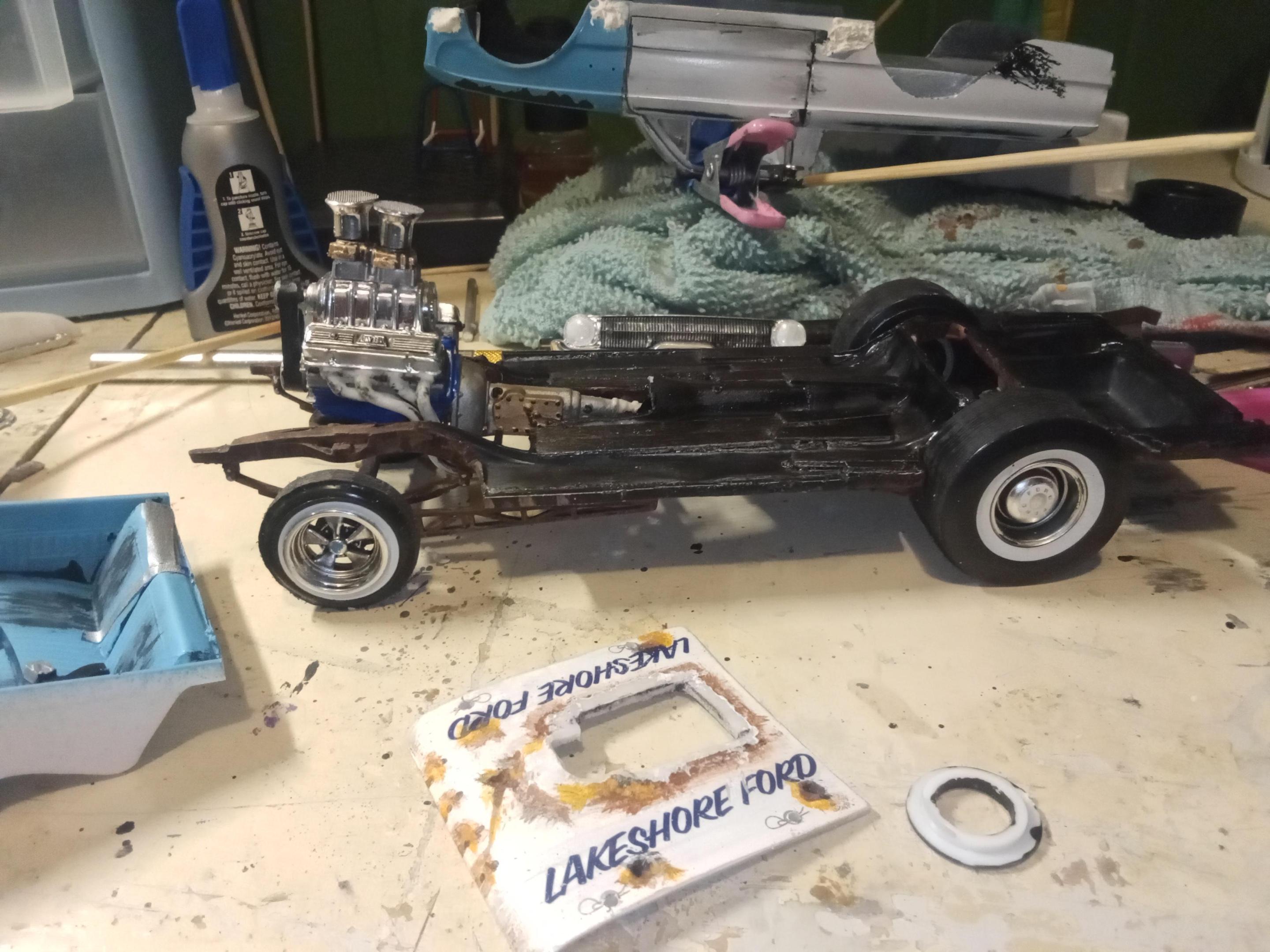 I'm building a ranchero gasser. It has a 55 Chevy frame that had to be cut in half and shortened. A kitbashed engine. I've not tried weathering before so this is my first attempt. Any feedback will be appreciated. Thank you