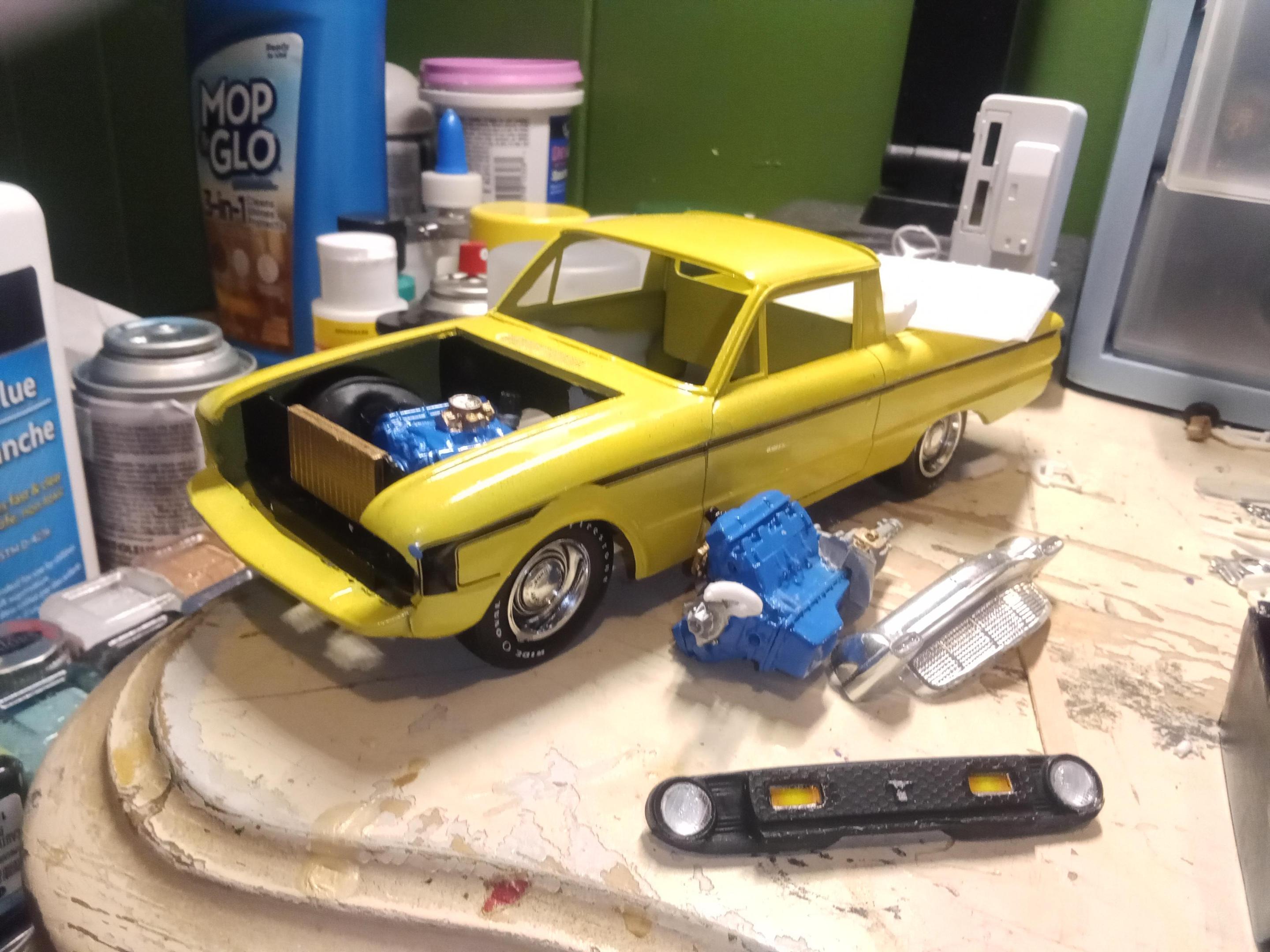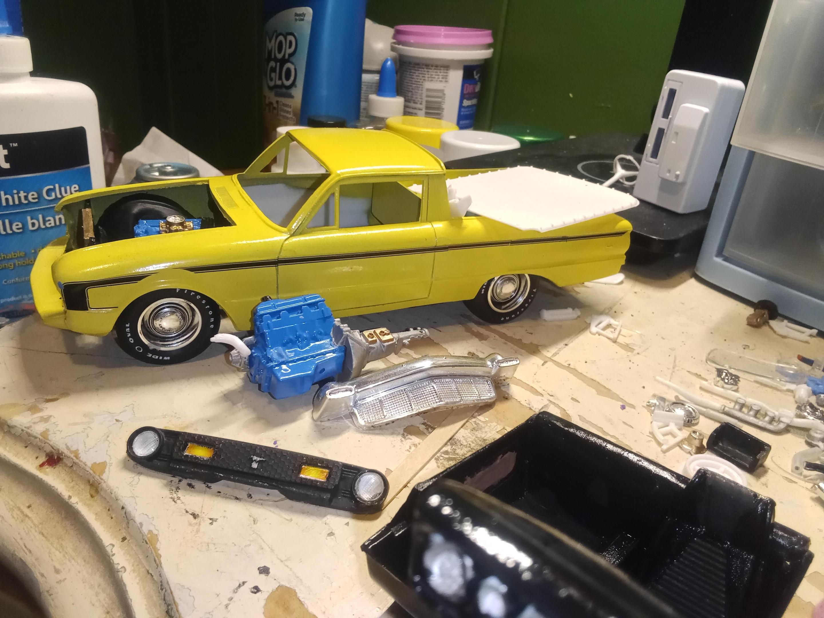 Hi,I'm building a ranchero and combining a 1970 mach 1 mustang. I used the kits stock molded in bottom. Added the mustang nose,cut up the ranchero grill and added part of the mustang grill. I had to cut the mustang interior tub and shorten it to fit the ranchero interior. I've painted it mustang yellow and started adding the decals. I also cut the mustang hood down to fit. Then I cut off the front of the ranchero hood. So now it has a more natural hood. I've gotta go to hobby lobby and buy another mustang kit for the decals. Where the ranchero is longer it's going to need two sets of decals. Thanks for looking and any feedback will be helpful