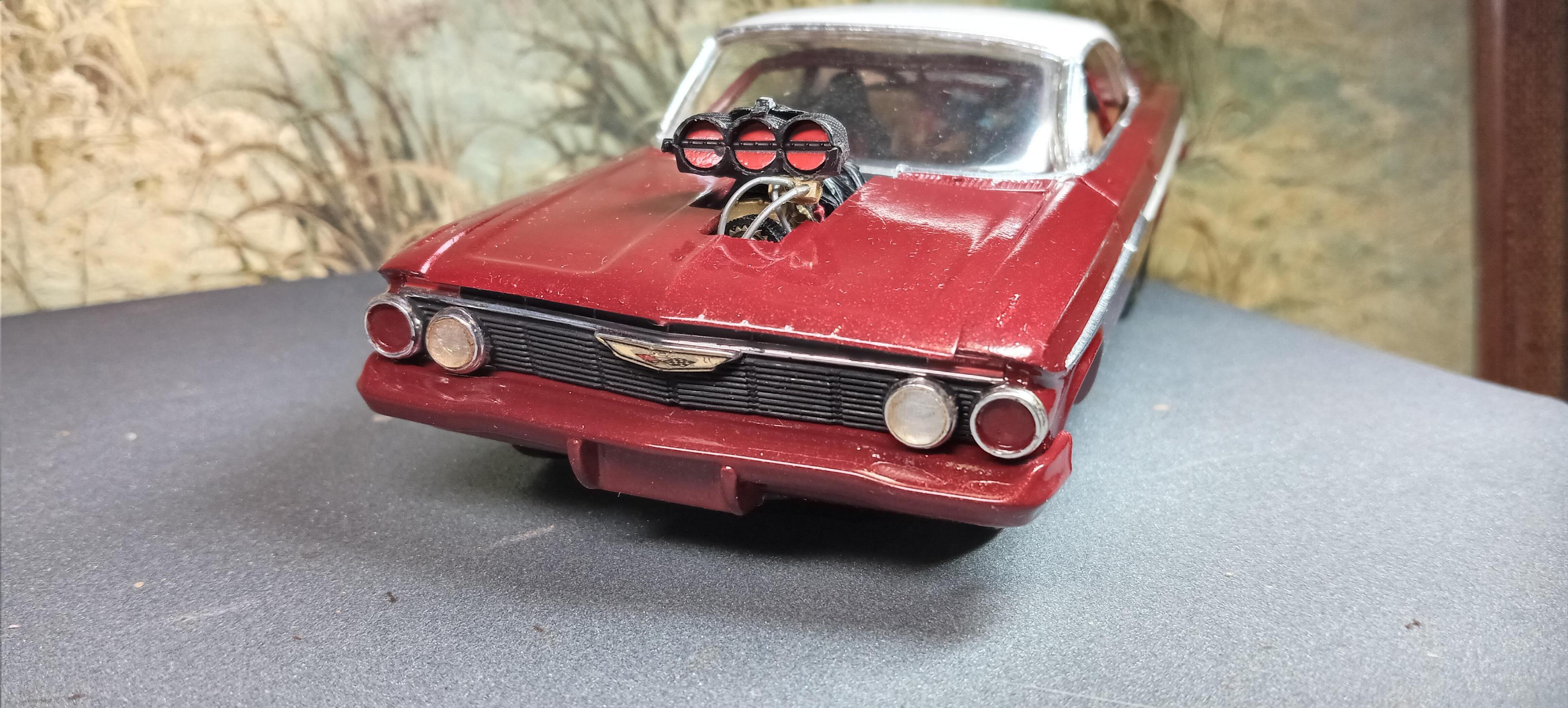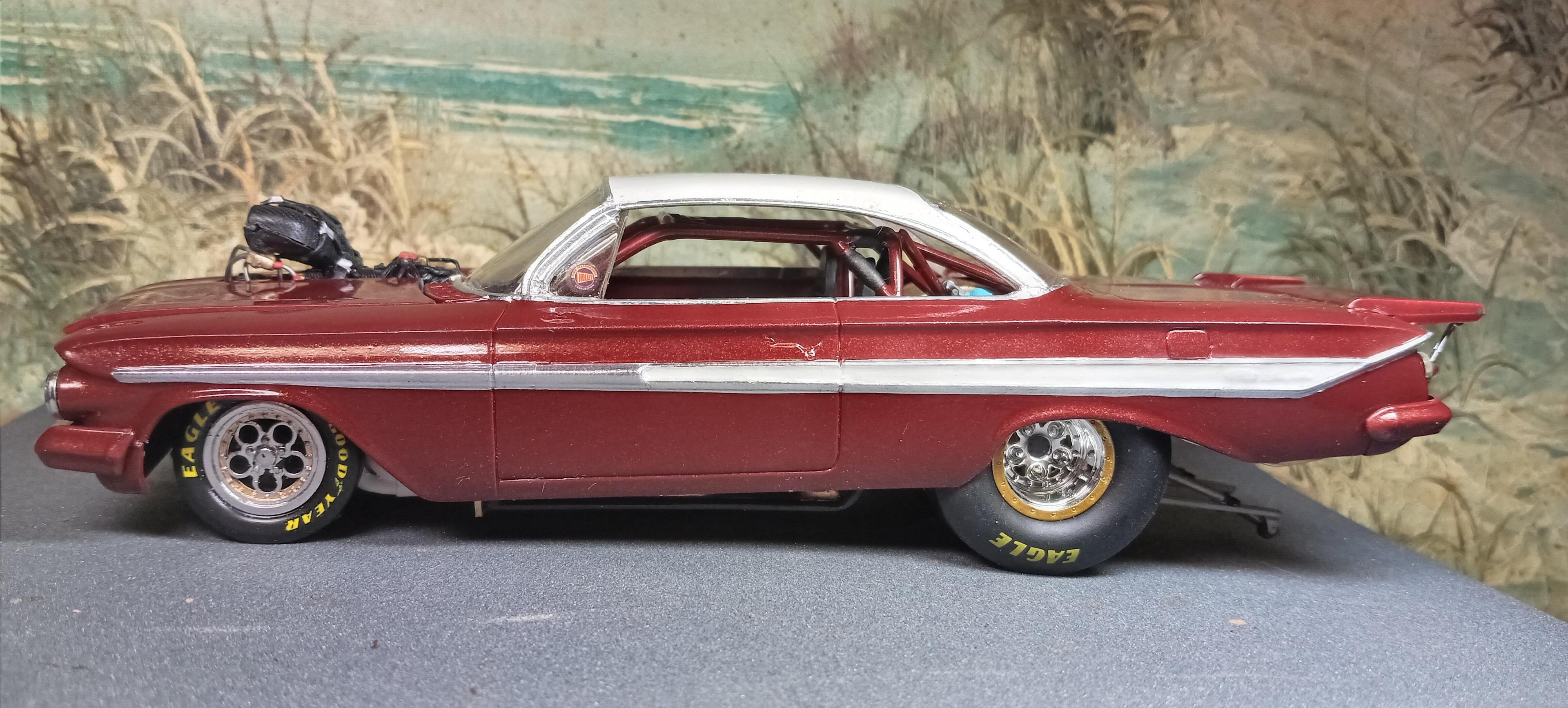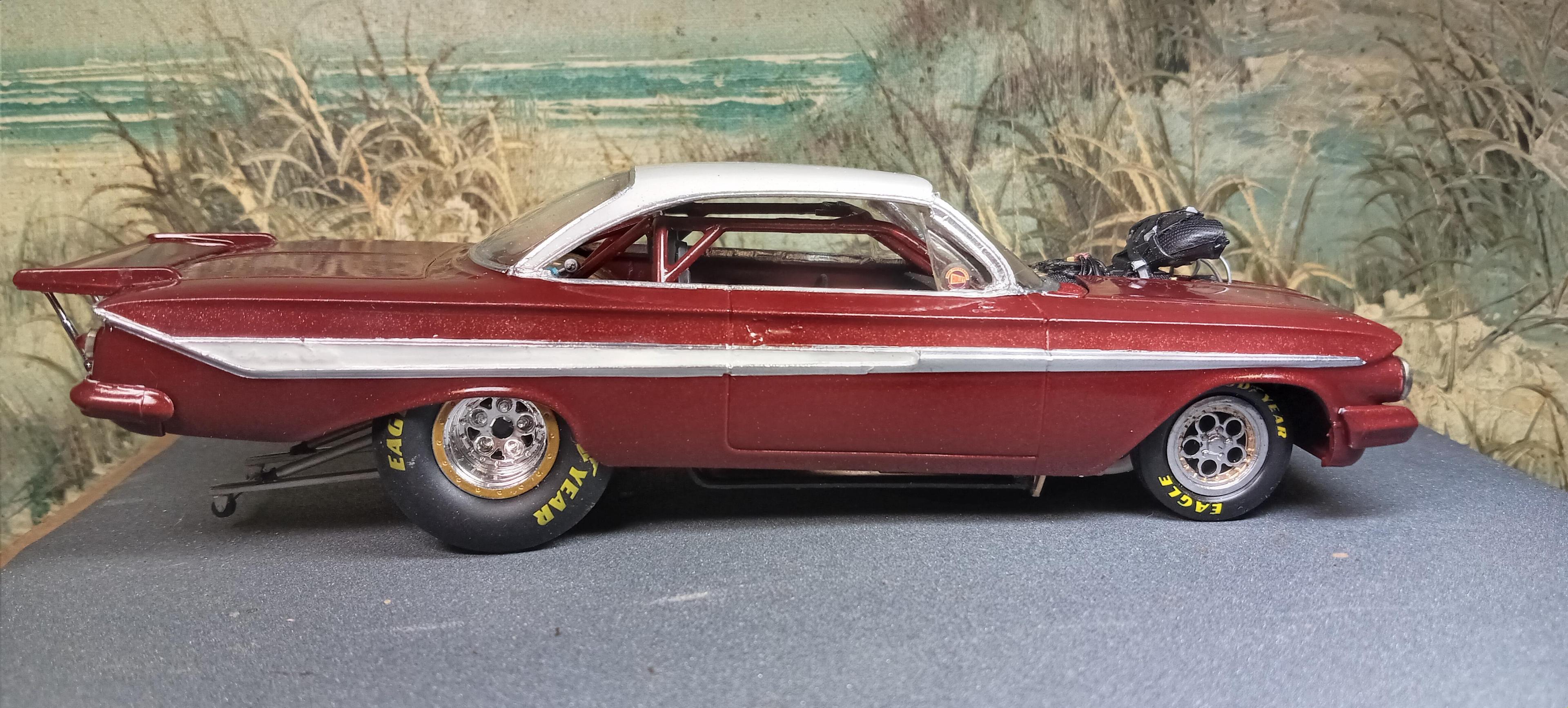 4. Here is my 61 Chevy Impala Pro Mod.I built this for my friend Ron.He picked the color combo.She has that monster Funny Car engine.Big Funny Car Slicks.And Resin rims up front on skinny Goodyear Eagles(decals added to tires)I used Bob Gliddens Pro Stock Thunderbird as my chassis...She is painted"Reving Red Metallic".Testers rattle can.With 2 coats of"Wetlook"clearcoat...Thanks for looking....