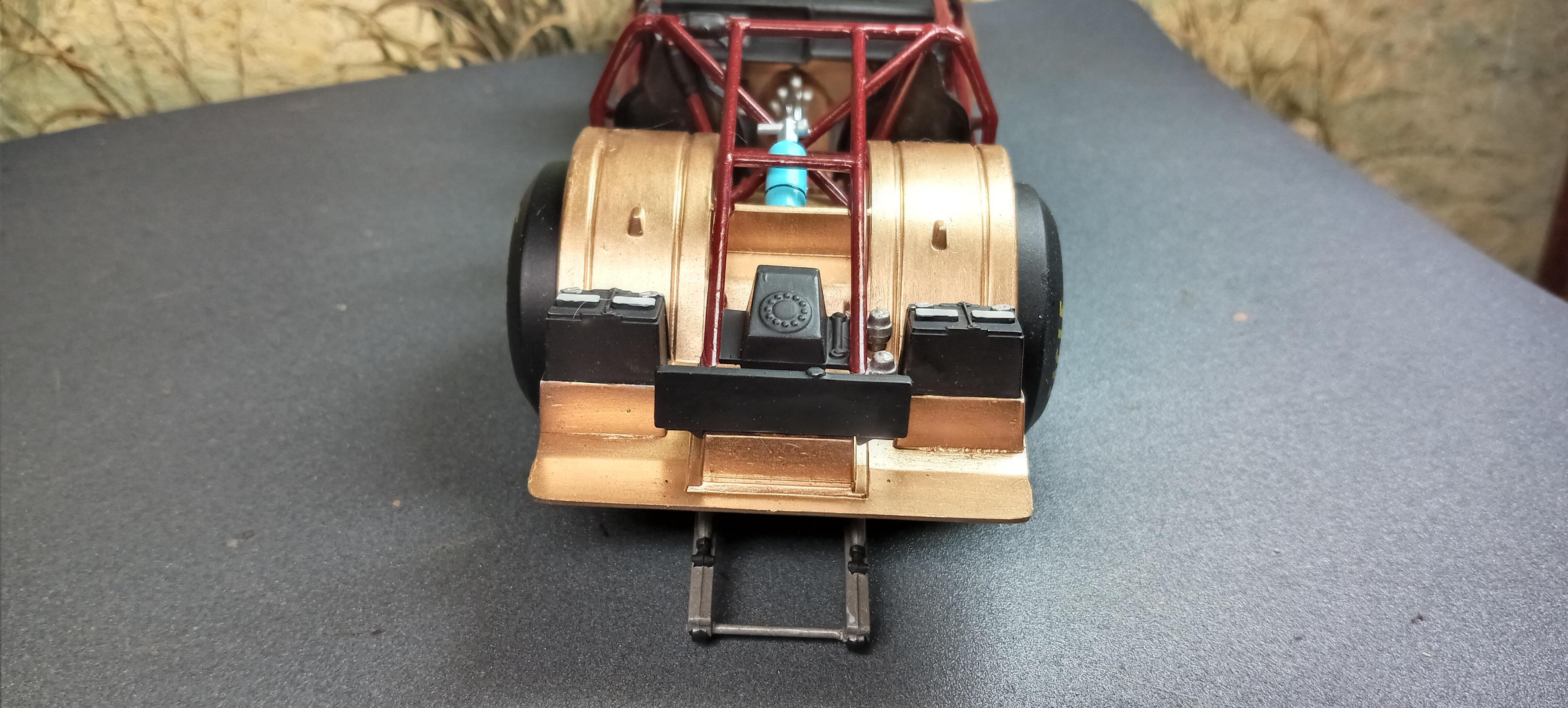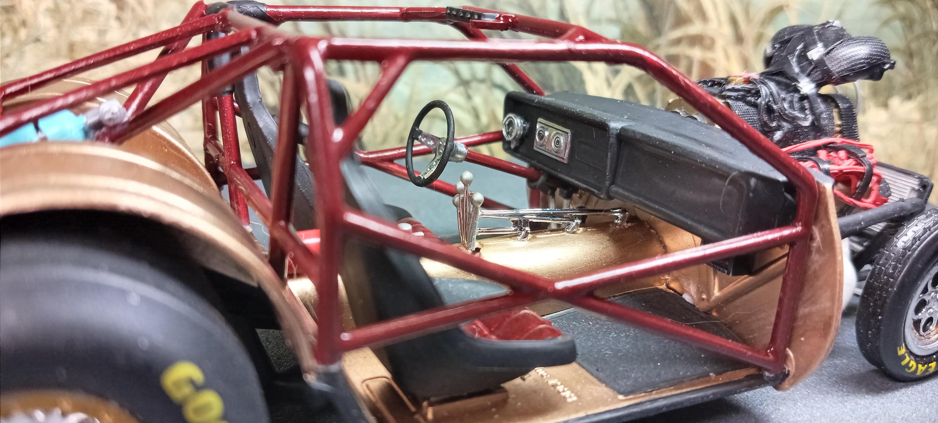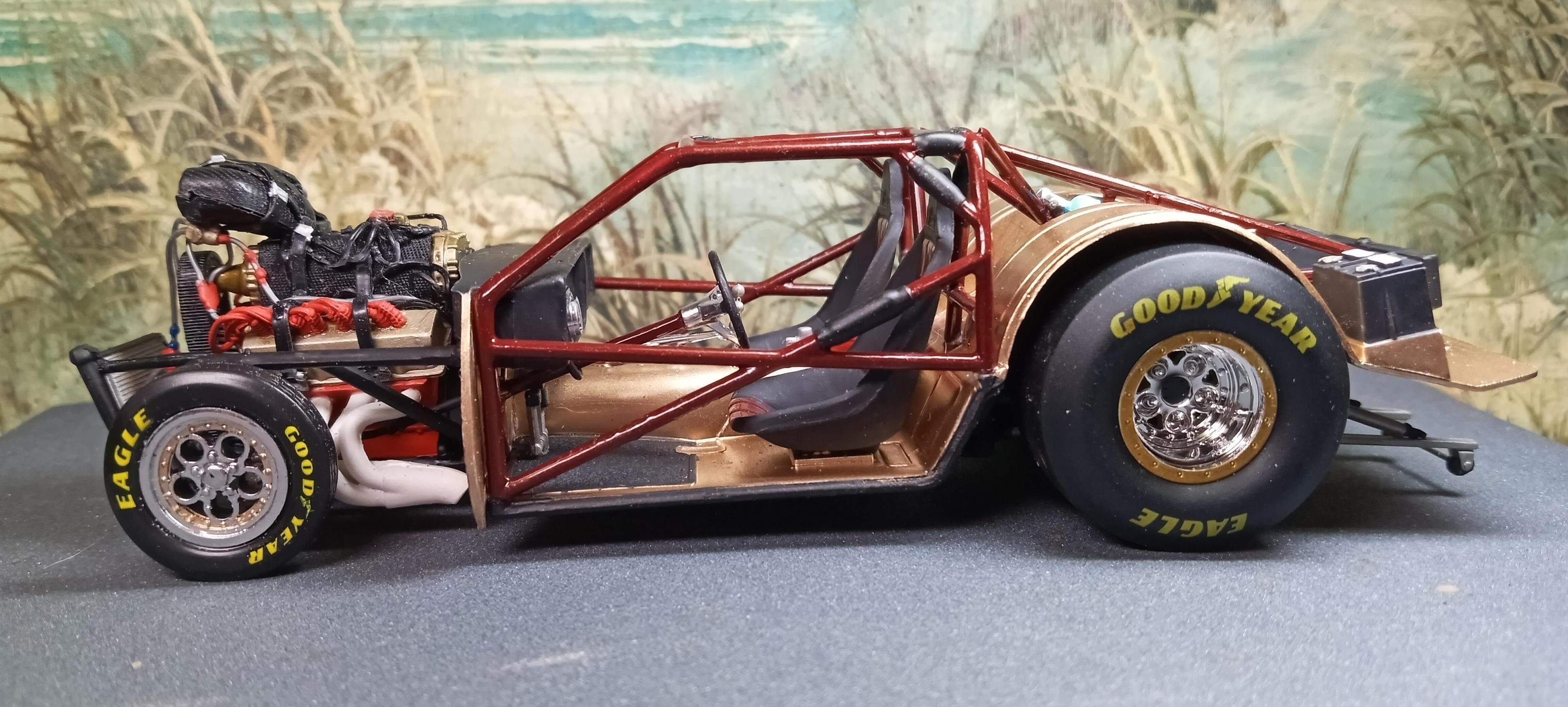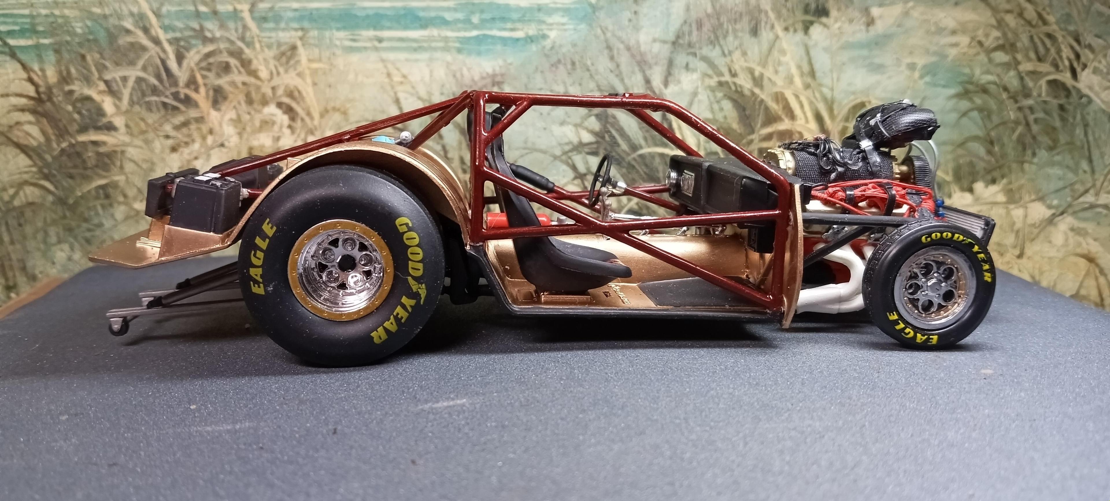 4. Here is my 61 Chevy Impala Pro Mod.I built this for my friend Ron.He picked the color combo.She has that monster Funny Car engine.Big Funny Car Slicks.And Resin rims up front on skinny Goodyear Eagles(decals added to tires)I used Bob Gliddens Pro Stock Thunderbird as my chassis...She is painted"Reving Red Metallic".Testers rattle can.With 2 coats of"Wetlook"clearcoat...Thanks for looking....