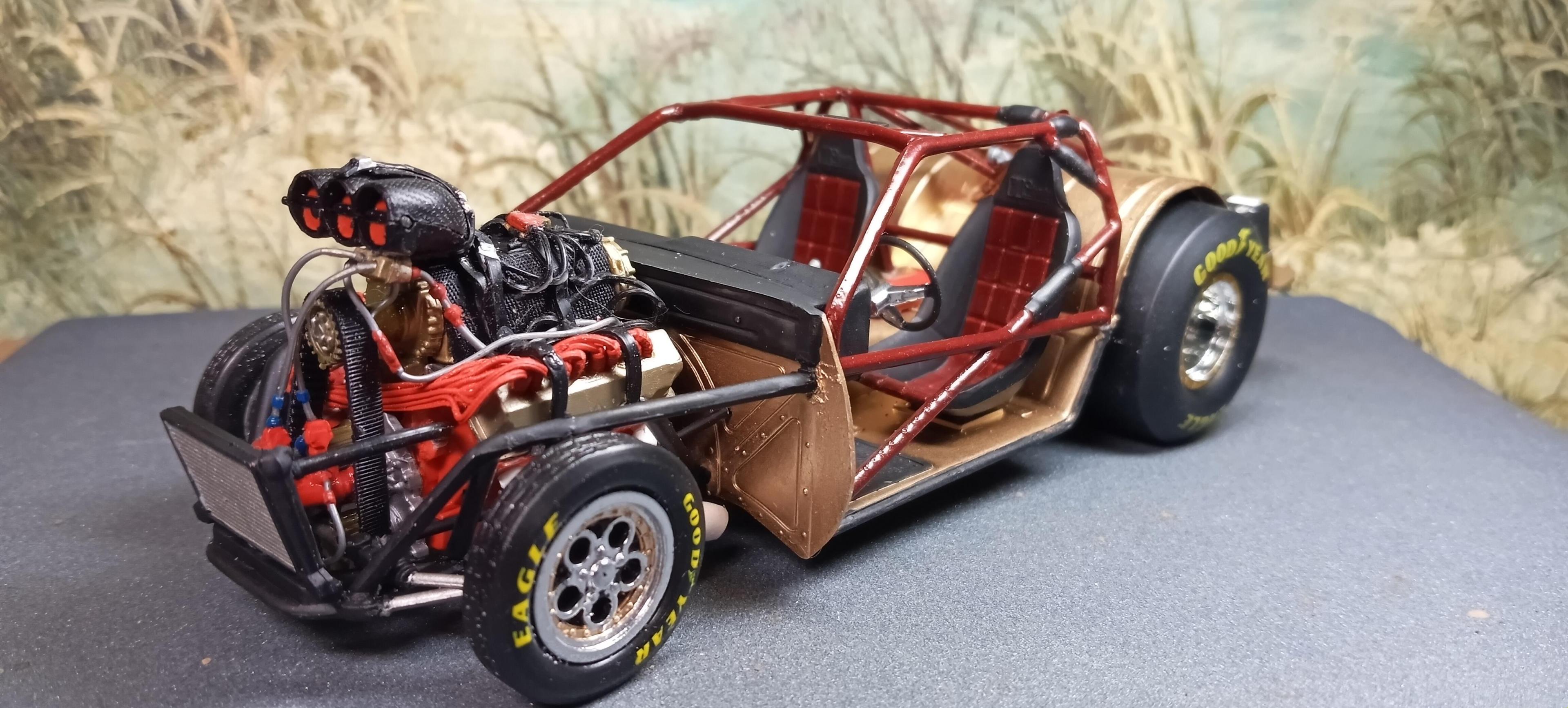 Here is my 70 Superbee.The body is from a Superbee Pro Street kit.The interior is a 69 Charger.With the dash from the 70 Superbee.And the chassis ii from the same 69 Charger.I made the Ralleye Wheels a deeper dish.For the fat Goodyear Eagles on the rear.There are two 780cfm Holleys(Resin)on a high rise intake.Molding is Chrome foiled.And she is painted"Graphite Gray Metallic"rattle can.With 2 coats of"Wetlook"clear coat.Thanks for looking.