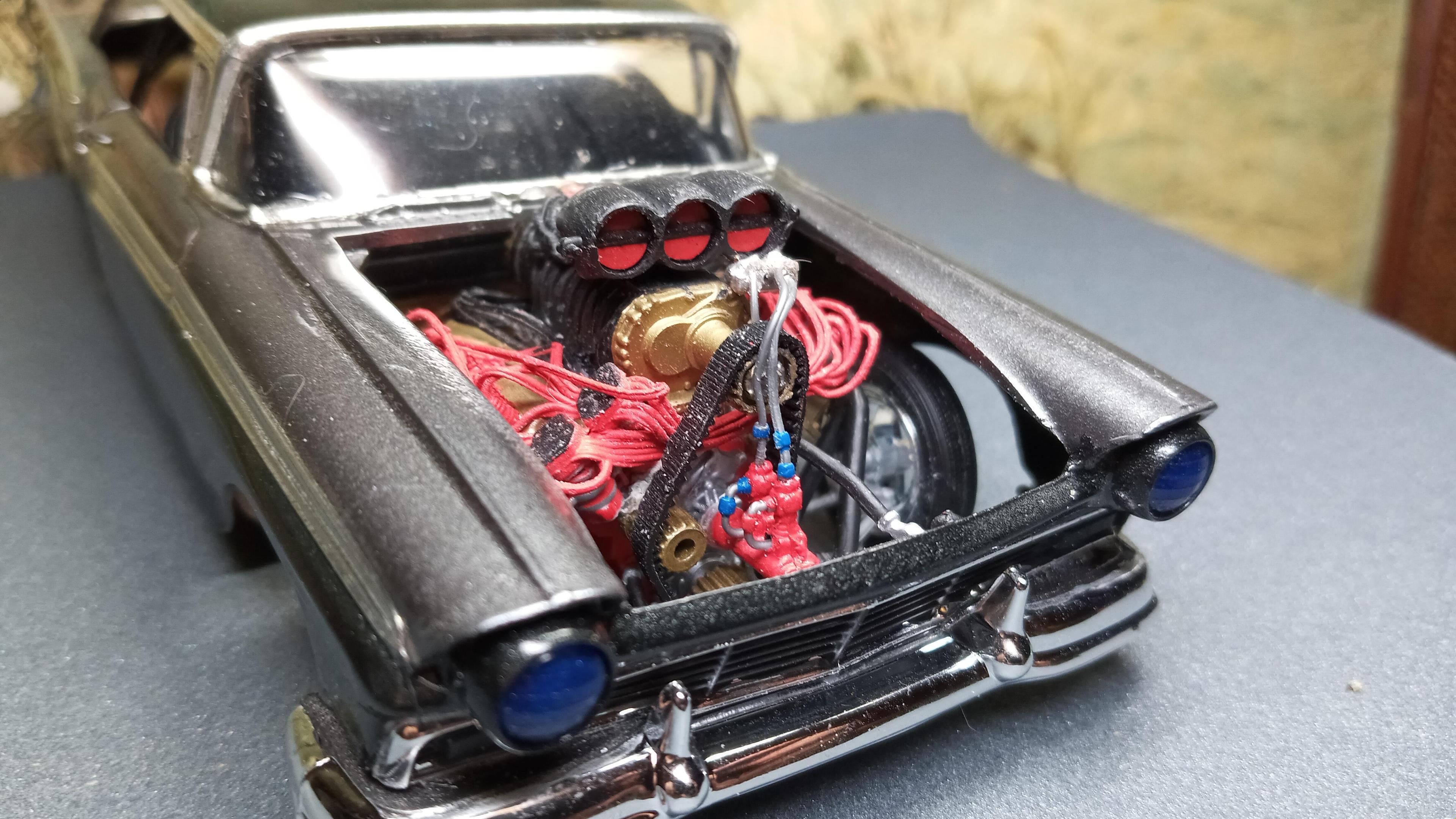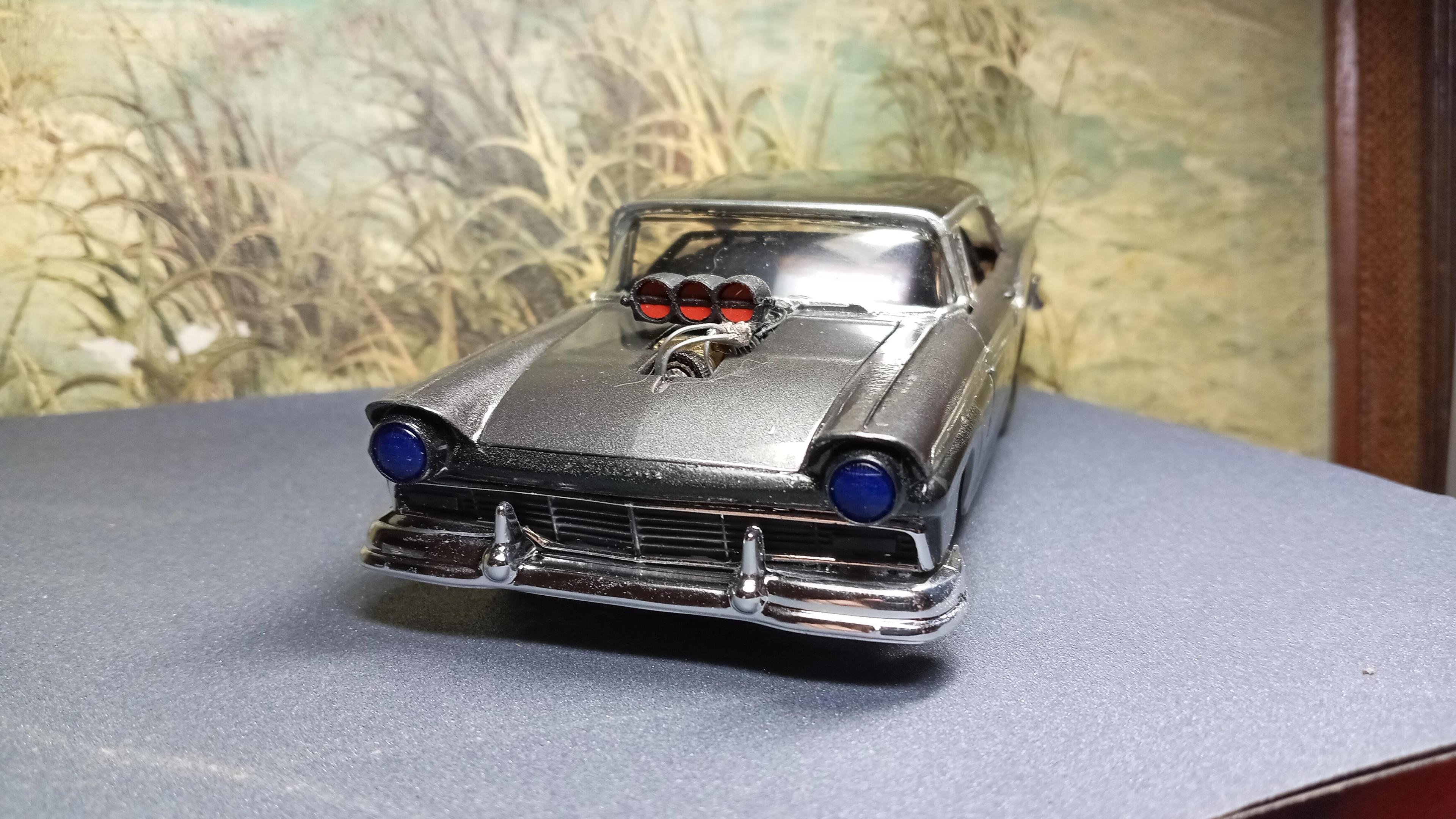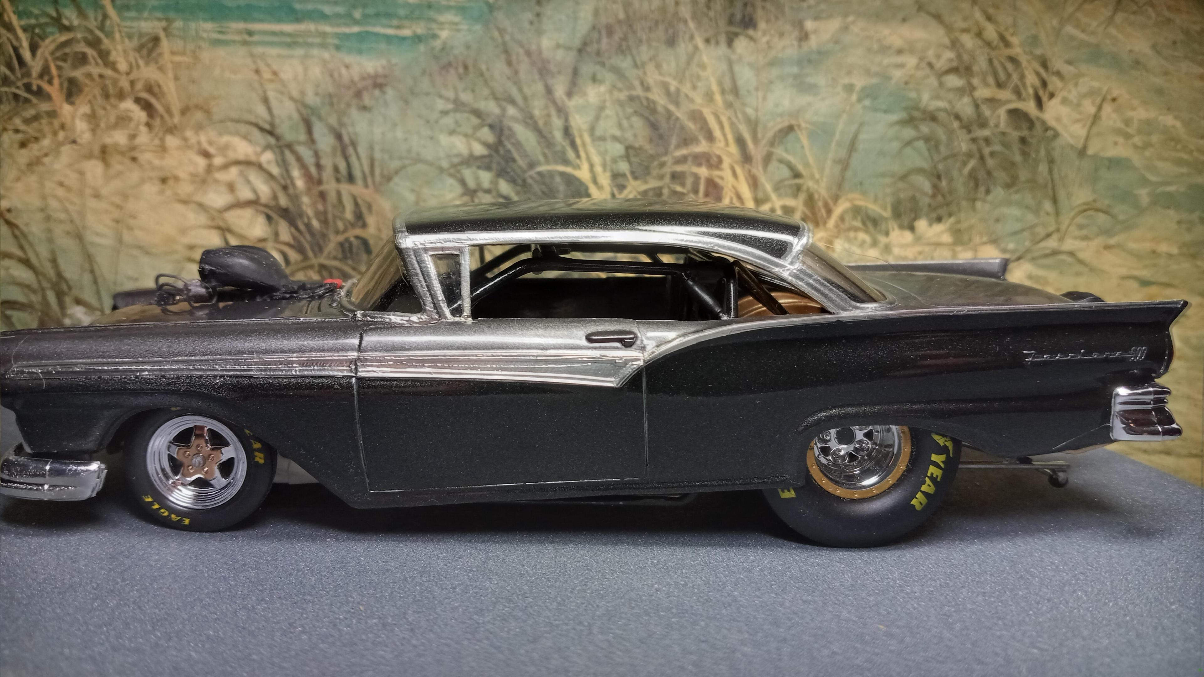 7. Here is a 57 Ford Pro Mod.That I built for my friend Ron...He came up with the color combo.And I chrome foiled all molding..She is another kit bash.Using a Diecast Funny car.And a Pro Stock kit as my chassis.The monster engine Is actually the top half of Funny engine.Put on the plastic block and transmission.So it would fit under the hood...