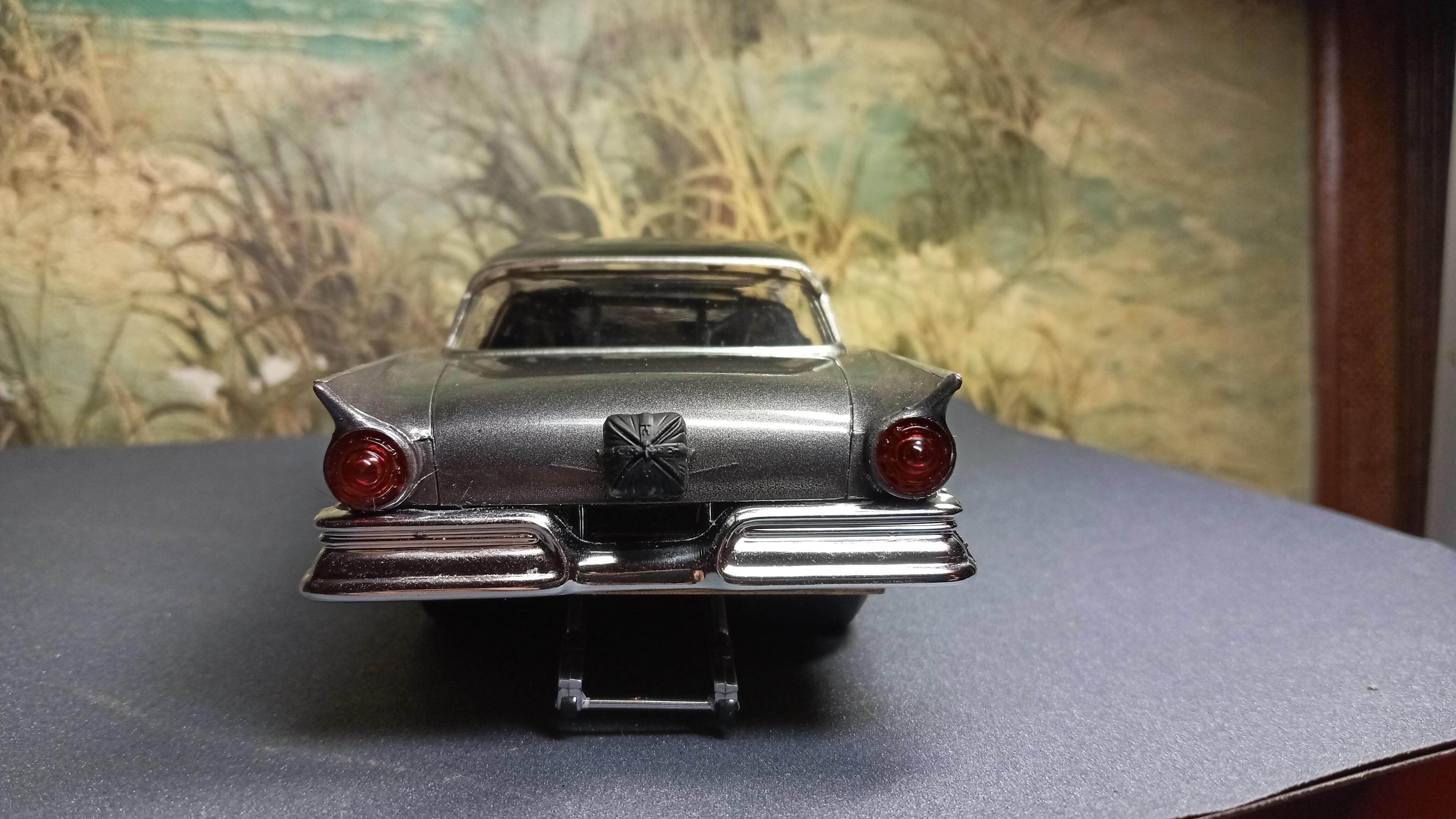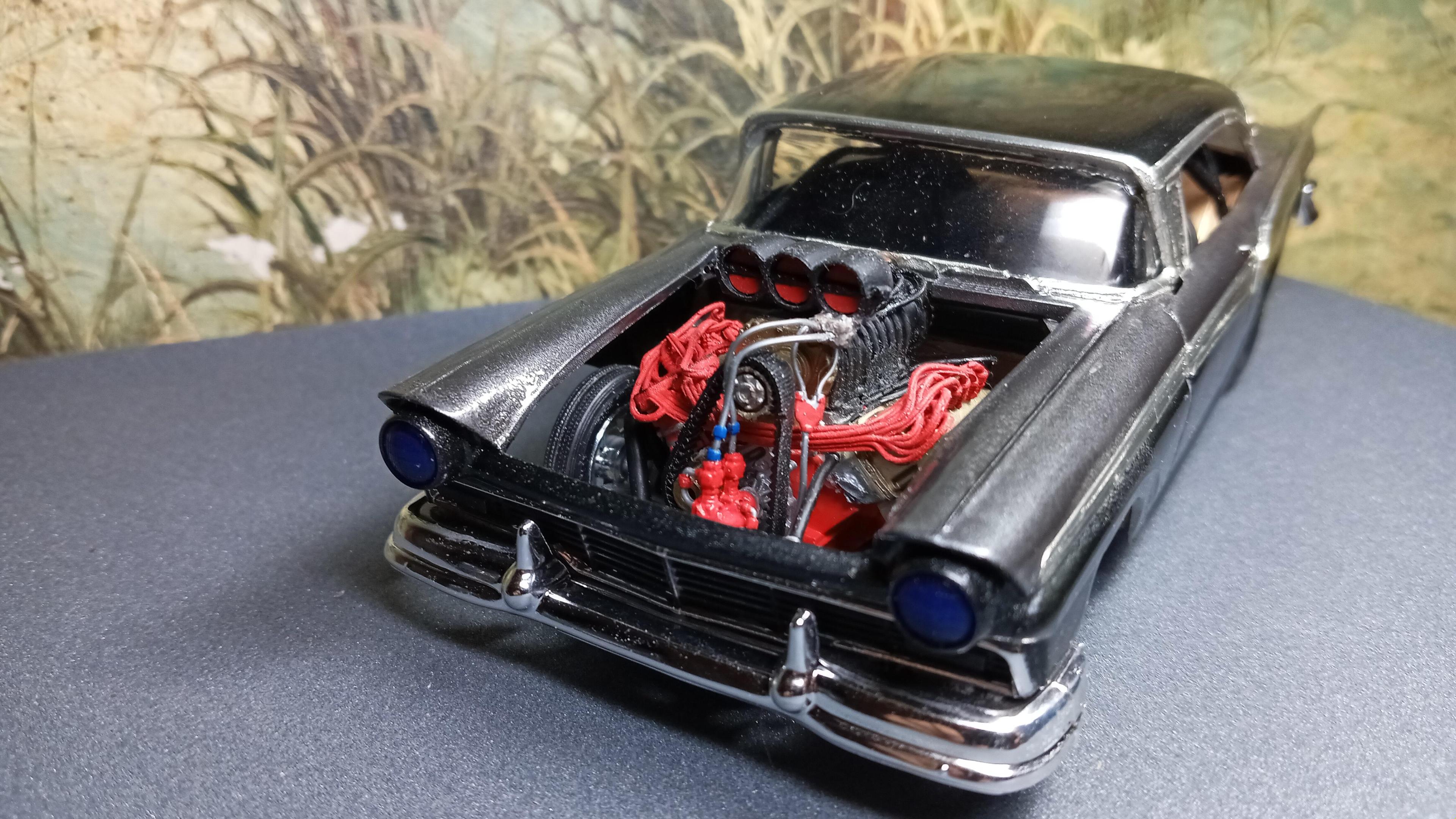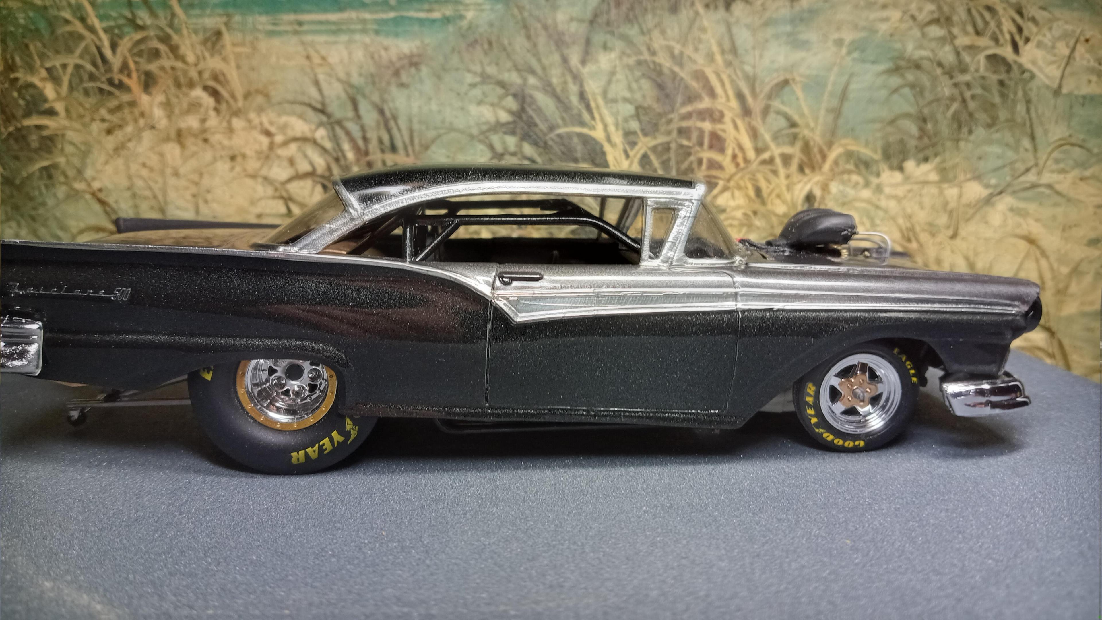 7. Here is a 57 Ford Pro Mod.That I built for my friend Ron...He came up with the color combo.And I chrome foiled all molding..She is another kit bash.Using a Diecast Funny car.And a Pro Stock kit as my chassis.The monster engine Is actually the top half of Funny engine.Put on the plastic block and transmission.So it would fit under the hood...