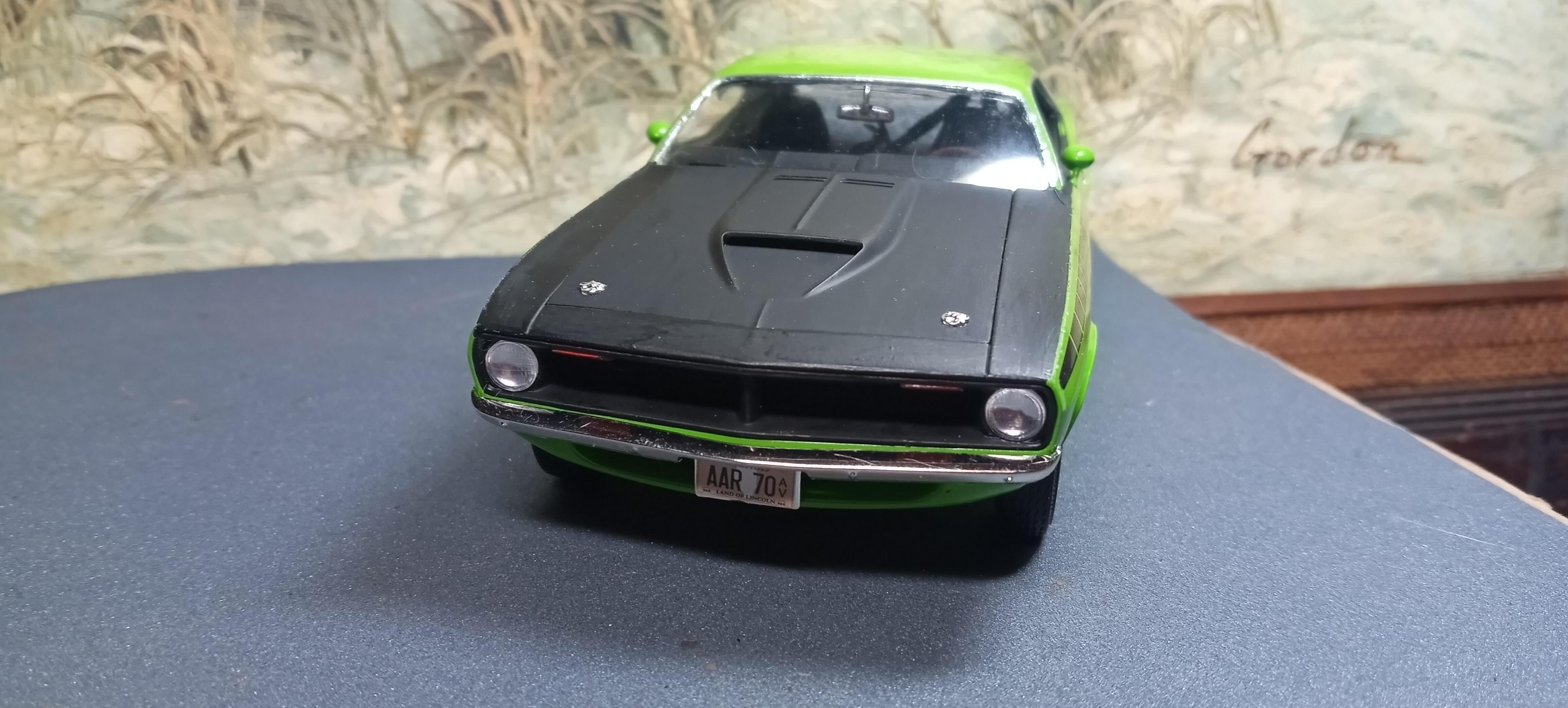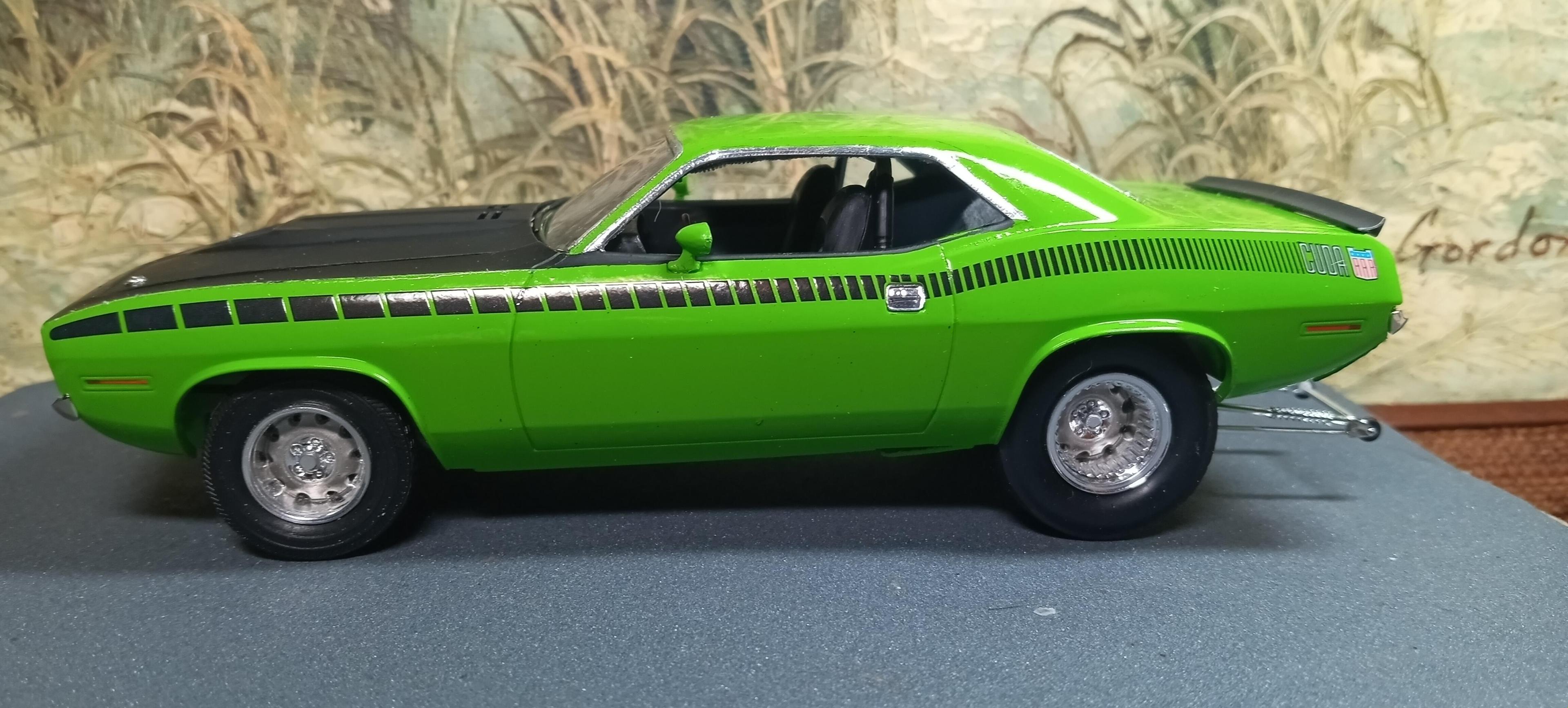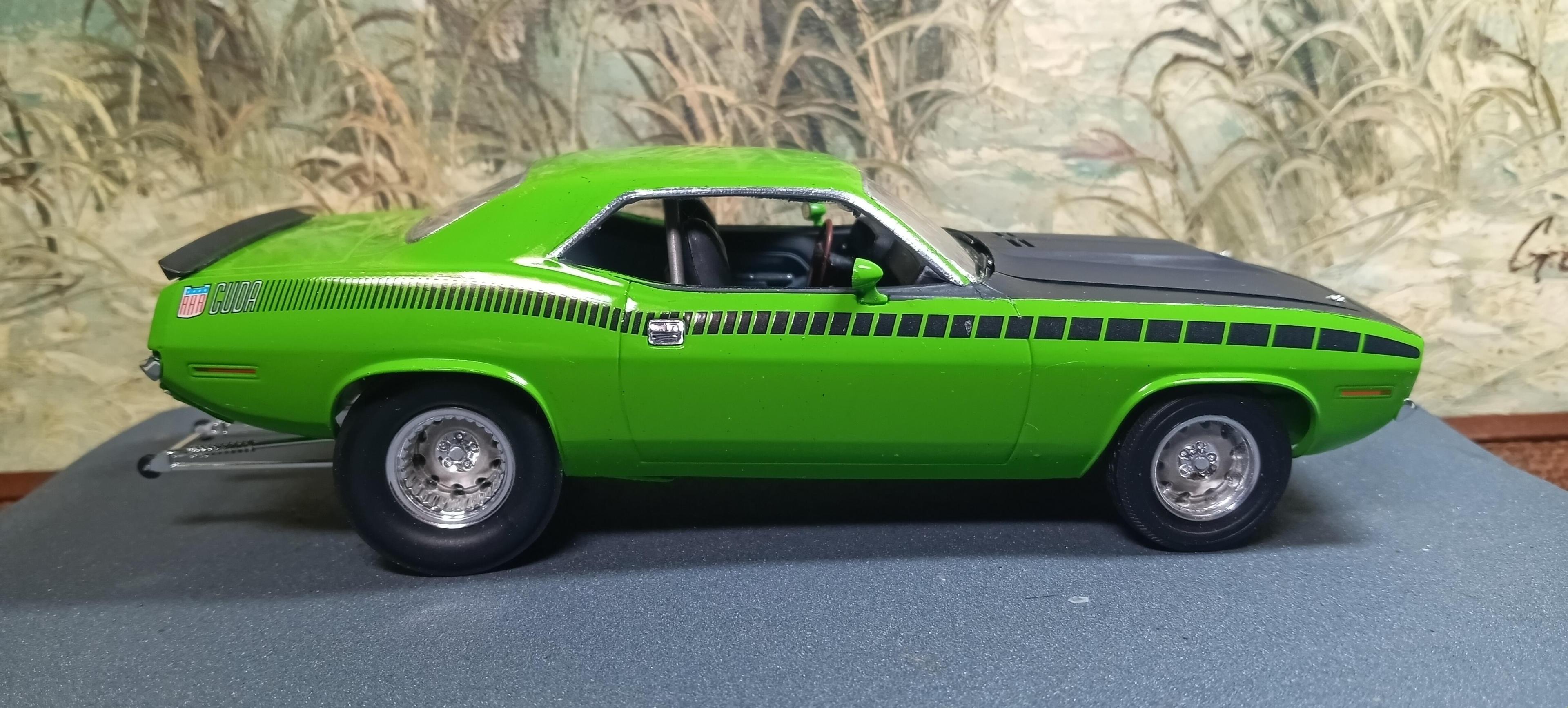 Here is my Sublime AAR Cuda with a surprise under the hood.I painted her with Model Master factory Plymouth Sublime green.The Hemi came from A 70 Cuda Revell kit.I tubbed her to get those fat tires under her.And custom made the Ralleye rims.All the way around..Yea,I know...The Pistol grip shifter is backwards...Its been corrected.