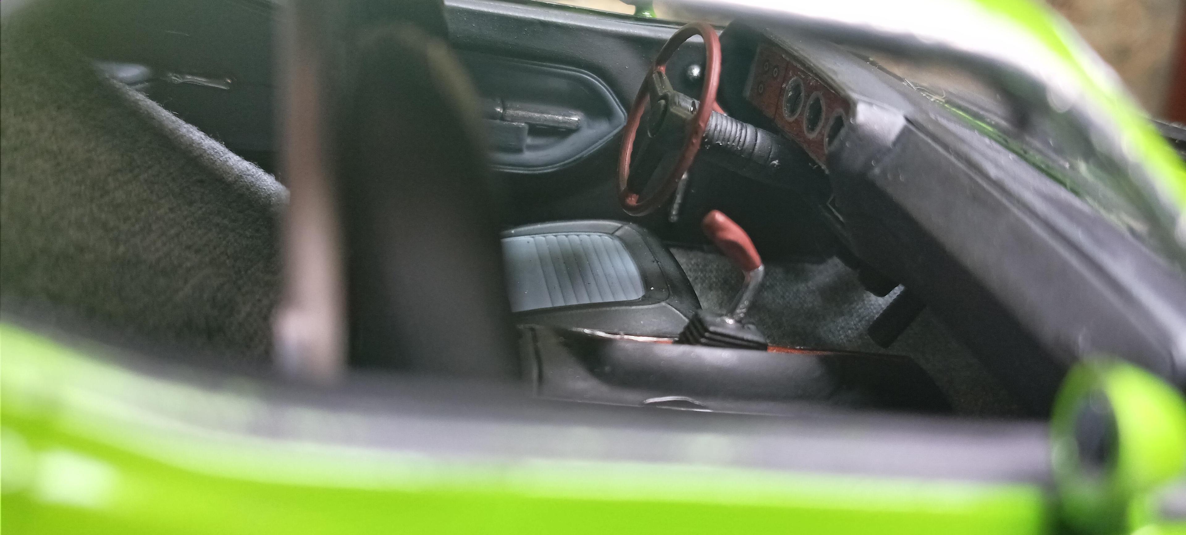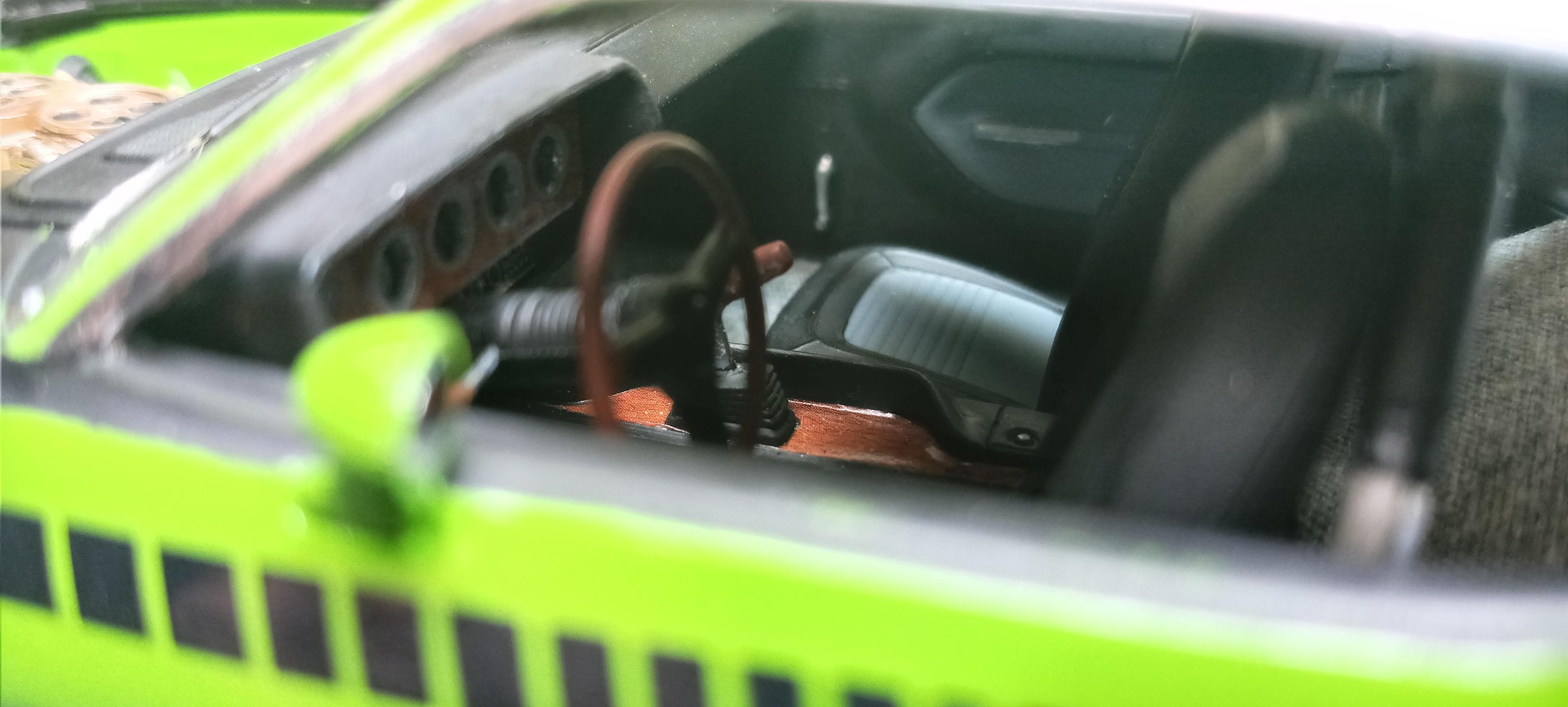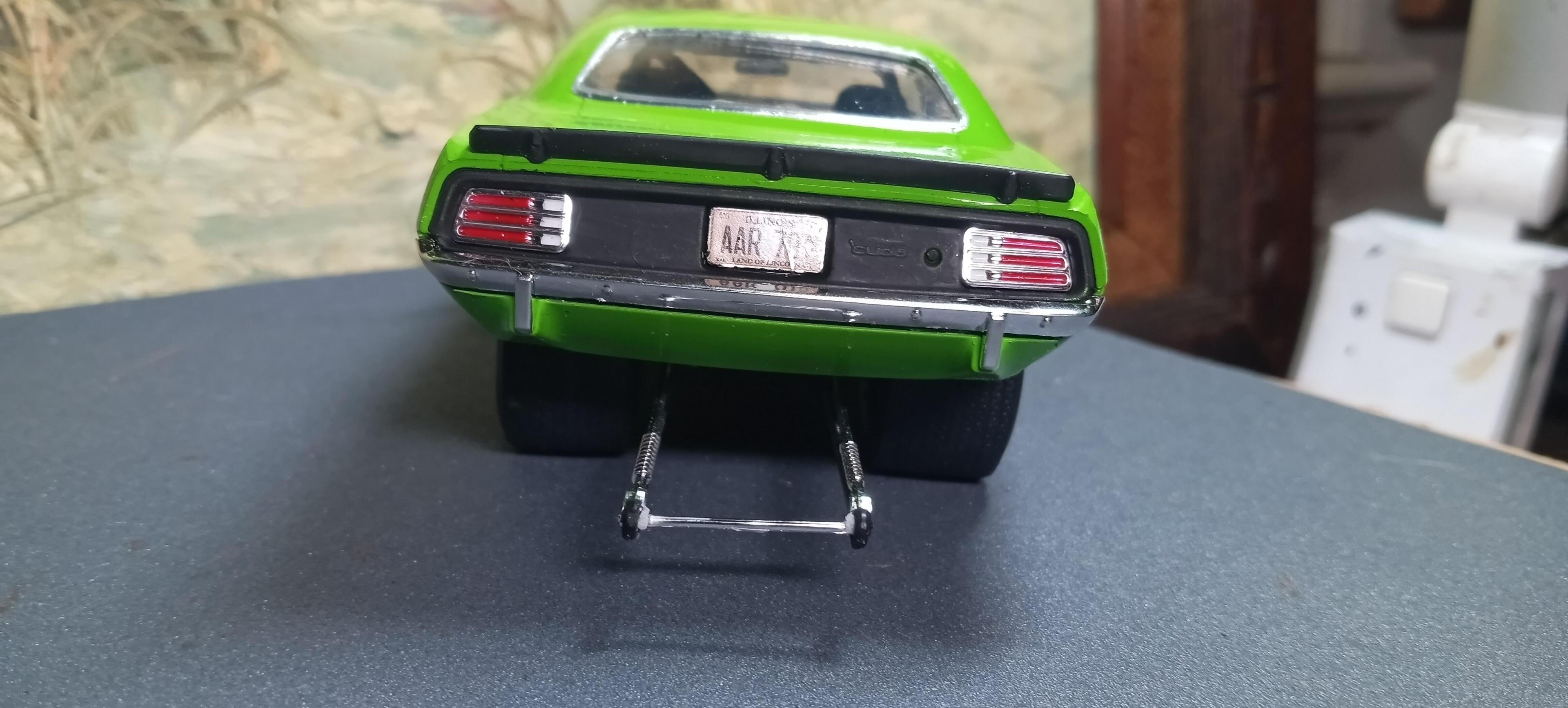 Here is my Sublime AAR Cuda with a surprise under the hood.I painted her with Model Master factory Plymouth Sublime green.The Hemi came from A 70 Cuda Revell kit.I tubbed her to get those fat tires under her.And custom made the Ralleye rims.All the way around..Yea,I know...The Pistol grip shifter is backwards...Its been corrected.