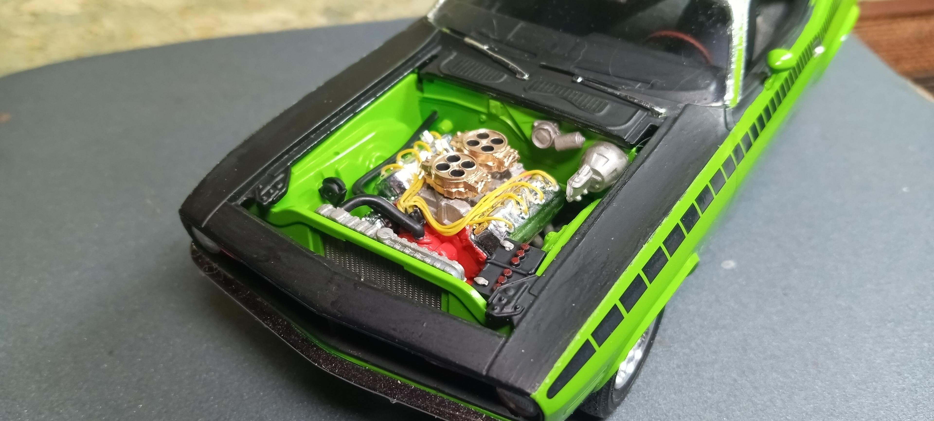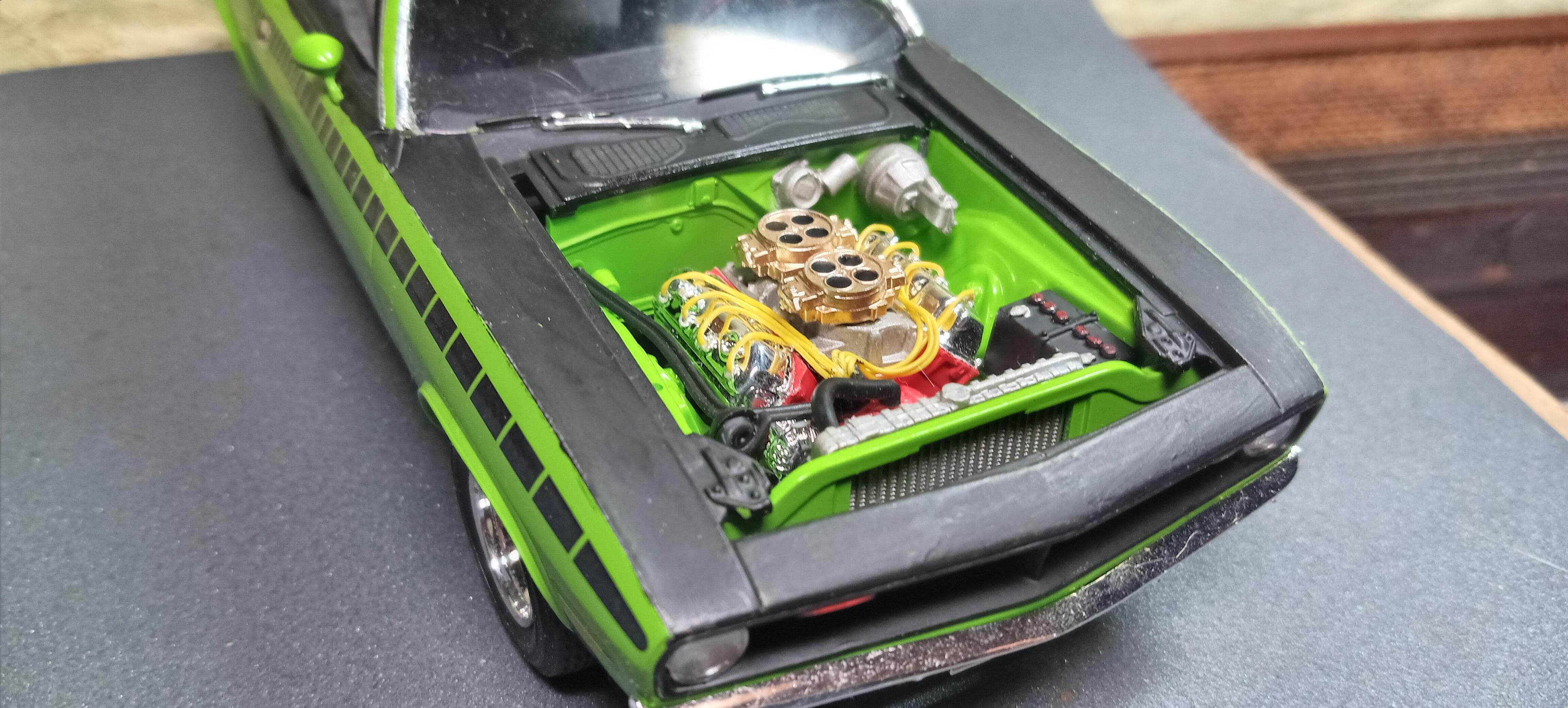 This 70 Cuda 6 - barrel was a fun build...The 440 6-barrel is out of the Ertyl 69 Roadrunner kit.I added the Cragar S/S rims.And fat Goodyears on the rear...Thanks for looking...