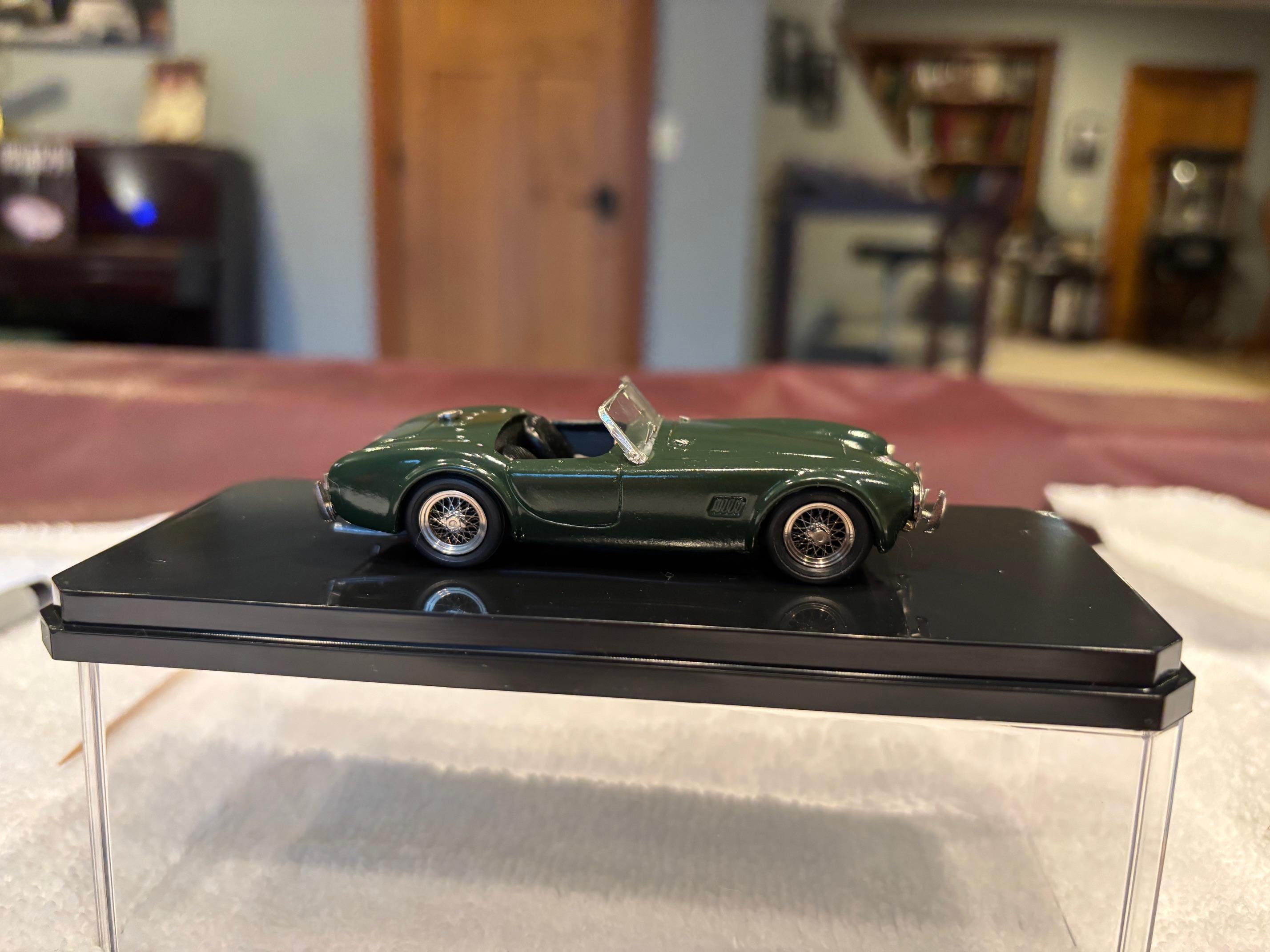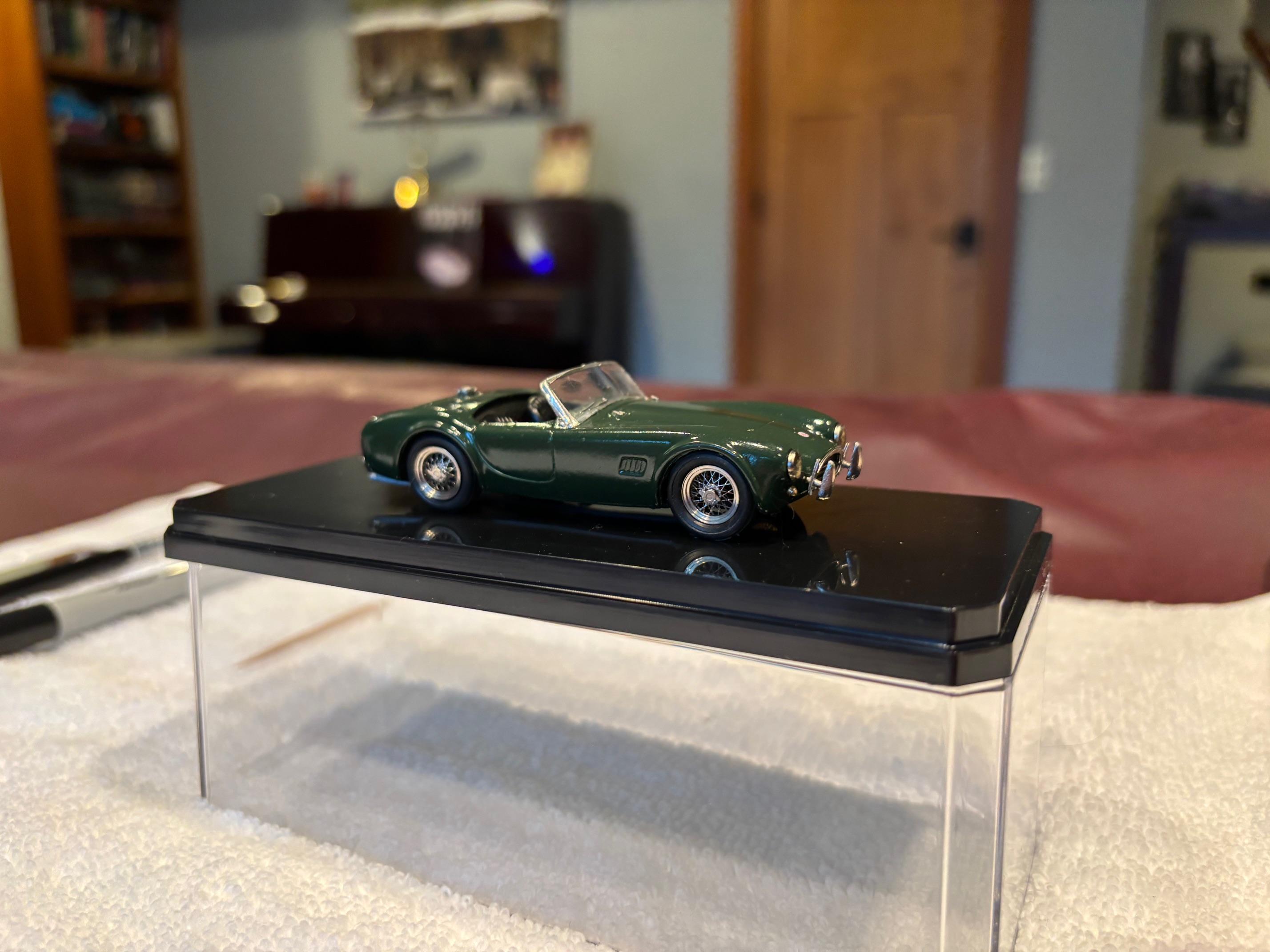I just finished this up yesterday morning. This is a Marsh Models 289 Cobra 1/43 scale. Very nice kit but did use some parts from the Monogram 1/43 Cobra kit like the windshield. The wheels are beautiful and overall just a great resin kit. I used Tamiya British green for paint. I love building 1/43rds from time to time but at 68 not sure how much longer I can deal with tiny parts like hood hinges on this kit. Thanks for looking and comments .