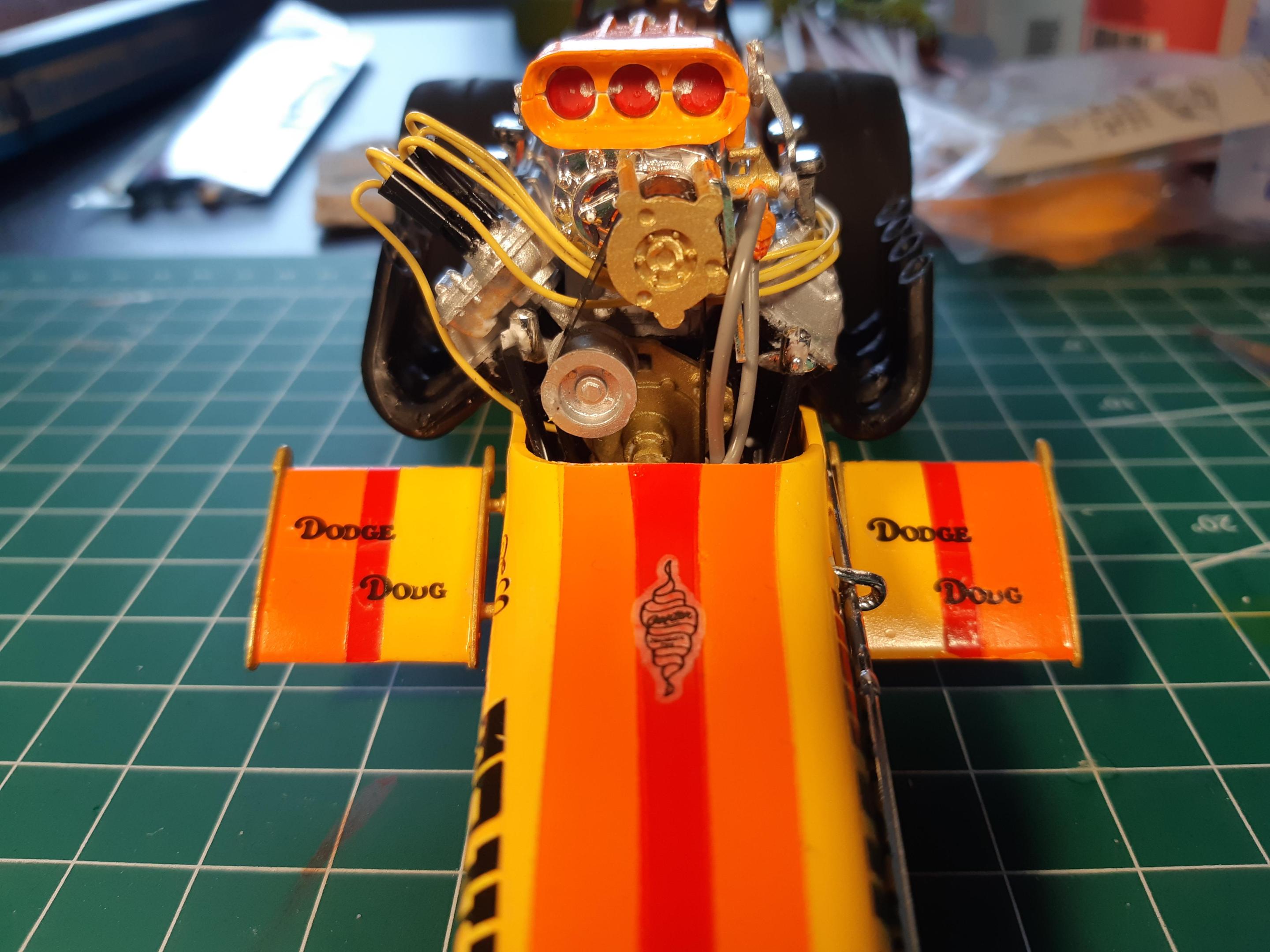 1. Model no. 2, The Dodge Doug (1:16), after my initial Jungle Jim gluebomb. Pretty sure I upped my game with this one. Some goofy setbacks, like spraying my seat with white primer when it was supposed to be clearcoat. In that last picture, the only way I could put a straight decal onto a curved surface was by cutting out each letter individually. This beginner was also kinda proud in being able to glue the pesky brake housings together without sticking to the brake drum, so that the wheels could still roll freely. (That's lighting glare, btw, on that goofy left wingtop)