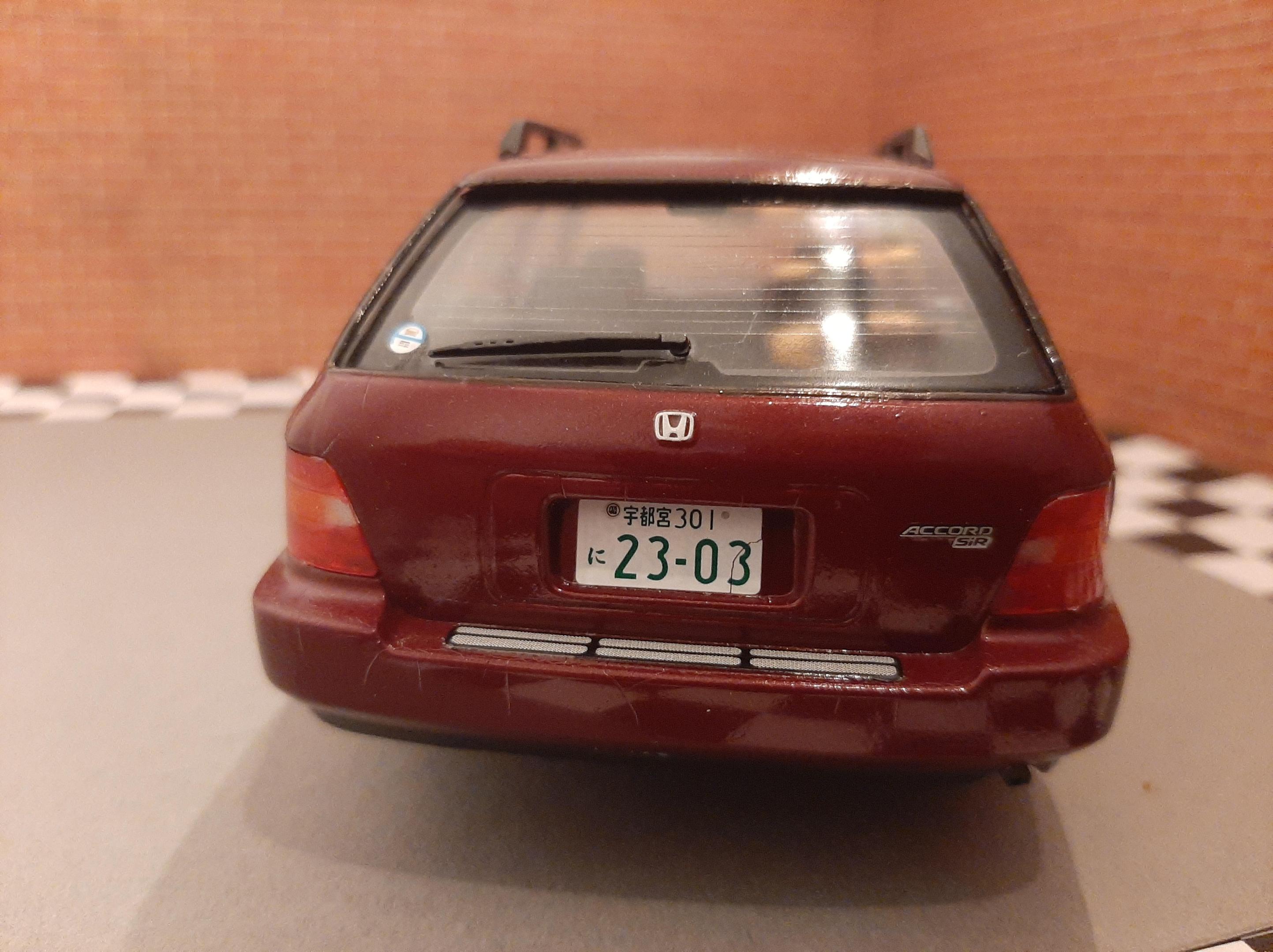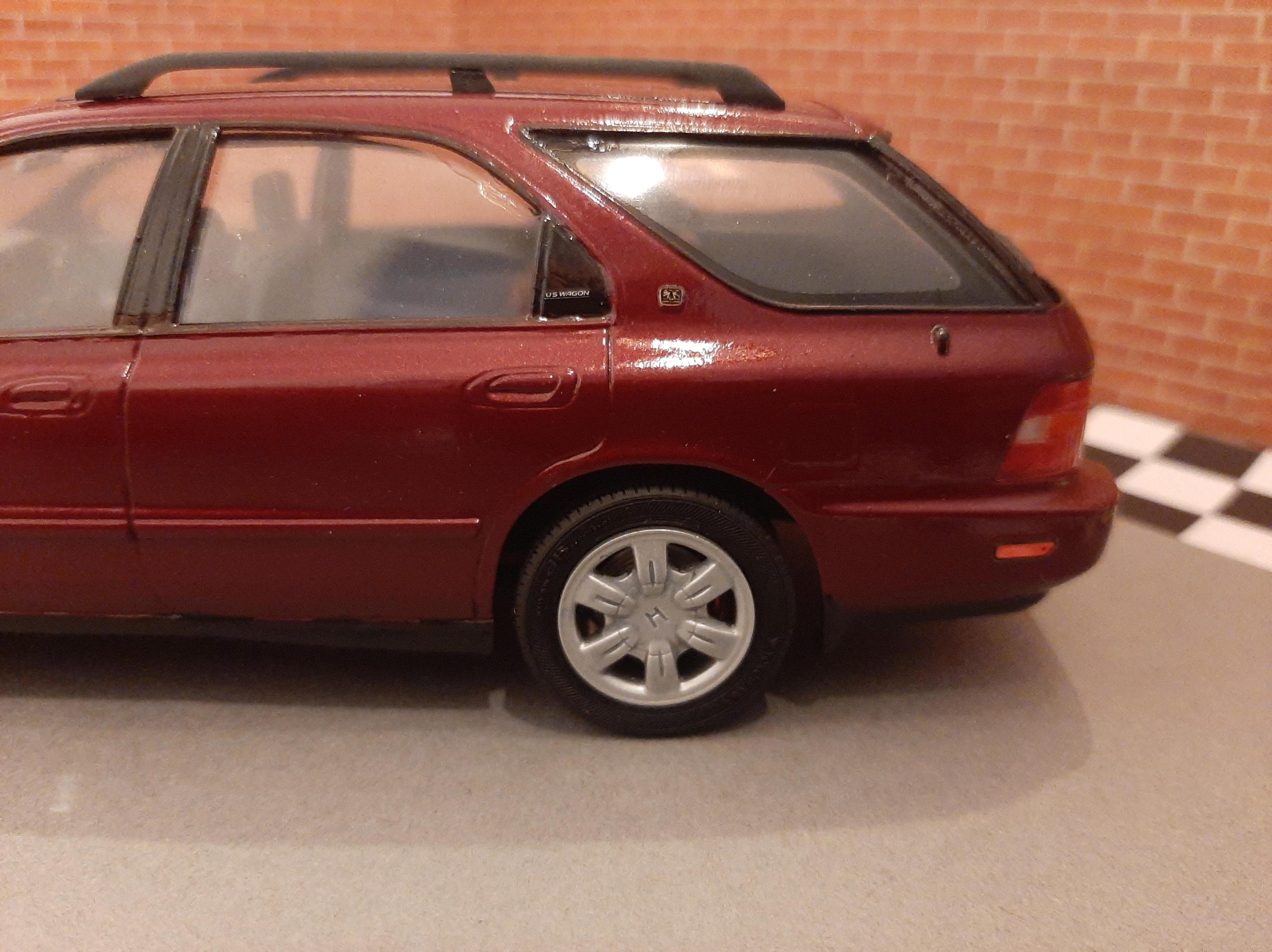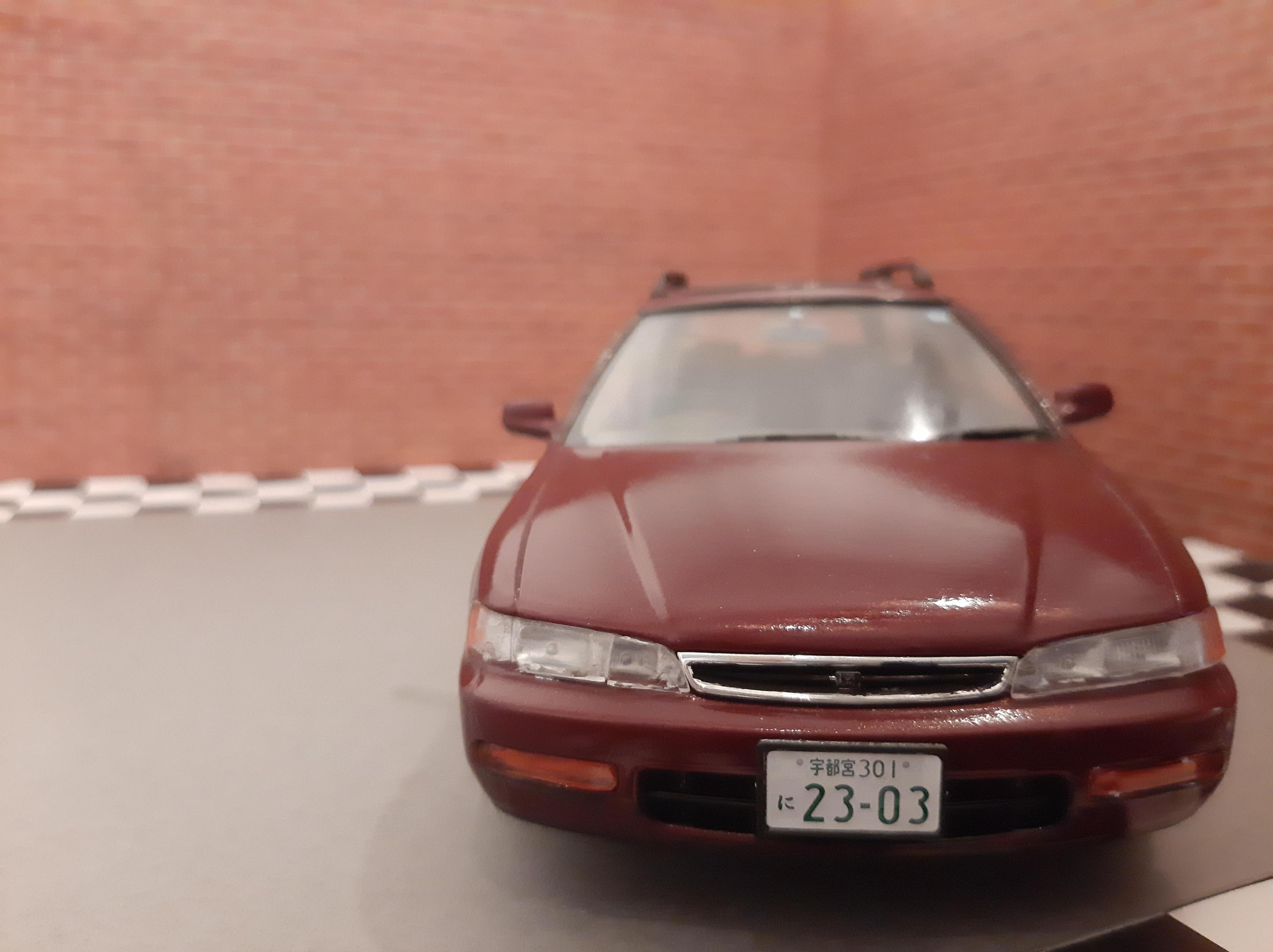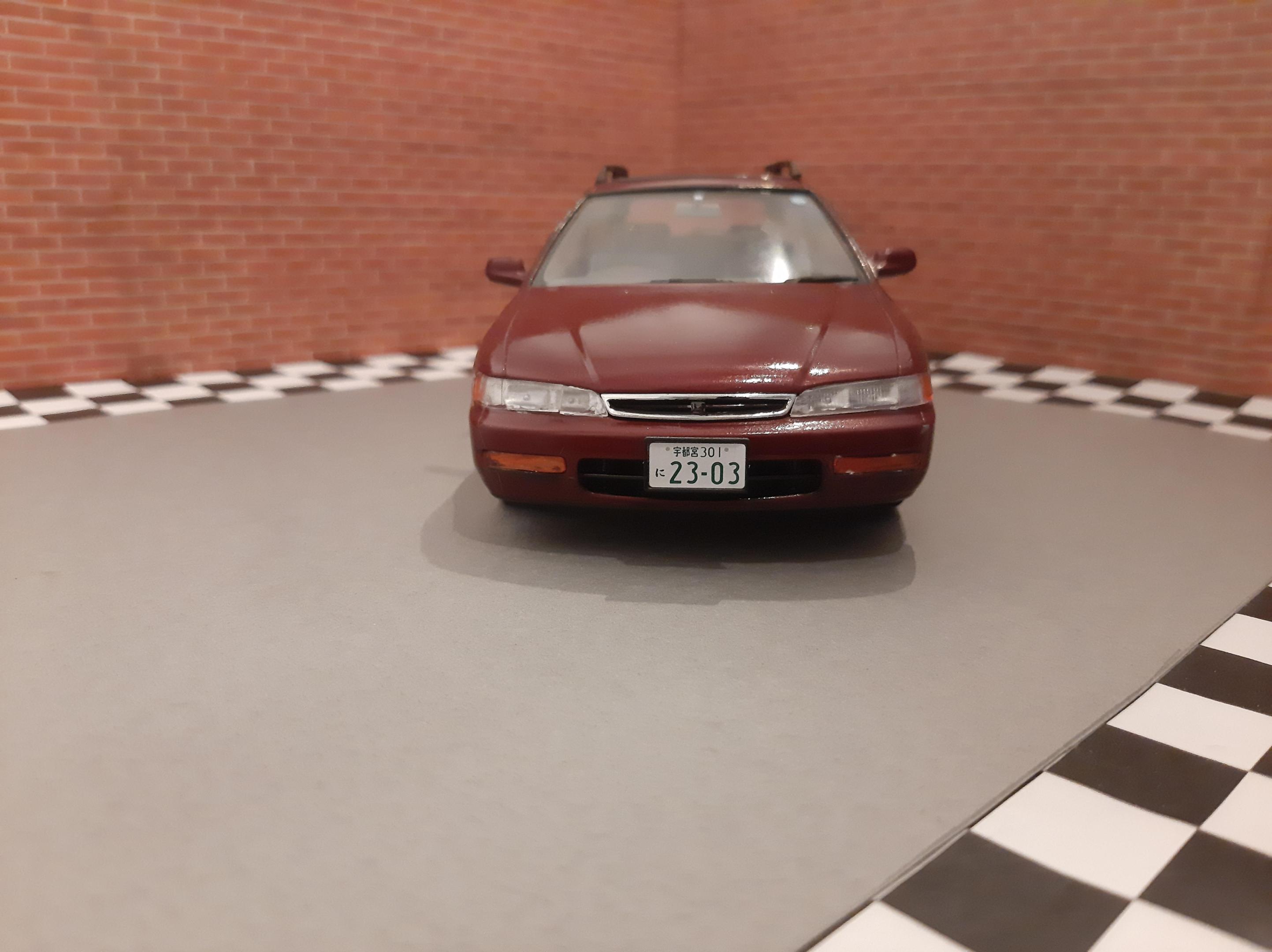 I bought this kit to build a tribute to my beloved 1:1 1997 Honda Accord I owned. Mine was green and it was a sedan. I sadly could not get the shade of Green in Duplicolor so I settled for this Honda Bordeaux Red. I also could not find a USDM sedan kit so I settled for the Wagon, I do love wagons. I tried to build this car as stock and american looking as I could without needing to do a left hand drive conversion. I also built it up to be a 1997. This kit was a challenge for me because I can barely follow English instructions let alone Japanese instructions. I also found that the plastics were very brittle and my Round 2 Revell fingers really had to tone it down as this kit would not forgive my building ways. This was also one of my Duplicolor ventures that went south. I think I messed up the primer so the Duplicolor crazed the kit on the rear bumper and over all the fenders. Next time I need to either seal the primer or use Duplicolor primer. The kit also came cracked out of the box on one of the fenders and the glass cracked on installation. Overall the car looks alright, I went to town polishing out the orange peel and crazing. I look forward to my Tamiya Nissans I have lined up to build.