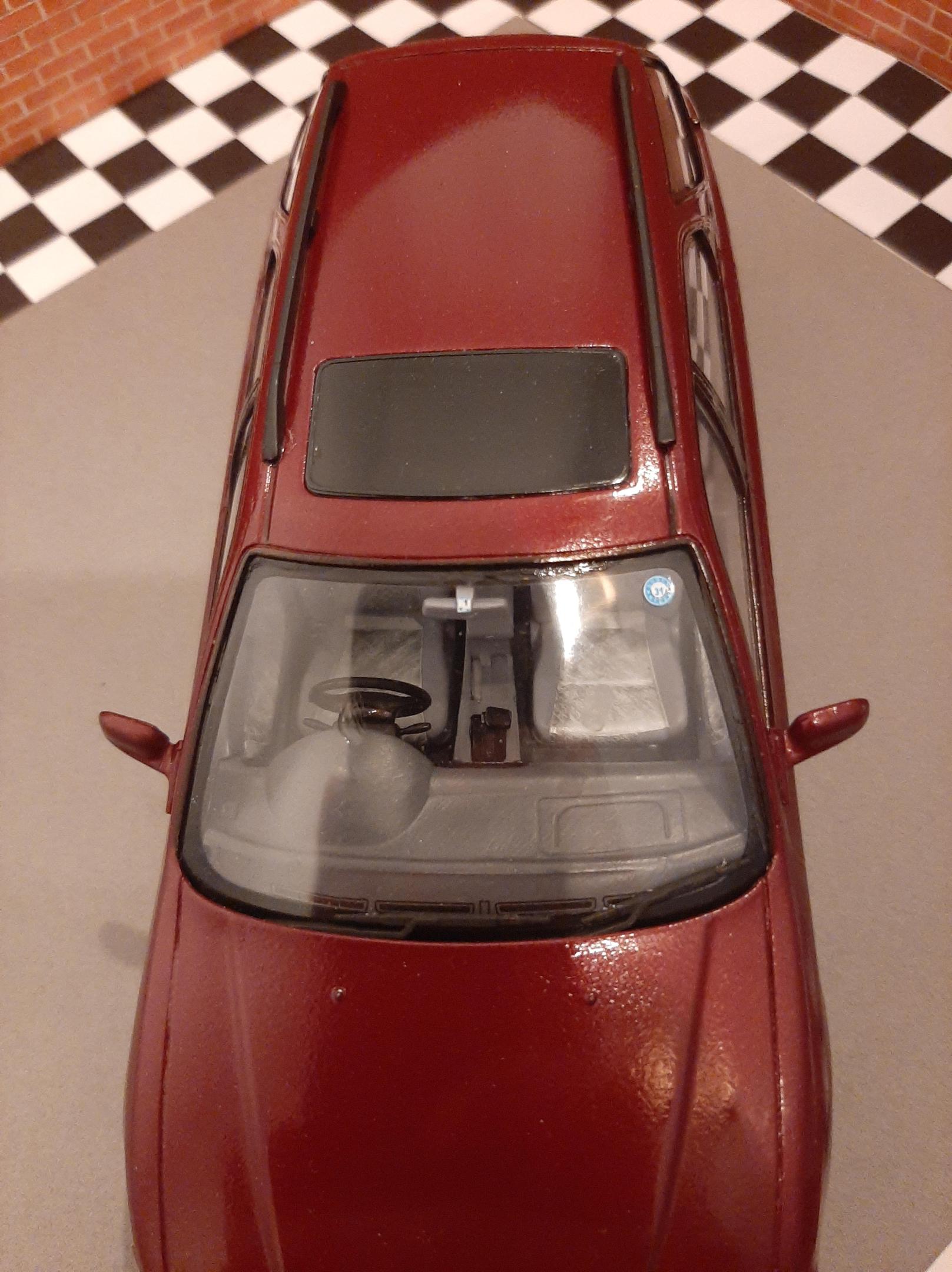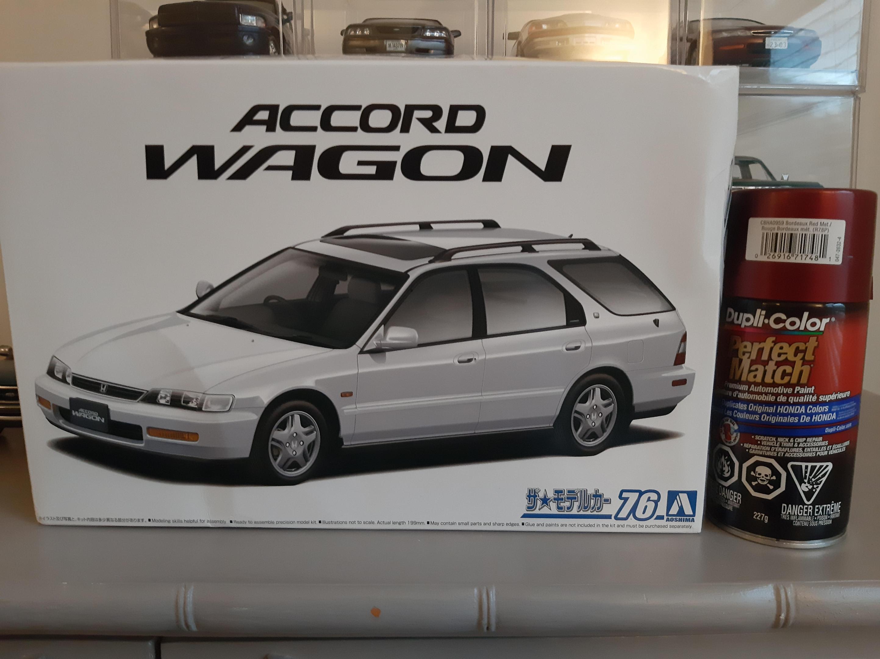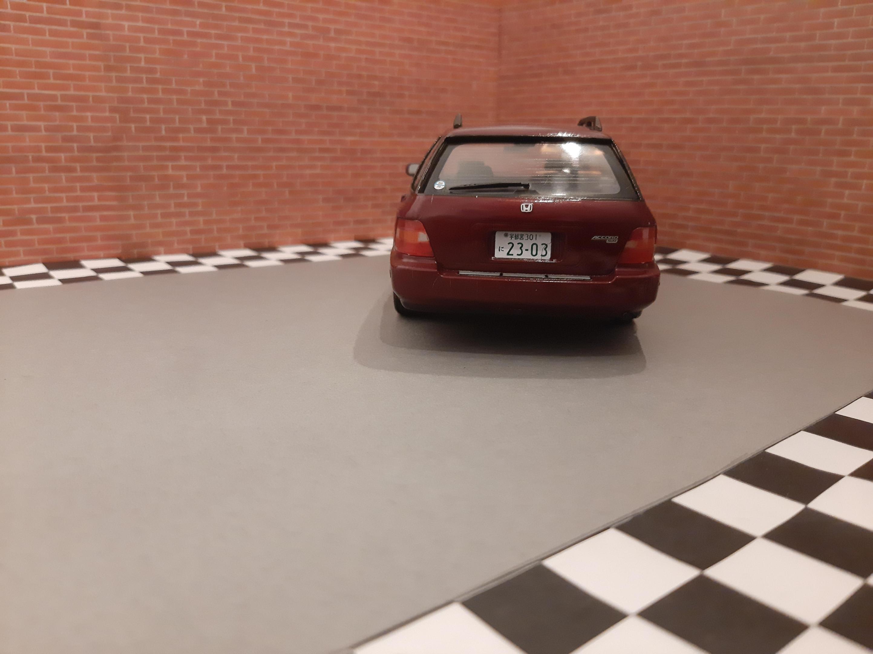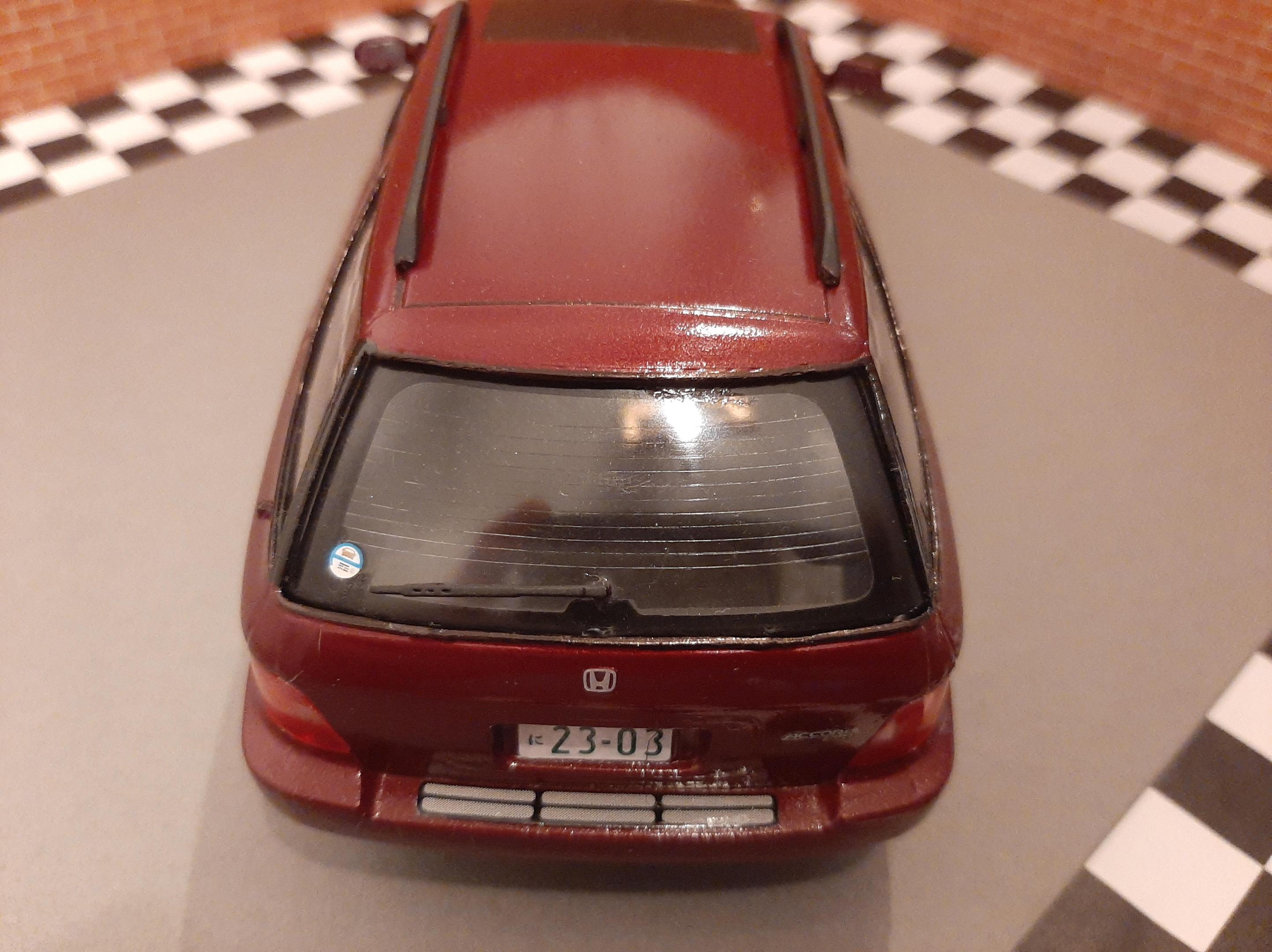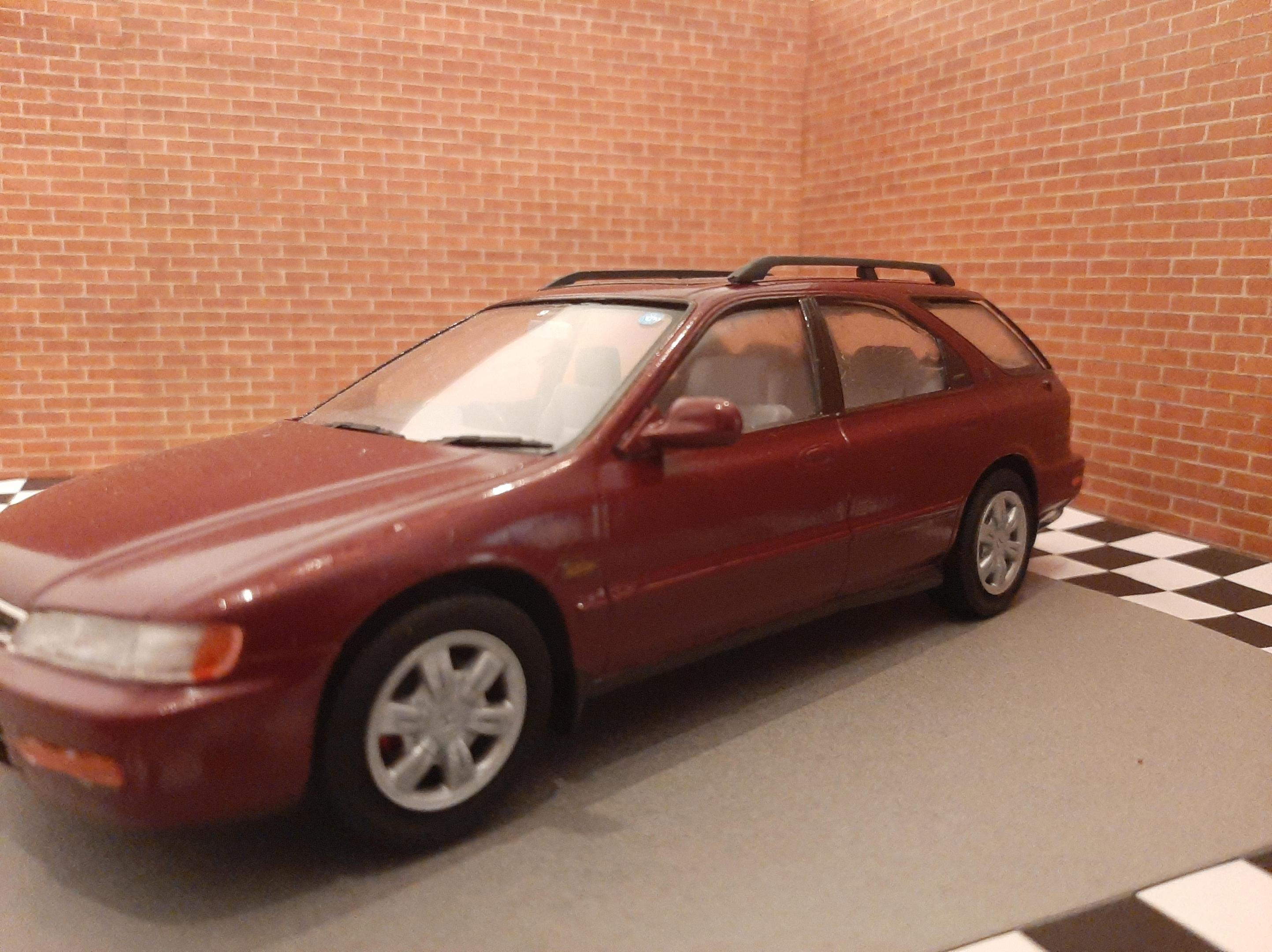 I bought this kit to build a tribute to my beloved 1:1 1997 Honda Accord I owned. Mine was green and it was a sedan. I sadly could not get the shade of Green in Duplicolor so I settled for this Honda Bordeaux Red. I also could not find a USDM sedan kit so I settled for the Wagon, I do love wagons. I tried to build this car as stock and american looking as I could without needing to do a left hand drive conversion. I also built it up to be a 1997. This kit was a challenge for me because I can barely follow English instructions let alone Japanese instructions. I also found that the plastics were very brittle and my Round 2 Revell fingers really had to tone it down as this kit would not forgive my building ways. This was also one of my Duplicolor ventures that went south. I think I messed up the primer so the Duplicolor crazed the kit on the rear bumper and over all the fenders. Next time I need to either seal the primer or use Duplicolor primer. The kit also came cracked out of the box on one of the fenders and the glass cracked on installation. Overall the car looks alright, I went to town polishing out the orange peel and crazing. I look forward to my Tamiya Nissans I have lined up to build.