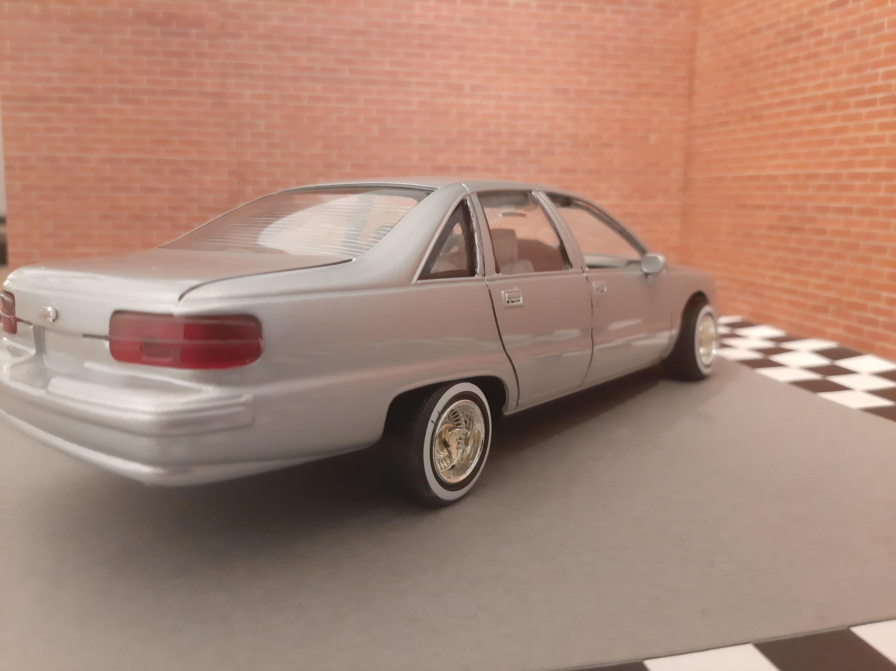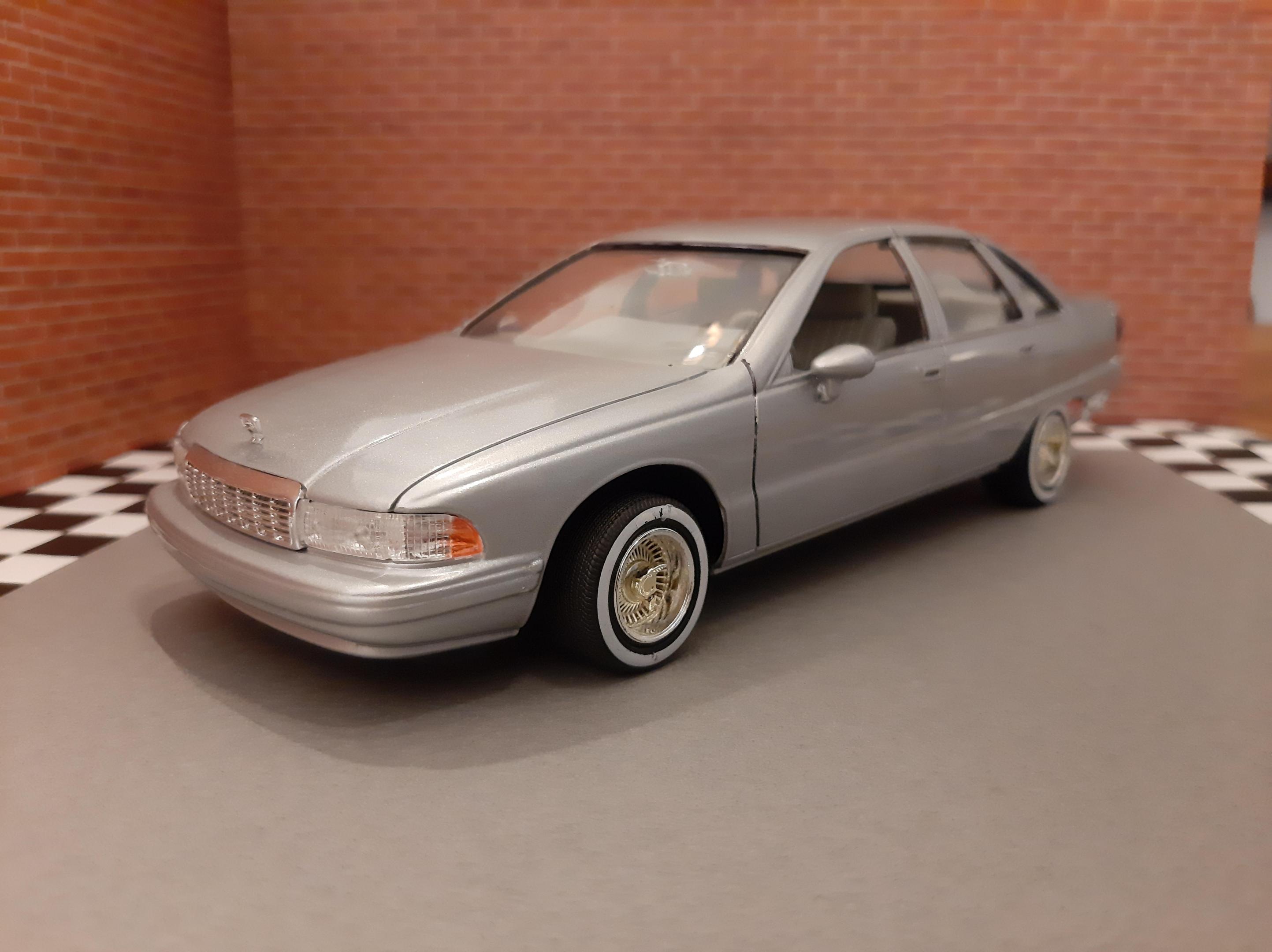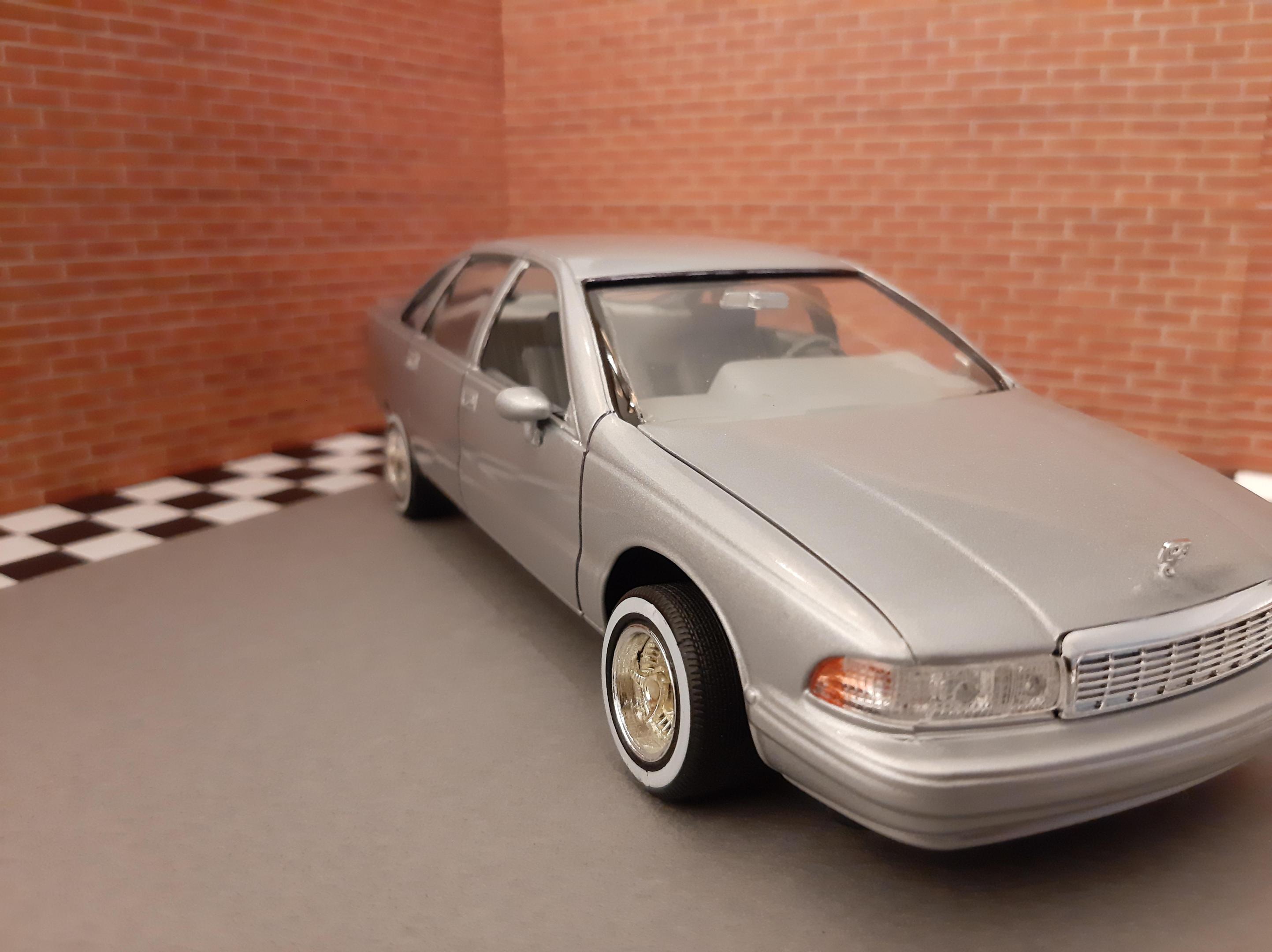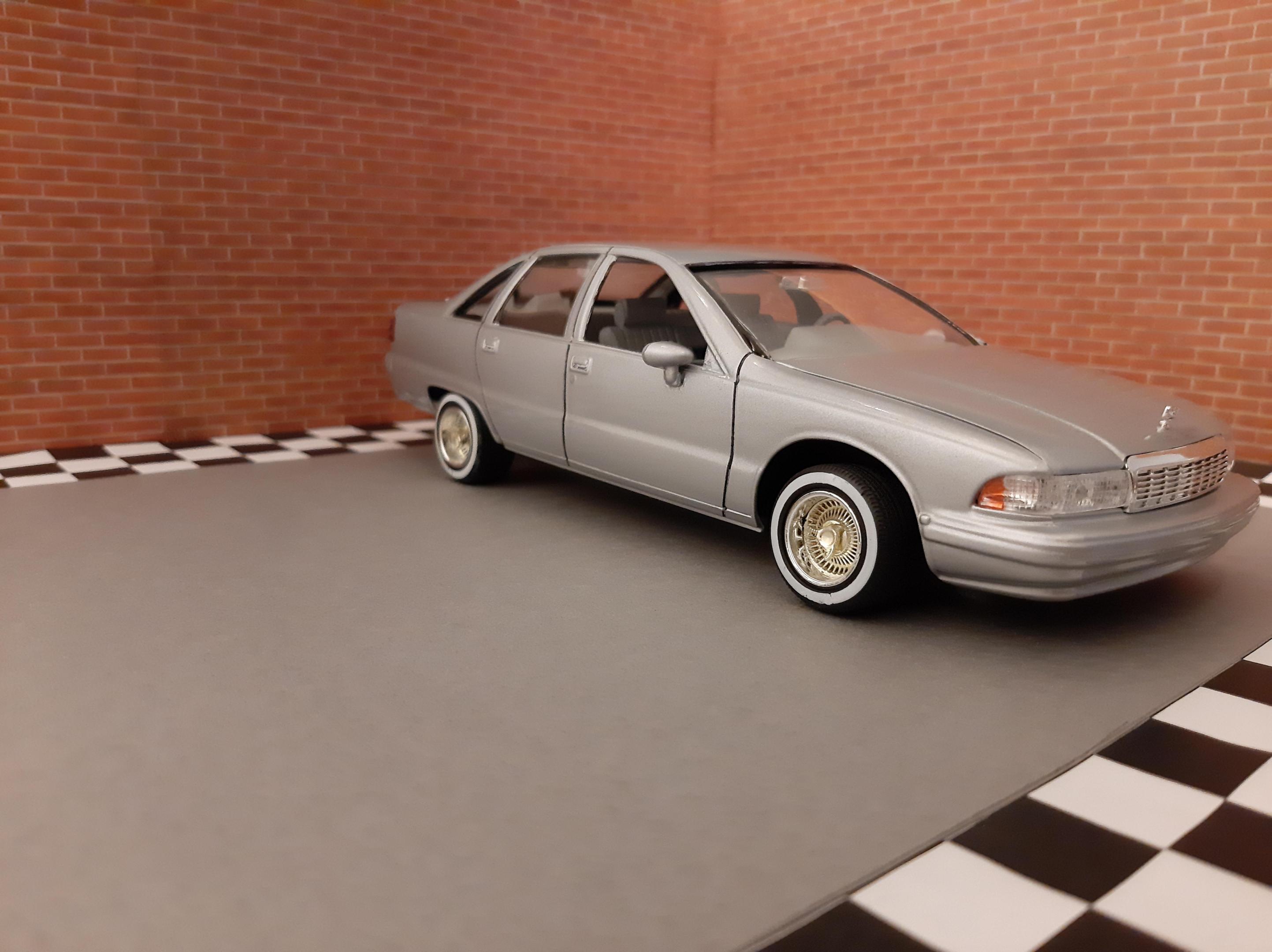 I love this generation of GM B Bodies along with clean Lowriders. I always wanted this exact set up of car, I think wire wheels really look good on them. This is one of my first few builds so the paint has its moments and I learned not to get Tamiya polish in panel lines. I also probably should have chopped up the wheel mounts so they would tuck into the wheel wells but at the time I did not have the courage to do it. I actually kinda like the stance, looks like a DIY hydraulic job. Anyways I bought another one of these kits to redo this kit but I may do it as a higher trim and leave the stock wheels. I also want to build a stock Impala SS. This build is basically done up as a guy who bought an old 9C1 from an auction, painted it in his backyard and threw some wire wheels on it. He also really detailed the engine and underbody...lol Tamiya TS 76 Mica Silver.