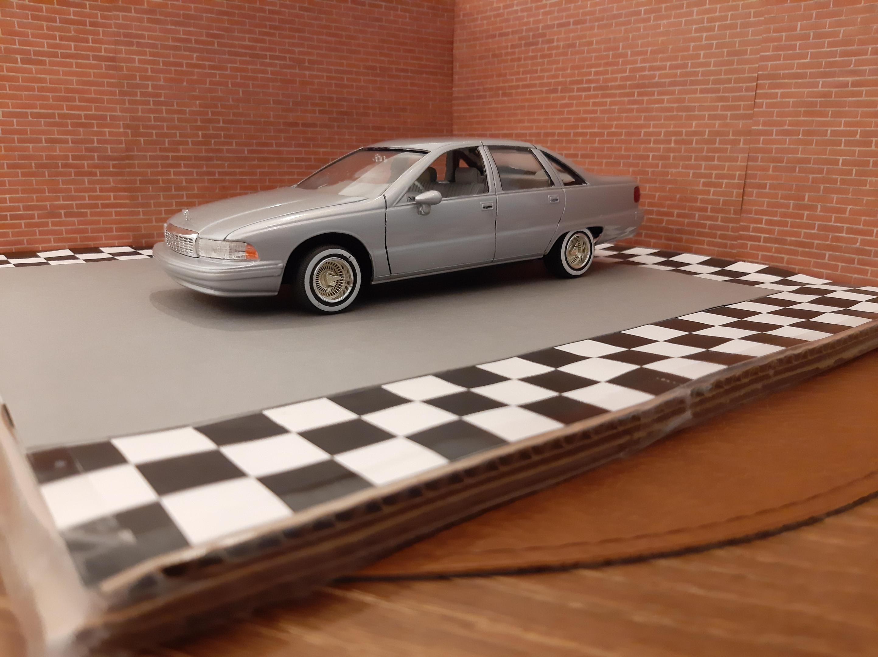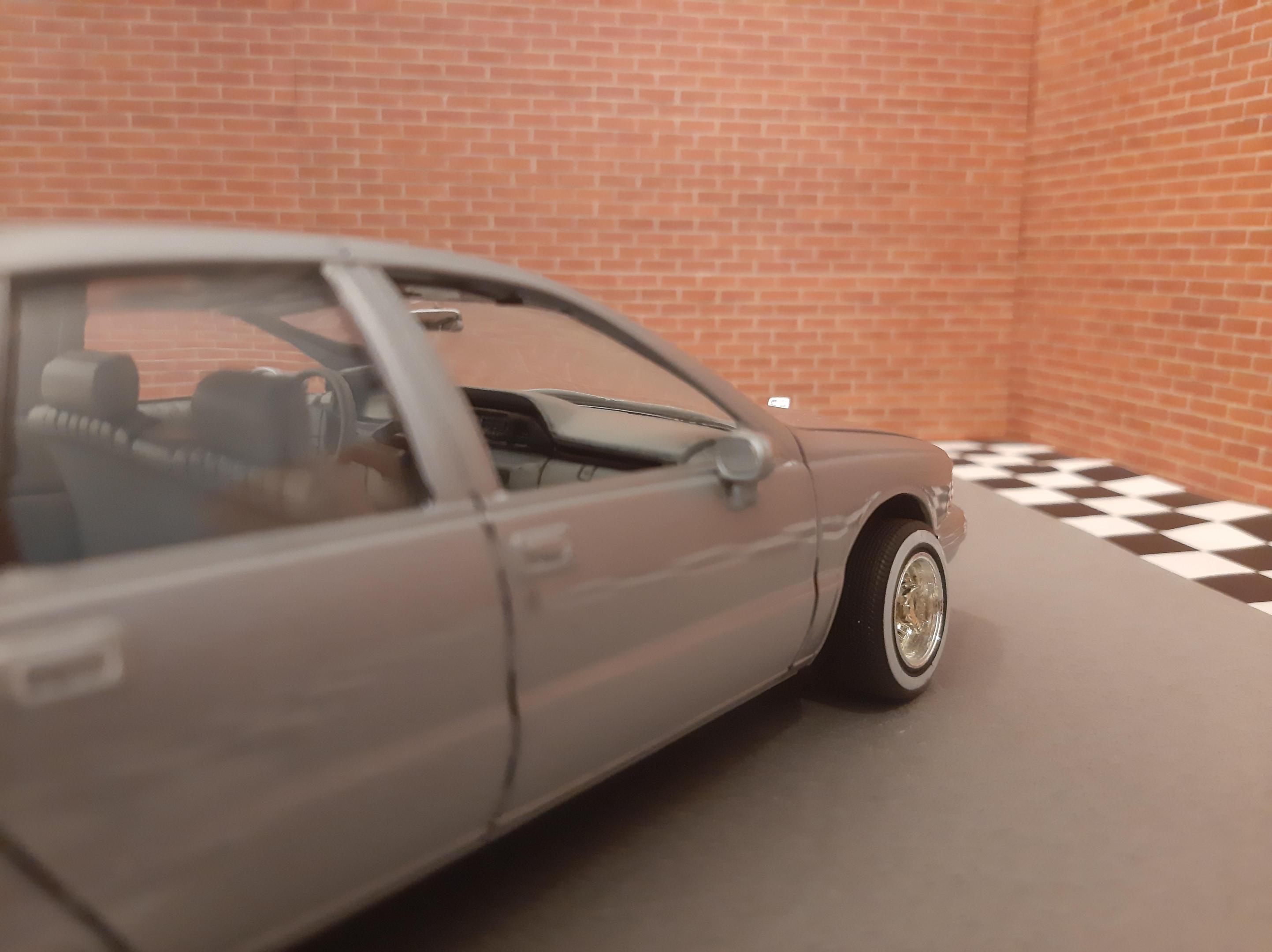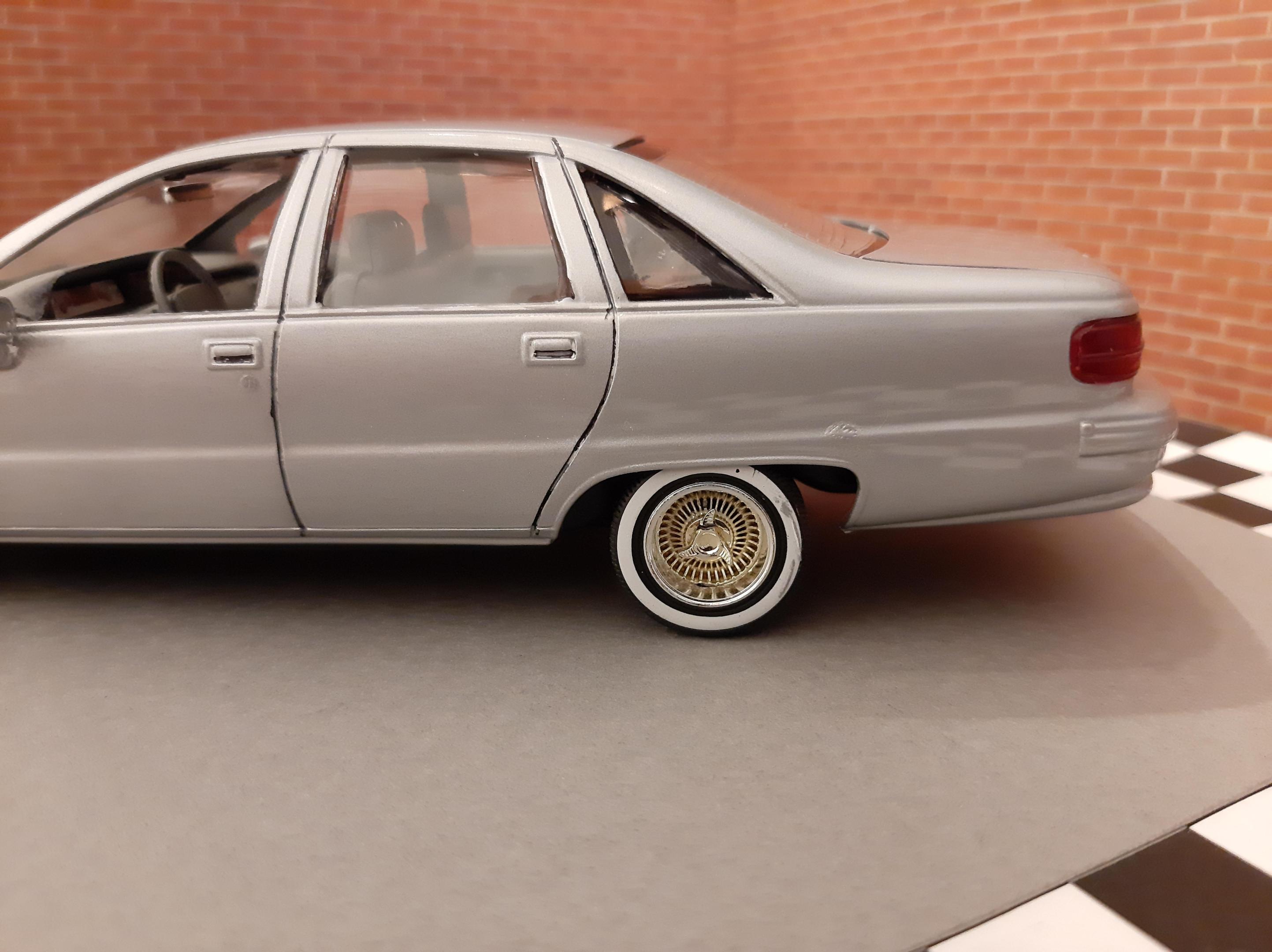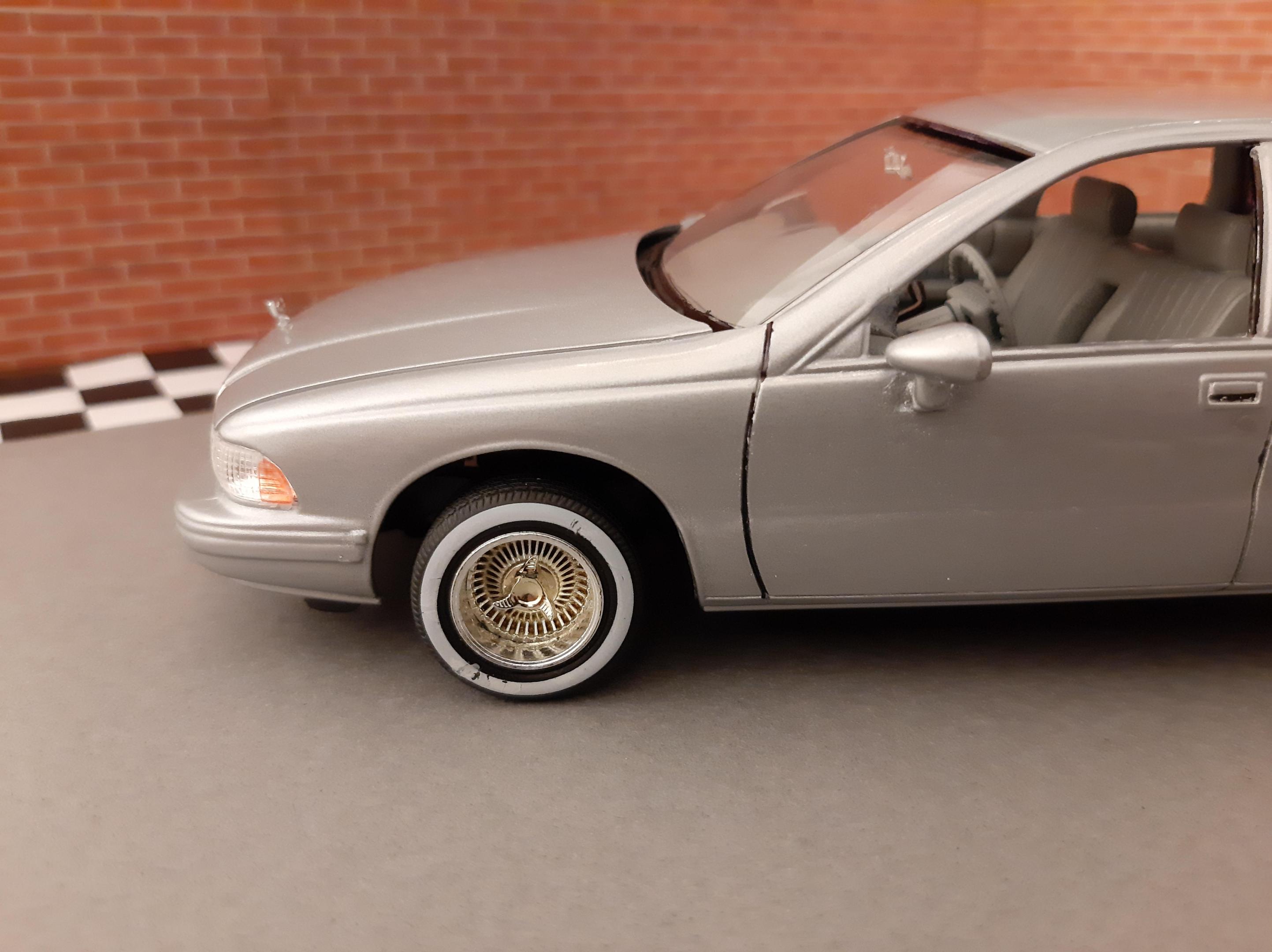I love this generation of GM B Bodies along with clean Lowriders. I always wanted this exact set up of car, I think wire wheels really look good on them. This is one of my first few builds so the paint has its moments and I learned not to get Tamiya polish in panel lines. I also probably should have chopped up the wheel mounts so they would tuck into the wheel wells but at the time I did not have the courage to do it. I actually kinda like the stance, looks like a DIY hydraulic job. Anyways I bought another one of these kits to redo this kit but I may do it as a higher trim and leave the stock wheels. I also want to build a stock Impala SS. This build is basically done up as a guy who bought an old 9C1 from an auction, painted it in his backyard and threw some wire wheels on it. He also really detailed the engine and underbody...lol Tamiya TS 76 Mica Silver.