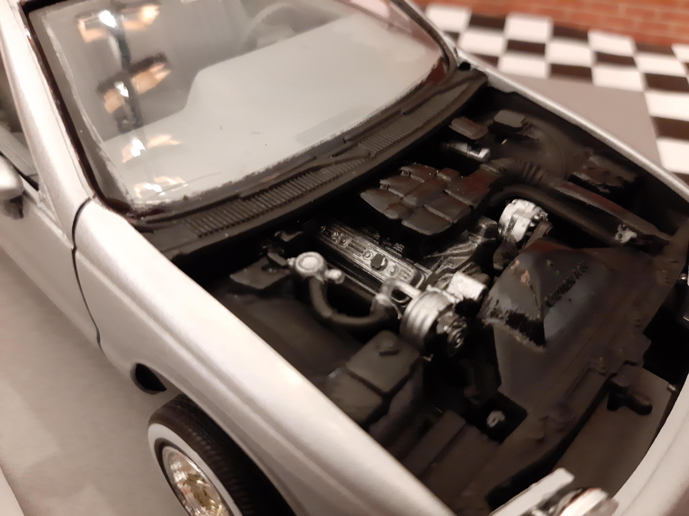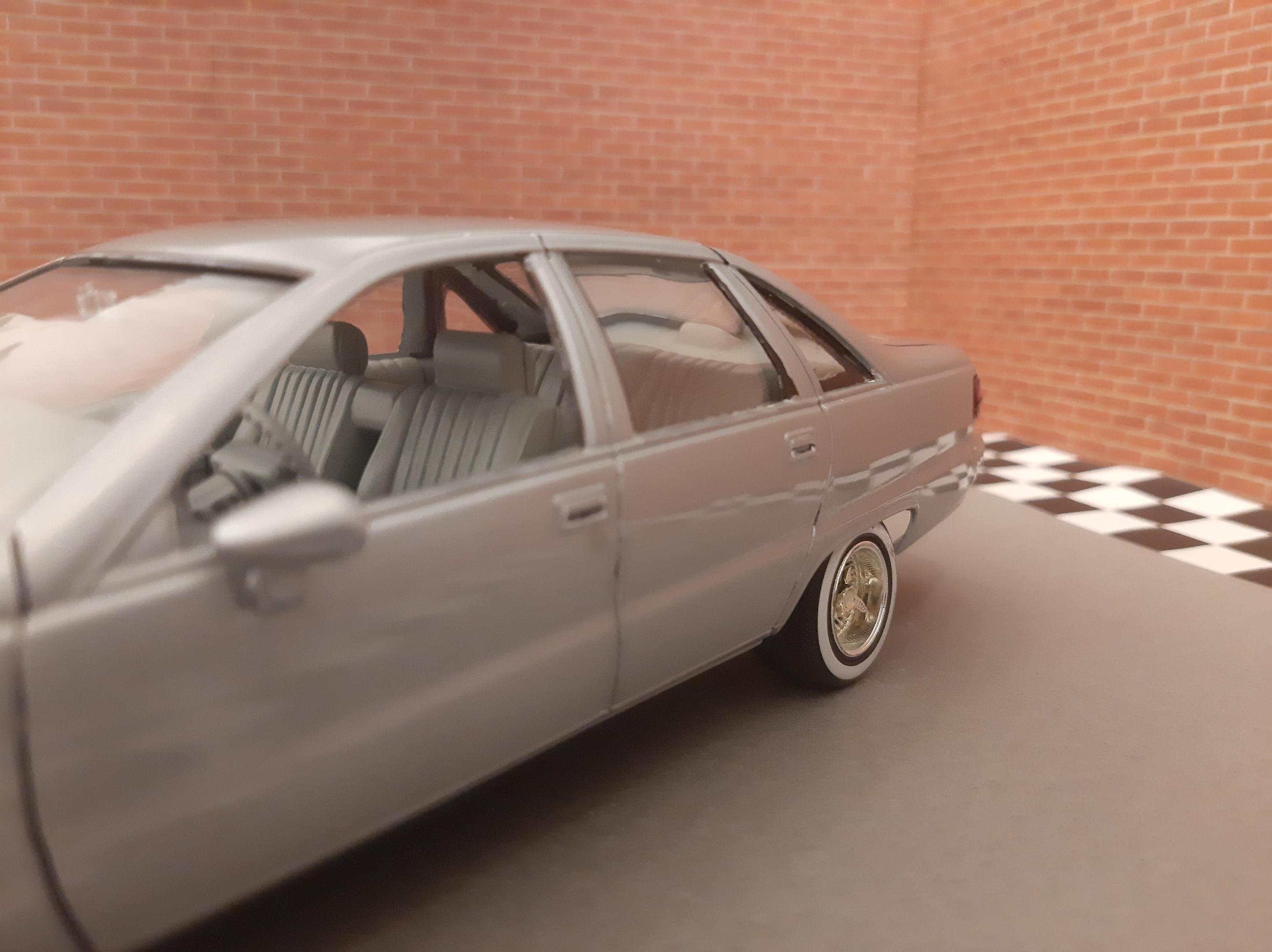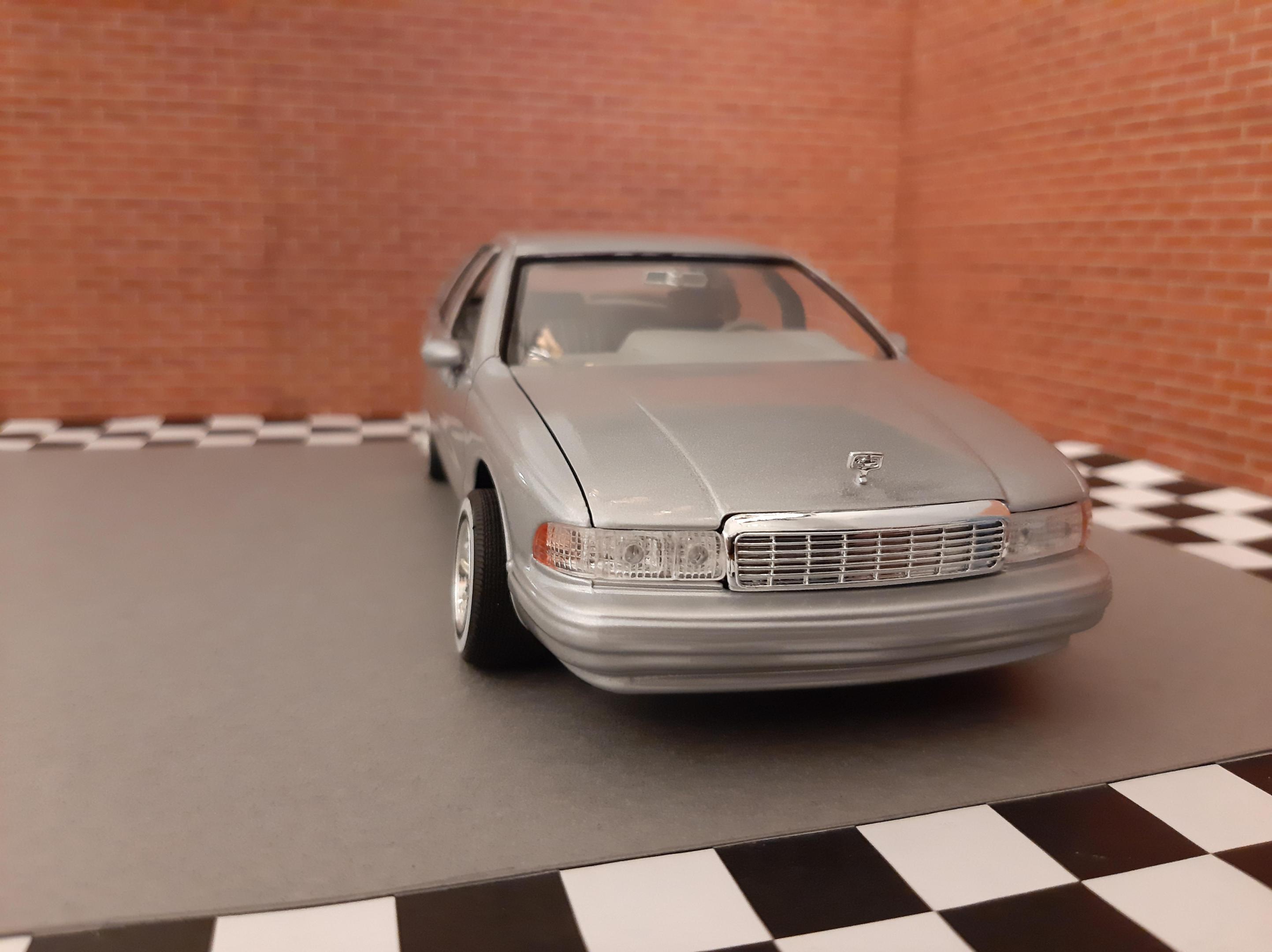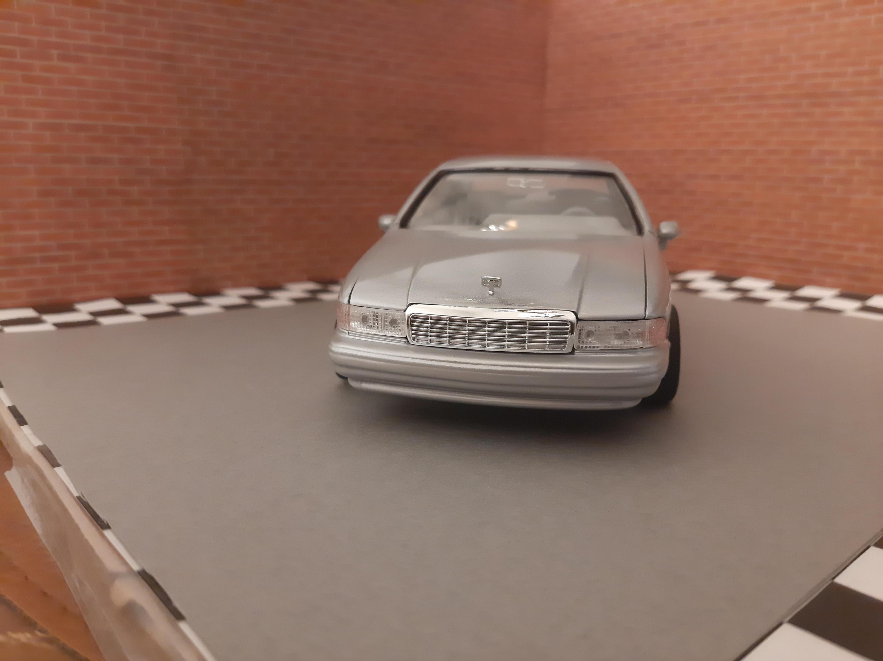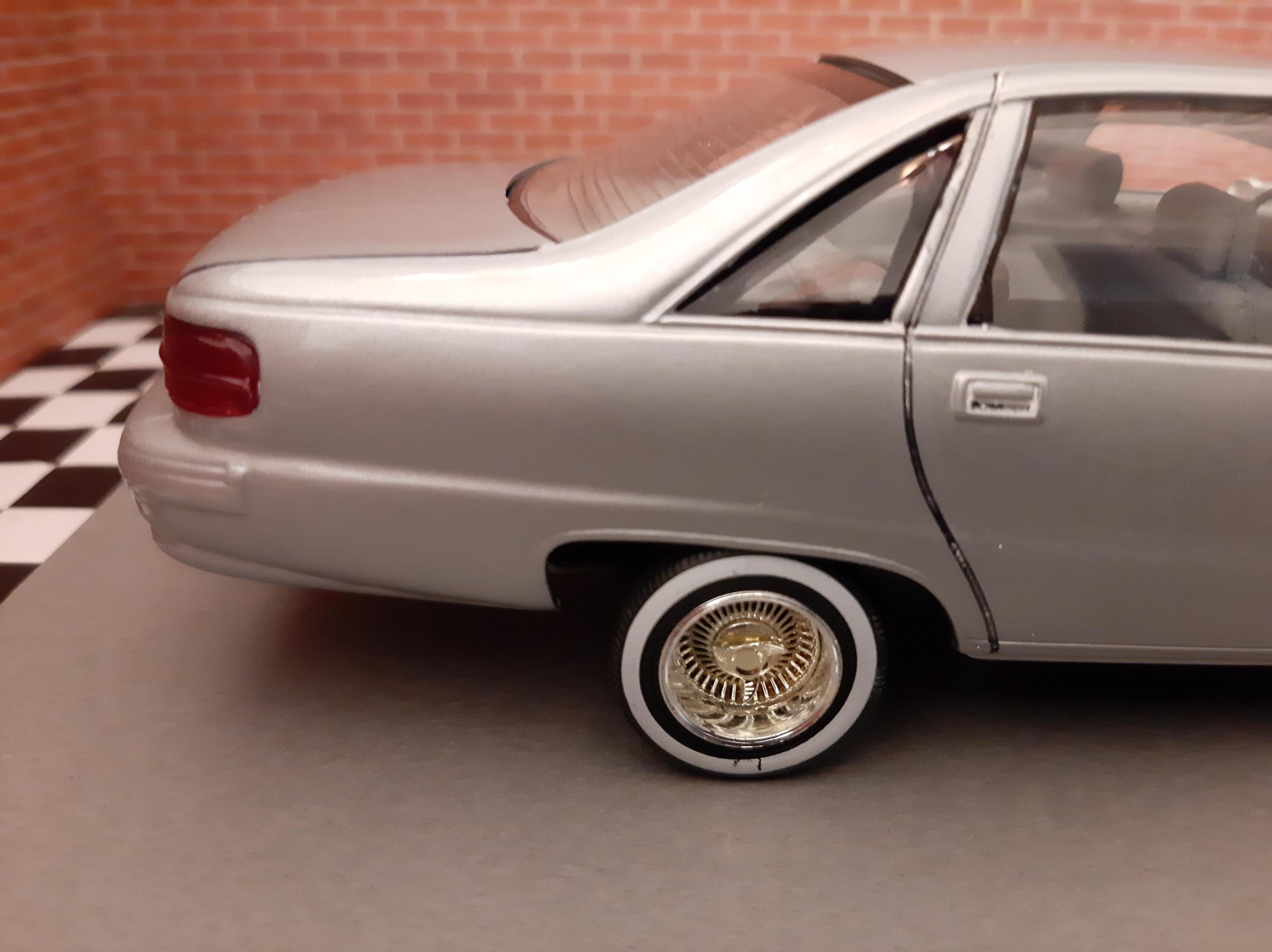 I love this generation of GM B Bodies along with clean Lowriders. I always wanted this exact set up of car, I think wire wheels really look good on them. This is one of my first few builds so the paint has its moments and I learned not to get Tamiya polish in panel lines. I also probably should have chopped up the wheel mounts so they would tuck into the wheel wells but at the time I did not have the courage to do it. I actually kinda like the stance, looks like a DIY hydraulic job. Anyways I bought another one of these kits to redo this kit but I may do it as a higher trim and leave the stock wheels. I also want to build a stock Impala SS. This build is basically done up as a guy who bought an old 9C1 from an auction, painted it in his backyard and threw some wire wheels on it. He also really detailed the engine and underbody...lol Tamiya TS 76 Mica Silver.