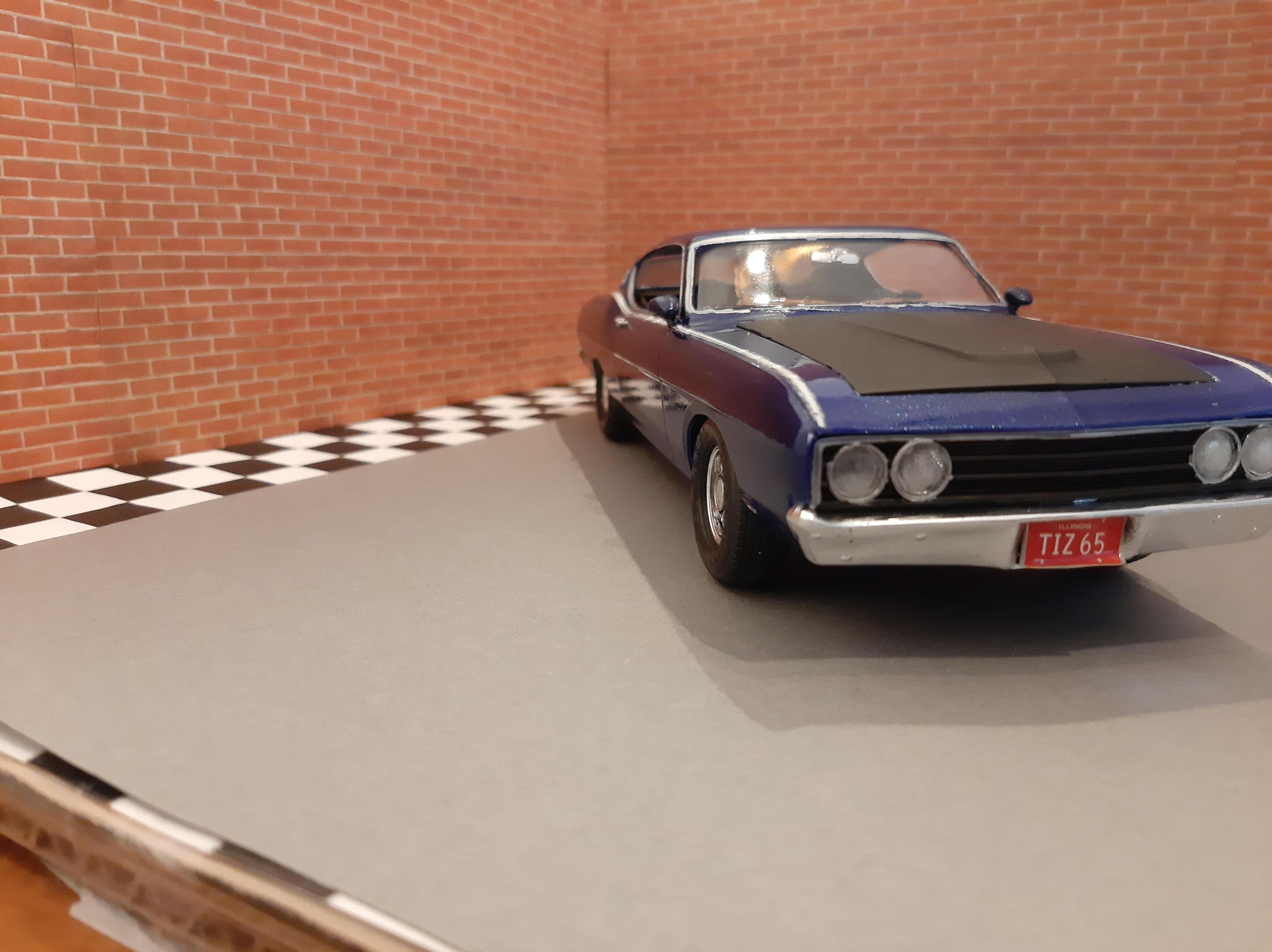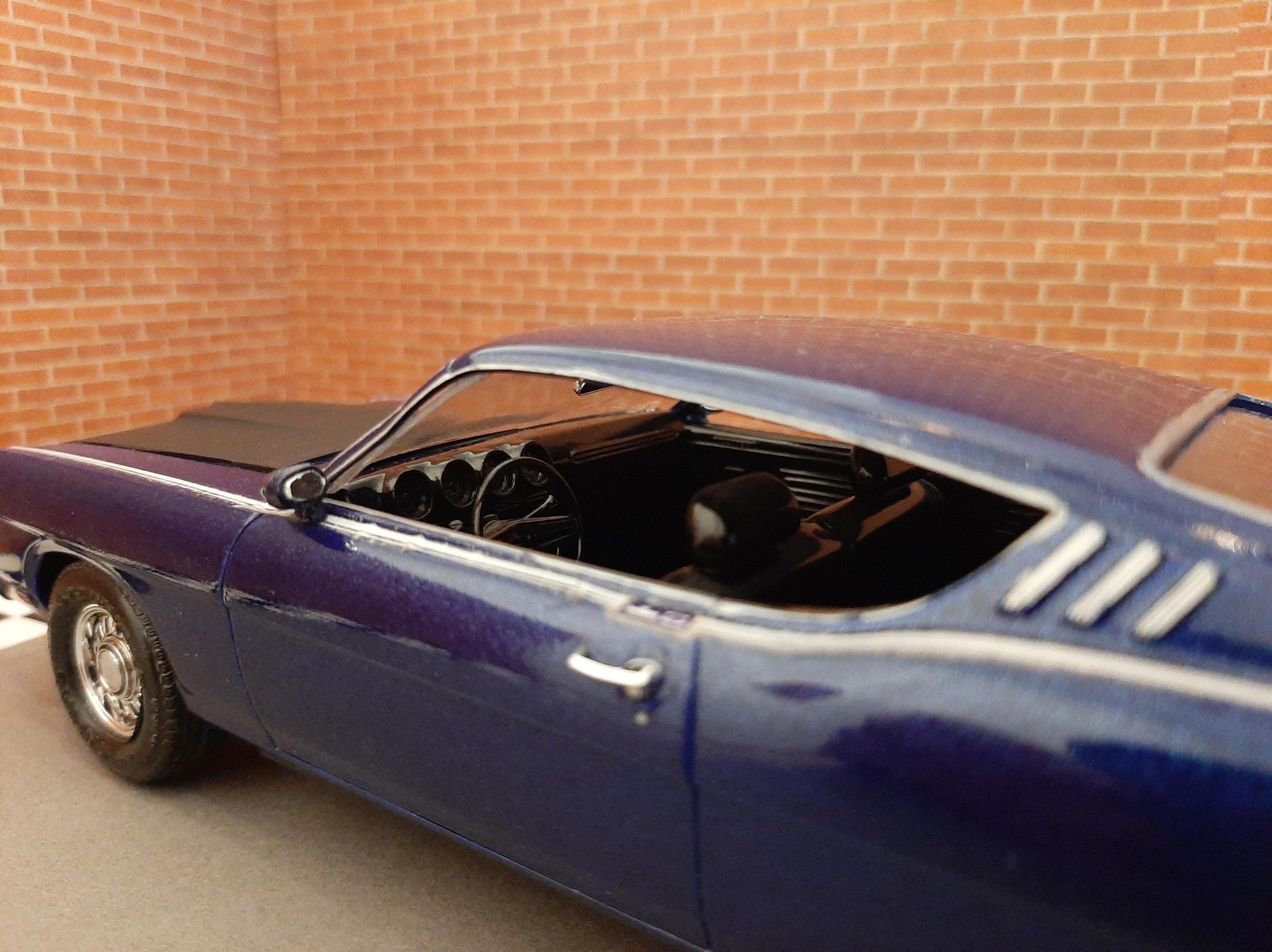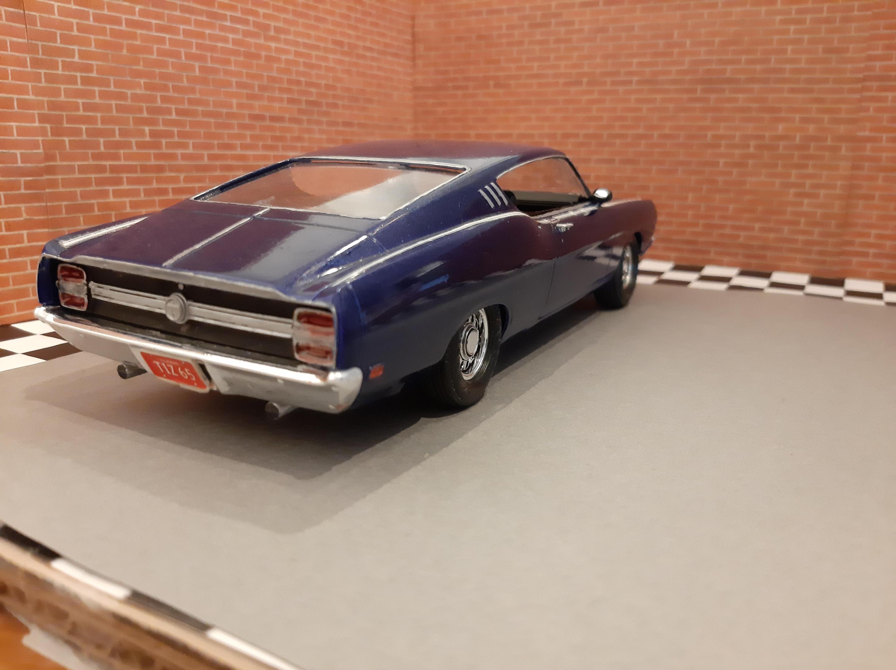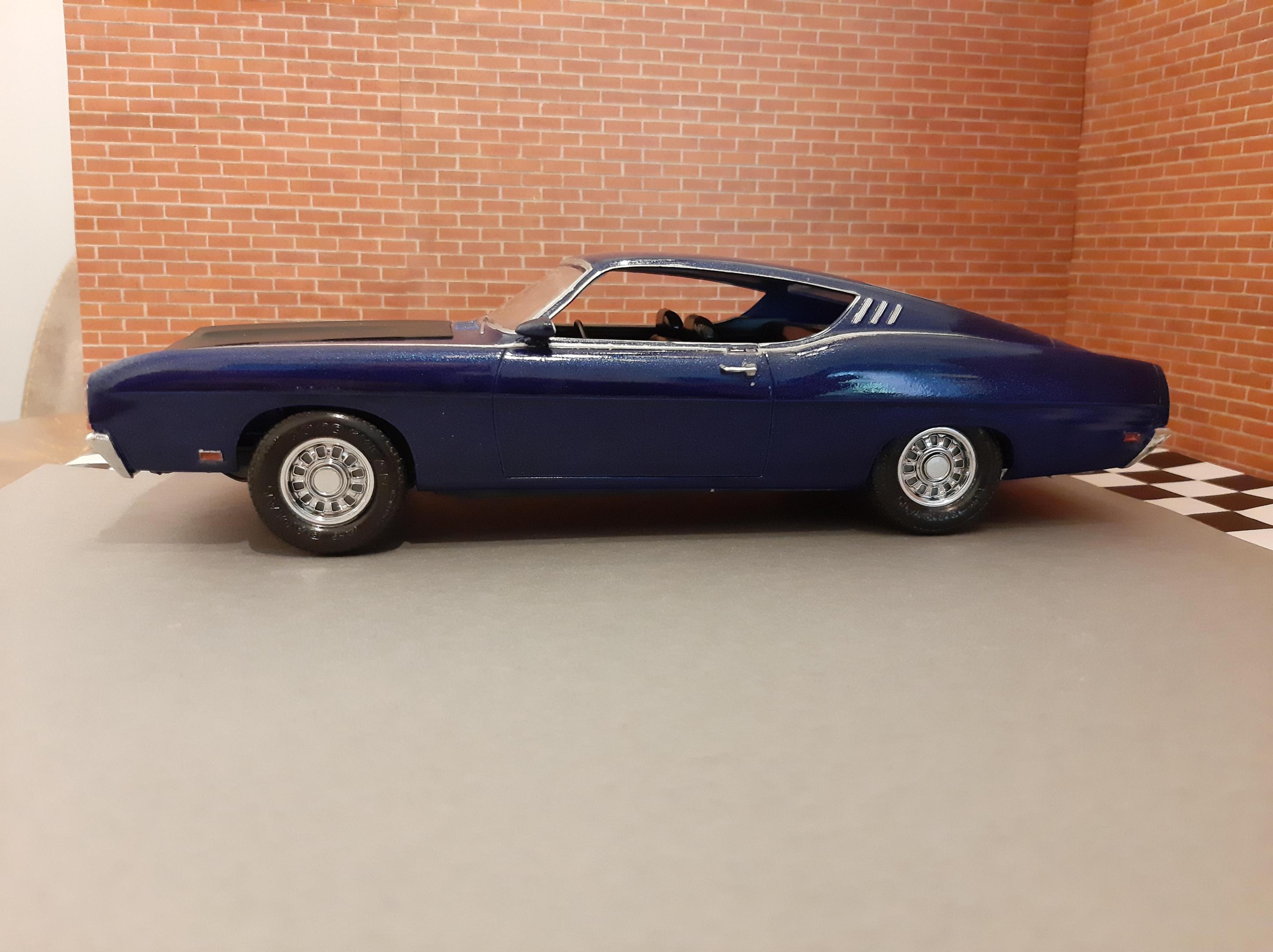 This was my third build I had ever made in my life back in 2012. It has lived in a box and somehow survived. This car has some crude details but it was one of my very first and I am surprised it looks presentable. 1969 Ford (Torino) Talladega which I have now realized how rare of a car it actually is. Somehow I painted this with Testors Extreme Lacquer Deja Blue which is similar to one of the factory colors available in 1969. I wanted to rebuild this car but it has a survivor vibe to it so i'm going to leave it. I have since bought the AMT 1969 Torino Cobra version of this car which I look forward to build.