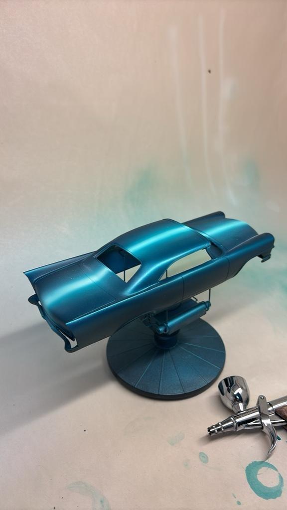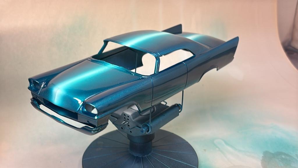 And we have success for the evening!! Got ‘er in the dehydrator for the evening, in a day or so will give it a light scuff, lay out the pearl white/white fade down the center as well as the insert fade then re-clear. Once that is done I’ll turn my attention to the interior, engine, and such. -