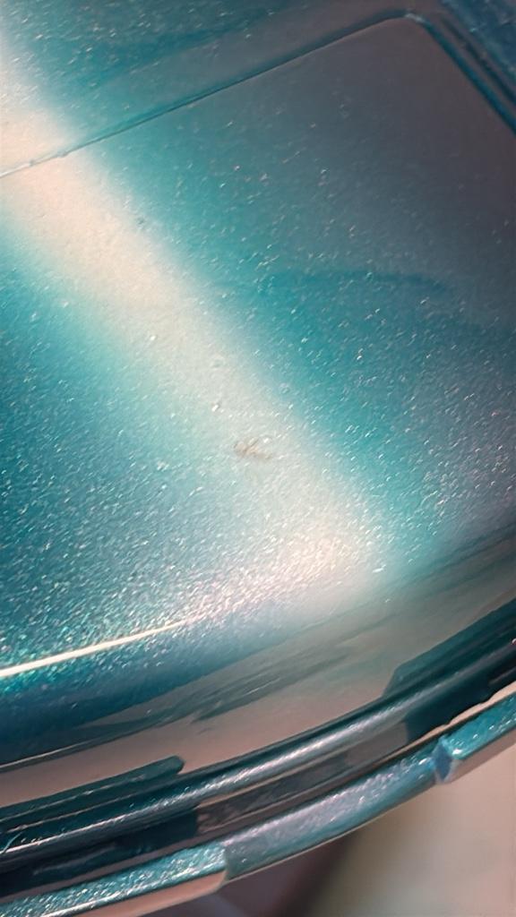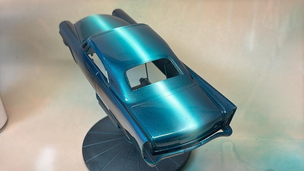 Aighty, this paint job was a sweet pain right in the petunias and gave me a whole new level of respect for Gene Winfield’s work!…. And of course, a bug had to land right square in the middle of the brightest part of the fade. He left the paint without his legs, and THEY will be sanded-out as well! But we got the fade done, cleared, and the next step will be masking off the inserts on the lower quarters wrapping around under the rear bumper, which I think at this point will be a straight light teal pearl, then the final clear, and we’re over the hurdle!!…. Now I can turn my attention to other things like the engine and interior. Enjoy! -