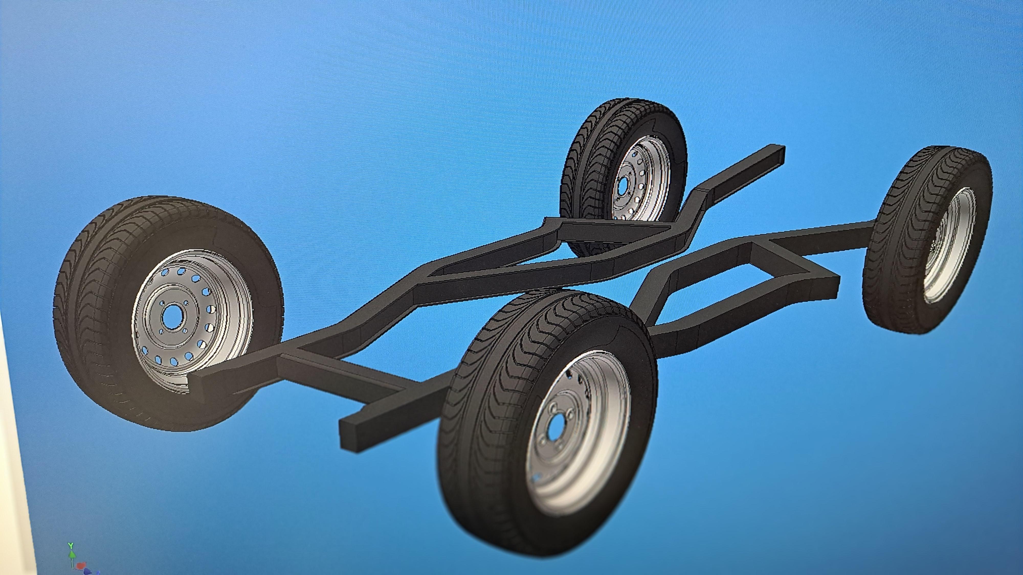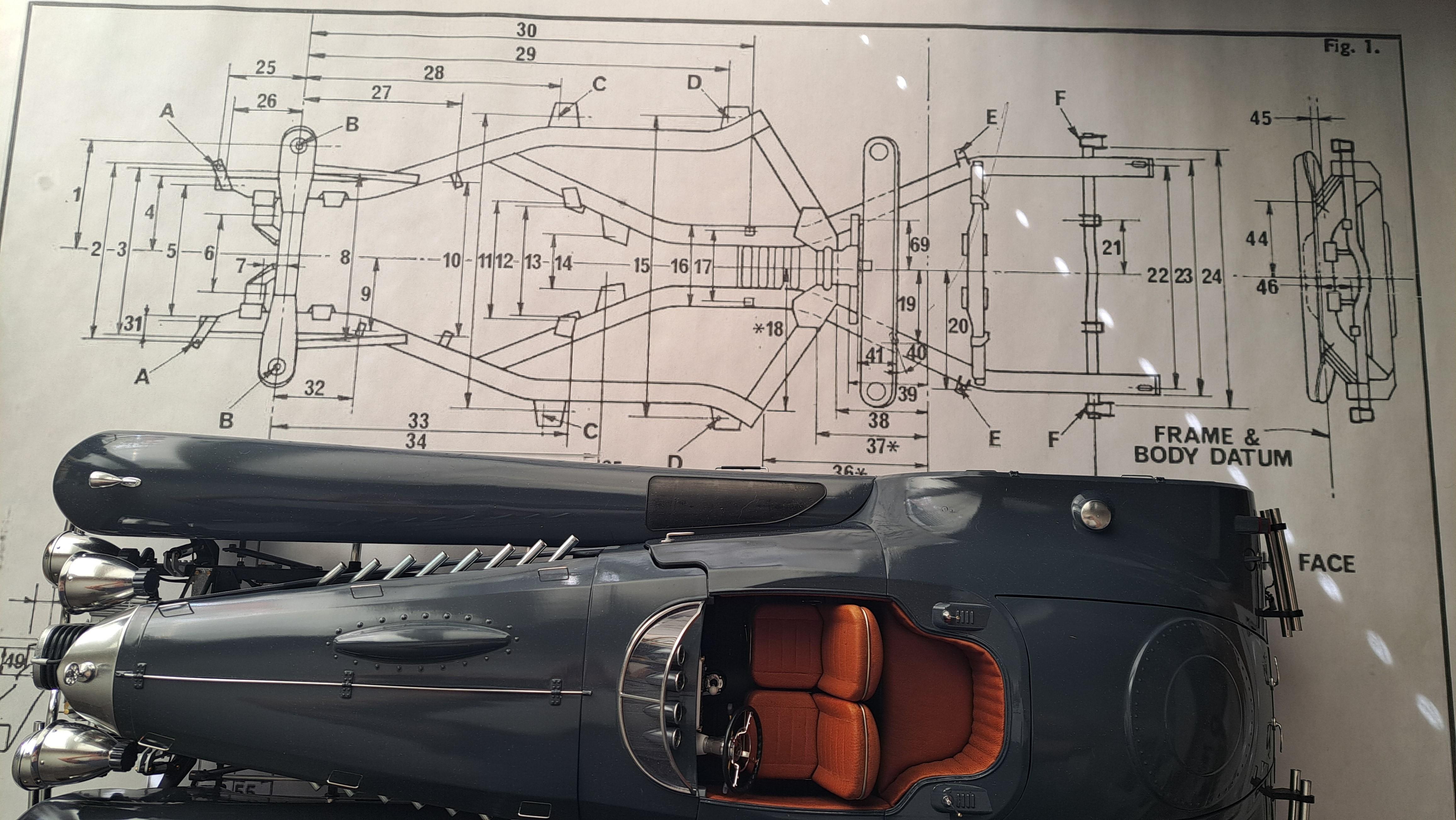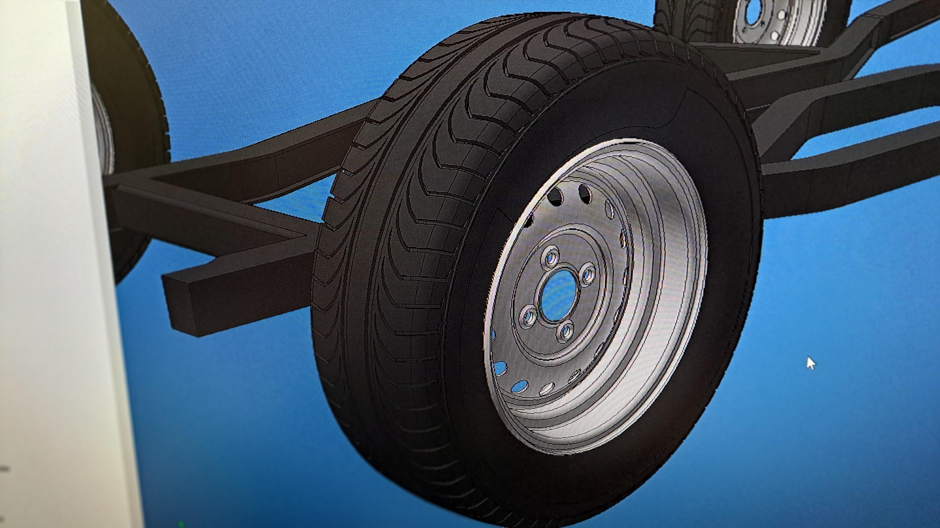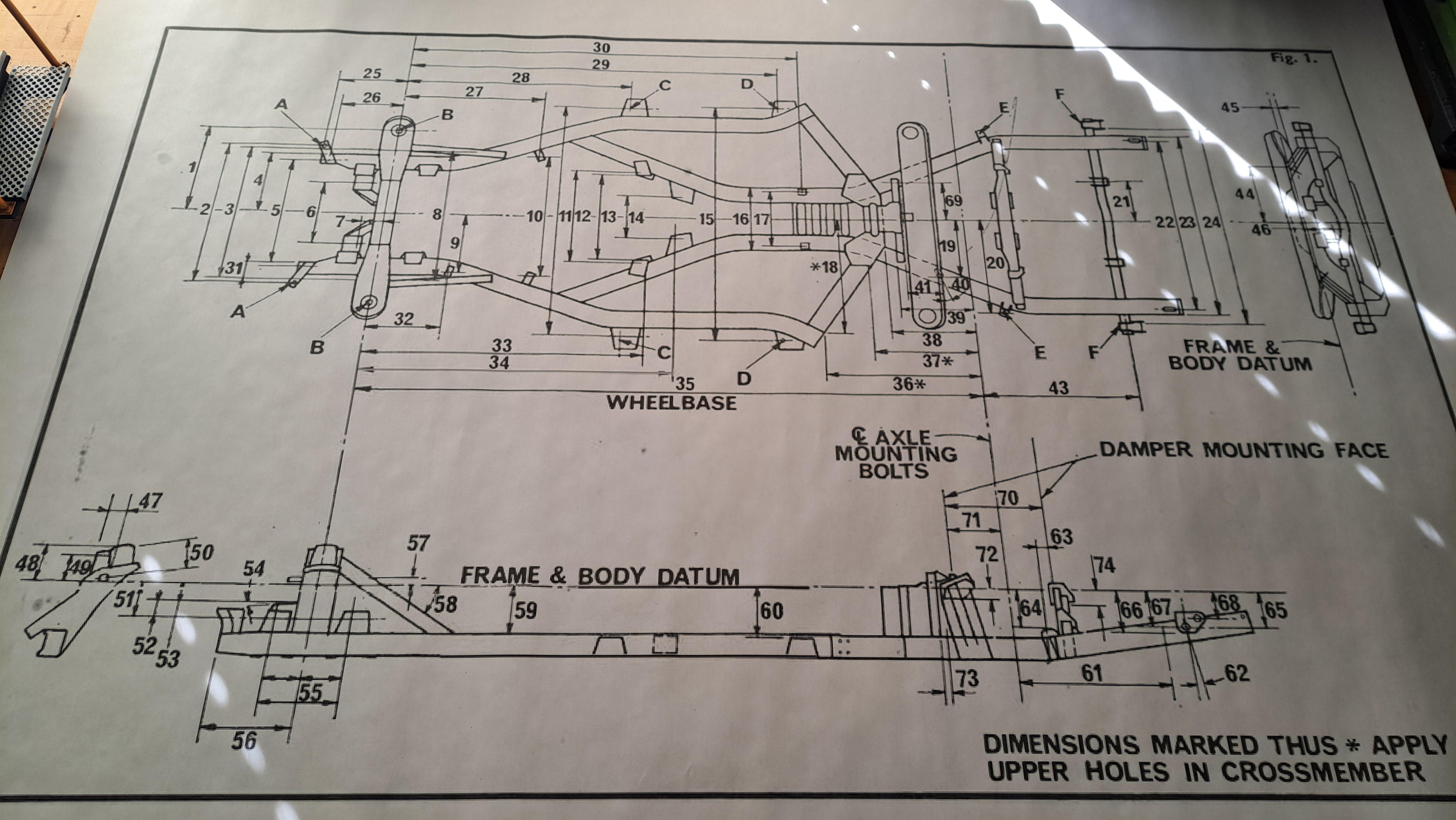 Hi all I'm slowly starting the Tr6 project. I settled on the 1/6 scale so it will be a large model. First thing I did was to print the frame's 2d drawing I have at the correct scale. This is an original triumph drawing out of the maintenance manual. Here's the 2d paper print at 1/6 And with the 1/12 Hydra next to it for size comparisons. At 1/6 scale, the tr6 will be close to 26 inches long compared to 25 inches for the 1/12 hydra. So yeah, the tr6 is a small car, and the hydra a monster. It will be quite a challenge to figure out how to print the frame. I've started the frame, steel wheel and tire. I still have a lot of work to do on the frame and some on the tire. I have a friend who owns a antique British car garage, I'll check with him and see if I could borrow some used suspension parts. It would be alot easier to draw the parts if I have them in my hand rather than measuring directly off the car.