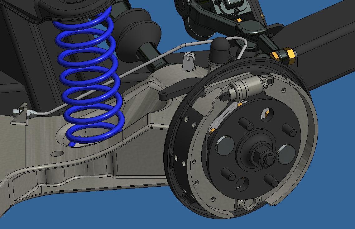 I started this project stating that I wanted a running engine and drive train as I did on the Hydra. I would also like it to be a better design. The hydra motor broke, yes because the weak point was the crank but also because there was a lot of friction from the different rotating components. So I'm trying to reduce this friction by using ball bearings wherever possible. I'll have then at the rear hubs, inside the differentiel, the transmission and, if possible, the engine. I bought a bunch of 3mm id x 7mm od x 3mm thk bearings. With this in mind, I 3d modeled the rear drive train and differentiel today. It's not 100% finished but it's close. Inside the differentiel, I'll probably use the same setup as I used on the hydra which means it's not a real differentiel but rather a 90 deg gearbox. I also finished the trailing arms, I got them looking a lot more like the real ones now. Almost finished differentiel Trailing arm with drum and half shaft cross section of rear drive train with bearings in place (not final yet)