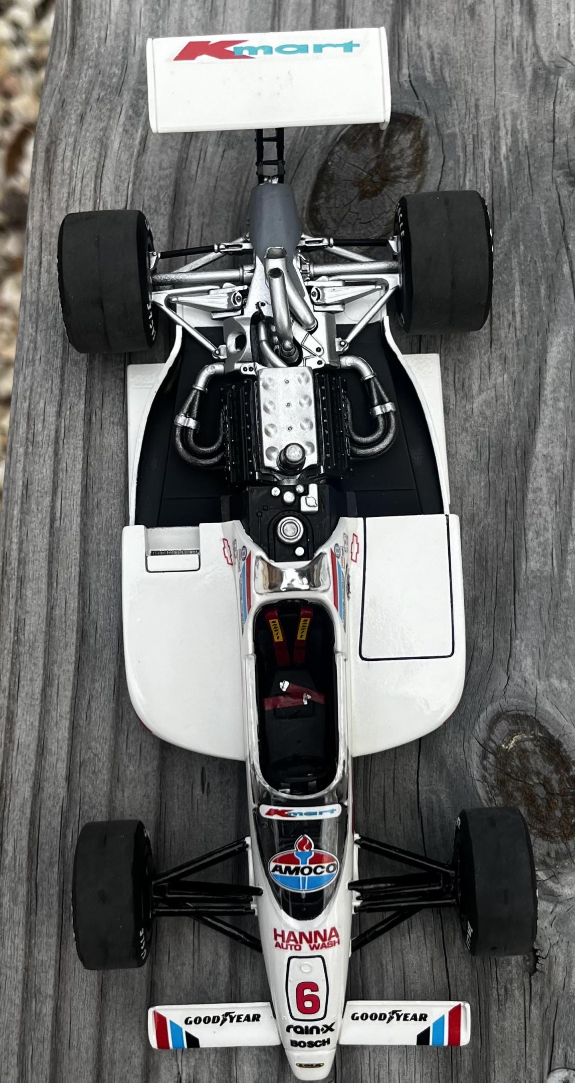 Salvinos kit/decals. The hood had an AWFUL warp in it so I had to do my best to straighten it back out. Don’t know if anyone else has had that issue with these kits. The back two plug wires on each side run behind and under the heat shields. I just ran the others over the top to have something to look at. I’ve always loved the story of him winning the 500 in what was, at that time, a show car. Great looking livery to boot.