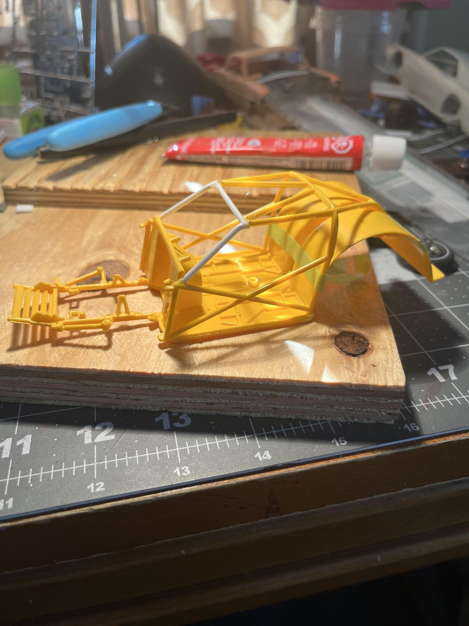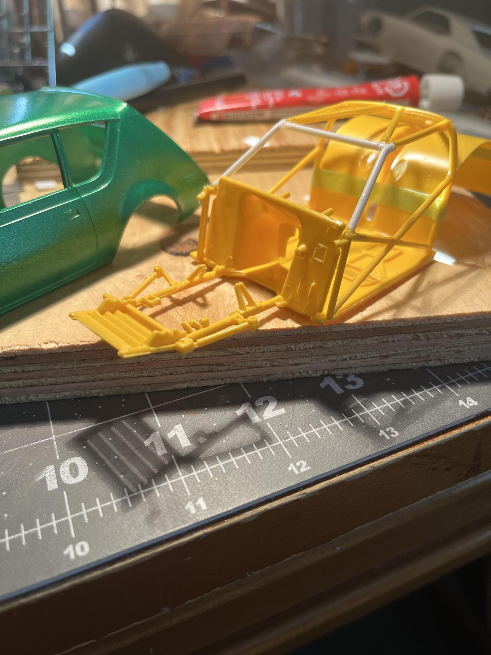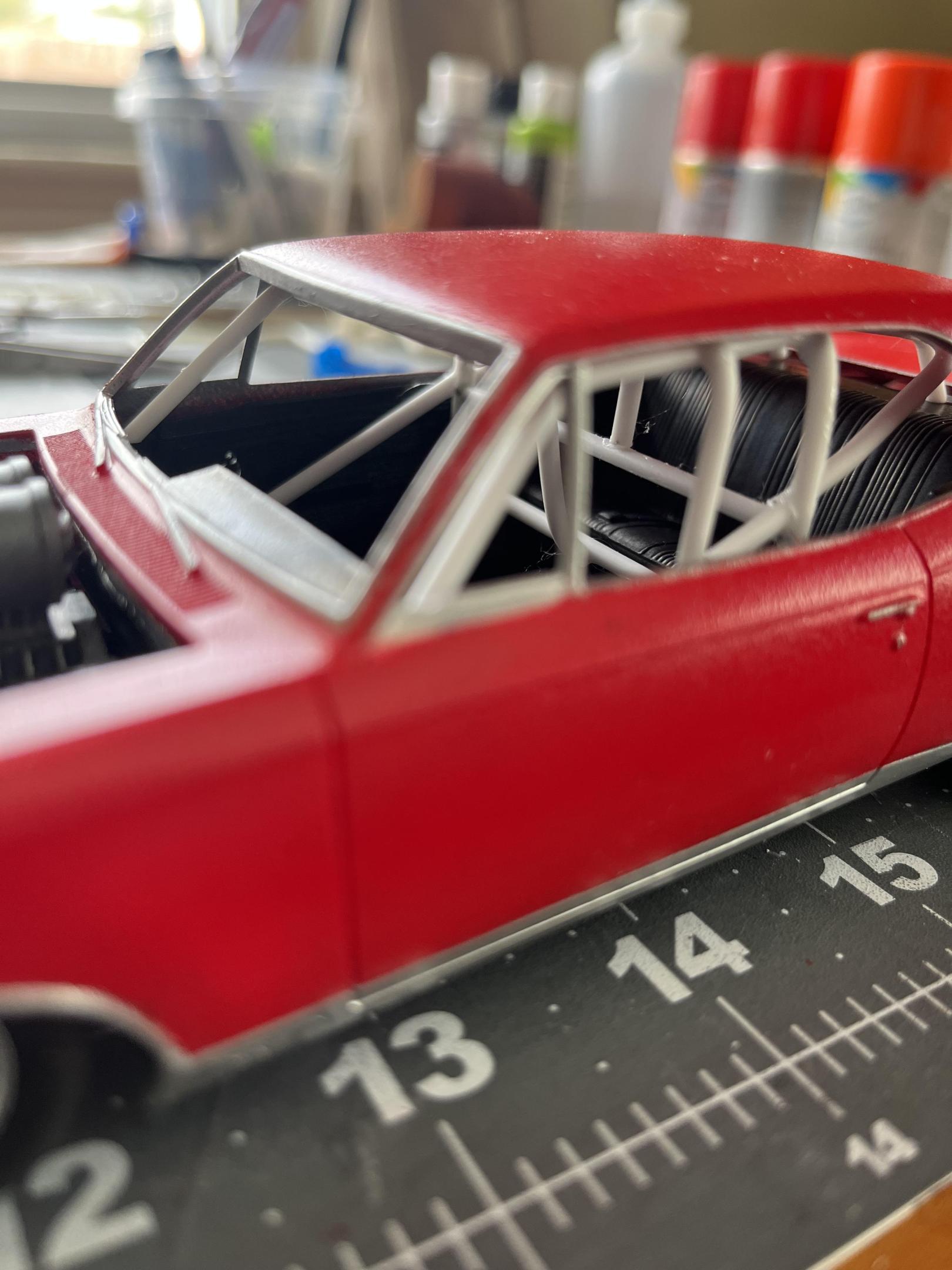 Thanks! I had to extend the nascar frame right in front of the firewall almost a 1/4 inch on both sides with square plastic rod which I had to sand a lot to make it look like it was unchanged. I also removed some of the cage bars to make it era appear era correct. Also you will notice from the pictures that the rear wheel wells were cut down on the top some that the body would be at the correct stance that I wanted. About your engine and transmission position problem, when cutting to fit a frame to a body , always try cut the engine mounts off and move them back if it has them or use some small plastic rod too fabricate the motor mounts and trans mount. The engines in the old stockers always sat back in the engine bay to save them from front end impacts! Hope this helps you out a bit , thanks for your input!