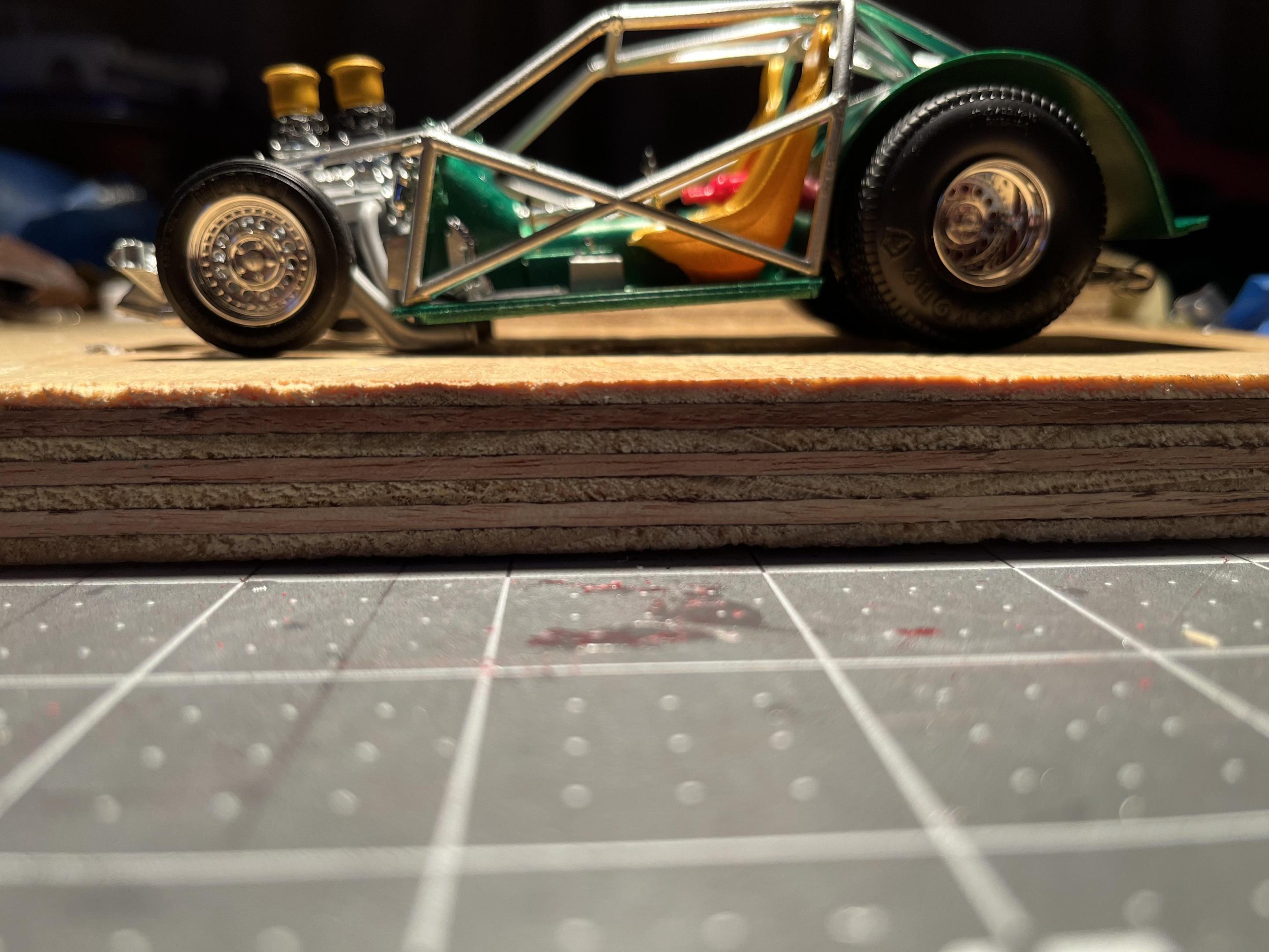 This kit was a Hobby Lobby purchase that turned out to be a terrible kit to build. I had heard from several other modelers about the flash and part fitting problems which I have encountered also. I had an extra pro street chassis from the AMT pro street GTX, a set of Jays Resin V series drag wheels and an Iceman Collections Roots blown Hemi which I am using in this build! I also made the funny car style cage by hand. This is also another work in progress. Thanks for viewing.