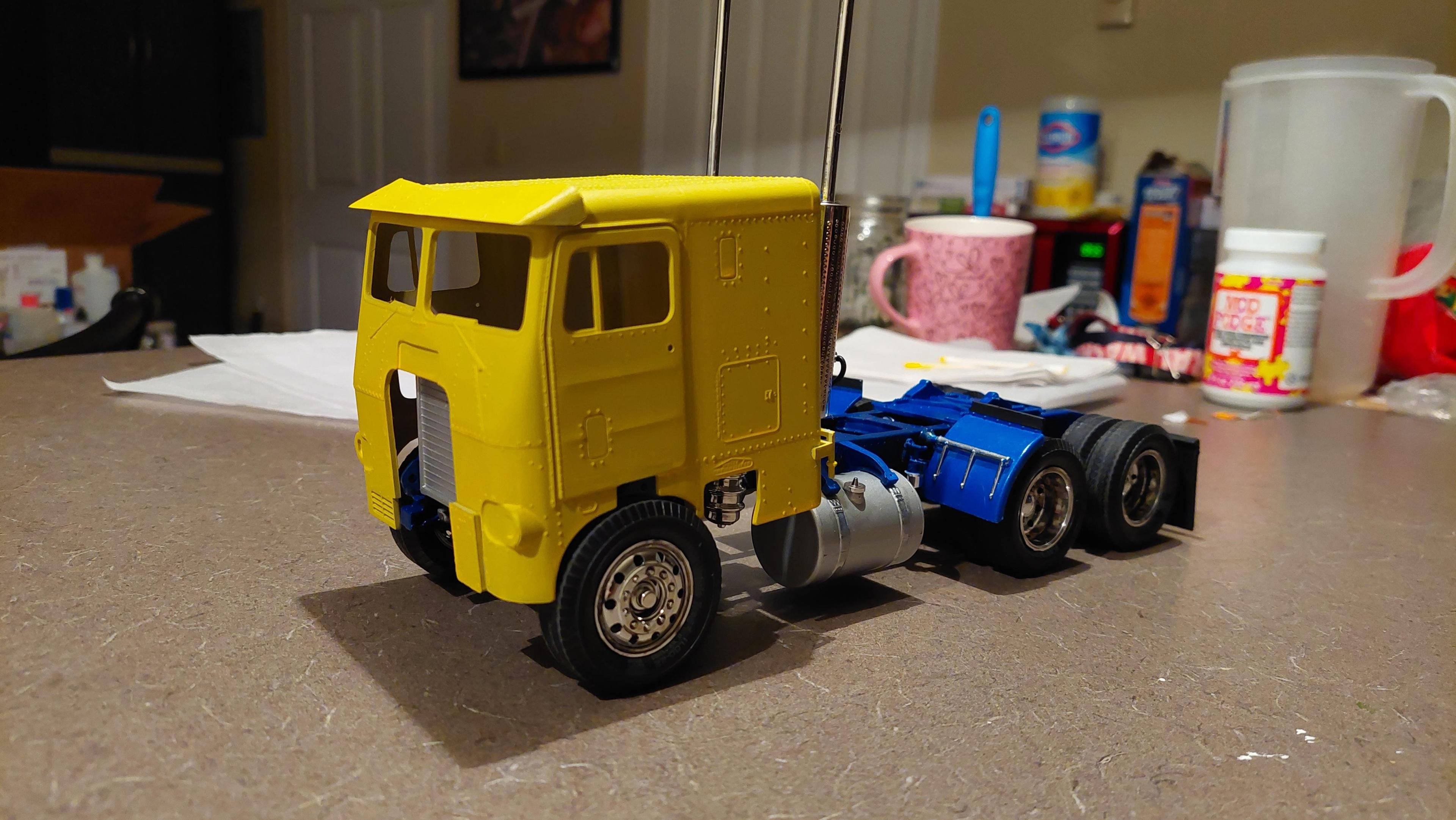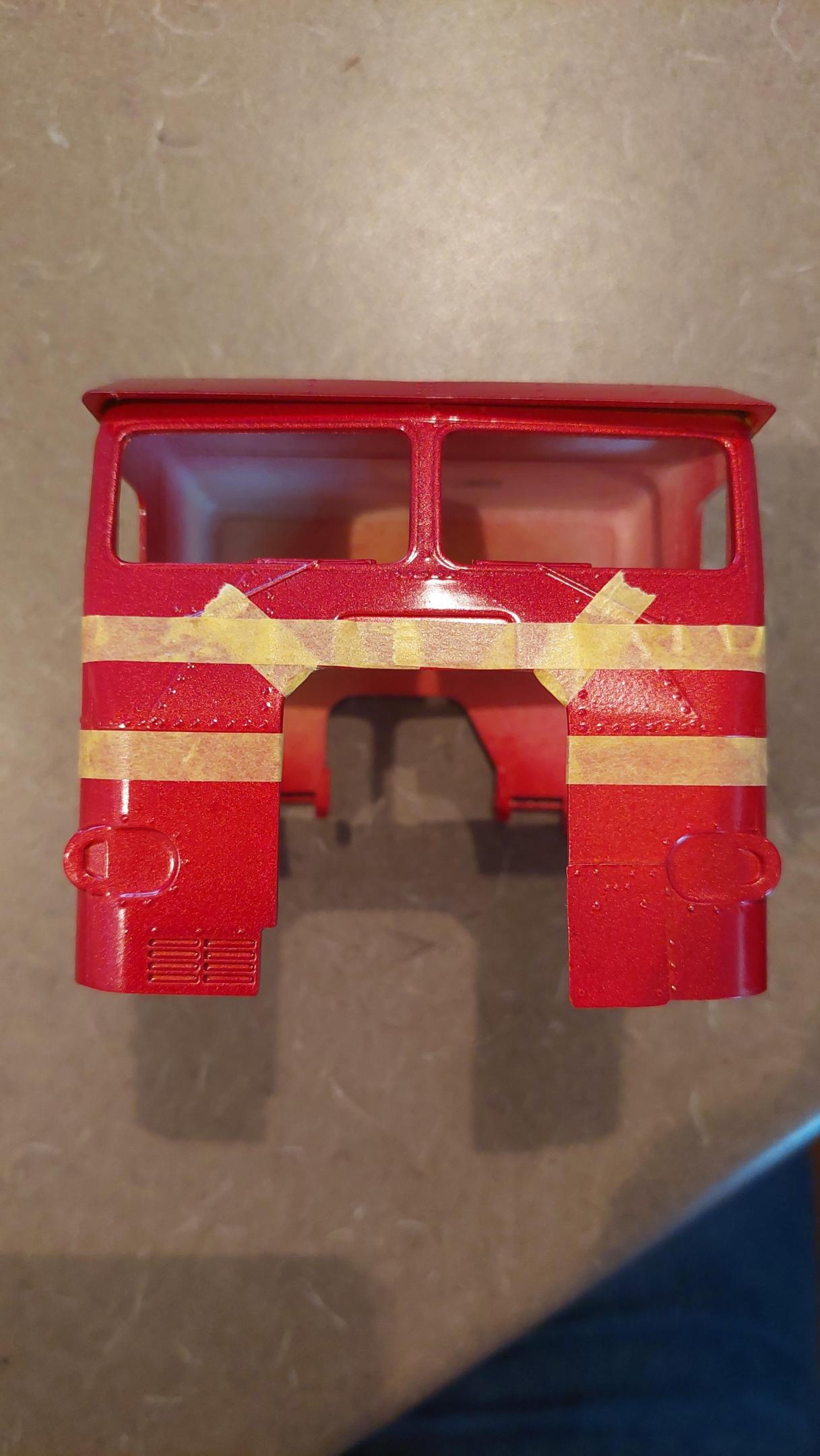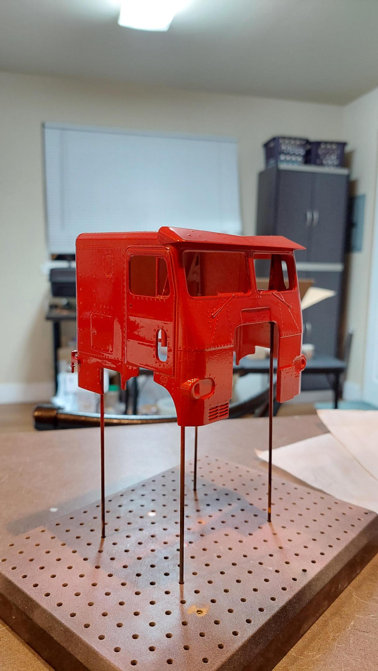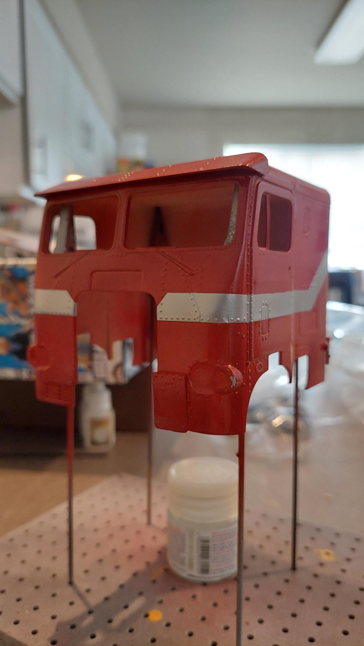 Alright! Red has been painted. As shown in the pictures below, this was achieved with a base coat of thinned Vallejo yellow (this coat came out a little grainy and it slightly shows in the final product upon close inspection). With testing, this showed to result in the brightest red from the next paint I used: Testors enamel metallic red rattle can. Overall really proud of it and probably wouldn't change a thing. I'll let it sit a bit, gloss coat, sit even longer, then I'll mask off the silver stripe around the cab. After that, it's nothing but gluing! Then I'll move onto the trailer which is both extremely simple and very complex- 32 replies