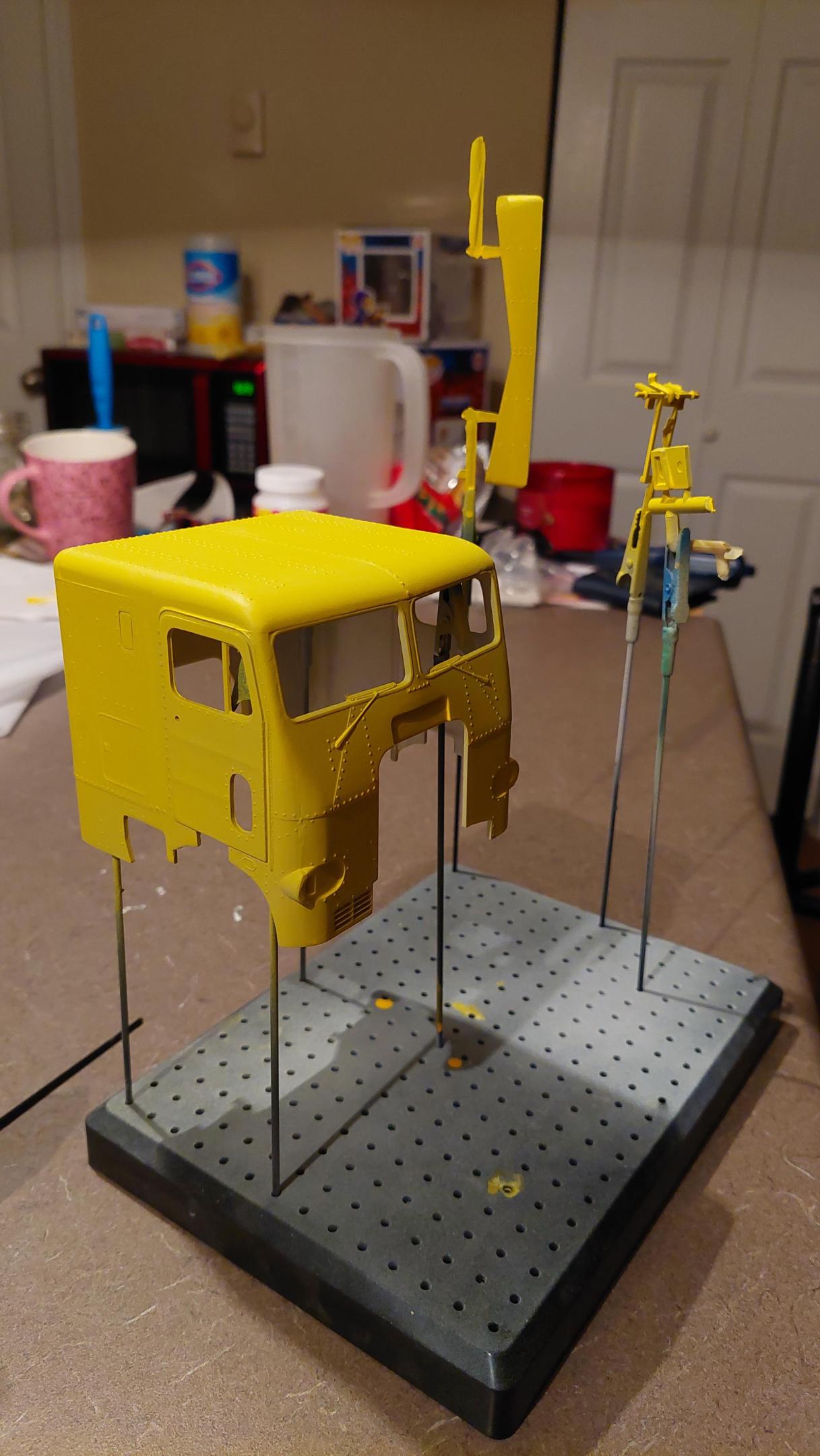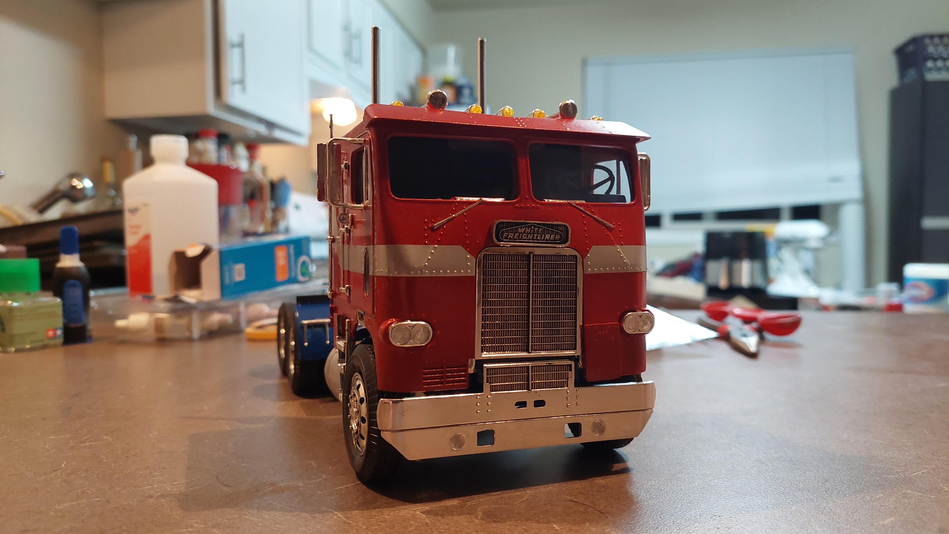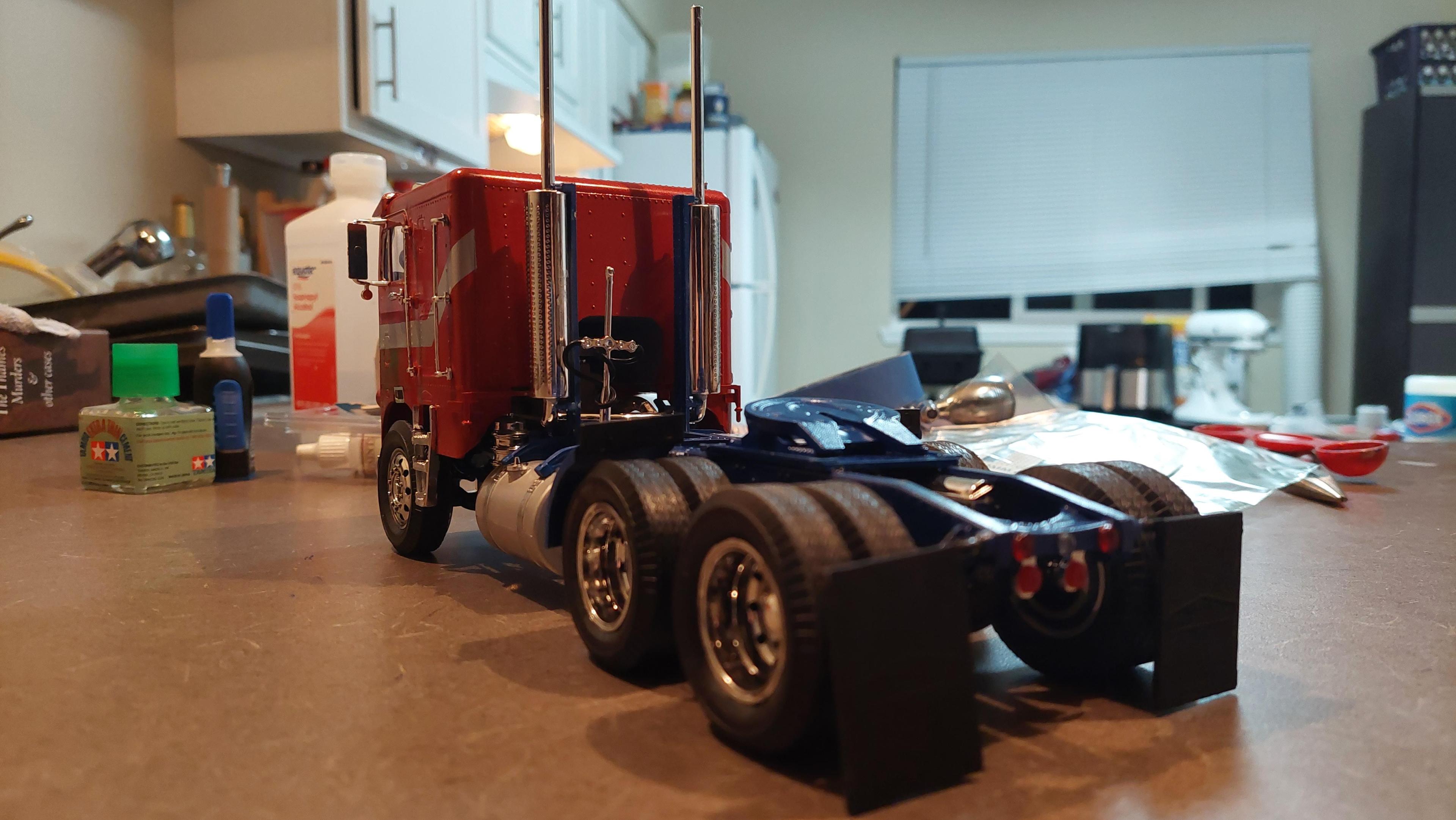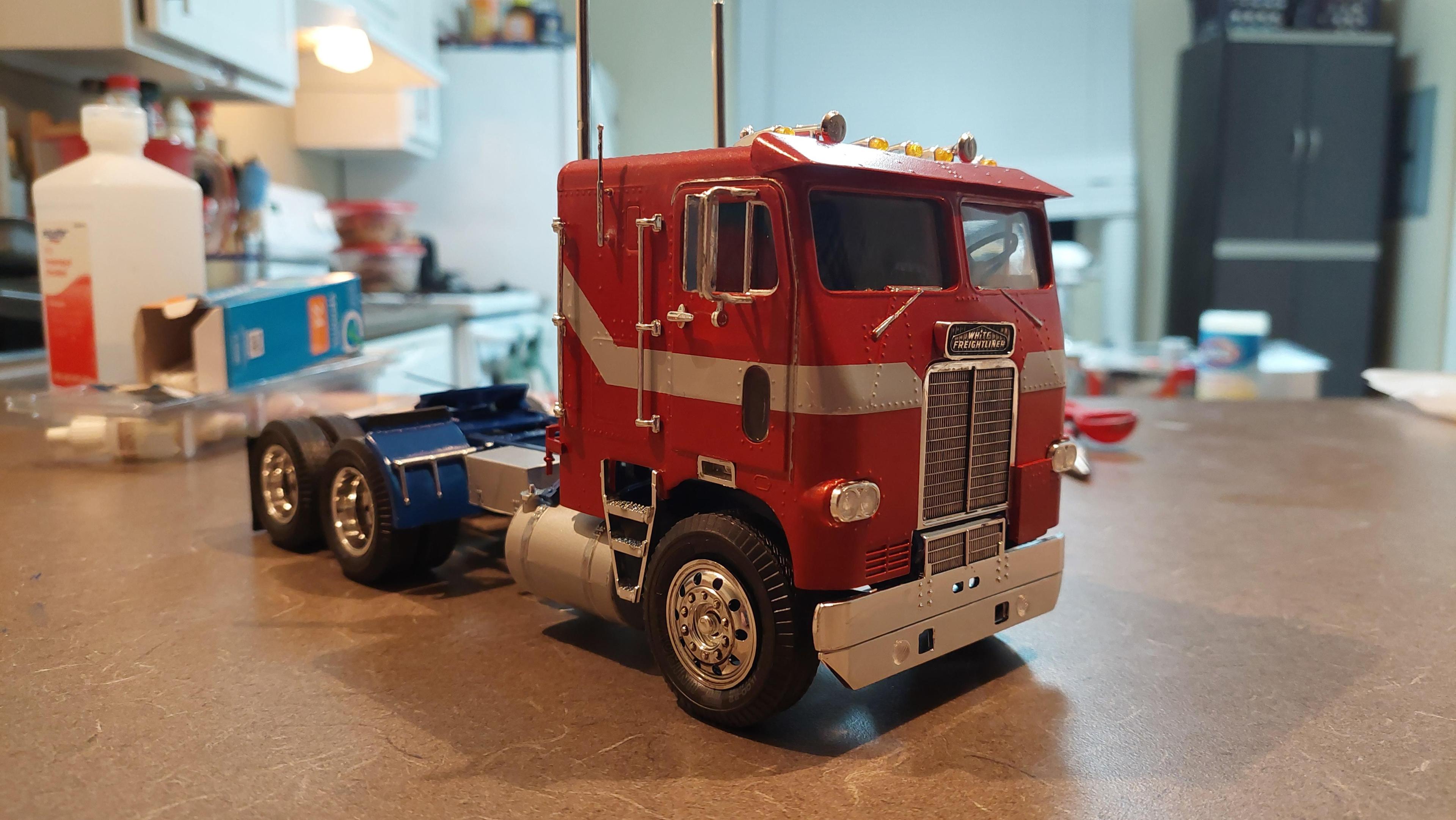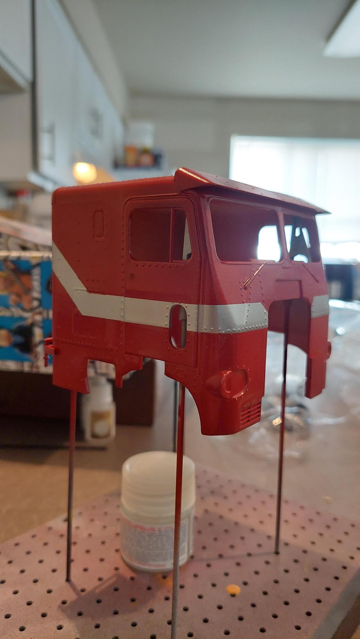 Alright! Red has been painted. As shown in the pictures below, this was achieved with a base coat of thinned Vallejo yellow (this coat came out a little grainy and it slightly shows in the final product upon close inspection). With testing, this showed to result in the brightest red from the next paint I used: Testors enamel metallic red rattle can. Overall really proud of it and probably wouldn't change a thing. I'll let it sit a bit, gloss coat, sit even longer, then I'll mask off the silver stripe around the cab. After that, it's nothing but gluing! Then I'll move onto the trailer which is both extremely simple and very complex- 32 replies