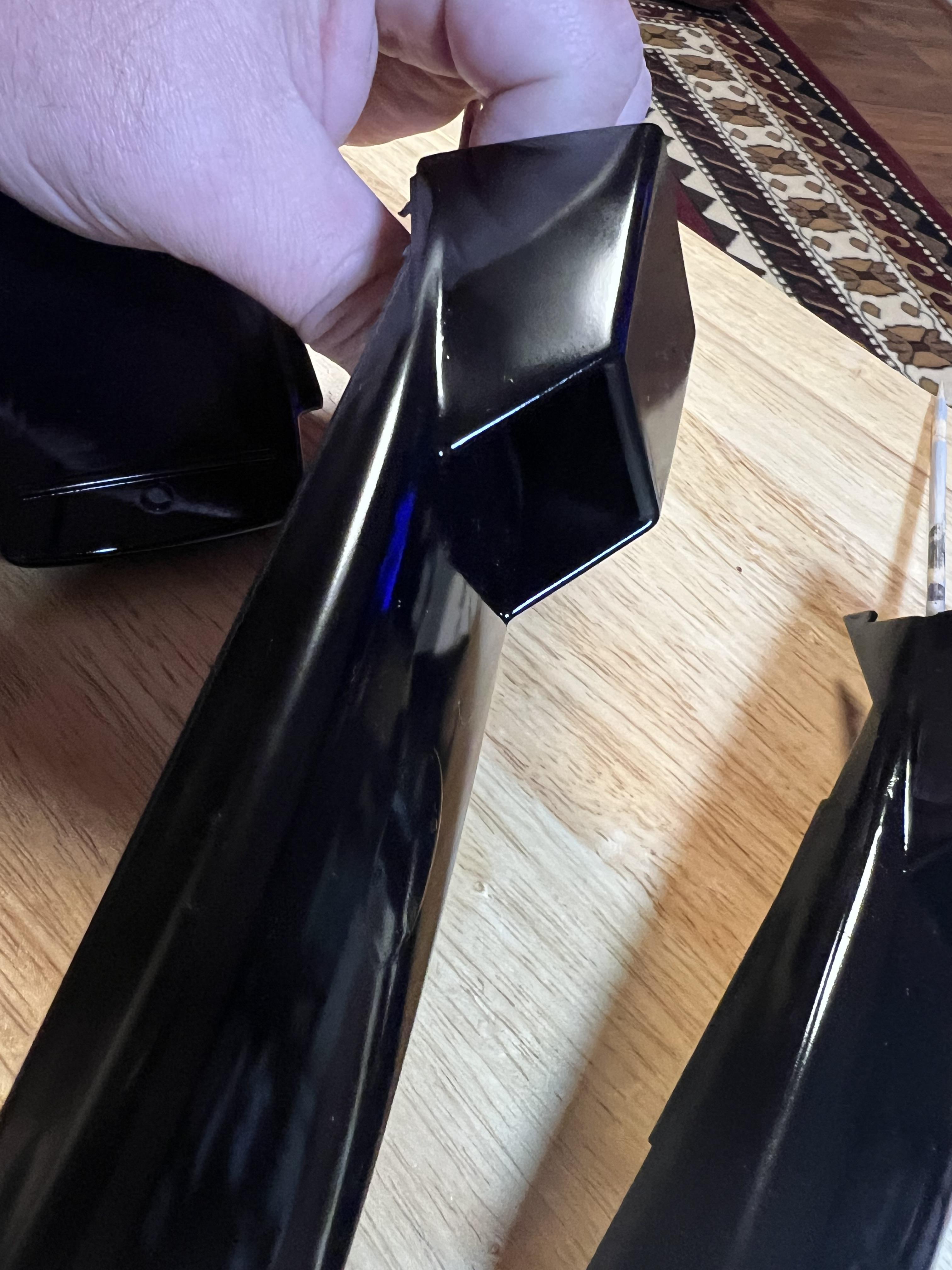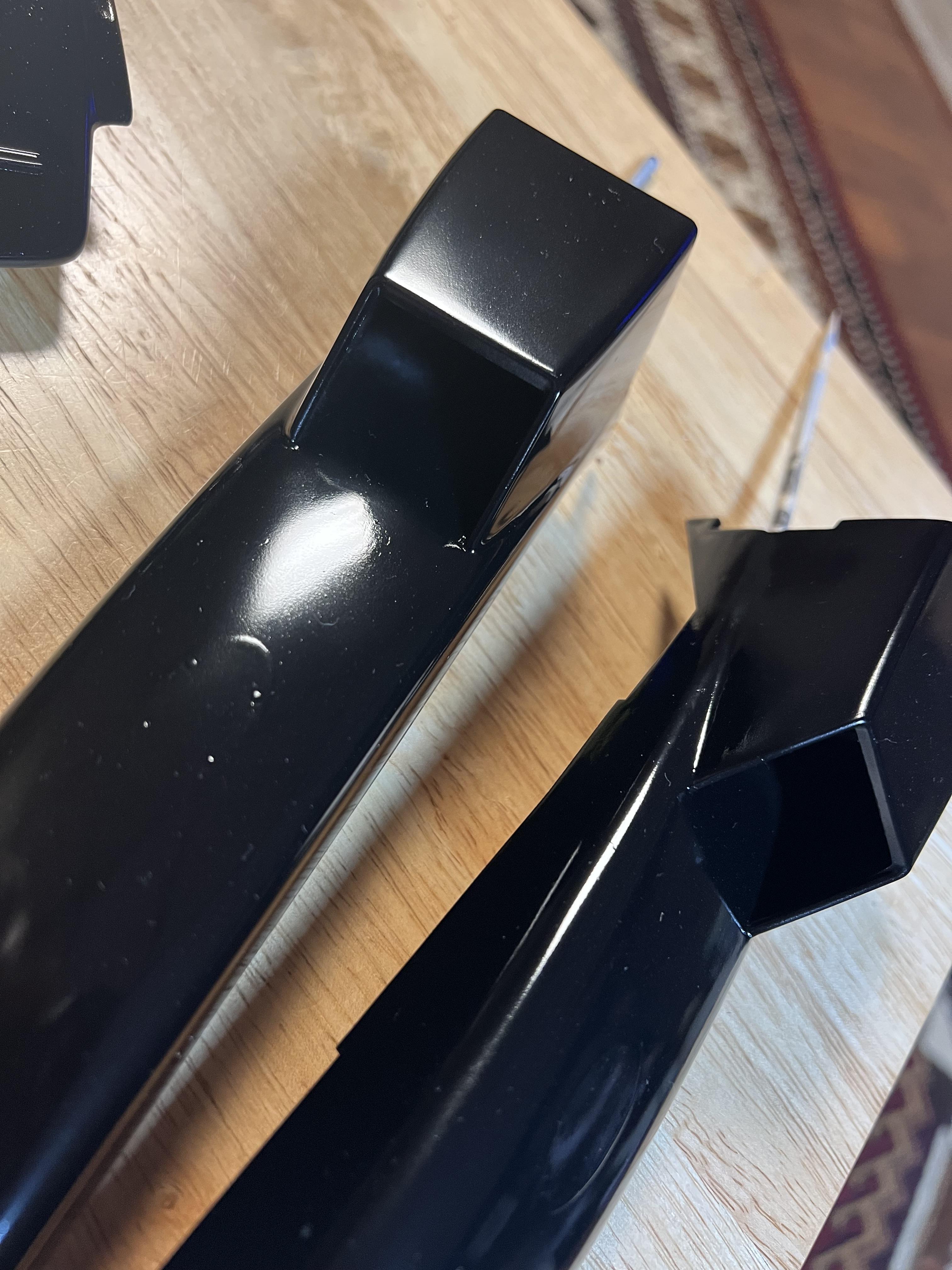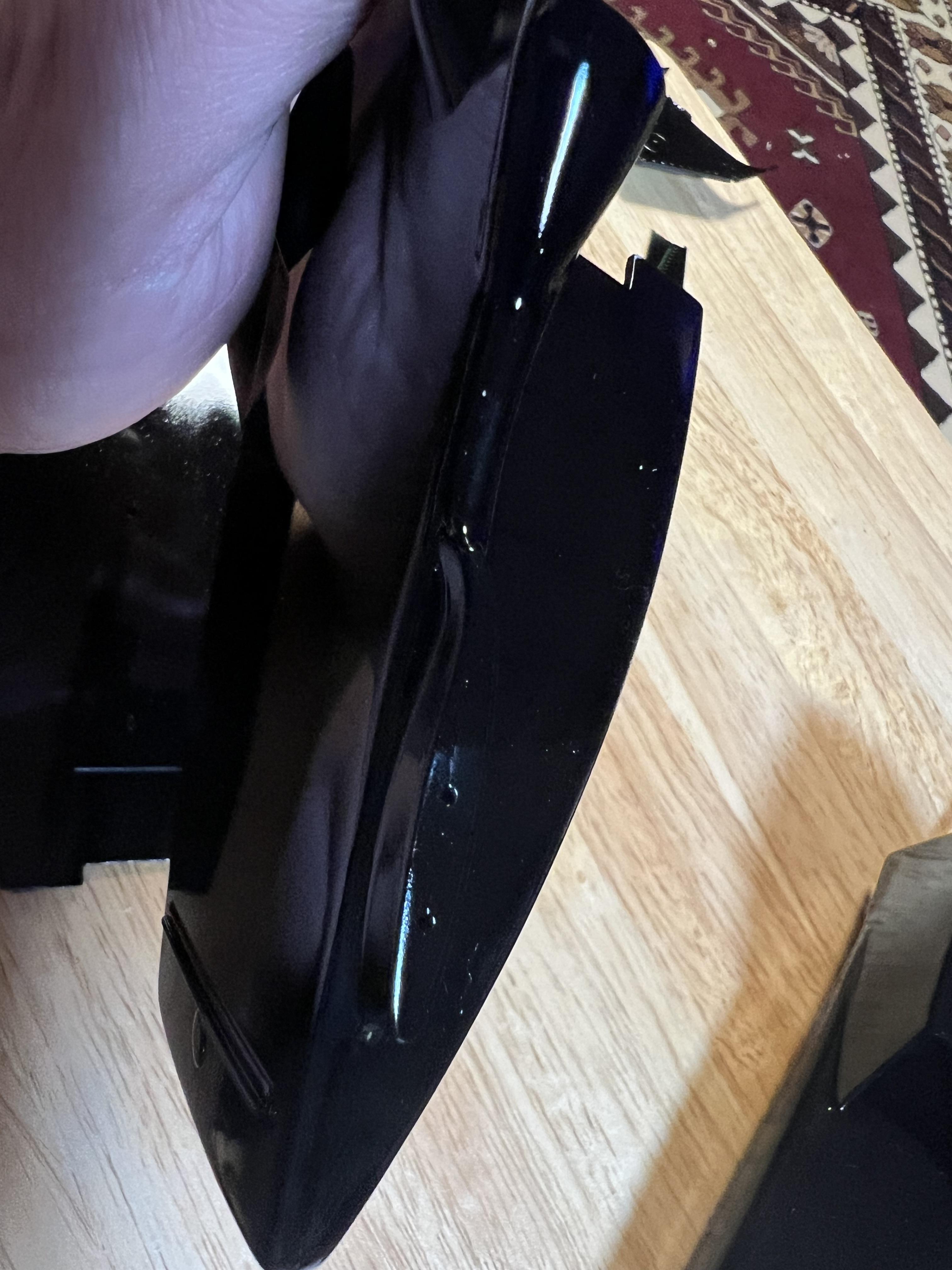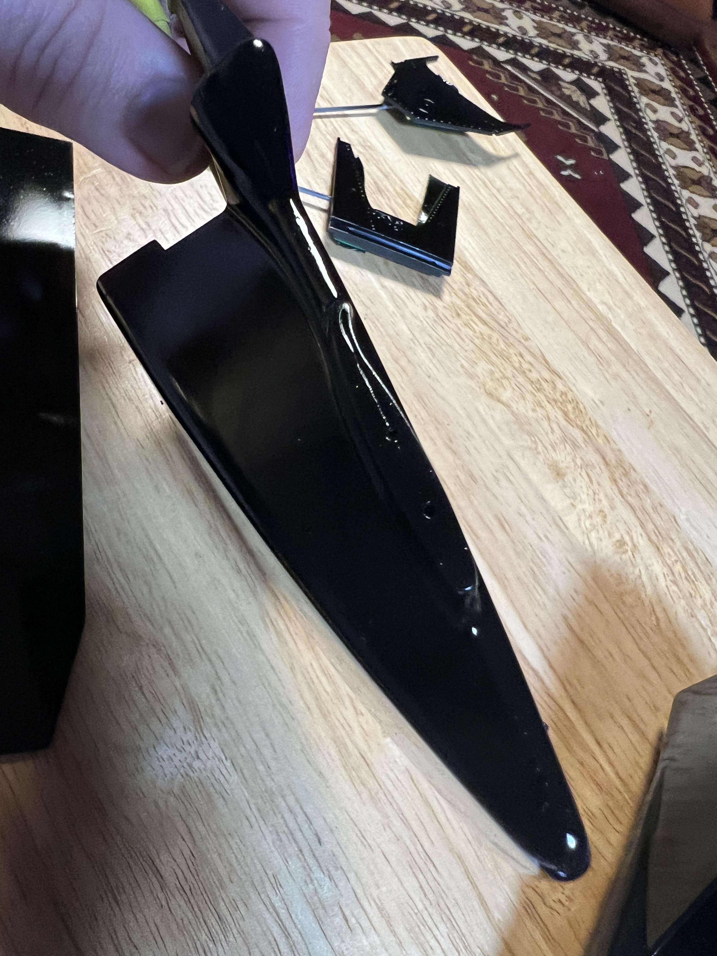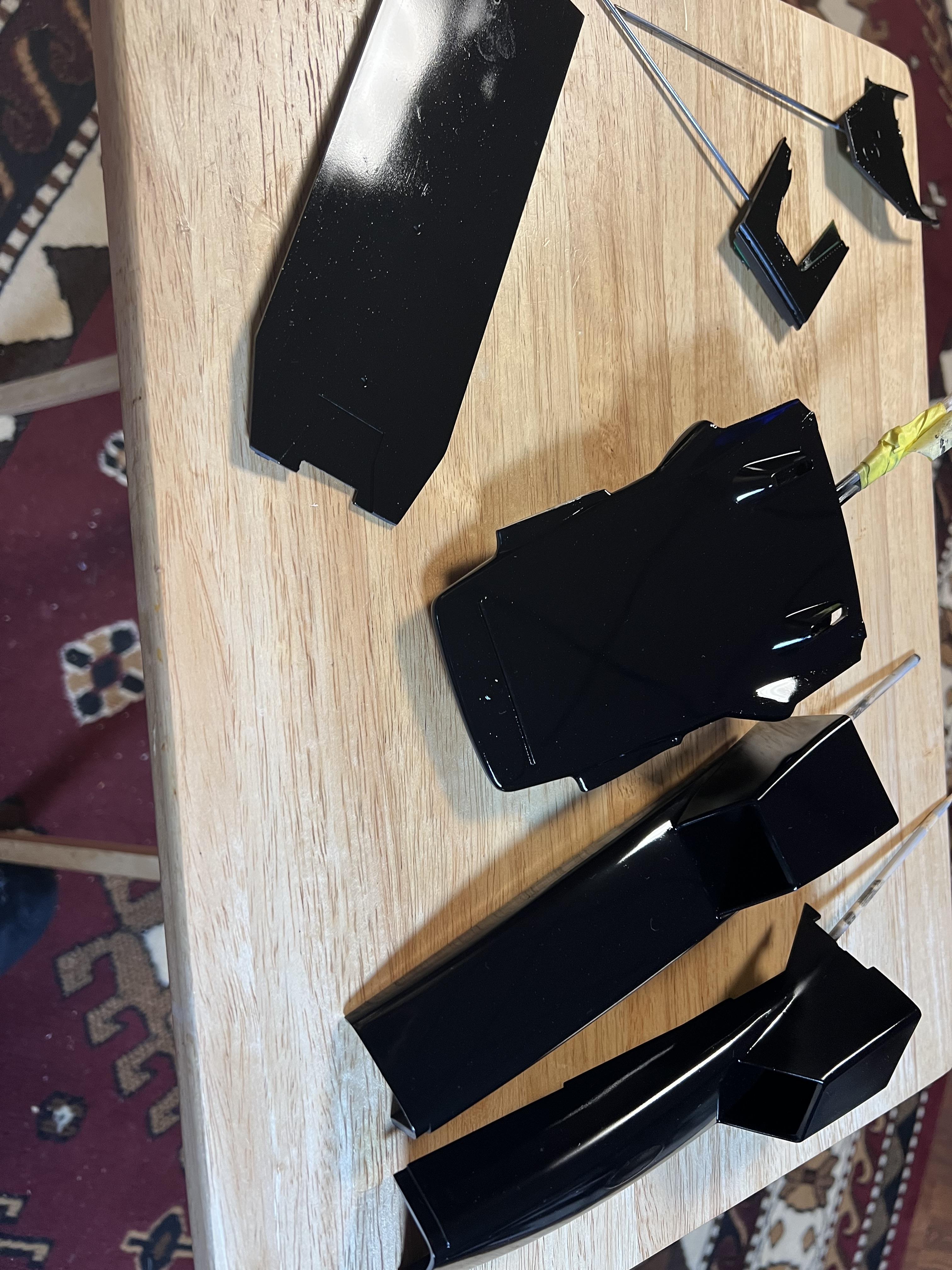 Been busy with life problems and my VW bus build, time to get back on this. I put nose cone together and air scoops/ radiator shrouds on body. Tons of bodywork later, and 3 1/2 jars of MCW gloss black later, seamless. I just couldn’t live with it having seams, when the real one does not. I laid down 2 coats of Mr.Color GX112 UV cut clear in preparation for decals that are on order from TB decals