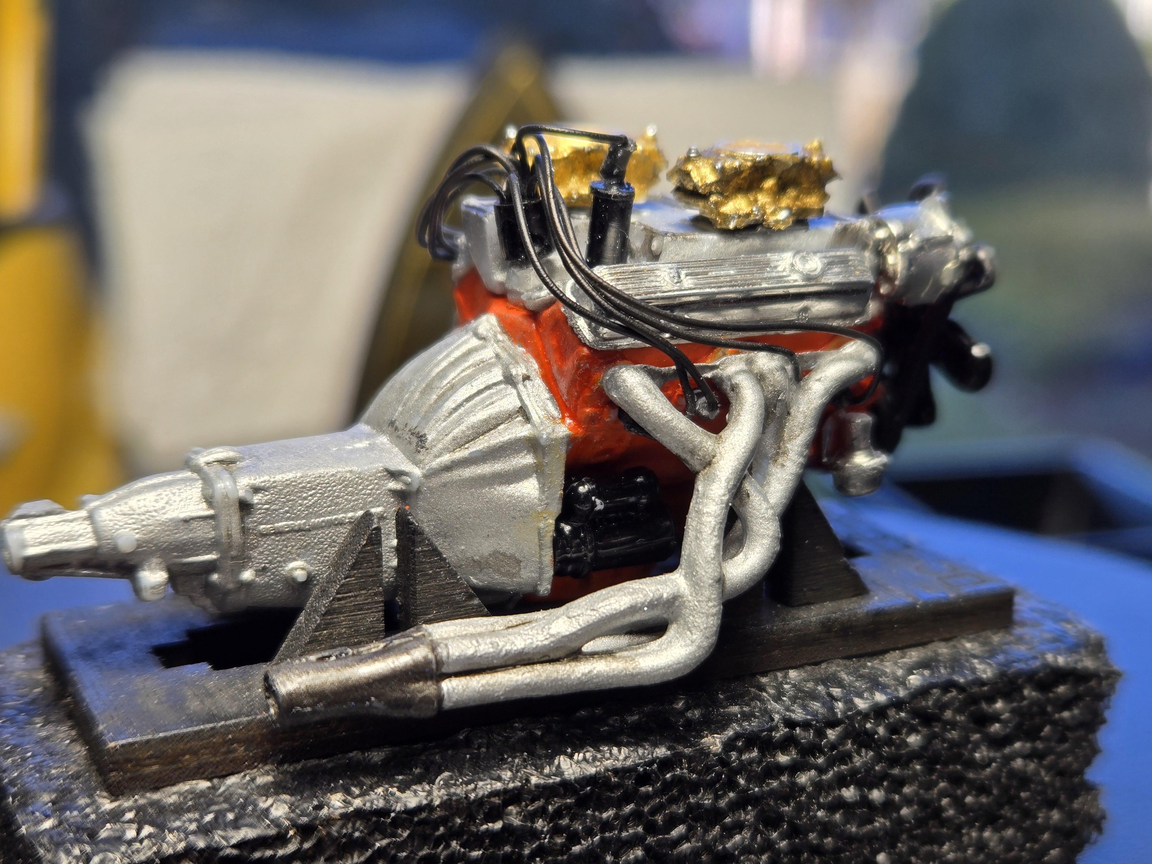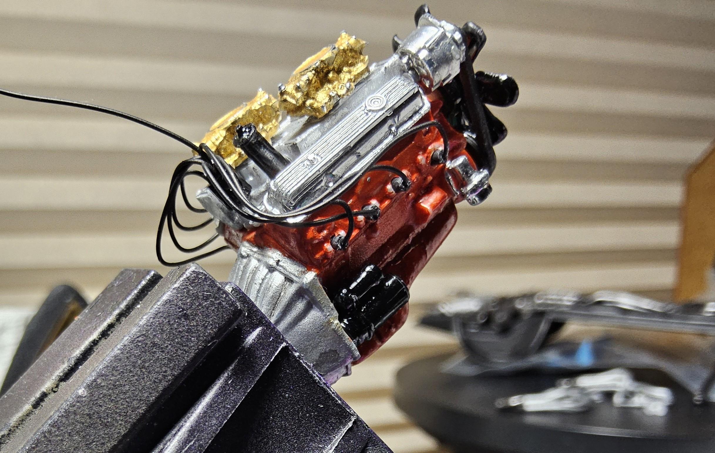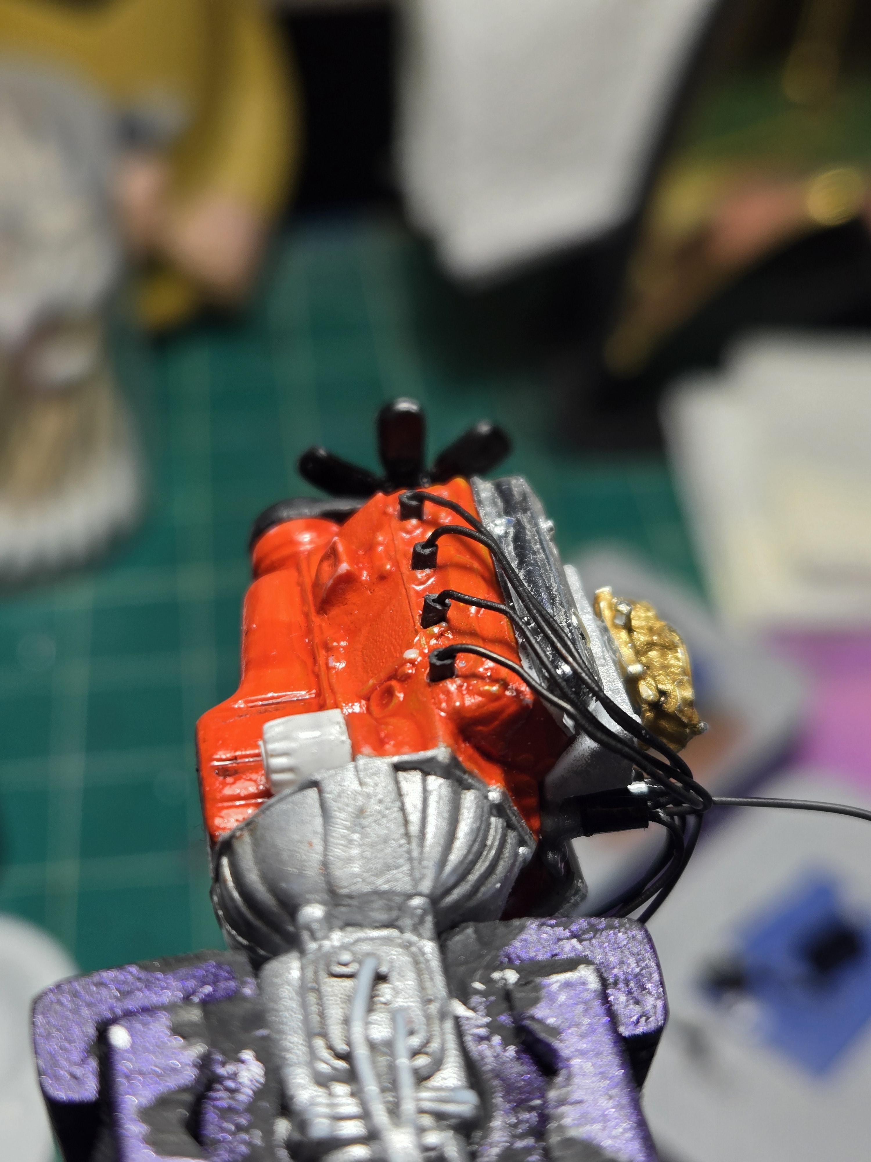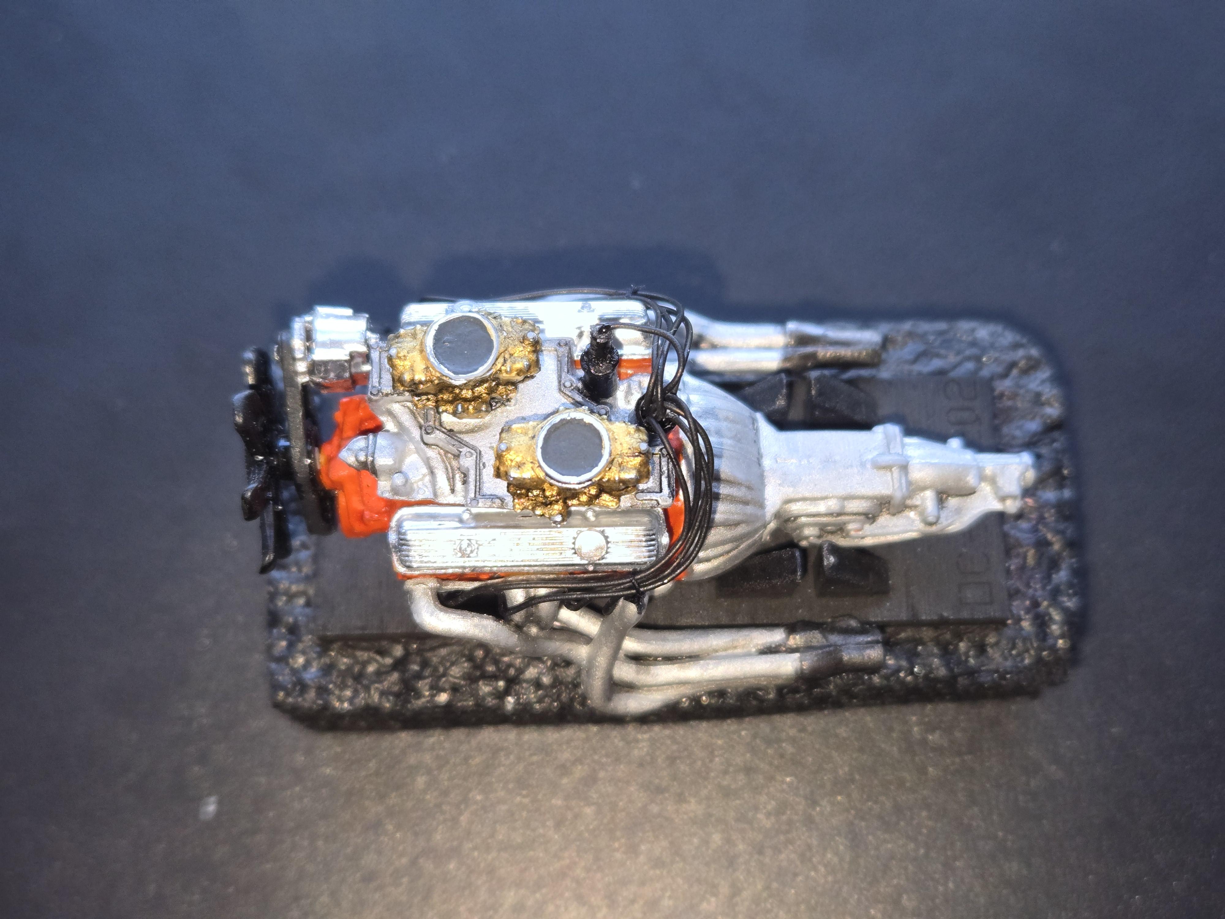 I have no grand plan for this build except to end up with something shelf worthy. Here are some engine pics. I'm adding plug wires and boots. I did not line them up great with the openings in the headers. I can already tell the the hood will never close. I used some black thread to resemble zip-ties. I've seen some folks get the wires so flat and uniform. I'm curious to know that trick. I did not weather the engine much. I sometimes get to heavy with the panel liner. I did touch up the paint on the trans mission...