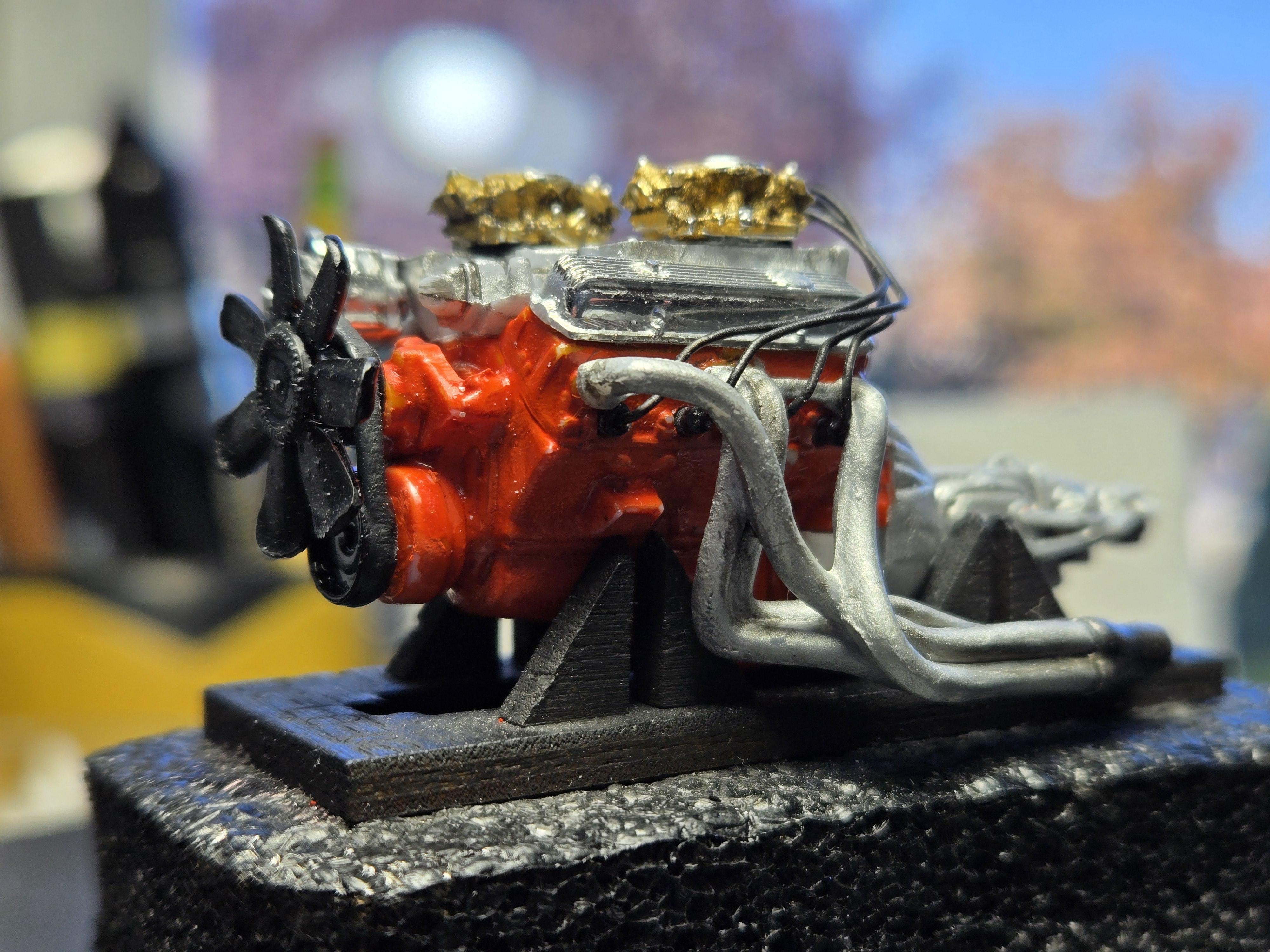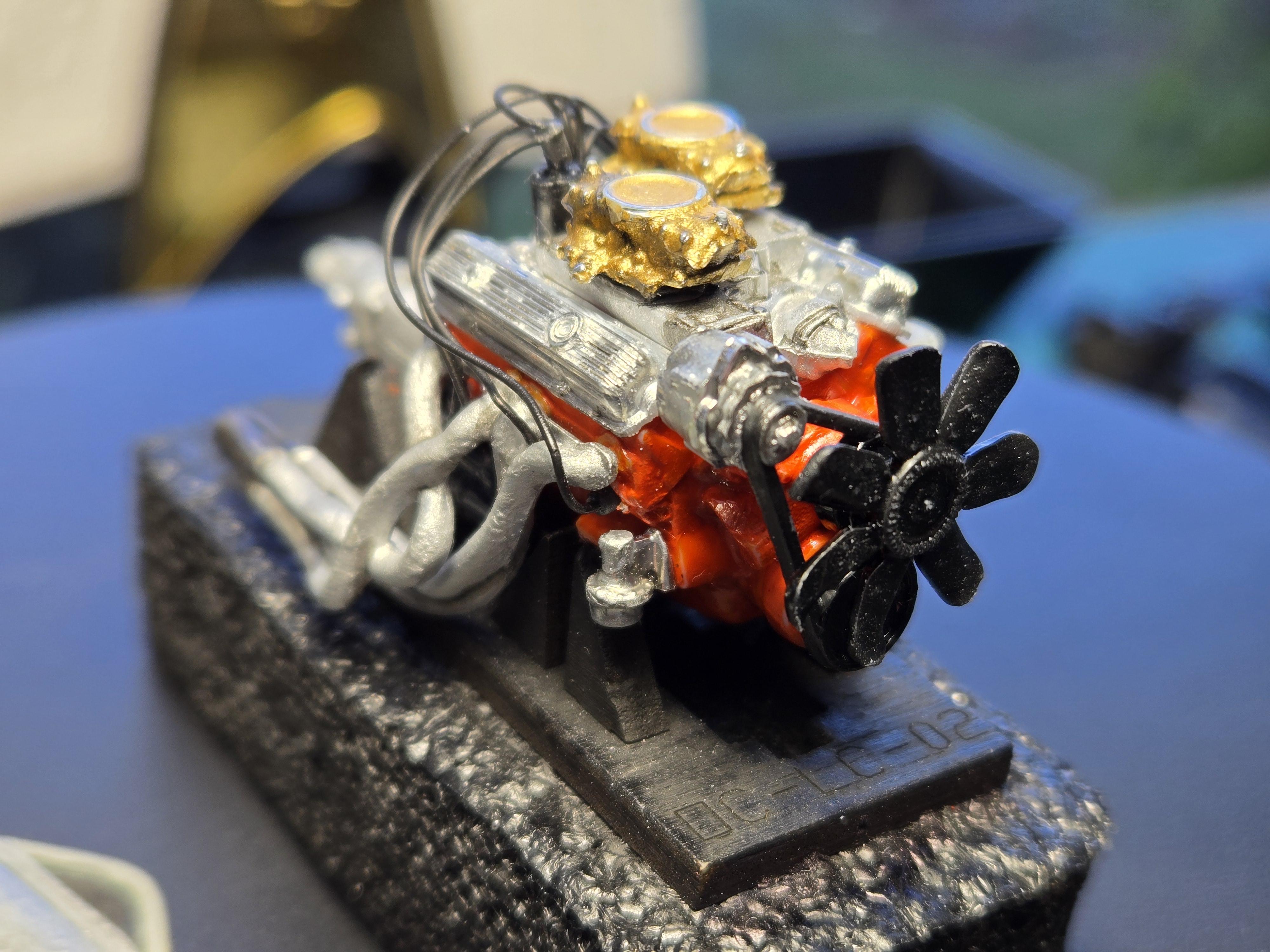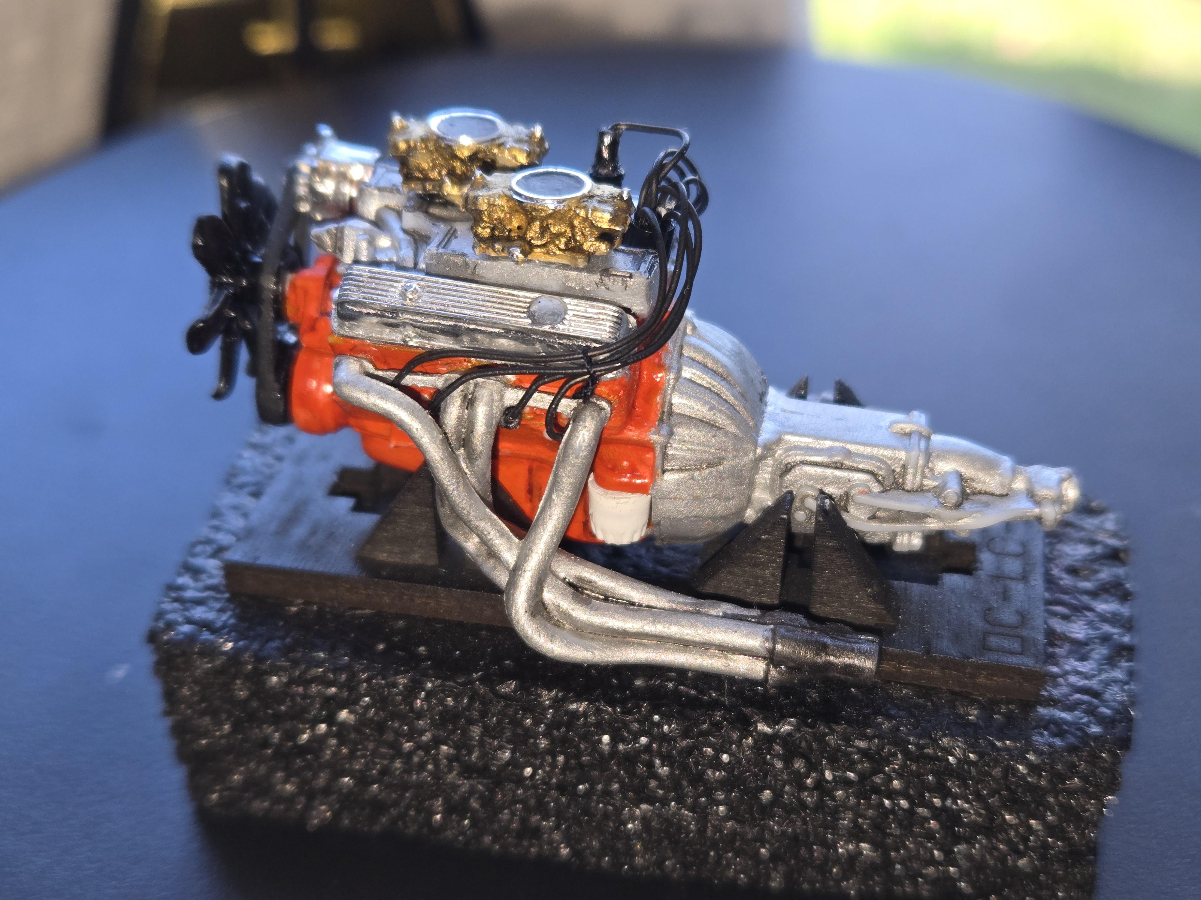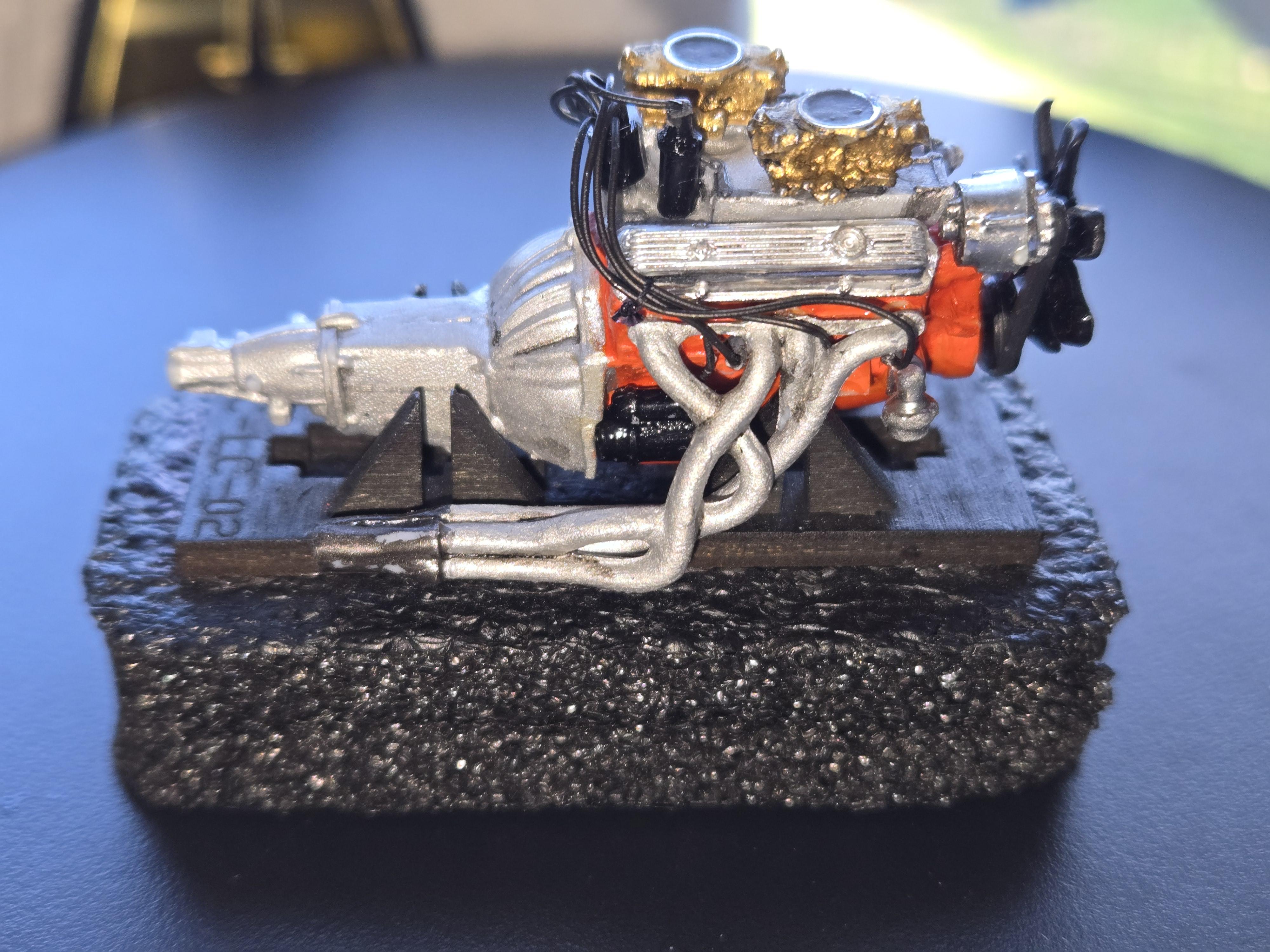 I have no grand plan for this build except to end up with something shelf worthy. Here are some engine pics. I'm adding plug wires and boots. I did not line them up great with the openings in the headers. I can already tell the the hood will never close. I used some black thread to resemble zip-ties. I've seen some folks get the wires so flat and uniform. I'm curious to know that trick. I did not weather the engine much. I sometimes get to heavy with the panel liner. I did touch up the paint on the trans mission...