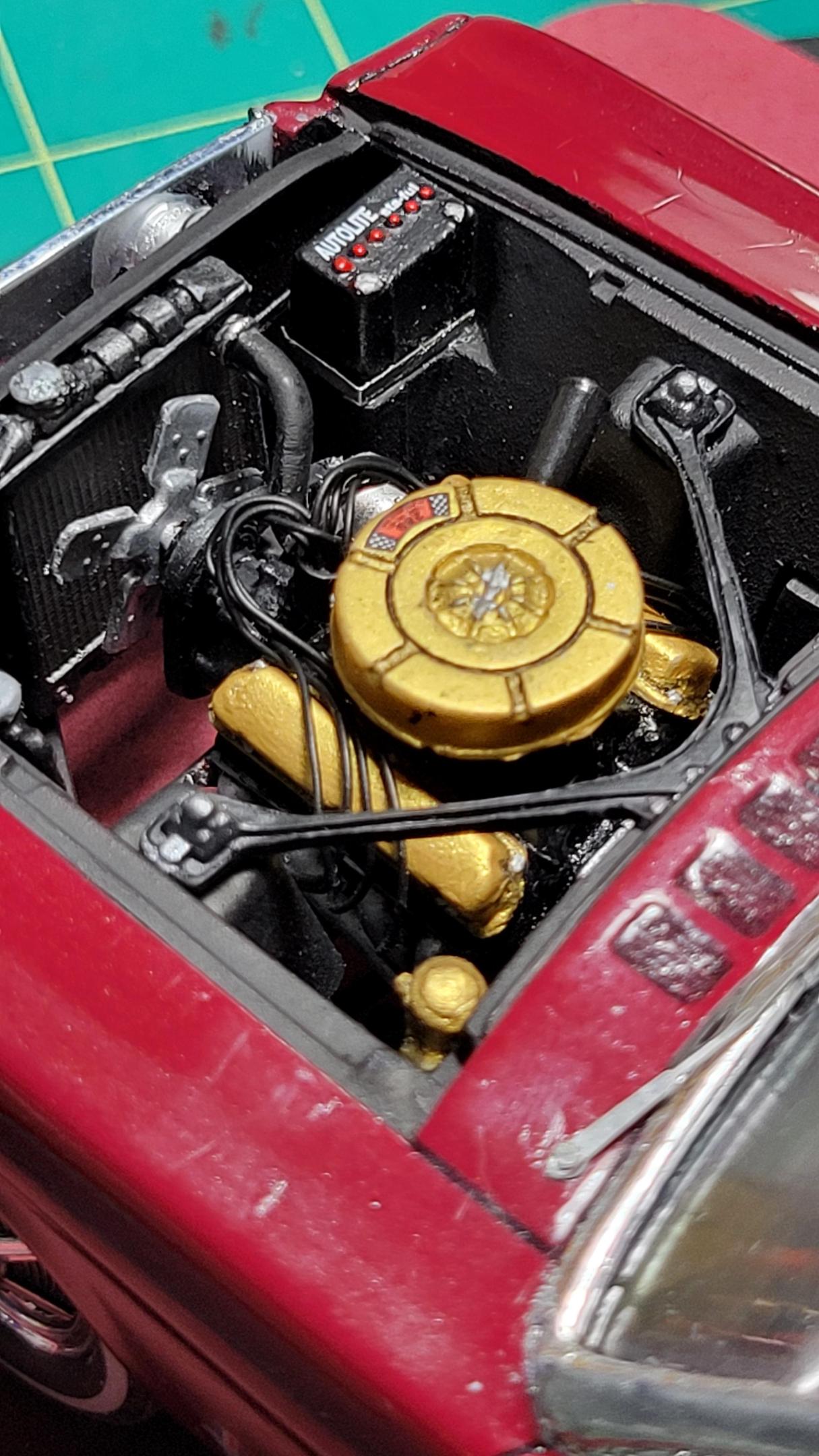 This add-on was an afterthought. I had already assembled the engine. I was unable to get a clear angle with my pin vise to drill holes so I inserted the boots in first. When looking at web photos, I thought the plug wires went all the way behind the valve covers. Come to find out, not so. I manipulated them as much as possible but still too long. Oh well. I did not want to re-glue on this build.