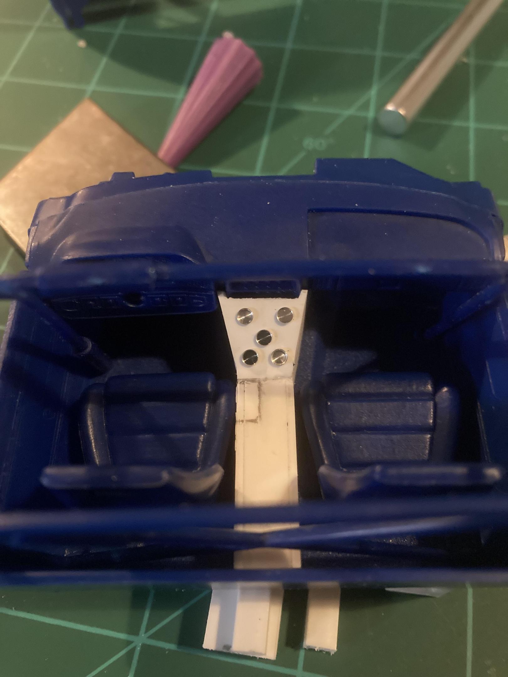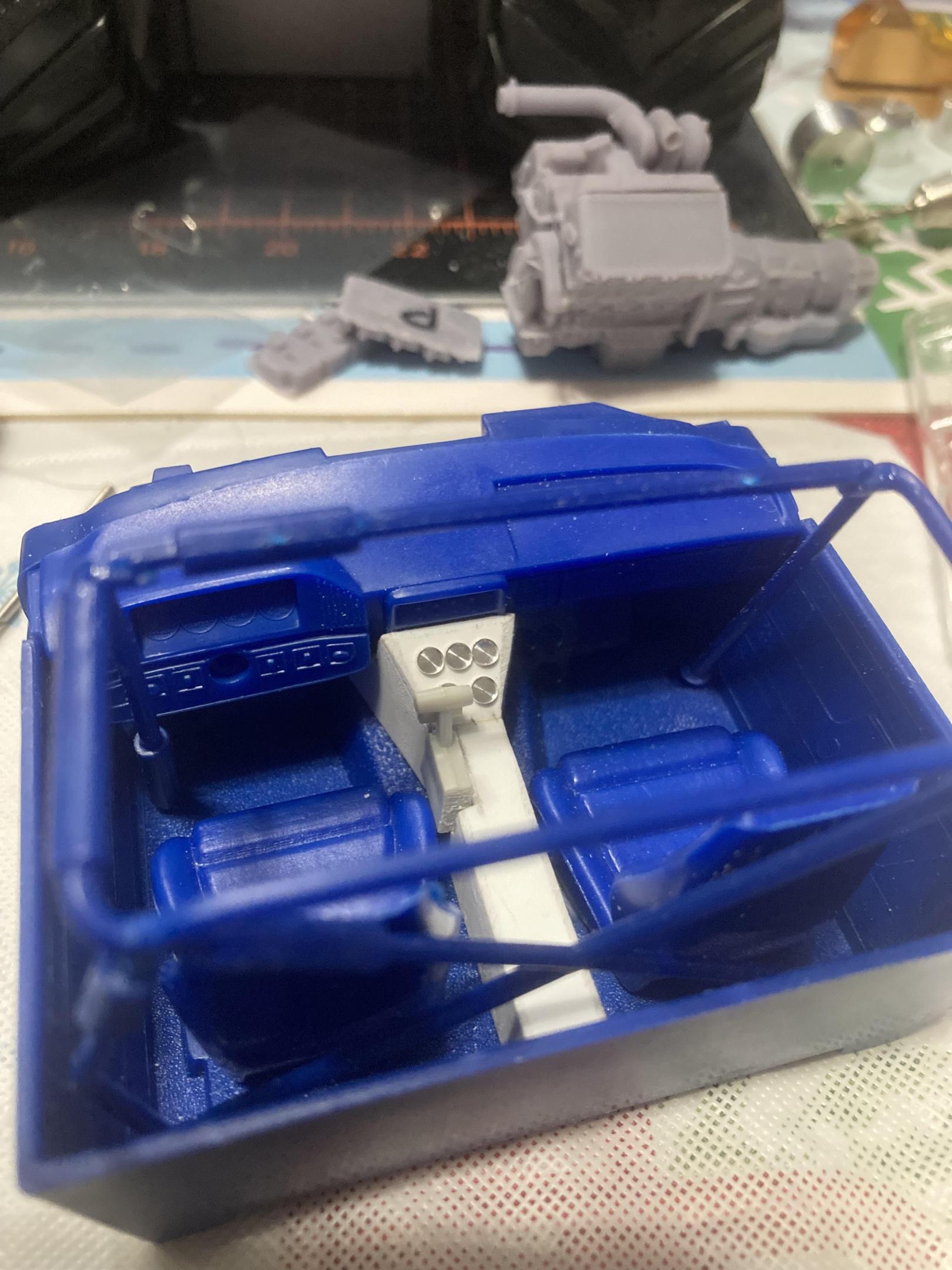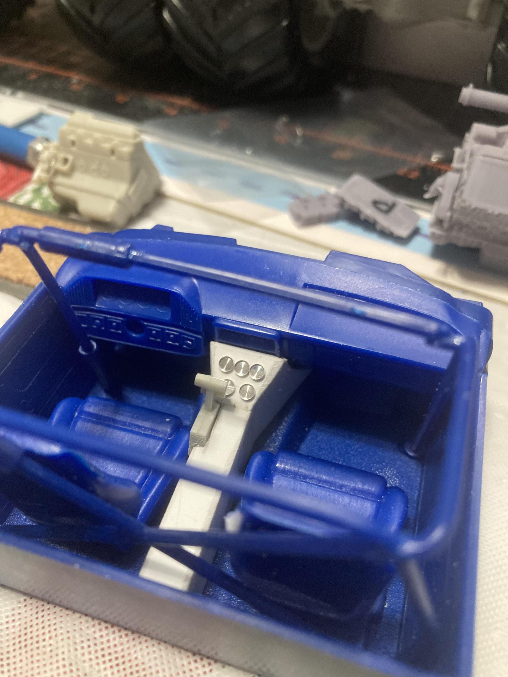Small update… I decided I didn’t like the center console I’d made for Bigfoot 3…So, I started over. I made it wider, but the same height. This allowed me to add the 6 gauges I was looking to have on the upper panel. I also made one for Bigfoot 1, and decided I wanted only 5 gauges, as it is the “older” truck of the two. I’m not sure I like it. May pull it off and make a new panel…I’m struggling with the alignment because the gauges are so small, and my eyes aren’t as good as they use to be. When I drill them out with a pin vise, I think it’s off just enough as I step up to the larger bits. And to my eyes it looks off. I’m still resting on this one. Merry Christmas everyone.